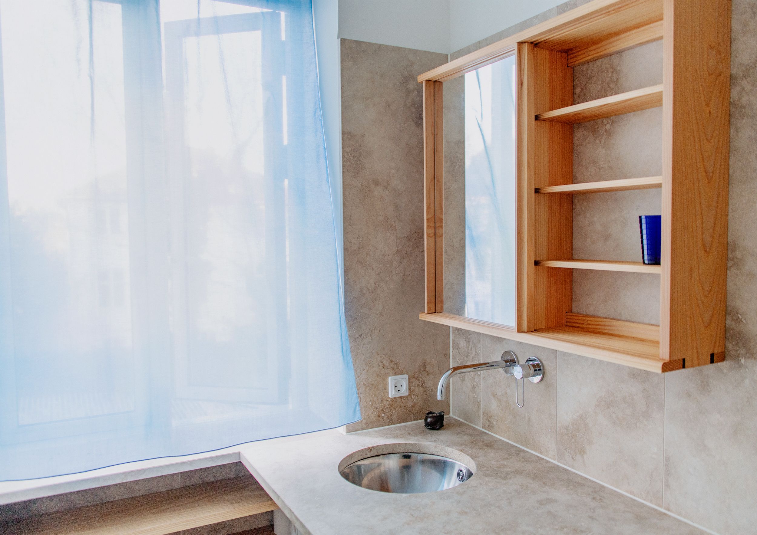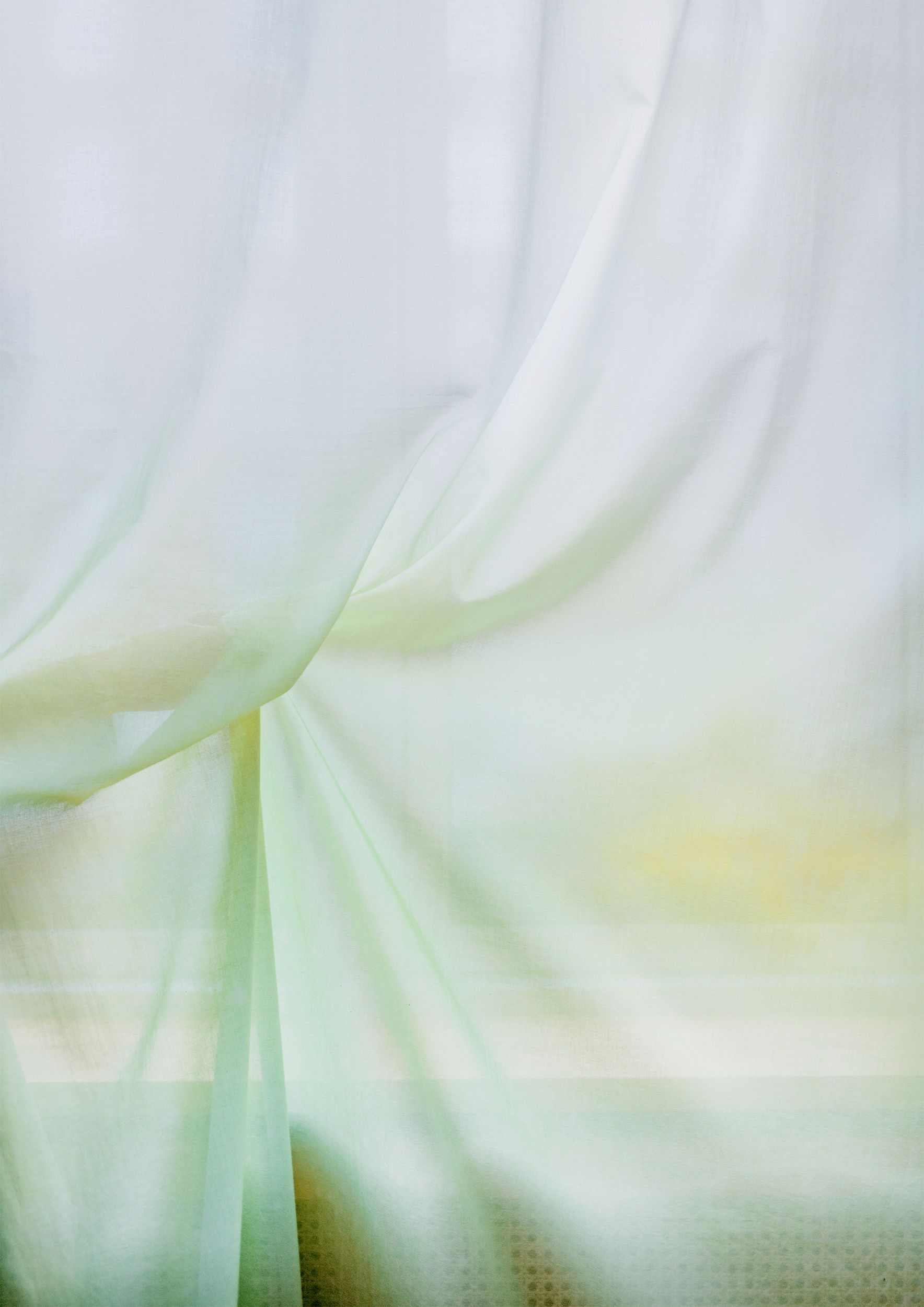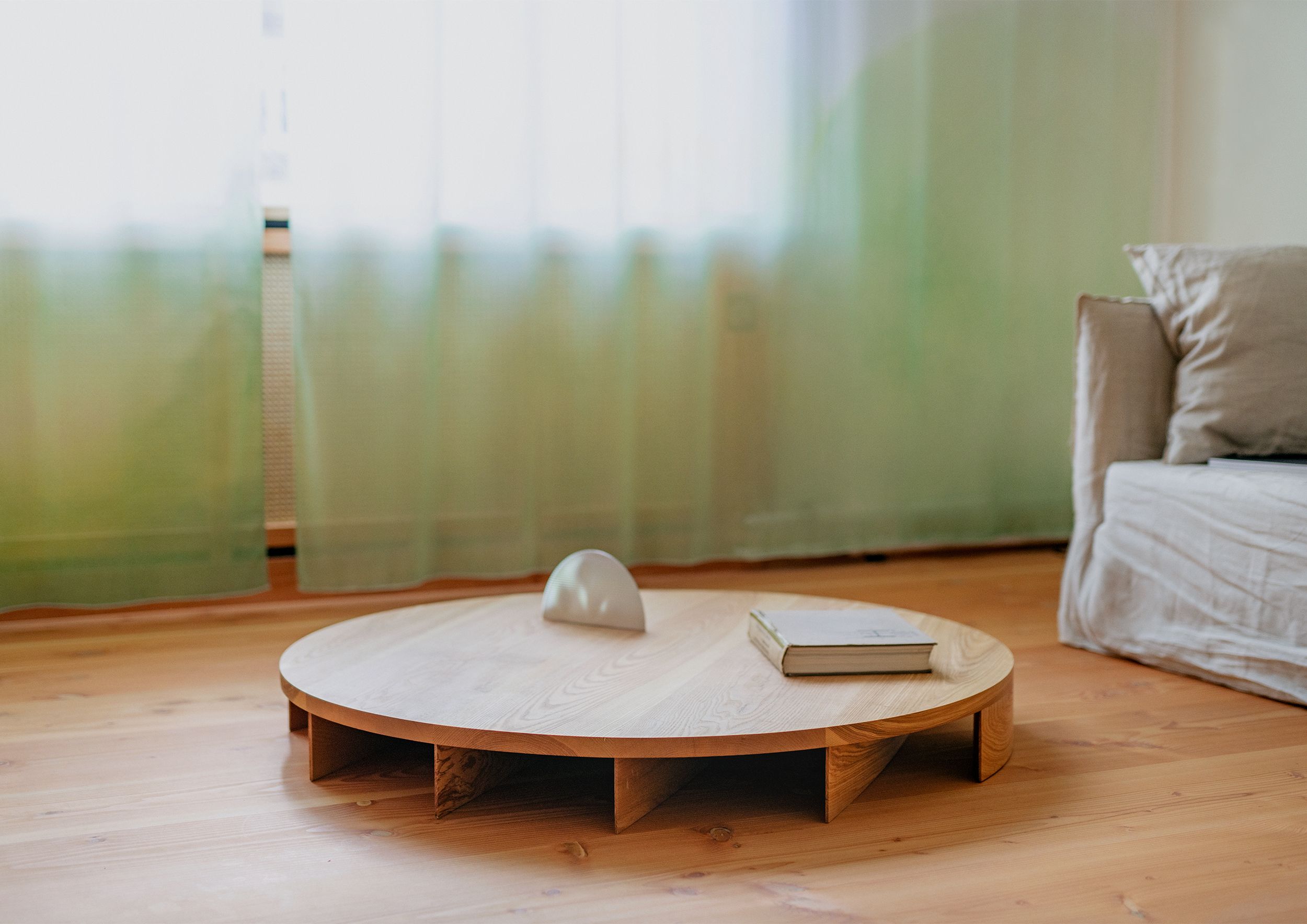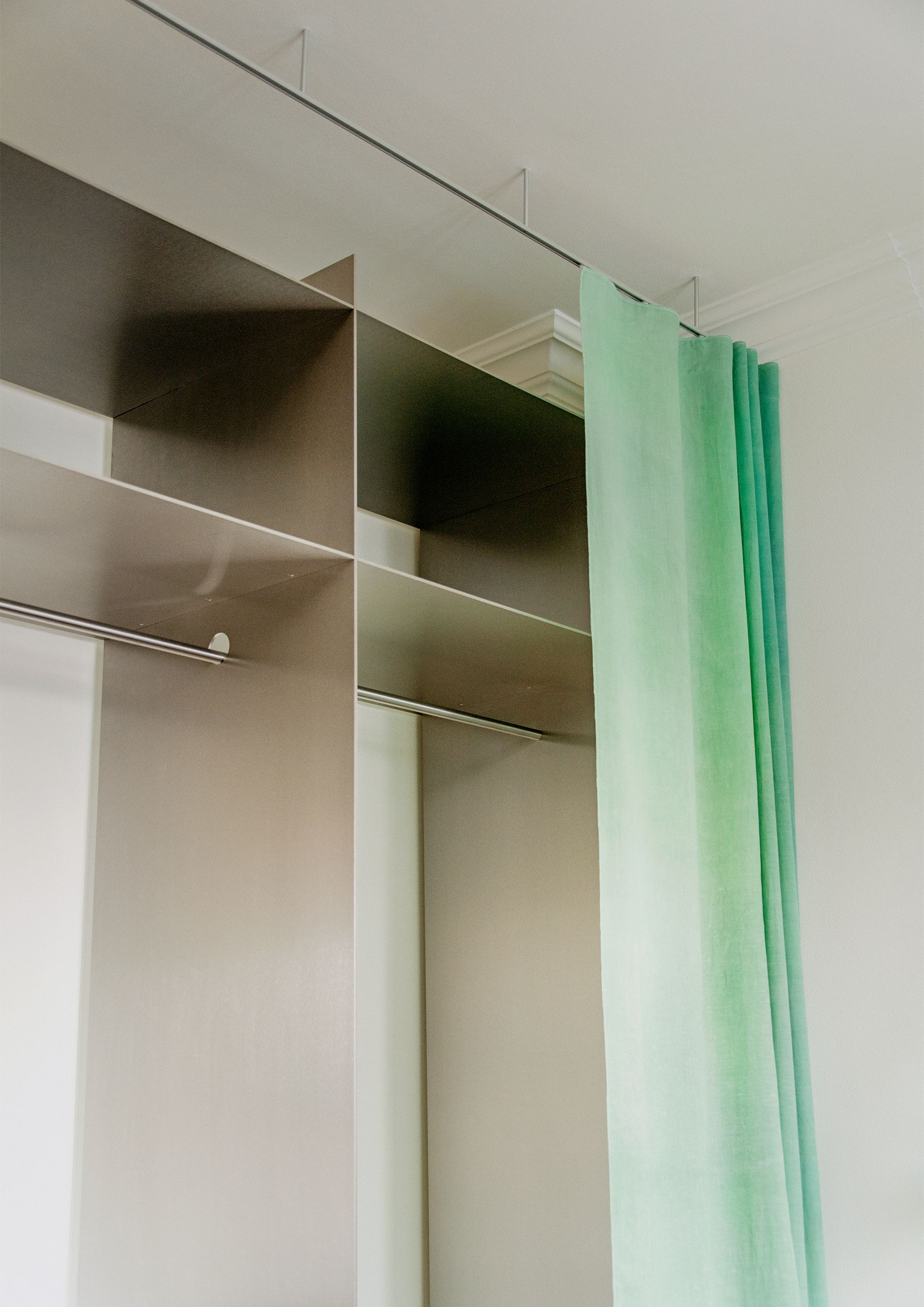 Interior 02 is the interior renovation of an apartment in Hellerup, Denmark. This project includes full description and custom production of walls, flooring, textiles, kitchen, light fixtures, bathroom, and furniture. Among other things, this project includes Painted Curtains 01, Curved Panels 01, Kitchen 01, Reflector 05 CU, Platform 01, Wardrobe 02, a custom Douglas Fir flooring solution, and a Travertine stone bathroom. While working on this renovation project, one of the first things we noticed about the space was the green color of Birch foliage reflecting into the apartment through every window. The diffused fields of yellow-greens, blue-greens, and blues painted onto the textiles seek to emphasize this effect and to create a visual union between these outdoor views and the white walls The Low Platform came from the desire to create a raised extension of the floor. Its functions are purposefully open, allowing users to find varied scenarios for its use in space: as a low table, a footrest, a podium, an element for spatial composition, etc. The carriers of the platform taper down at both ends. When viewed from the front, the platform appears to rest on top of very thin carriers and a deep dark shadow. When seen from the side, it appears very opaque and solid. As a result, when one walks around, it’s appearance changes from something ethereal and open to something very solid and closed. The client wished for a functional industrial kitchen balanced by a domestic touch. The main “service” part of the kitchen, which holds the appliances, was realized in stainless steel. The other length of the kitchen, which reaches towards the living room, is realized in Douglas Fir and Ashwood, bringing it into relation with the rest of the apartment’s warm interior. Subtle curves are seen throughout the woodwork, which gives softness to the steel and elegance to the overall mass.