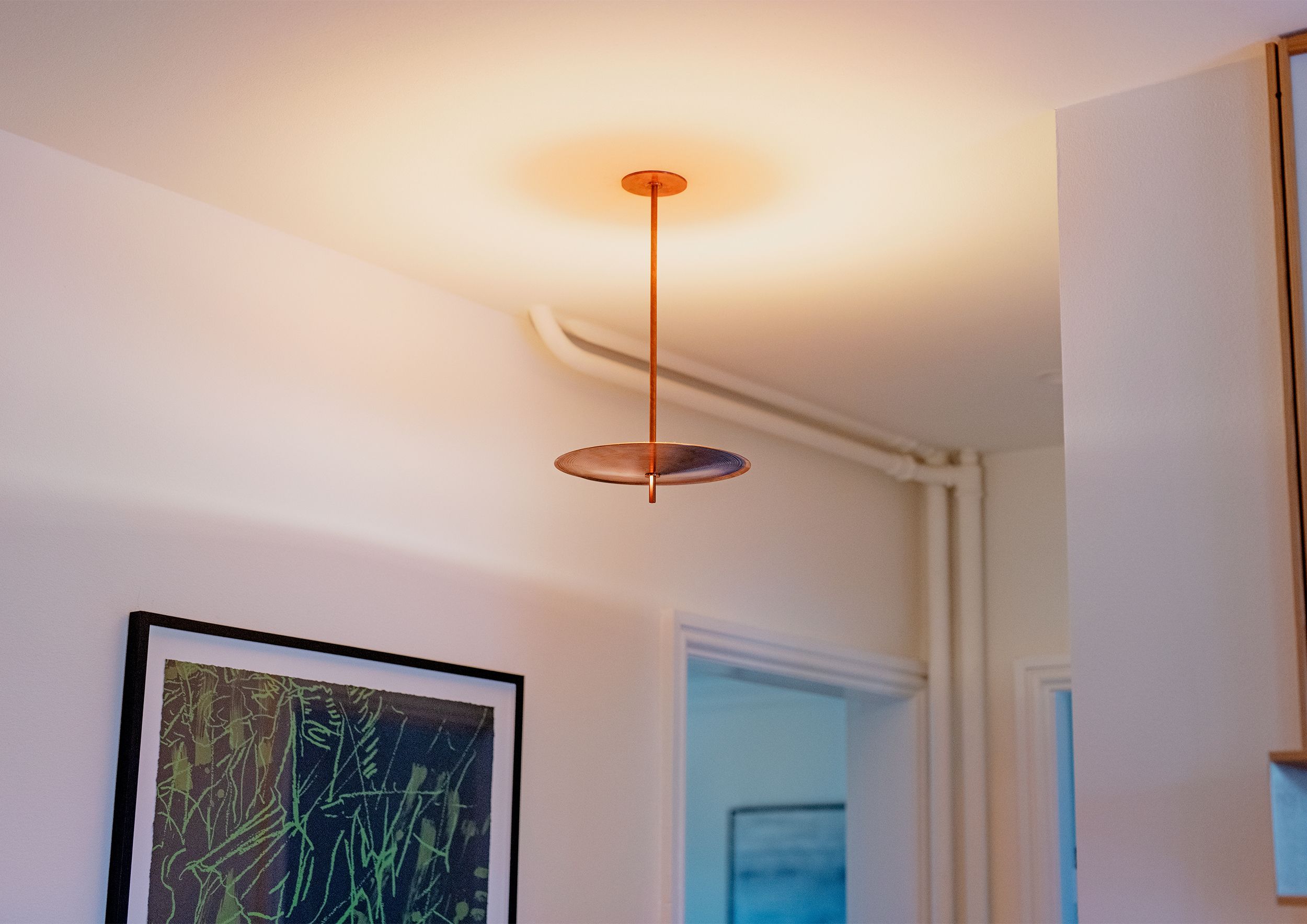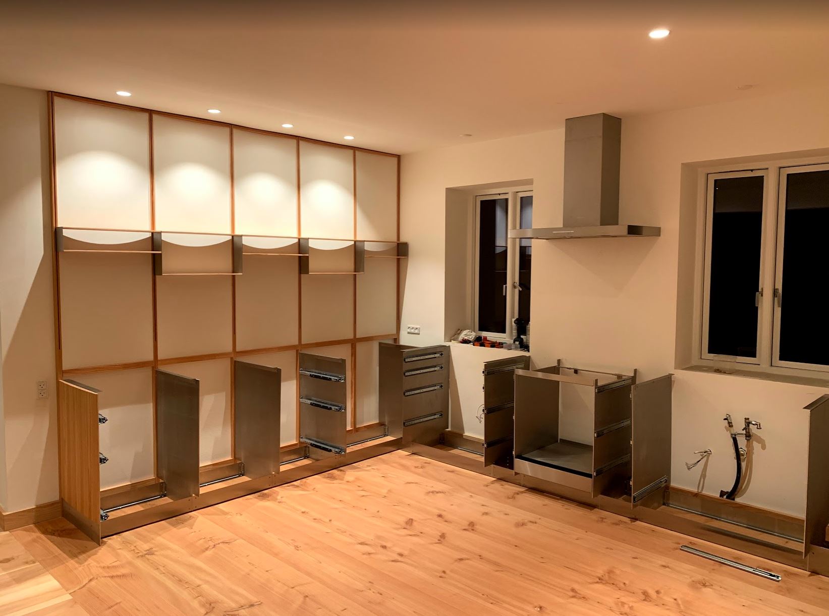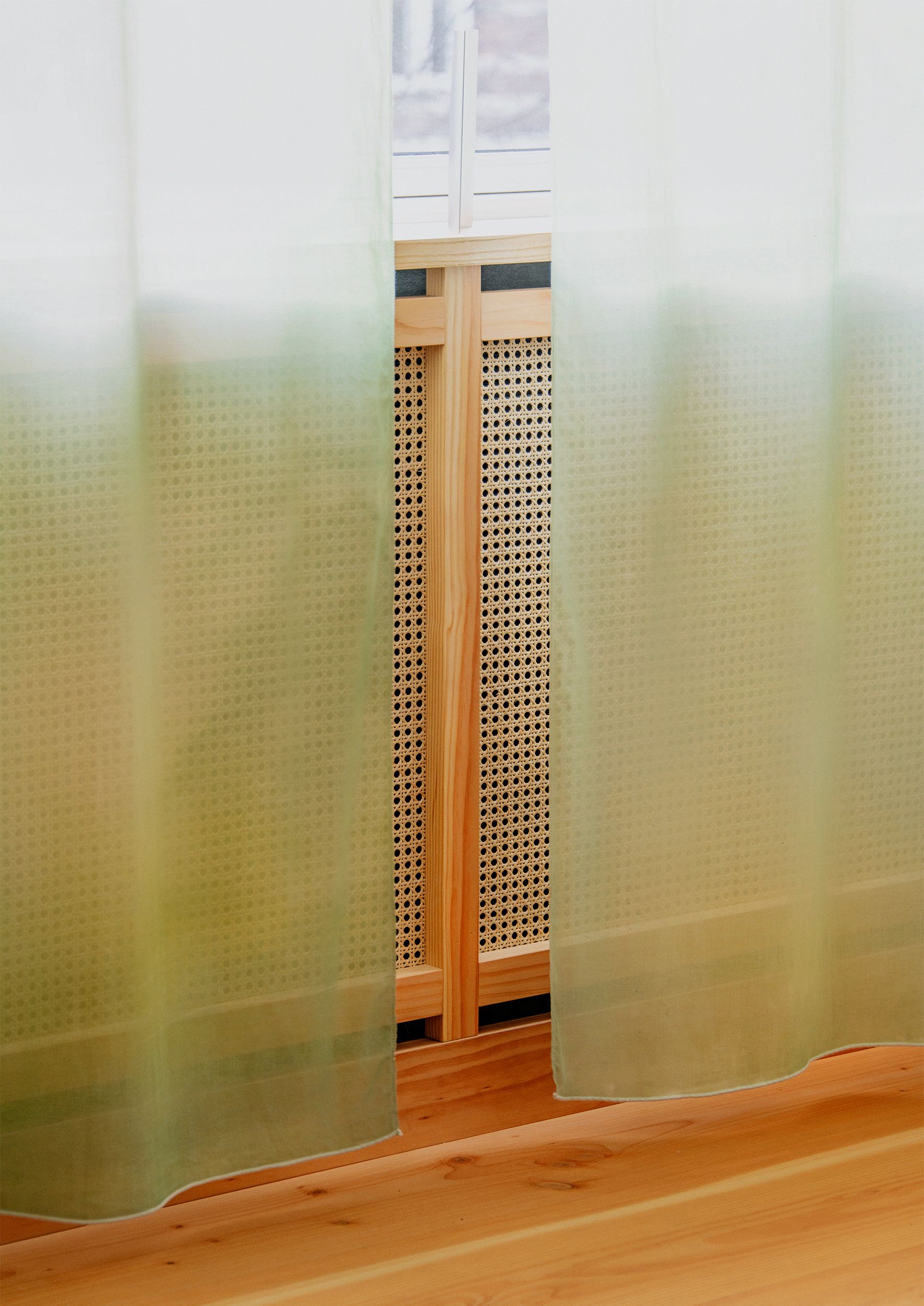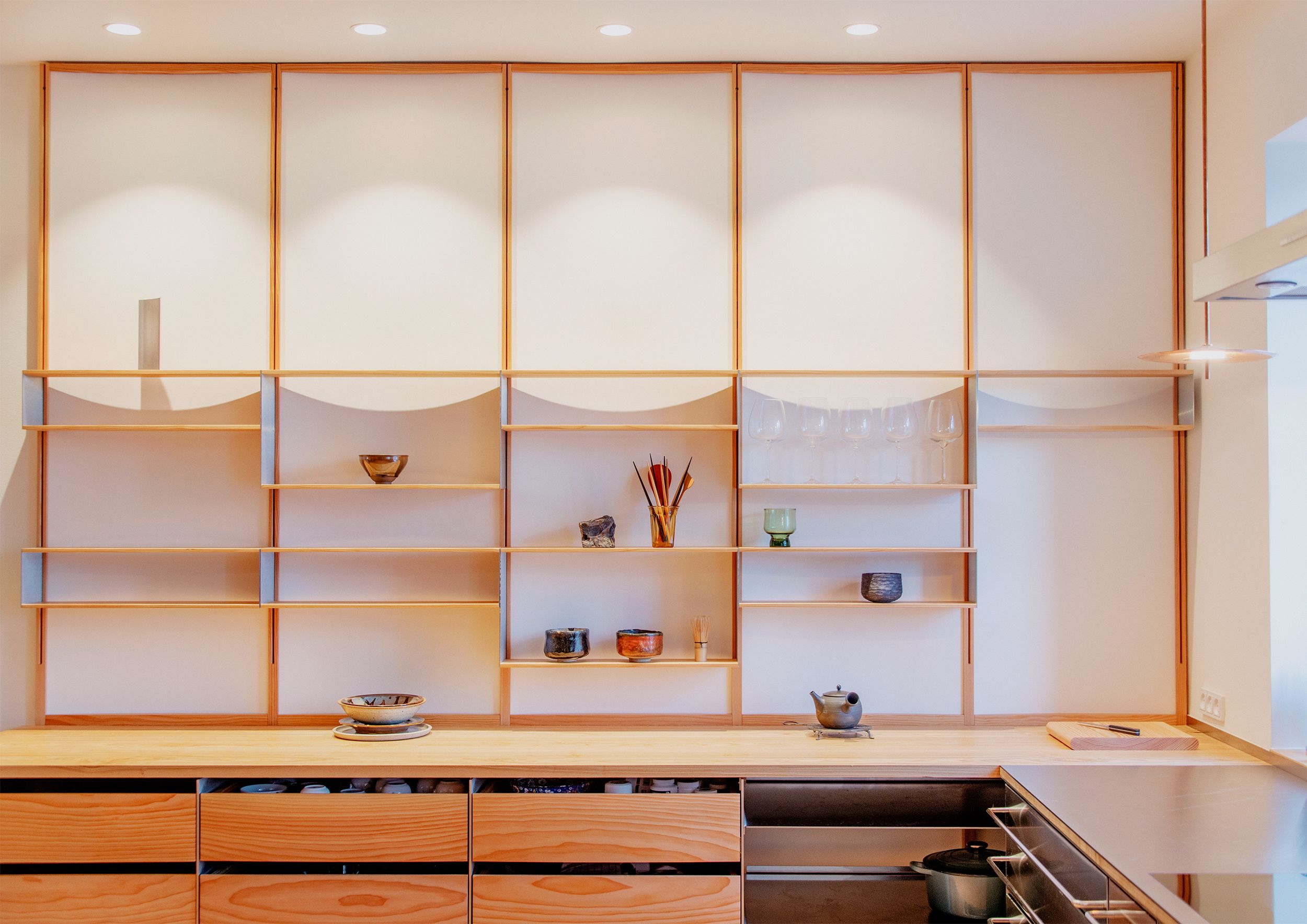 Interior 02 is the interior renovation of an apartment in Hellerup, Denmark. This project includes full description and custom production of walls, flooring, textiles, kitchen, light fixtures, bathroom, and furniture. Among other things, this project includes Painted Curtains 01, Curved Panels 01, Kitchen 01, Reflector 05 CU, Platform 01, Wardrobe 02, a custom Douglas Fir flooring solution, and a Travertine stone bathroom. While working on this renovation project, one of the first things we noticed about the space was the green color of Birch foliage reflecting into the apartment through every window. The diffused fields of yellow-greens, blue-greens, and blues painted onto the textiles seek to emphasize this effect and to create a visual union between these outdoor views and the white walls The Low Platform came from the desire to create a raised extension of the floor. Its functions are purposefully open, allowing users to find varied scenarios for its use in space: as a low table, a footrest, a podium, an element for spatial composition, etc. The carriers of the platform taper down at both ends. When viewed from the front, the platform appears to rest on top of very thin carriers and a deep dark shadow. When seen from the side, it appears very opaque and solid. As a result, when one walks around, it’s appearance changes from something ethereal and open to something very solid and closed. The client wished for a functional industrial kitchen balanced by a domestic touch. The main “service” part of the kitchen, which holds the appliances, was realized in stainless steel. The other length of the kitchen, which reaches towards the living room, is realized in Douglas Fir and Ashwood, bringing it into relation with the rest of the apartment’s warm interior. Subtle curves are seen throughout the woodwork, which gives softness to the steel and elegance to the overall mass.