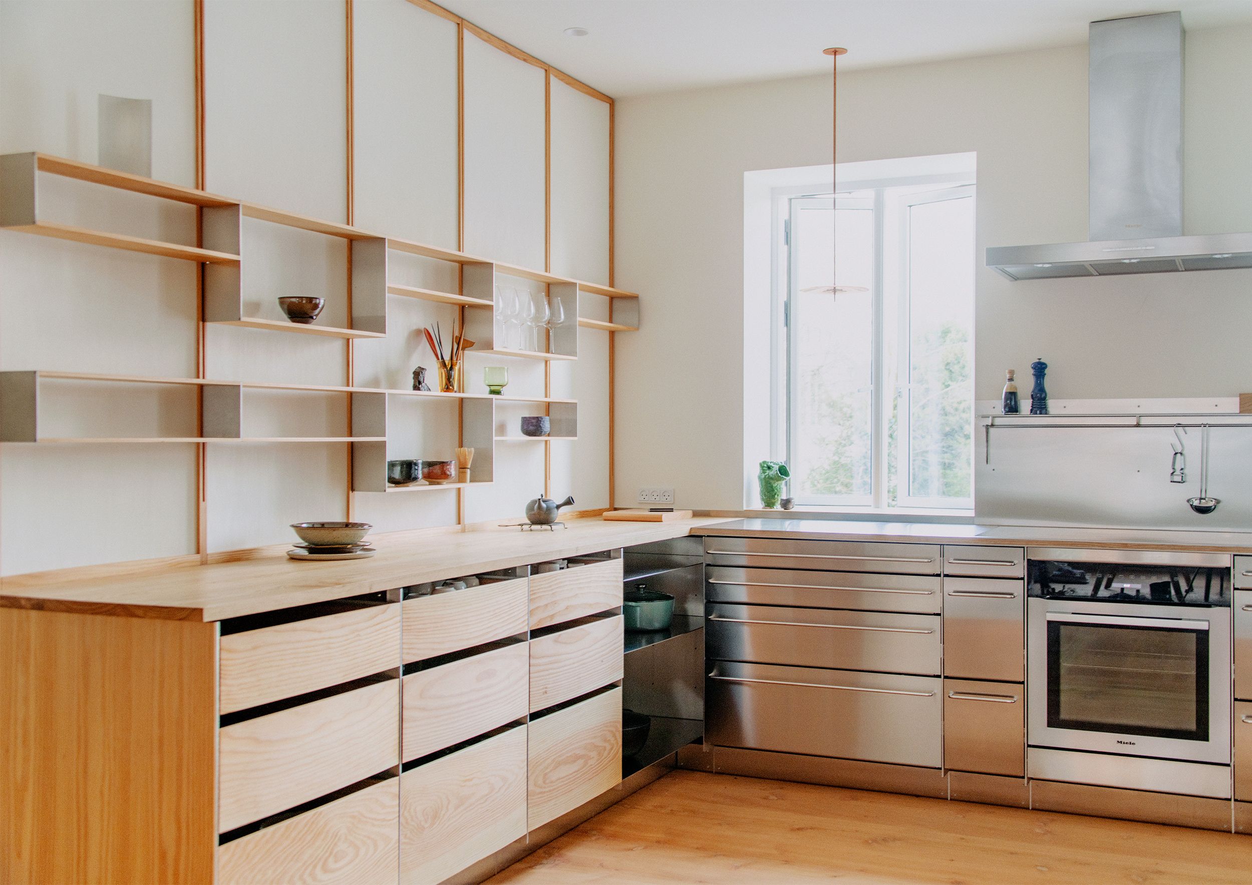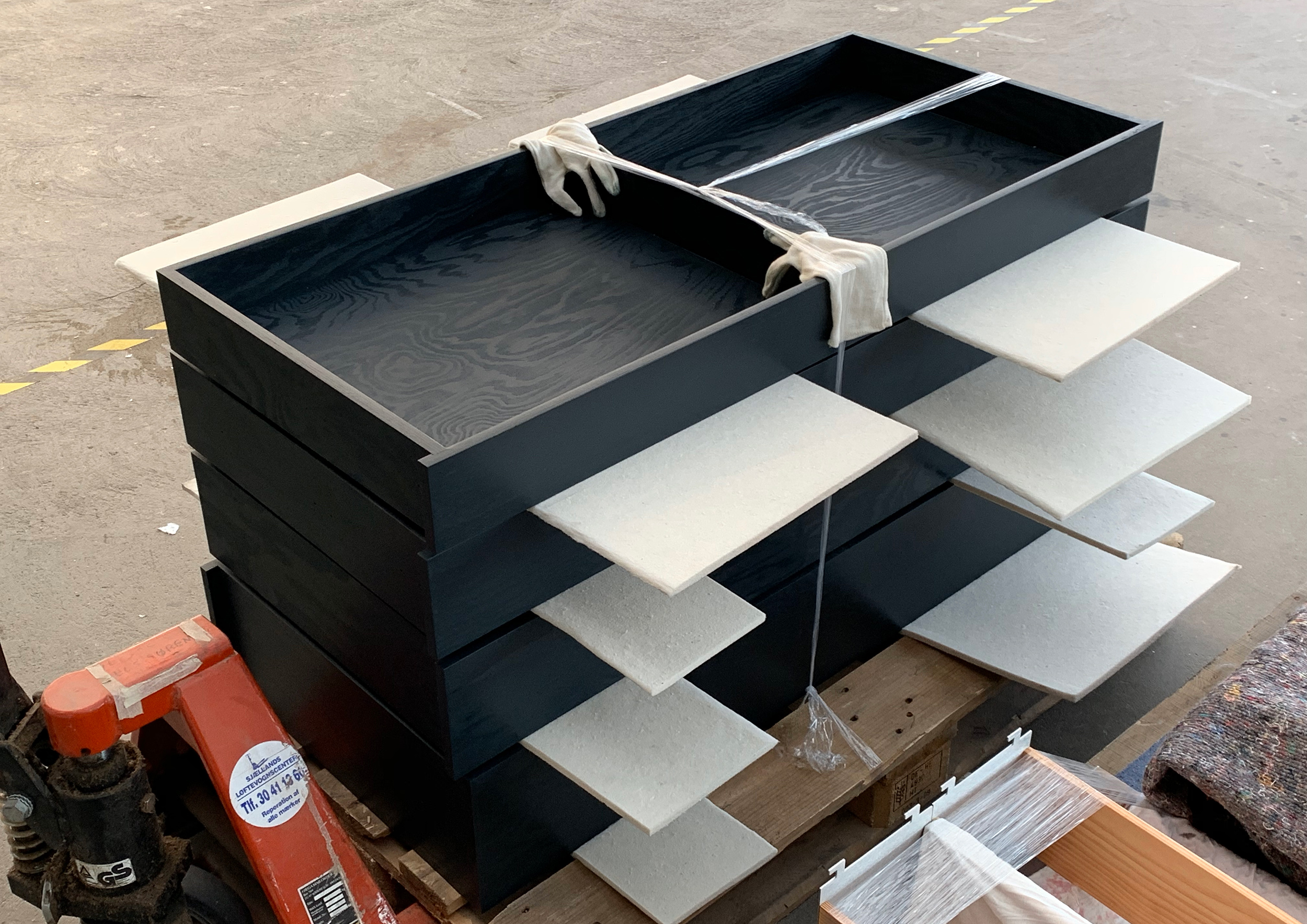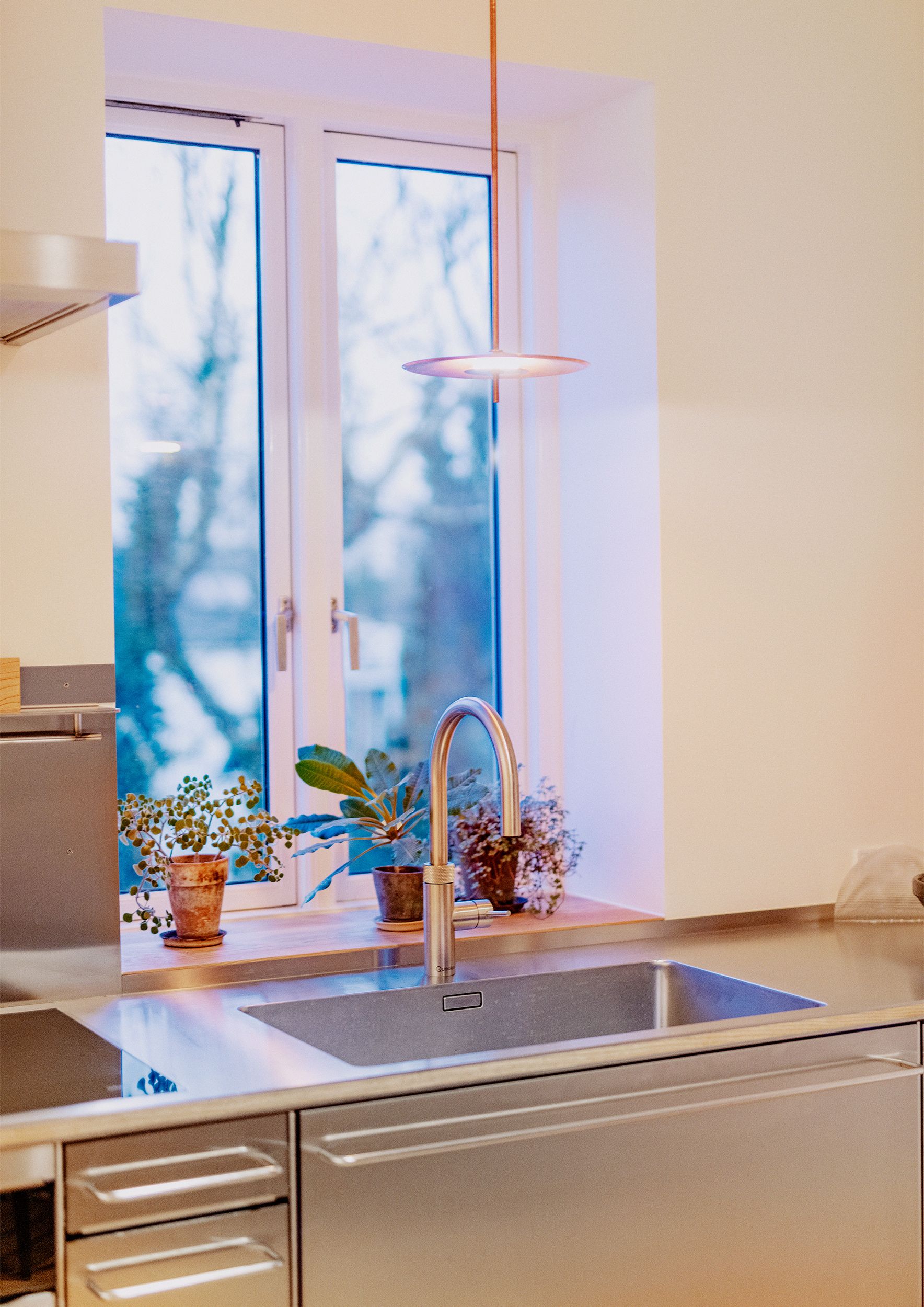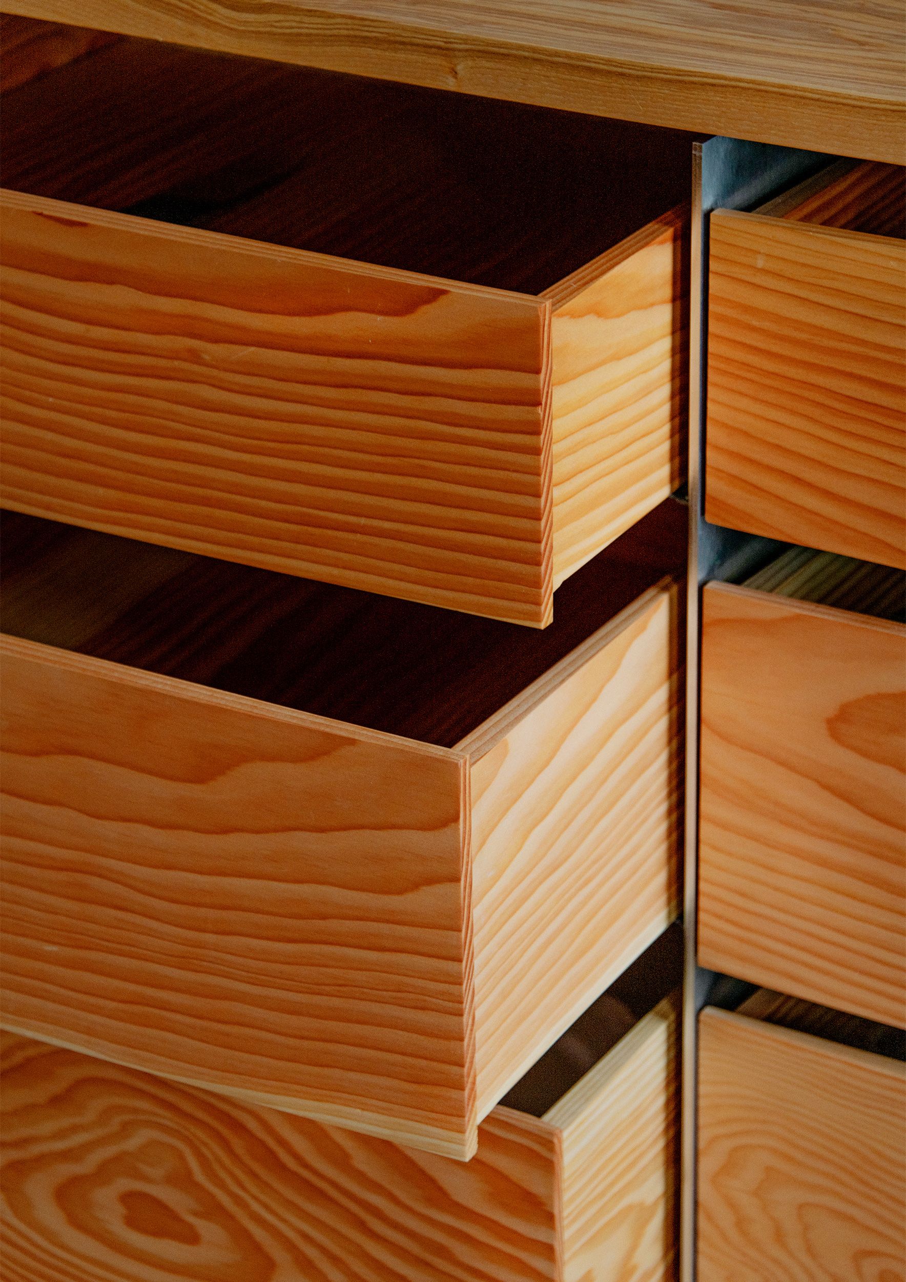 Interior 02 is the interior renovation of an apartment in Hellerup, Denmark. This project includes full description and custom production of walls, flooring, textiles, kitchen, light fixtures, bathroom, and furniture. Among other things, this project includes Painted Curtains 01, Curved Panels 01, Kitchen 01, Reflector 05 CU, Platform 01, Wardrobe 02, a custom Douglas Fir flooring solution, and a Travertine stone bathroom. While working on this renovation project, one of the first things we noticed about the space was the green color of Birch foliage reflecting into the apartment through every window. The diffused fields of yellow-greens, blue-greens, and blues painted onto the textiles seek to emphasize this effect and to create a visual union between these outdoor views and the white walls The Low Platform came from the desire to create a raised extension of the floor. Its functions are purposefully open, allowing users to find varied scenarios for its use in space: as a low table, a footrest, a podium, an element for spatial composition, etc. The carriers of the platform taper down at both ends. When viewed from the front, the platform appears to rest on top of very thin carriers and a deep dark shadow. When seen from the side, it appears very opaque and solid. As a result, when one walks around, it’s appearance changes from something ethereal and open to something very solid and closed. The client wished for a functional industrial kitchen balanced by a domestic touch. The main “service” part of the kitchen, which holds the appliances, was realized in stainless steel. The other length of the kitchen, which reaches towards the living room, is realized in Douglas Fir and Ashwood, bringing it into relation with the rest of the apartment’s warm interior. Subtle curves are seen throughout the woodwork, which gives softness to the steel and elegance to the overall mass.