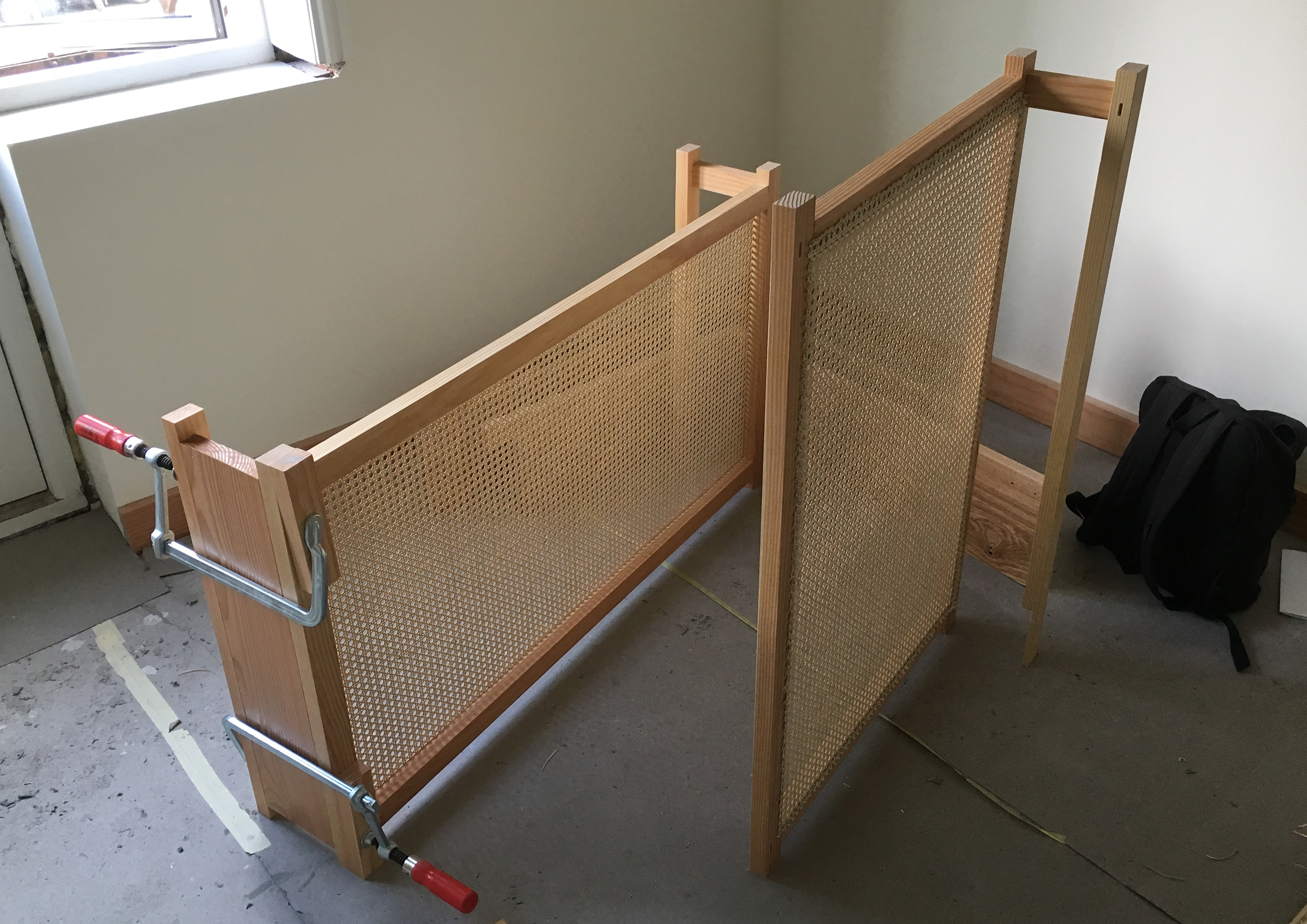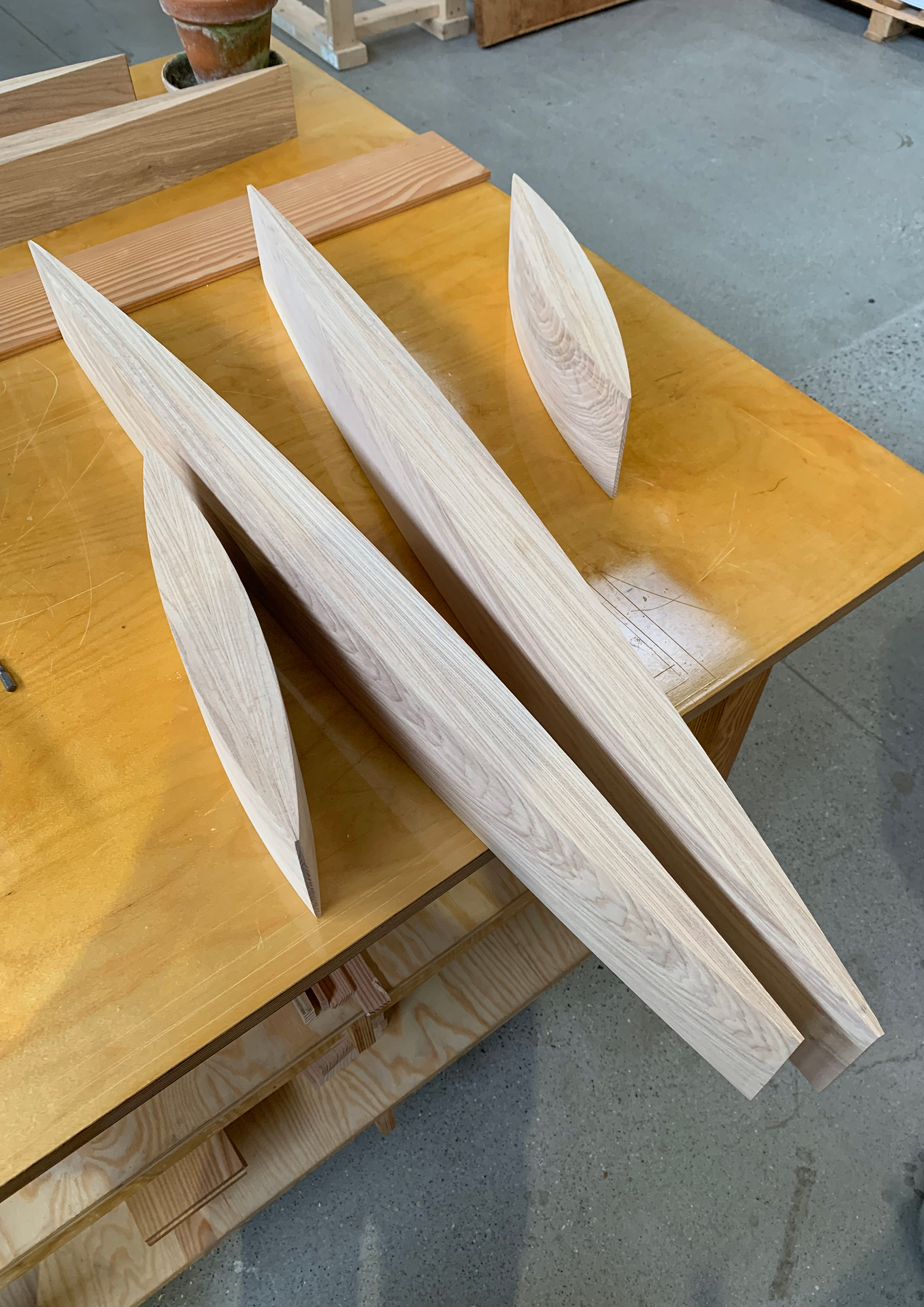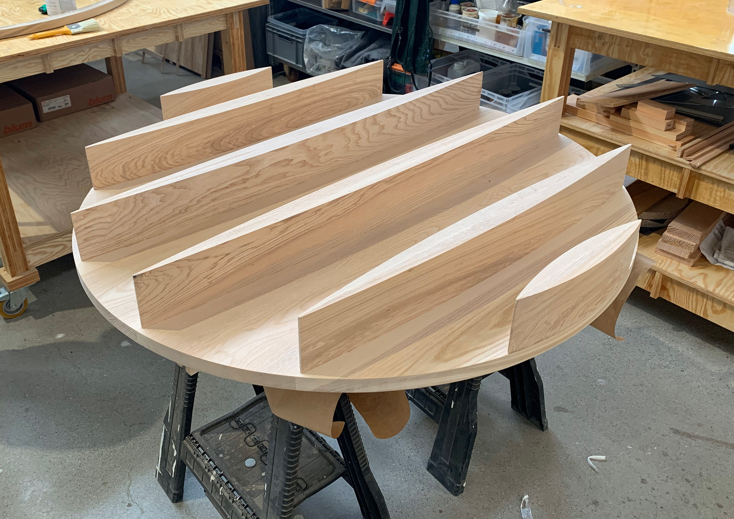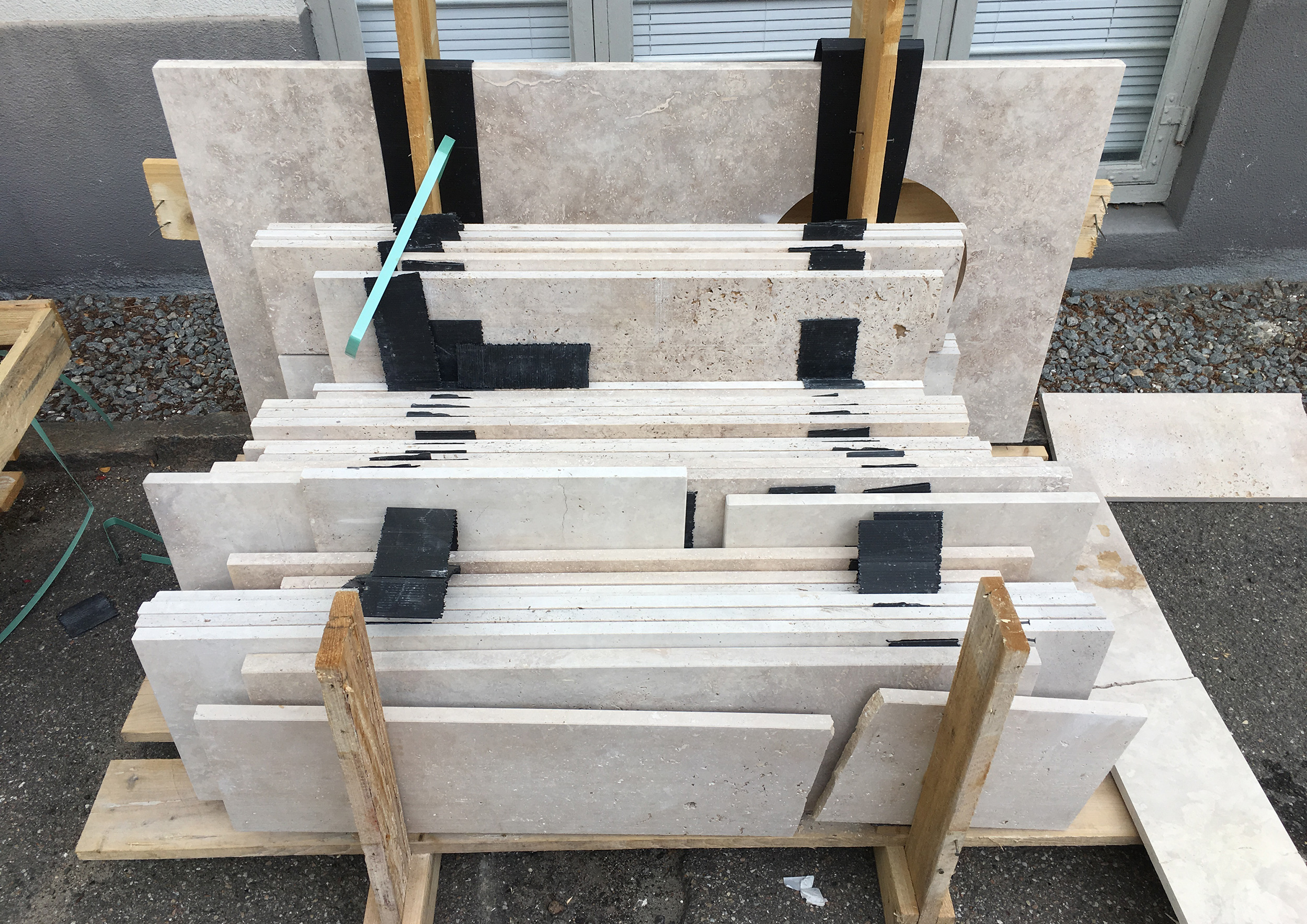 Interior 02 is the interior renovation of an apartment in Hellerup, Denmark. This project includes full description and custom production of walls, flooring, textiles, kitchen, light fixtures, bathroom, and furniture. Among other things, this project includes Painted Curtains 01, Curved Panels 01, Kitchen 01, Reflector 05 CU, Platform 01, Wardrobe 02, a custom Douglas Fir flooring solution, and a Travertine stone bathroom. While working on this renovation project, one of the first things we noticed about the space was the green color of Birch foliage reflecting into the apartment through every window. The diffused fields of yellow-greens, blue-greens, and blues painted onto the textiles seek to emphasize this effect and to create a visual union between these outdoor views and the white walls The Low Platform came from the desire to create a raised extension of the floor. Its functions are purposefully open, allowing users to find varied scenarios for its use in space: as a low table, a footrest, a podium, an element for spatial composition, etc. The carriers of the platform taper down at both ends. When viewed from the front, the platform appears to rest on top of very thin carriers and a deep dark shadow. When seen from the side, it appears very opaque and solid. As a result, when one walks around, it’s appearance changes from something ethereal and open to something very solid and closed. The client wished for a functional industrial kitchen balanced by a domestic touch. The main “service” part of the kitchen, which holds the appliances, was realized in stainless steel. The other length of the kitchen, which reaches towards the living room, is realized in Douglas Fir and Ashwood, bringing it into relation with the rest of the apartment’s warm interior. Subtle curves are seen throughout the woodwork, which gives softness to the steel and elegance to the overall mass.