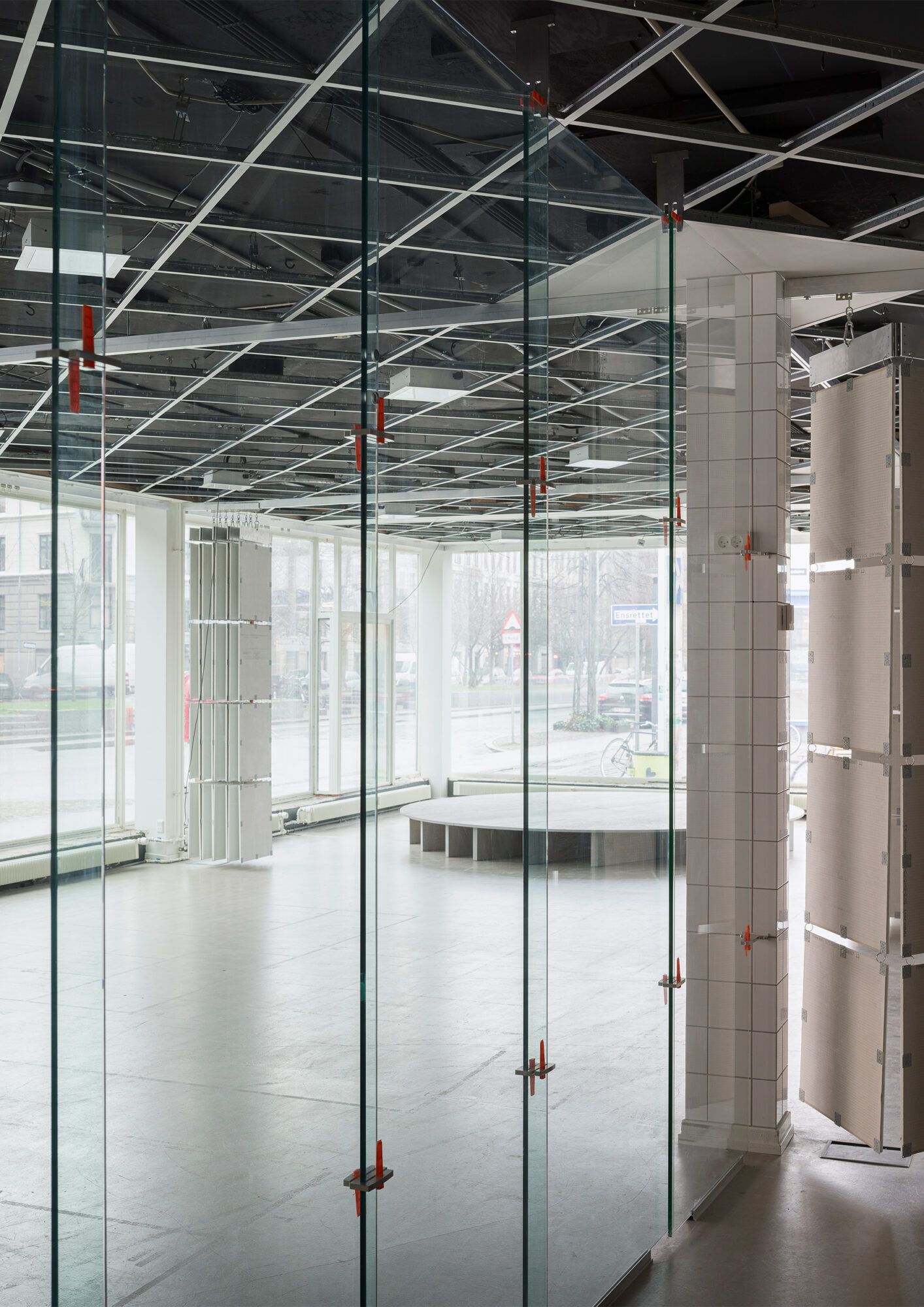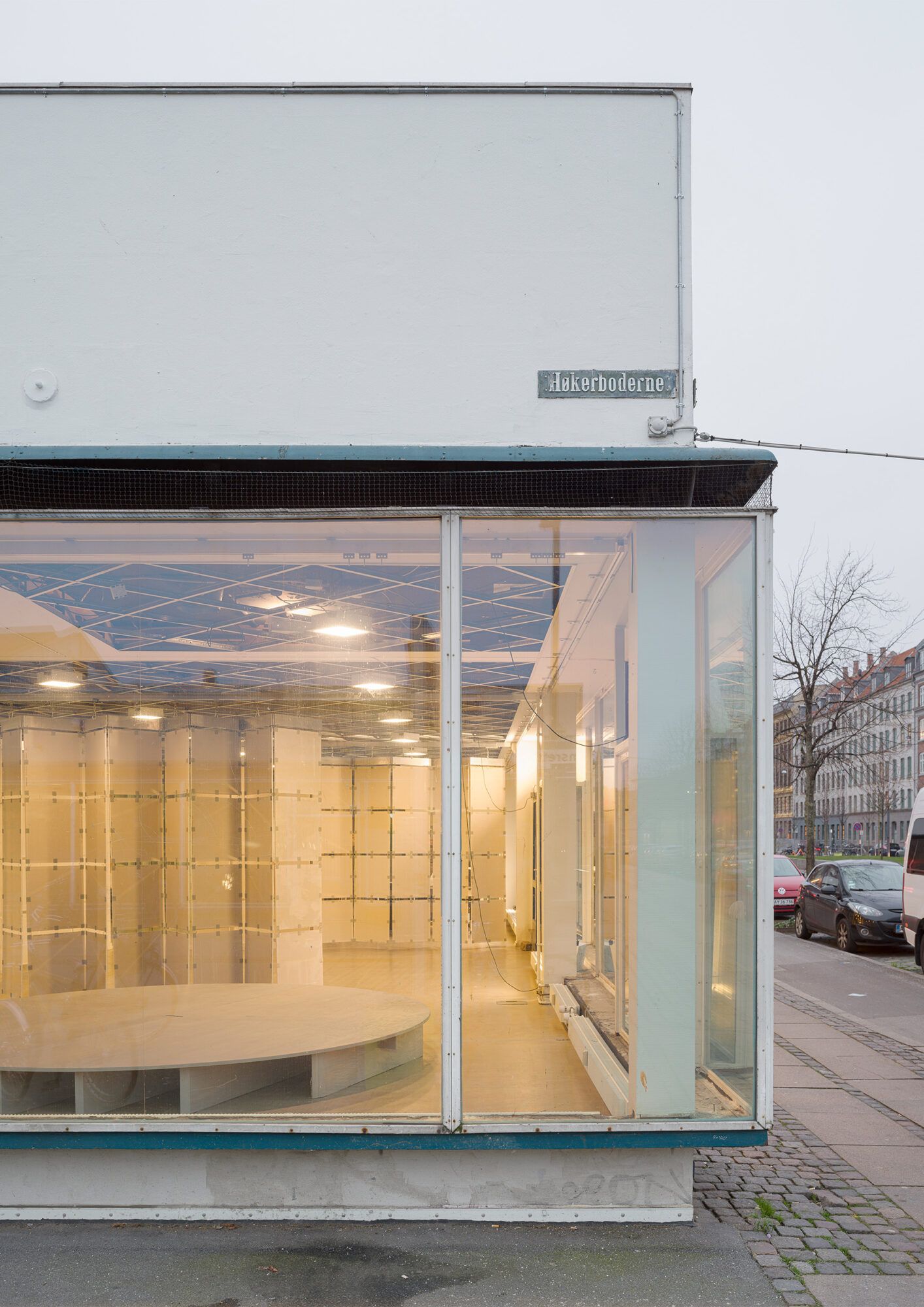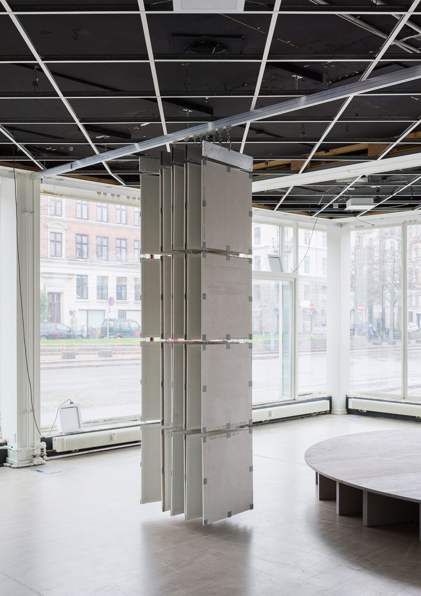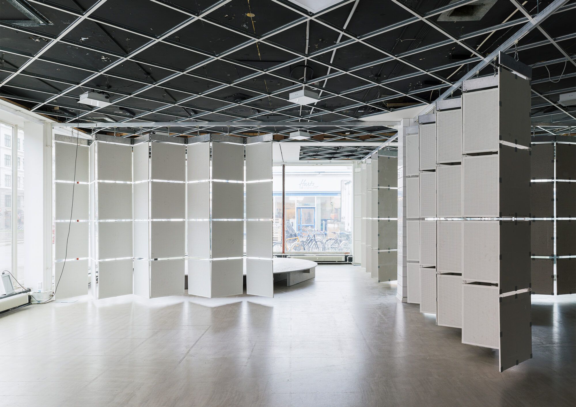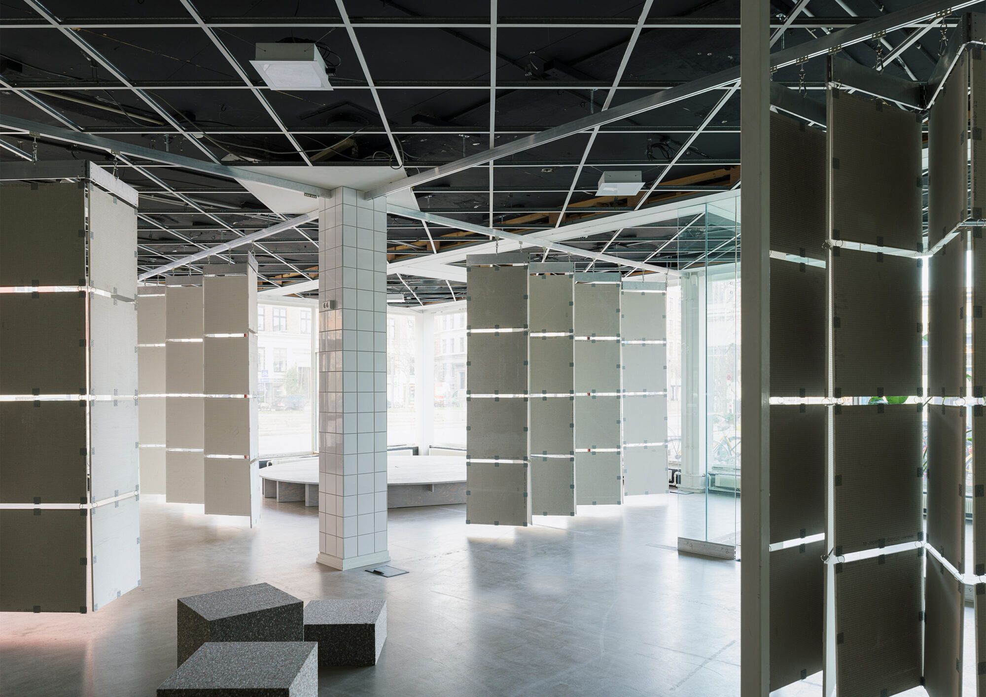 Since 2019, Art Hub Copenhagen has been based in Kødbyen, the Copenhagen Meatpacking District. Within a couple of years, Art Hub will move to Thoravej 29. This temporary perspective is a premise which is turned into the general dogma for our transformation: Every element must be reused. Nothing is disposed but revitalized through the rewriting of function and appearance. The transformation of Art Hub Copenhagen points towards a general path for how recycling can be rethought in architecture. When resources are not consumed, but regenerated into value-creating elements, recycling is no longer a necessary evil, but the very catalyst of form and intention. The original acoustic ceiling panels from the pre-existing Danske Bank office space have been taken down and reused to build the flexible space-dividing walls. The ceiling panels have been connected using simple, reuseable hardware, and are hung from sliding door tracks. The Danske Bank office space had glass walls that were glued to each other and to the floor, walls, and ceiling with silicone glue. This way of building results in an element that is difficult to disassemble and transform at a later stage. We use the existing glass panes to build a dividing wall and a shelf system, in which the glass panes are held together by CNC-milled aluminium brackets and plastic wedge shims. This allows for the glass panes to be easily reused in the future, when the space will be transformed yet again. Collaboration with Pihlmann Architects.