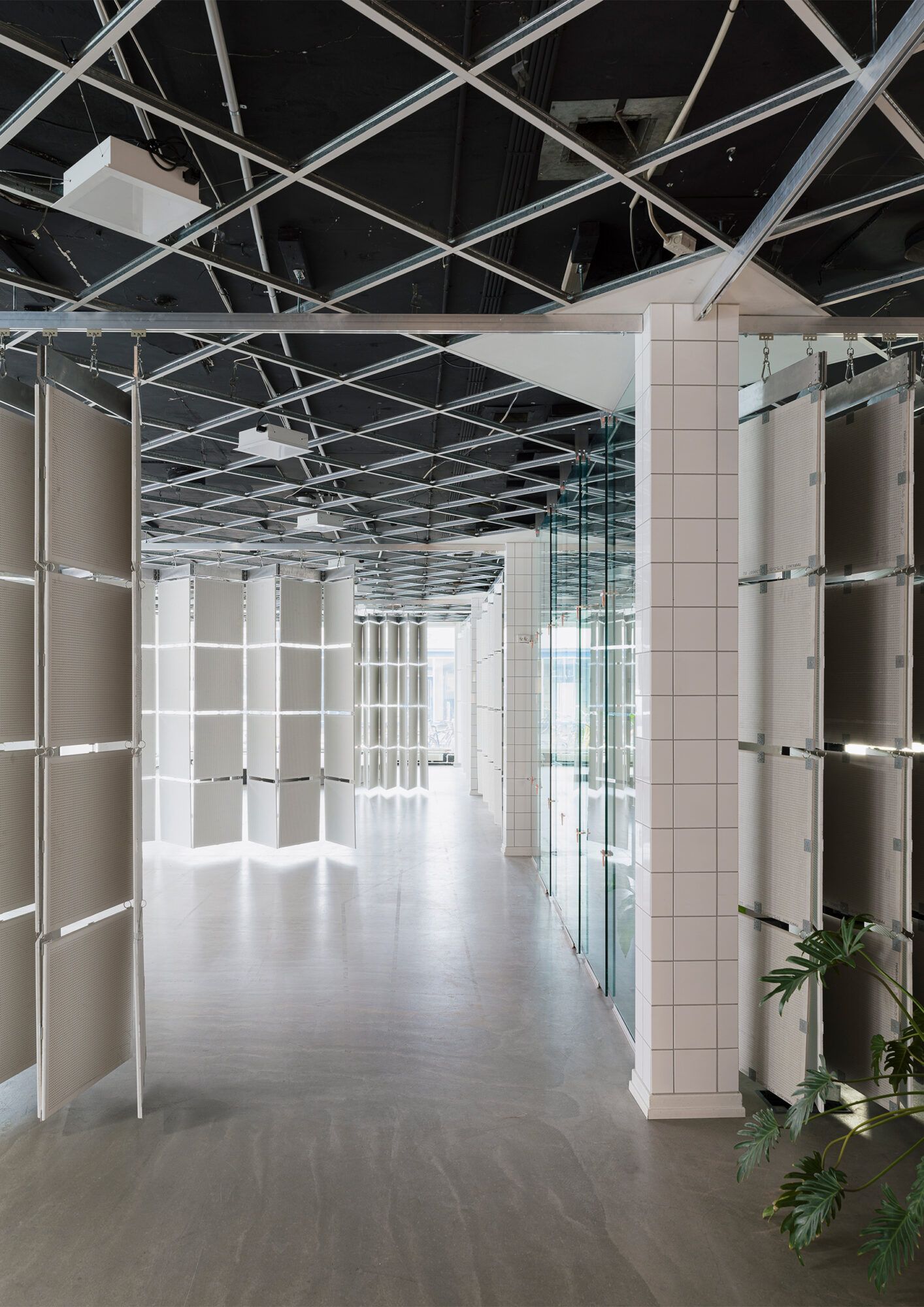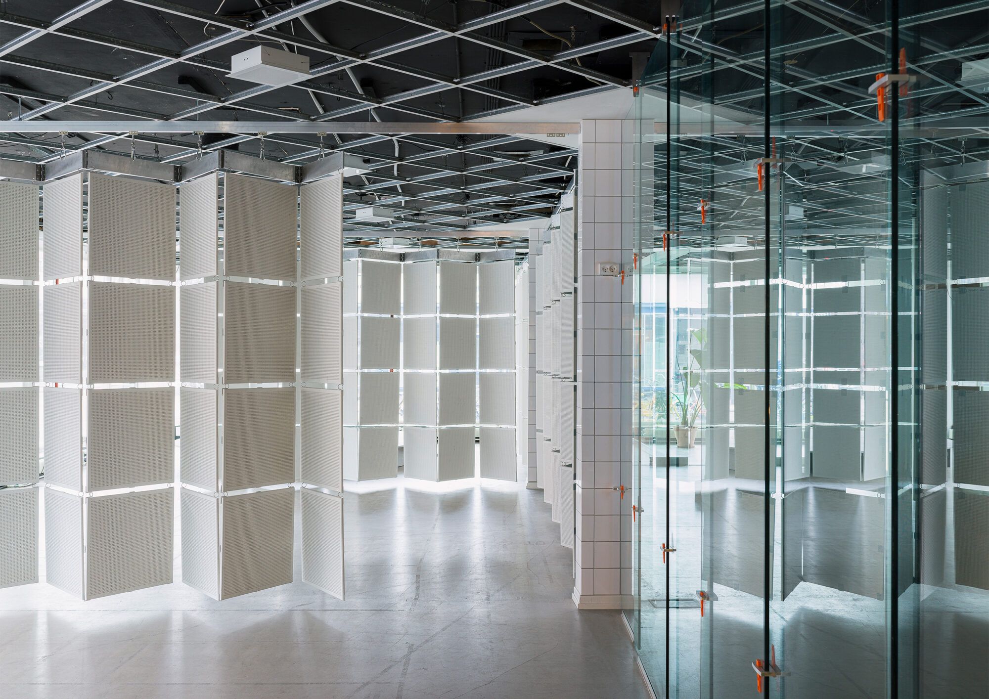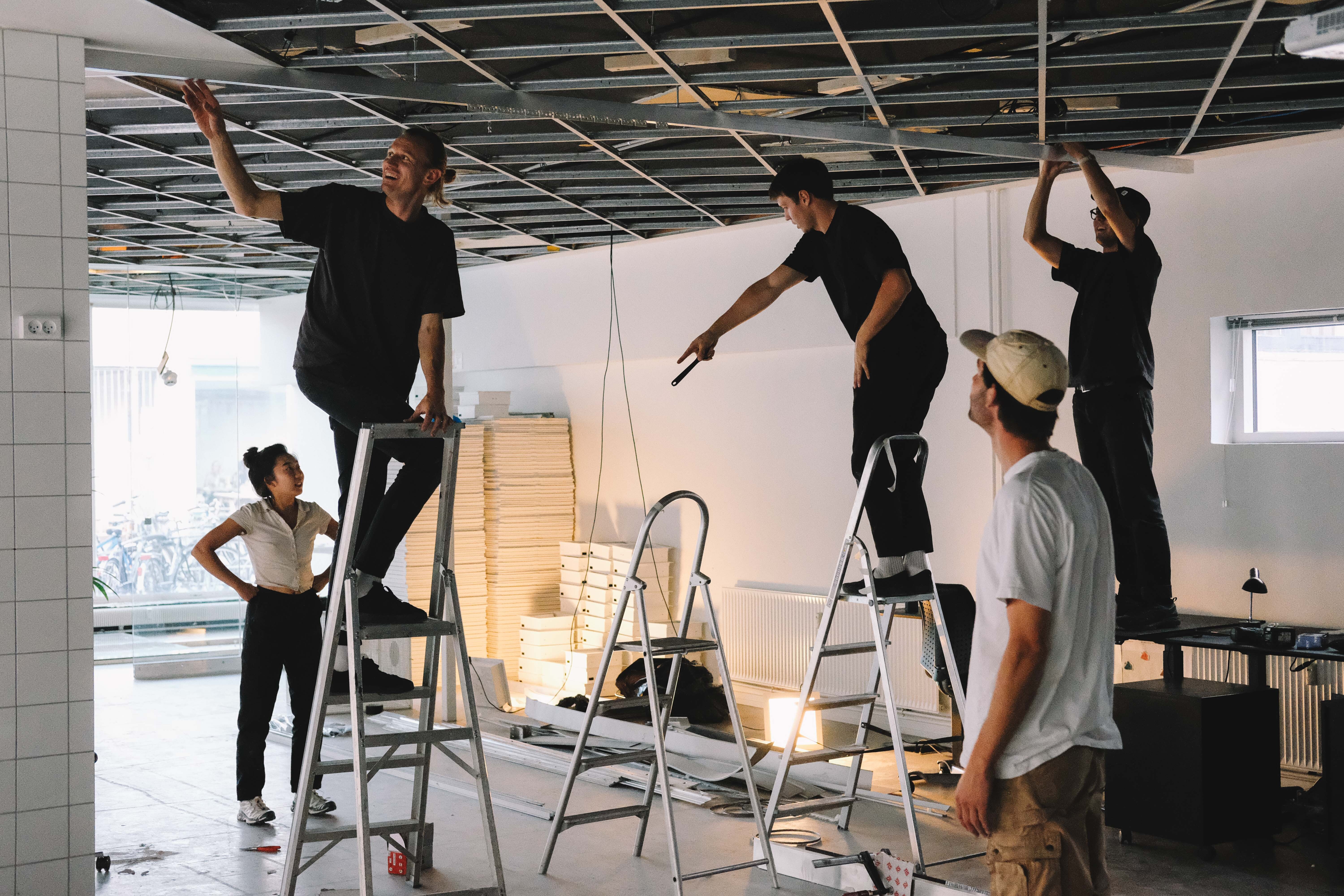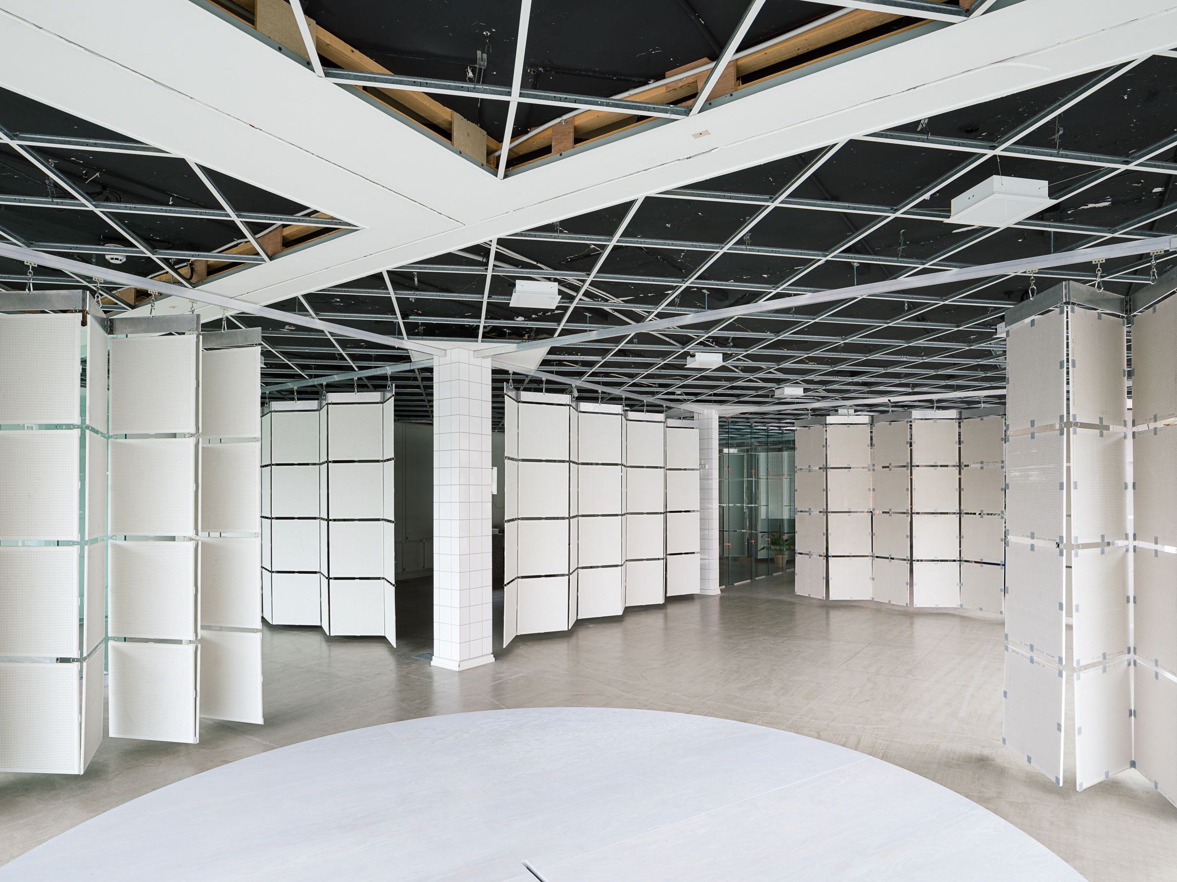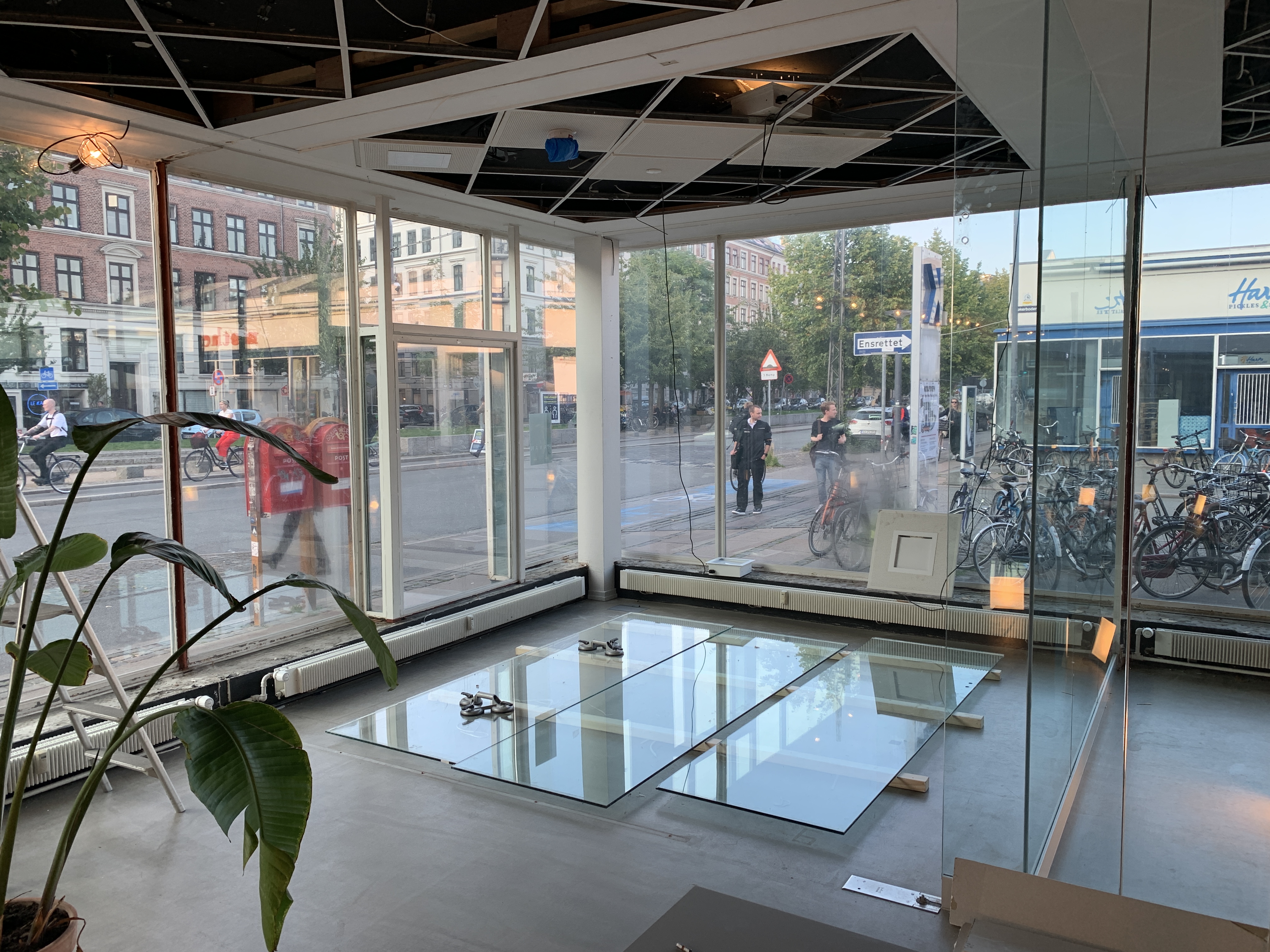 Since 2019, Art Hub Copenhagen has been based in Kødbyen, the Copenhagen Meatpacking District. Within a couple of years, Art Hub will move to Thoravej 29. This temporary perspective is a premise which is turned into the general dogma for our transformation: Every element must be reused. Nothing is disposed but revitalized through the rewriting of function and appearance. The transformation of Art Hub Copenhagen points towards a general path for how recycling can be rethought in architecture. When resources are not consumed, but regenerated into value-creating elements, recycling is no longer a necessary evil, but the very catalyst of form and intention. The original acoustic ceiling panels from the pre-existing Danske Bank office space have been taken down and reused to build the flexible space-dividing walls. The ceiling panels have been connected using simple, reuseable hardware, and are hung from sliding door tracks. The Danske Bank office space had glass walls that were glued to each other and to the floor, walls, and ceiling with silicone glue. This way of building results in an element that is difficult to disassemble and transform at a later stage. We use the existing glass panes to build a dividing wall and a shelf system, in which the glass panes are held together by CNC-milled aluminium brackets and plastic wedge shims. This allows for the glass panes to be easily reused in the future, when the space will be transformed yet again. Collaboration with Pihlmann Architects.