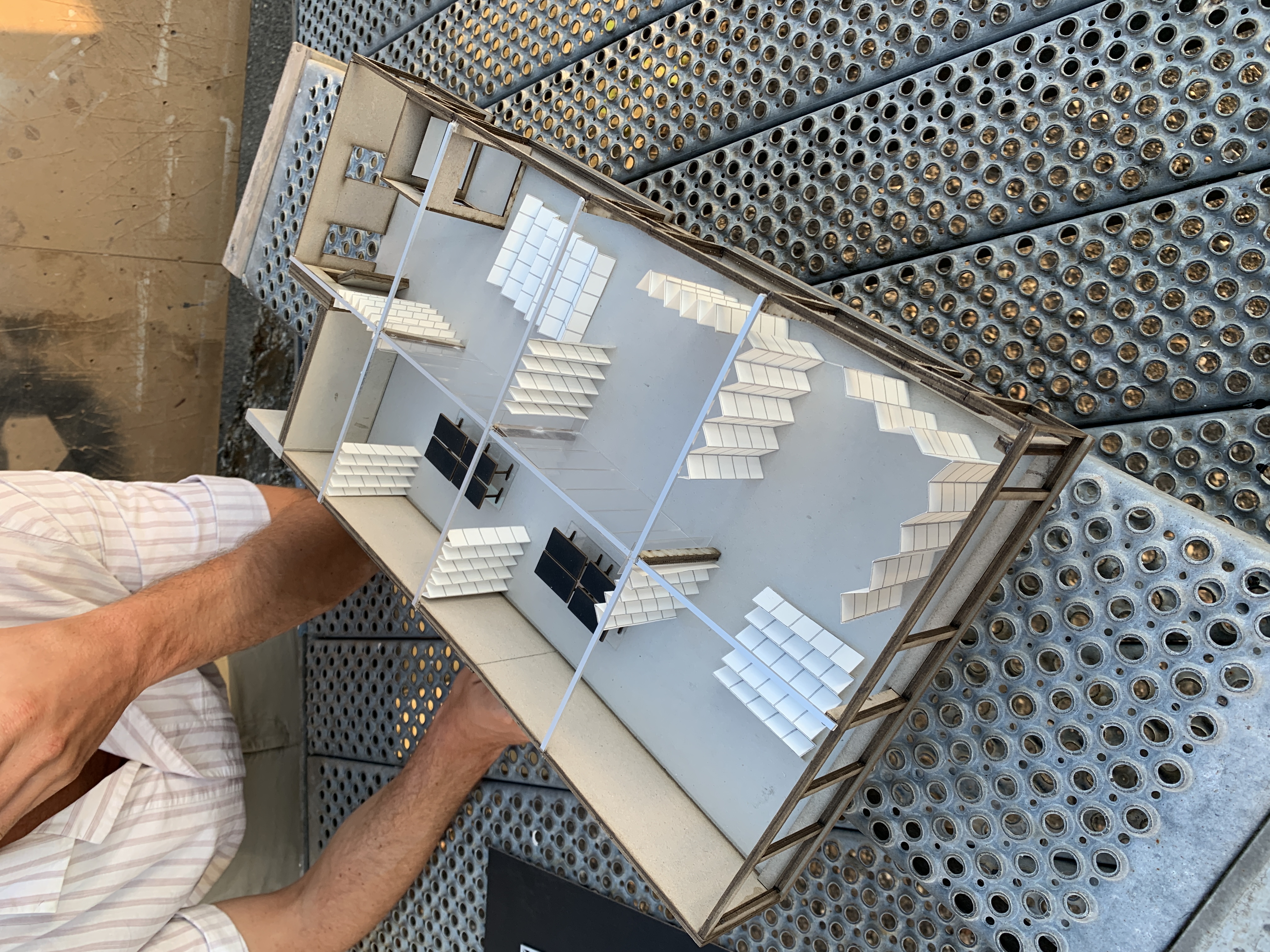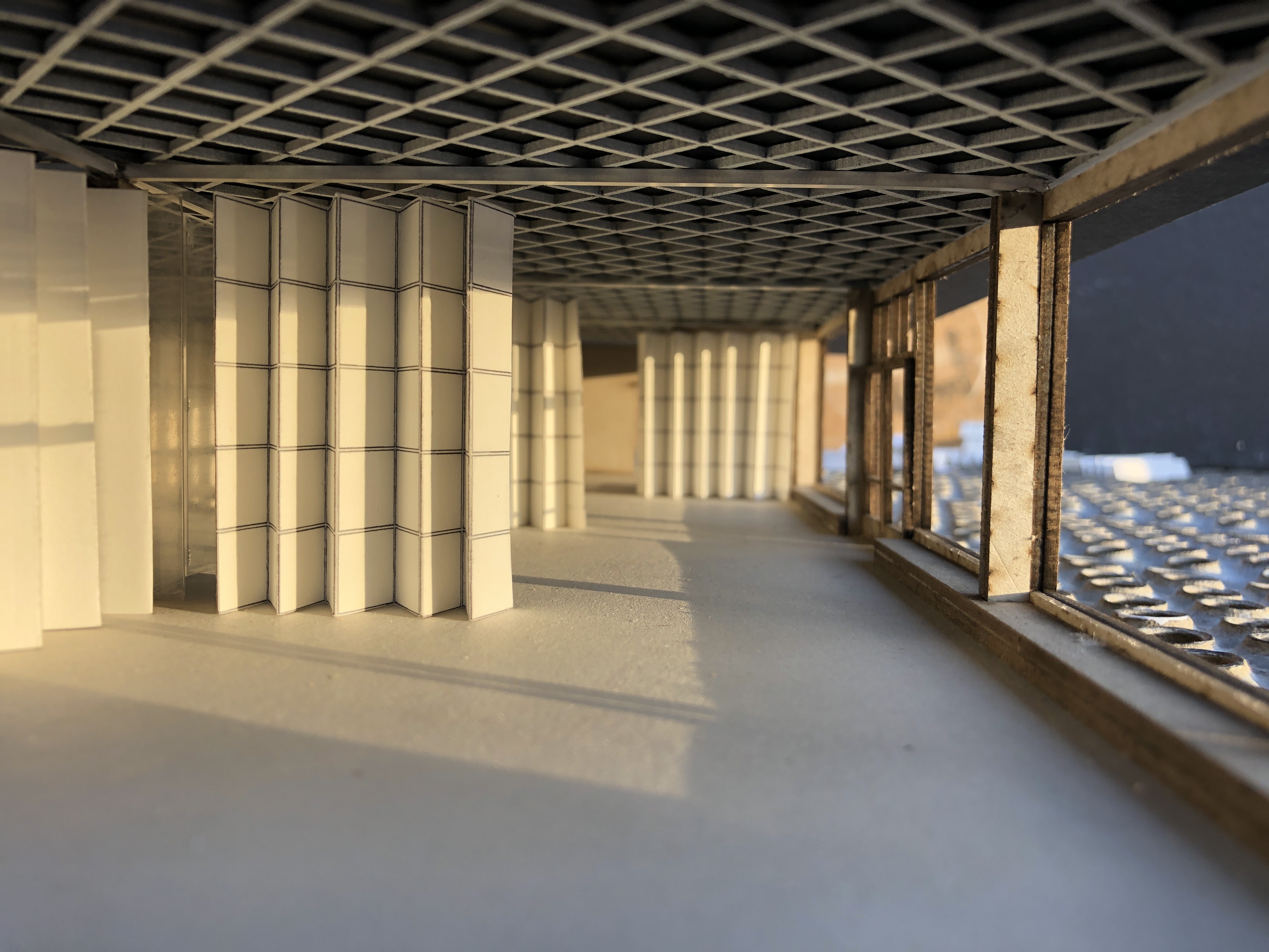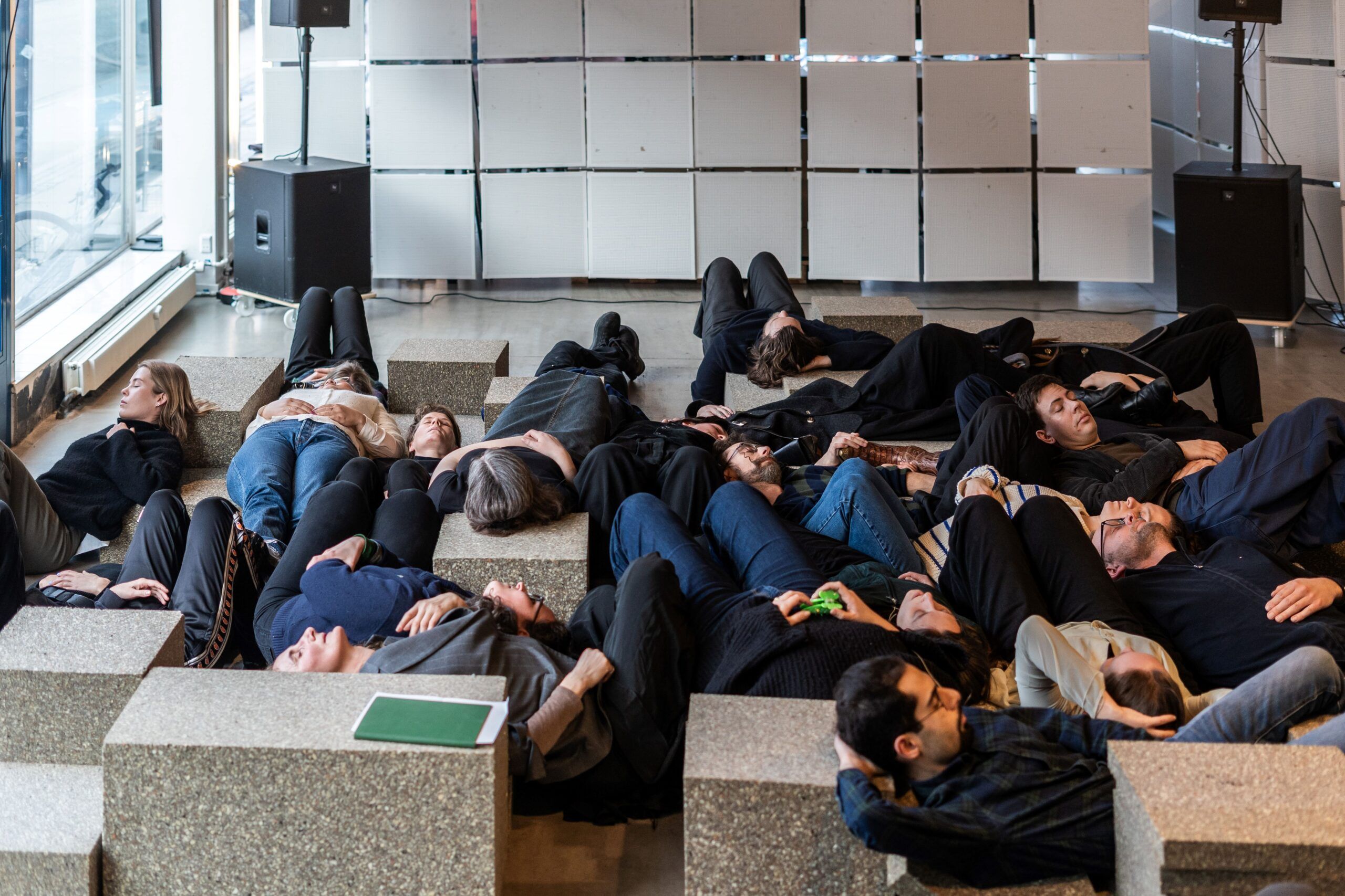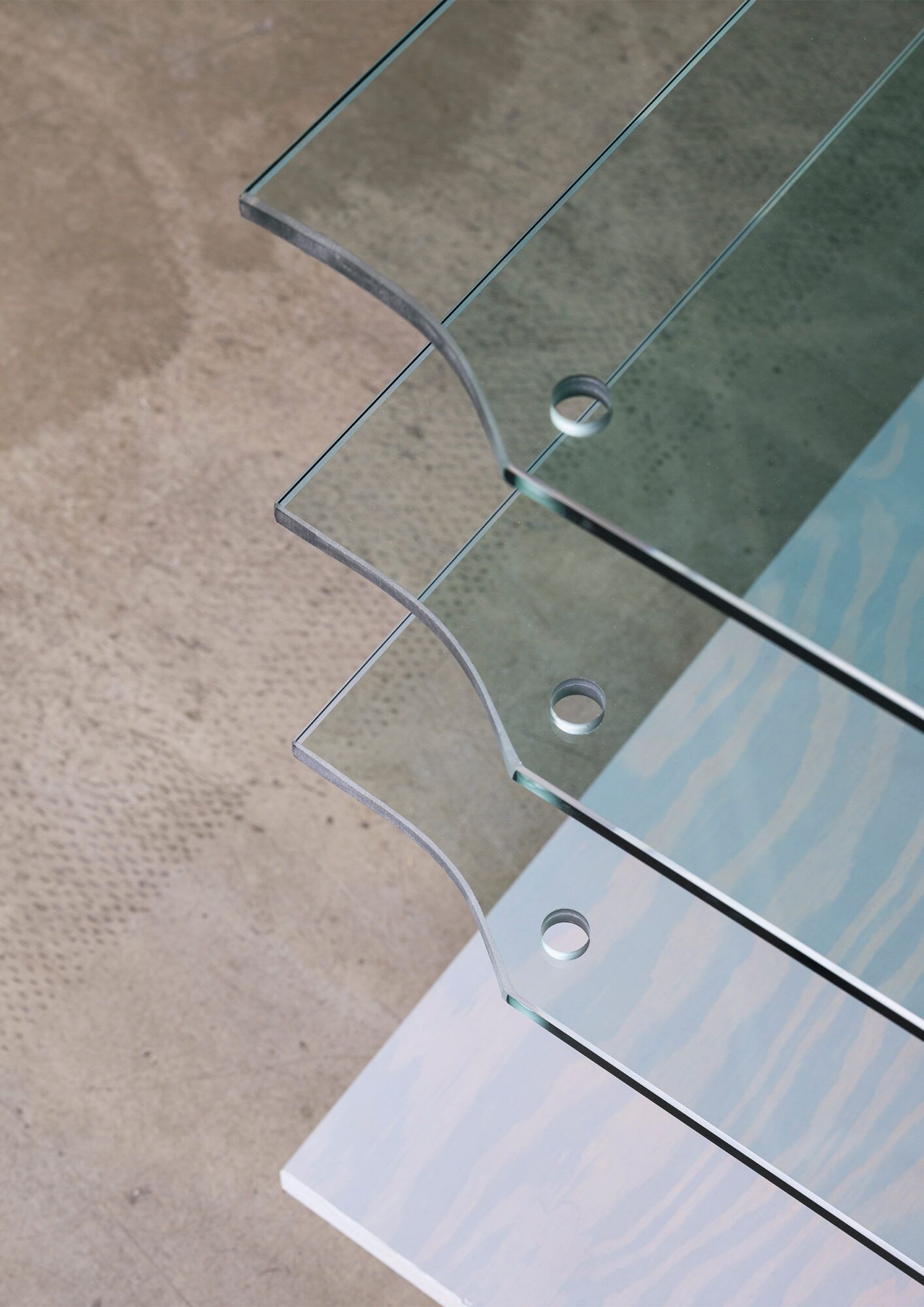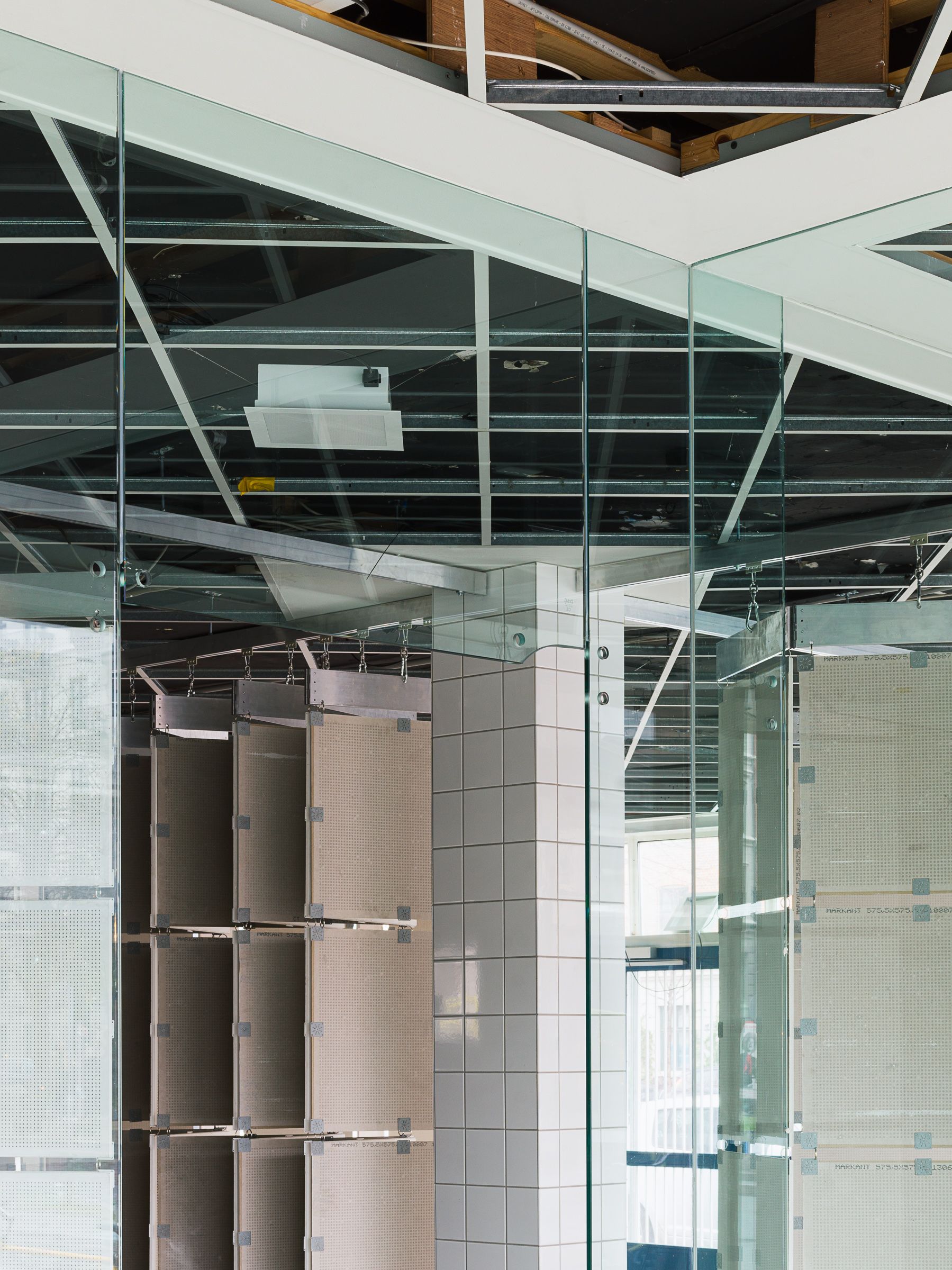Since 2019, Art Hub Copenhagen has been based in Kødbyen, the Copenhagen Meatpacking District. Within a couple of years, Art Hub will move to Thoravej 29. This temporary perspective is a premise which is turned into the general dogma for our transformation: Every element must be reused. Nothing is disposed but revitalized through the rewriting of function and appearance. The transformation of Art Hub Copenhagen points towards a general path for how recycling can be rethought in architecture. When resources are not consumed, but regenerated into value-creating elements, recycling is no longer a necessary evil, but the very catalyst of form and intention. The original acoustic ceiling panels from the pre-existing Danske Bank office space have been taken down and reused to build the flexible space-dividing walls. The ceiling panels have been connected using simple, reuseable hardware, and are hung from sliding door tracks. The Danske Bank office space had glass walls that were glued to each other and to the floor, walls, and ceiling with silicone glue. This way of building results in an element that is difficult to disassemble and transform at a later stage. We use the existing glass panes to build a dividing wall and a shelf system, in which the glass panes are held together by CNC-milled aluminium brackets and plastic wedge shims. This allows for the glass panes to be easily reused in the future, when the space will be transformed yet again. Collaboration with Pihlmann Architects.