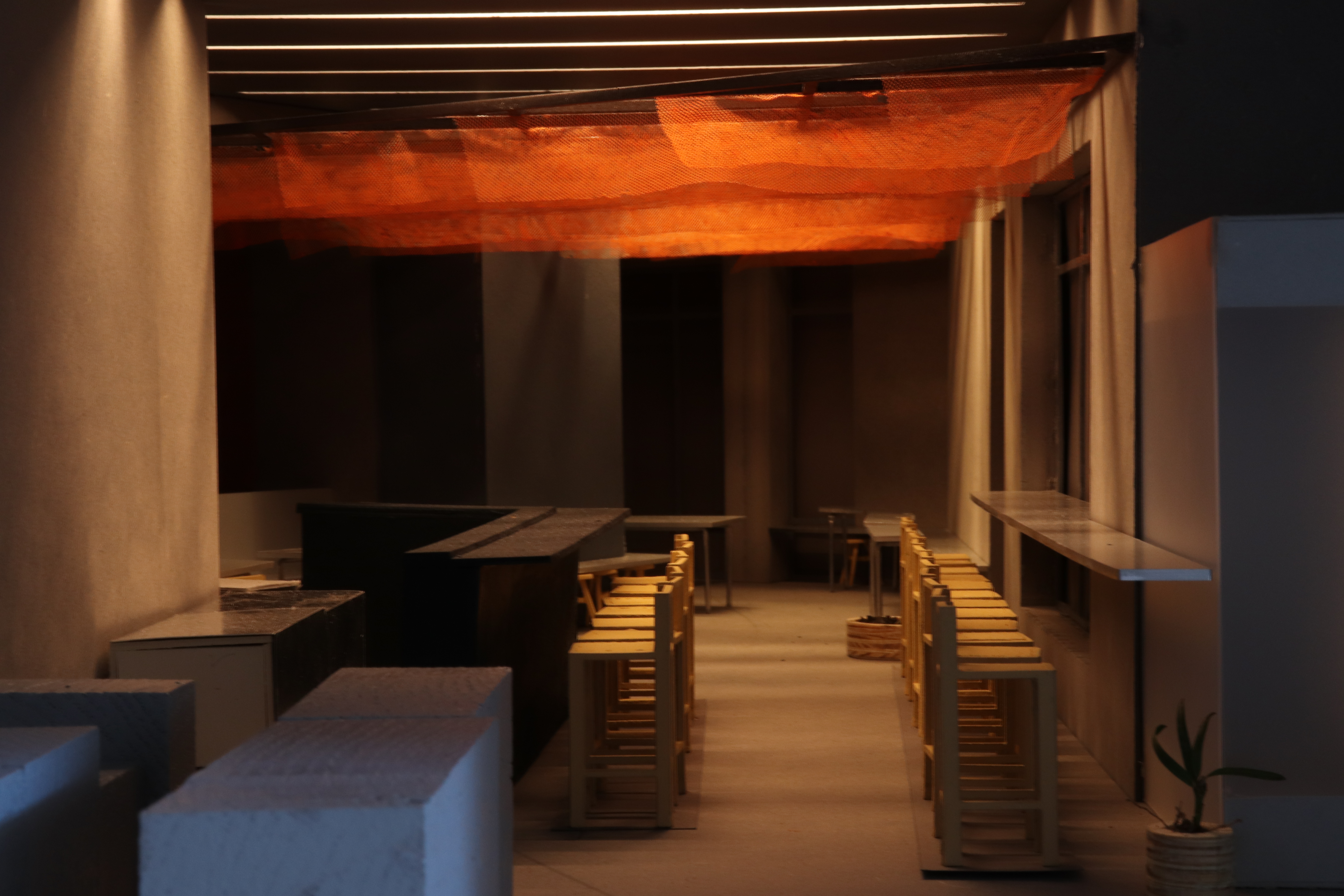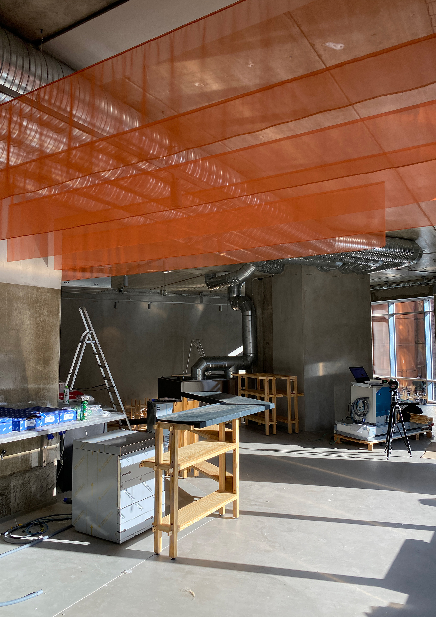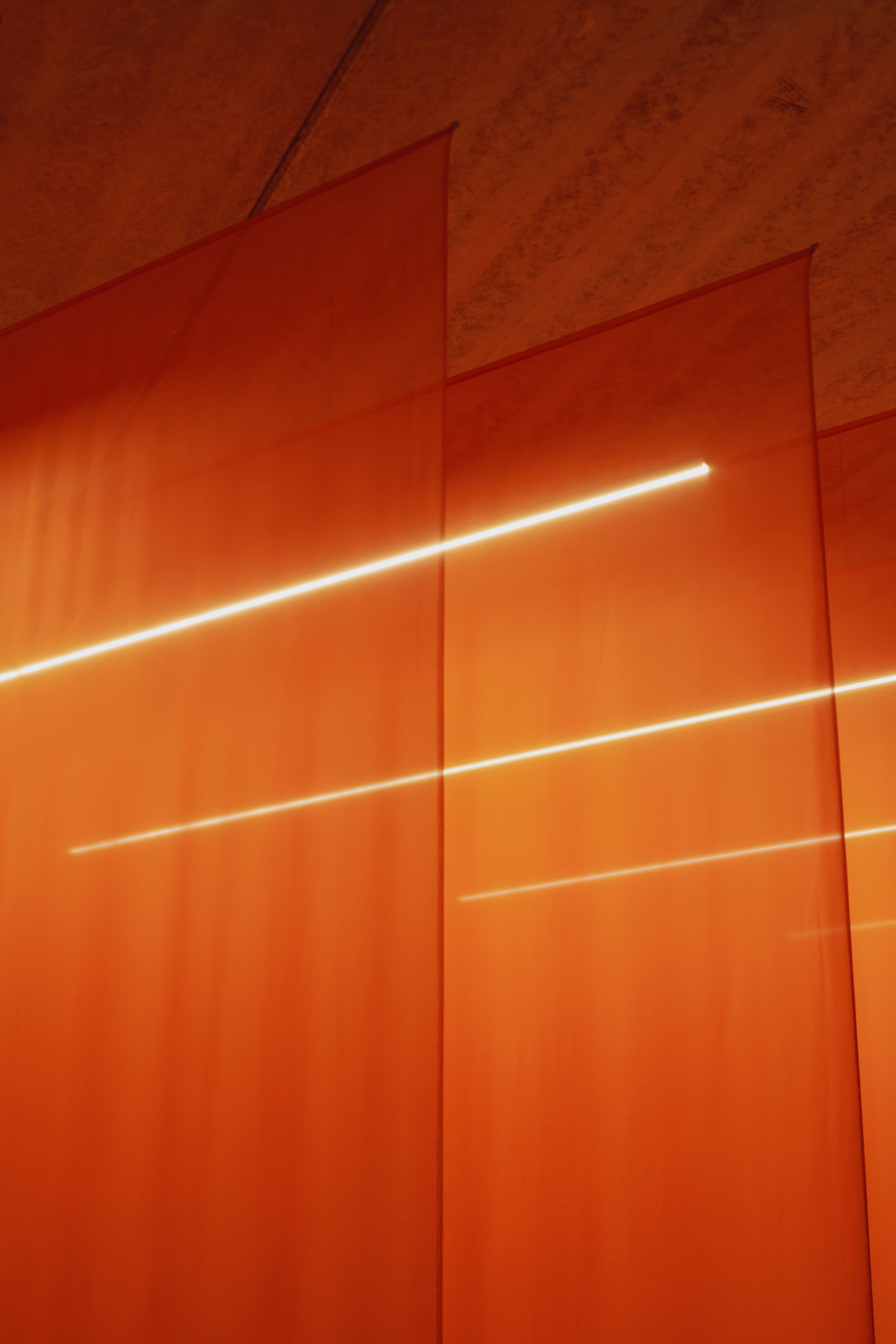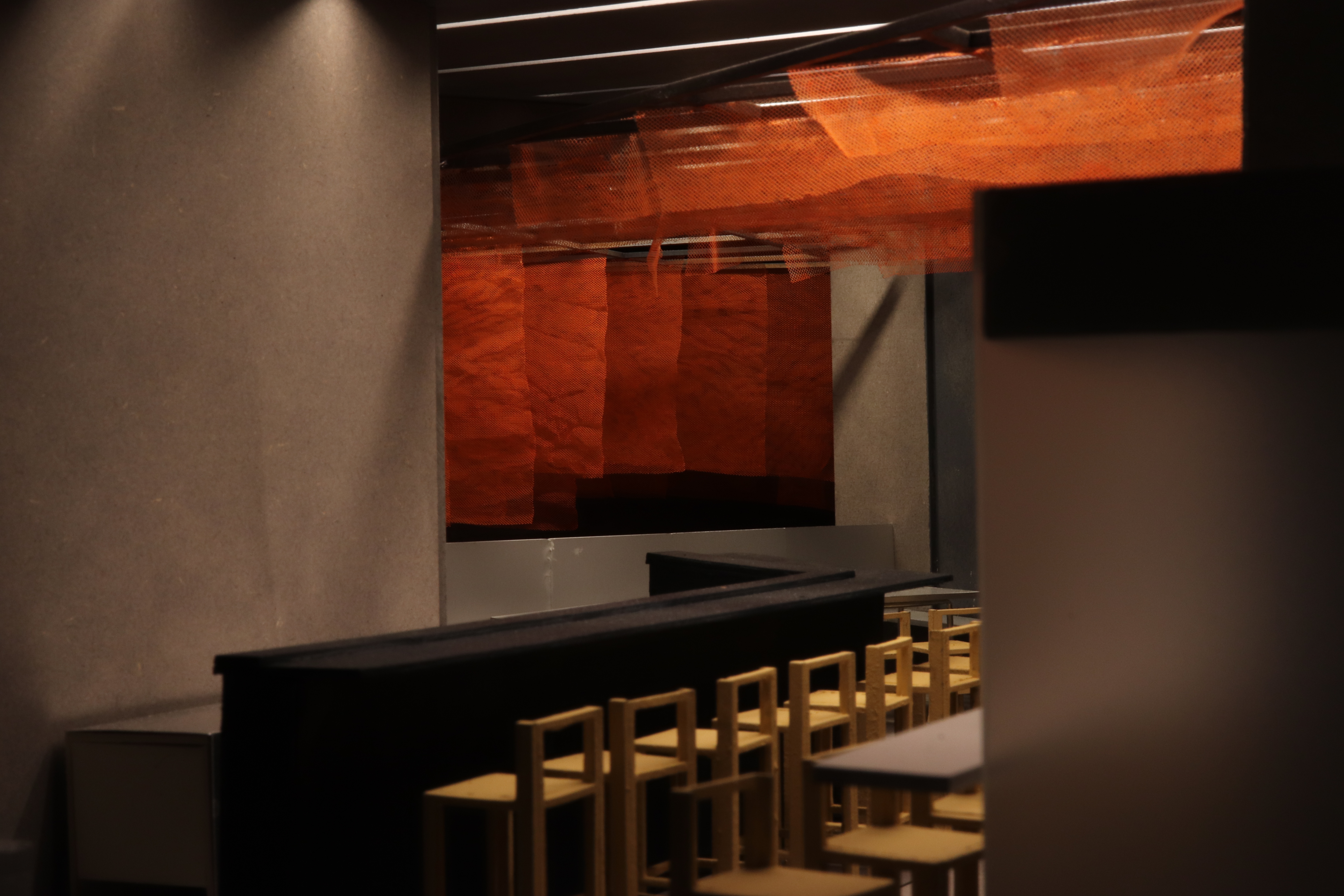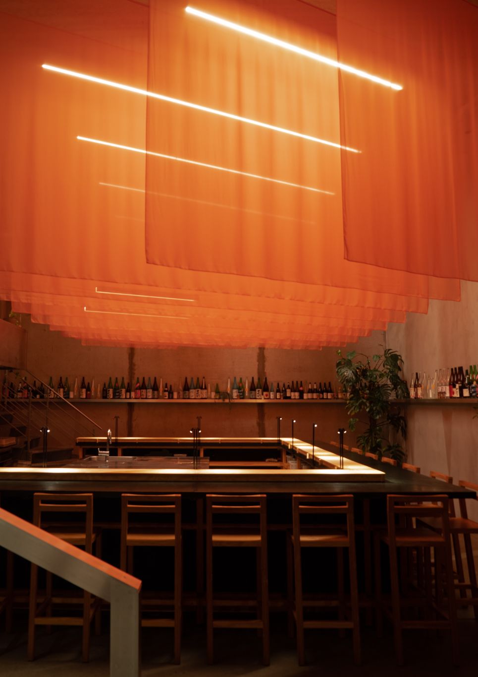 Kōnā’s interior unfolds in two distinct spaces. Guests first step into the intimate Izakaya, where a soft, low textile ceiling creates a relaxed atmosphere. As they descend the stairs, the space expands dramatically, revealing the Omakase Bar with its soaring height. Suspended textiles and carefully designed lighting soften the concrete’s rawness while giving the space a distinct identity. As guests move through, translucent orange textiles shift in appearance, dissolving into an atmospheric cloud of color. This interplay of light and material infuses warmth into the cool concrete, creating a space that feels both stimulating and inviting.