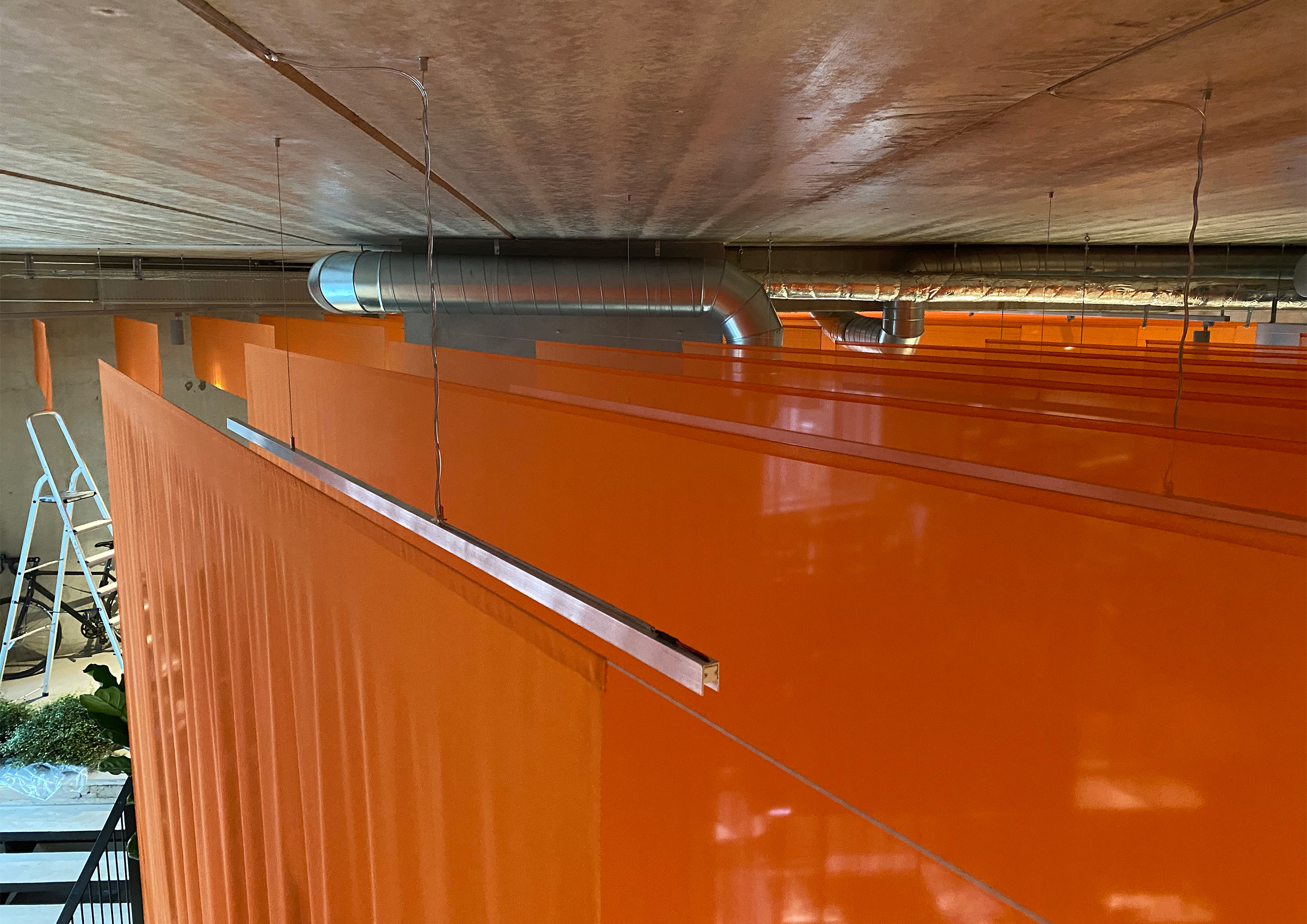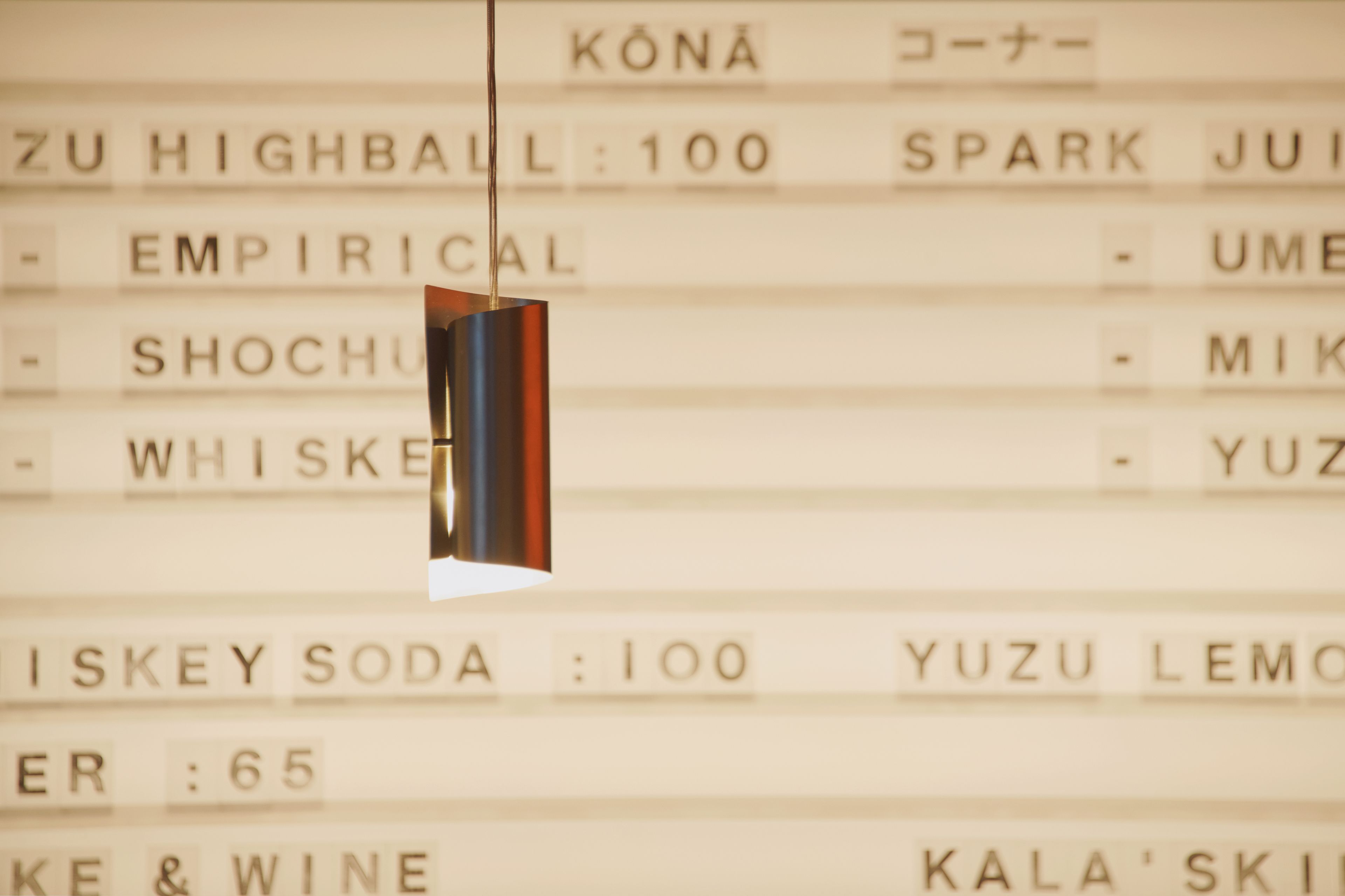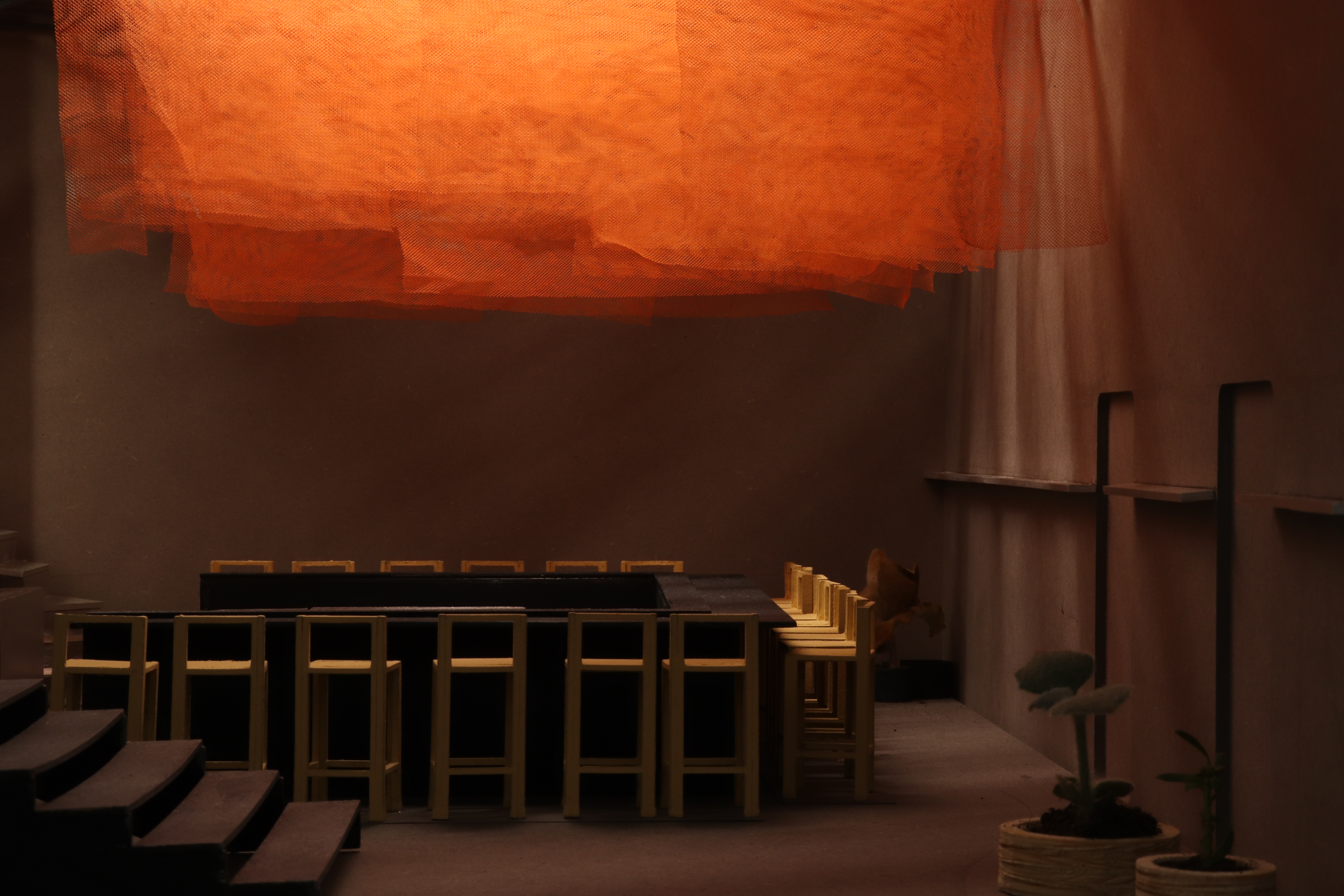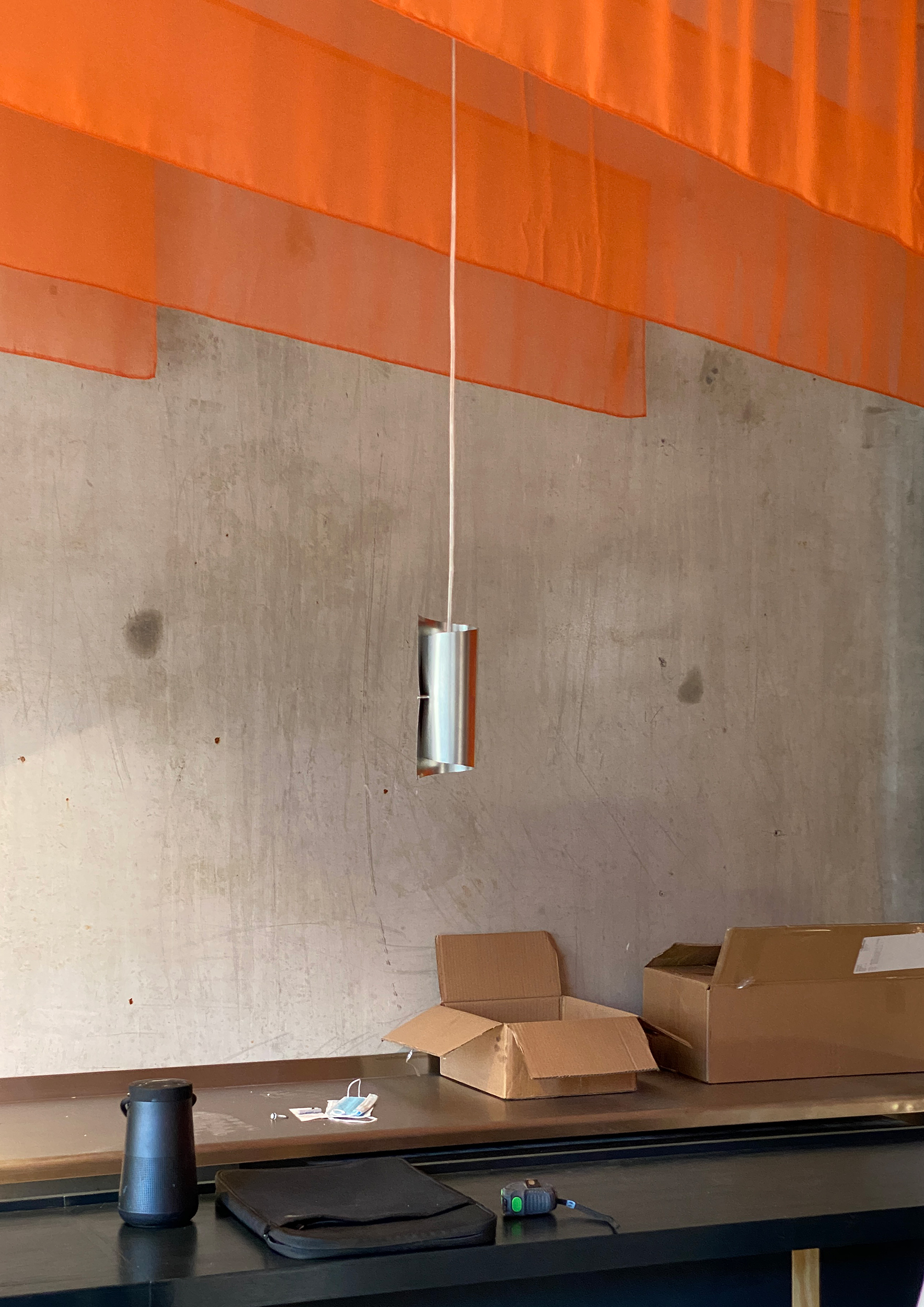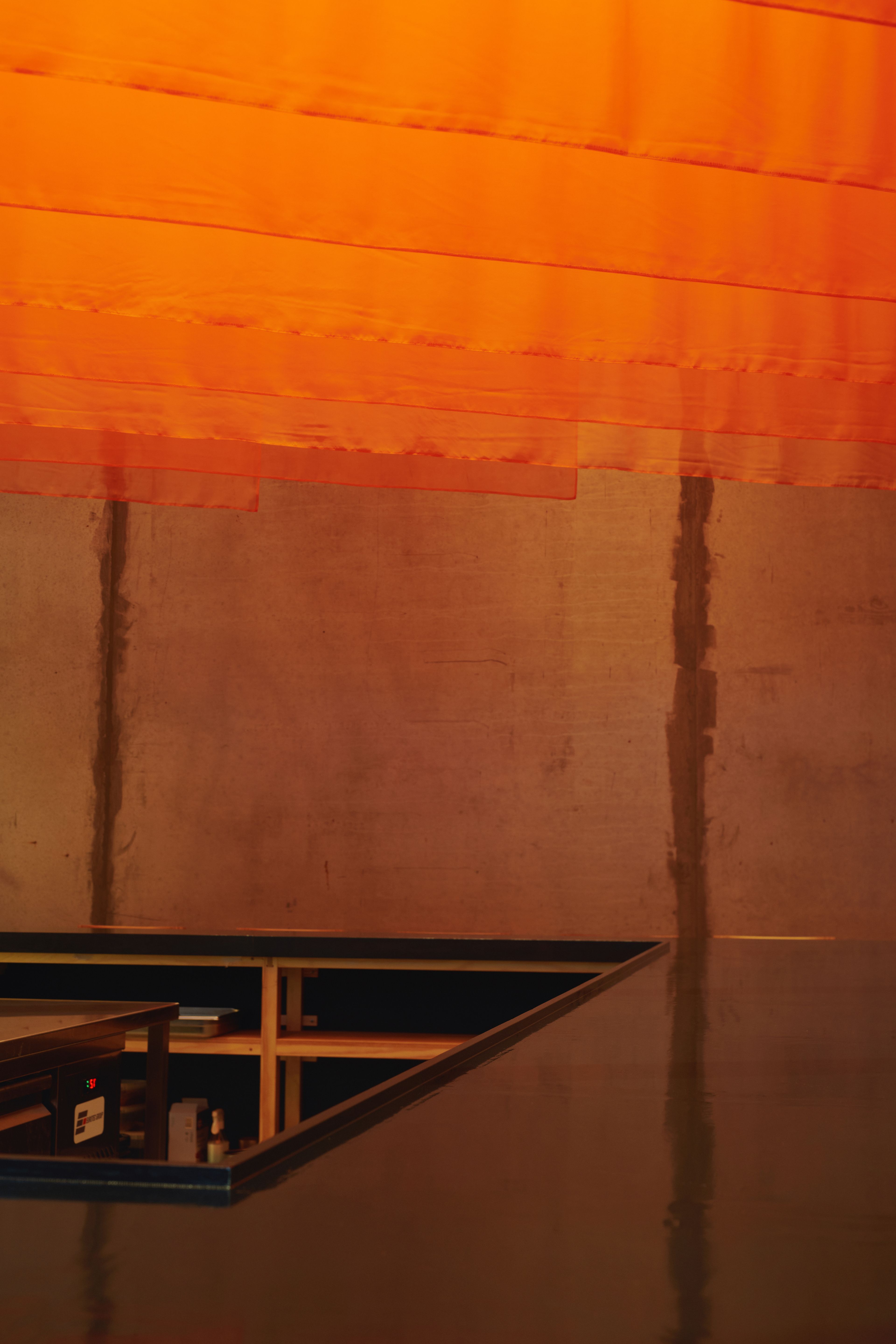 Kōnā’s interior unfolds in two distinct spaces. Guests first step into the intimate Izakaya, where a soft, low textile ceiling creates a relaxed atmosphere. As they descend the stairs, the space expands dramatically, revealing the Omakase Bar with its soaring height. Suspended textiles and carefully designed lighting soften the concrete’s rawness while giving the space a distinct identity. As guests move through, translucent orange textiles shift in appearance, dissolving into an atmospheric cloud of color. This interplay of light and material infuses warmth into the cool concrete, creating a space that feels both stimulating and inviting.