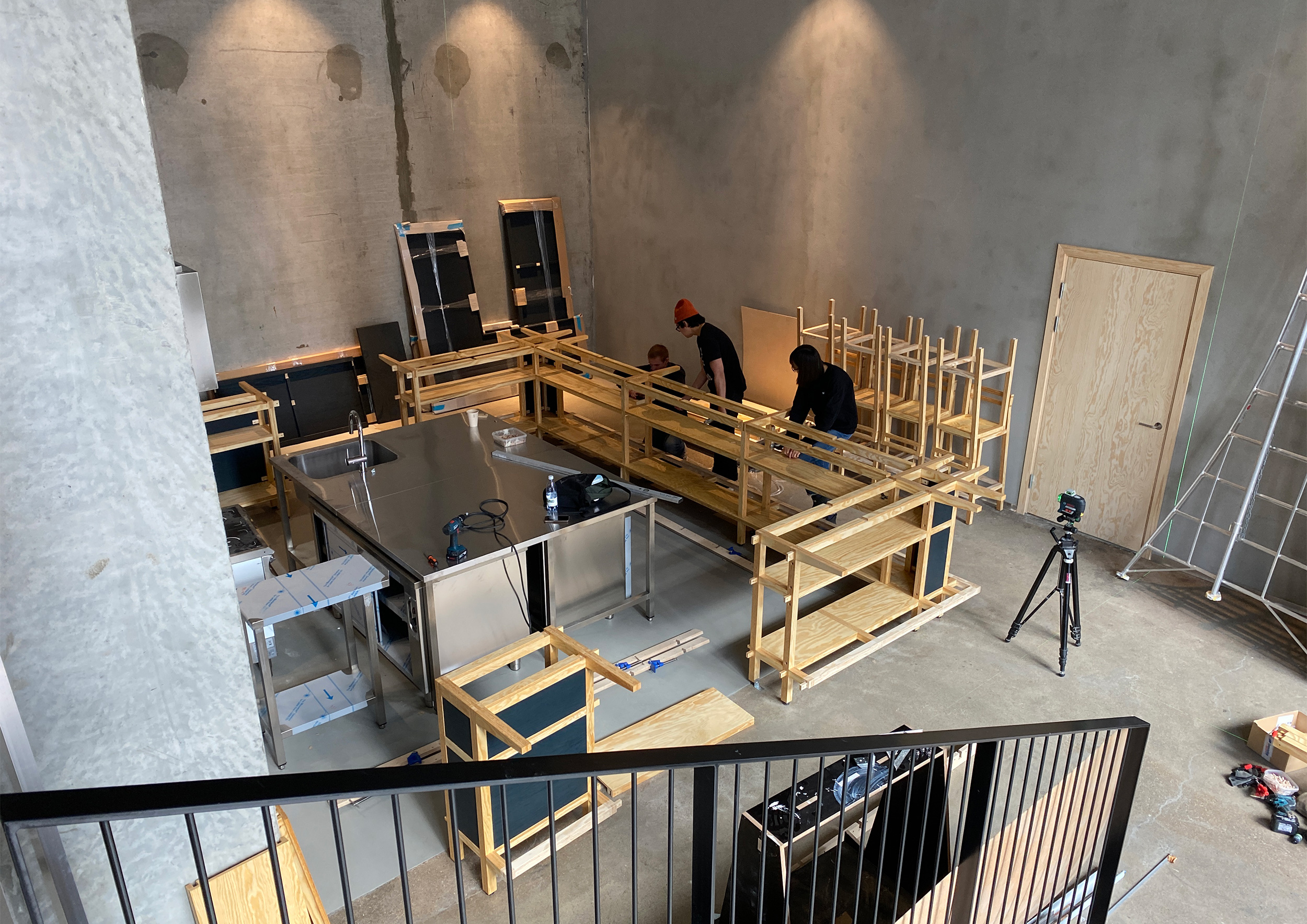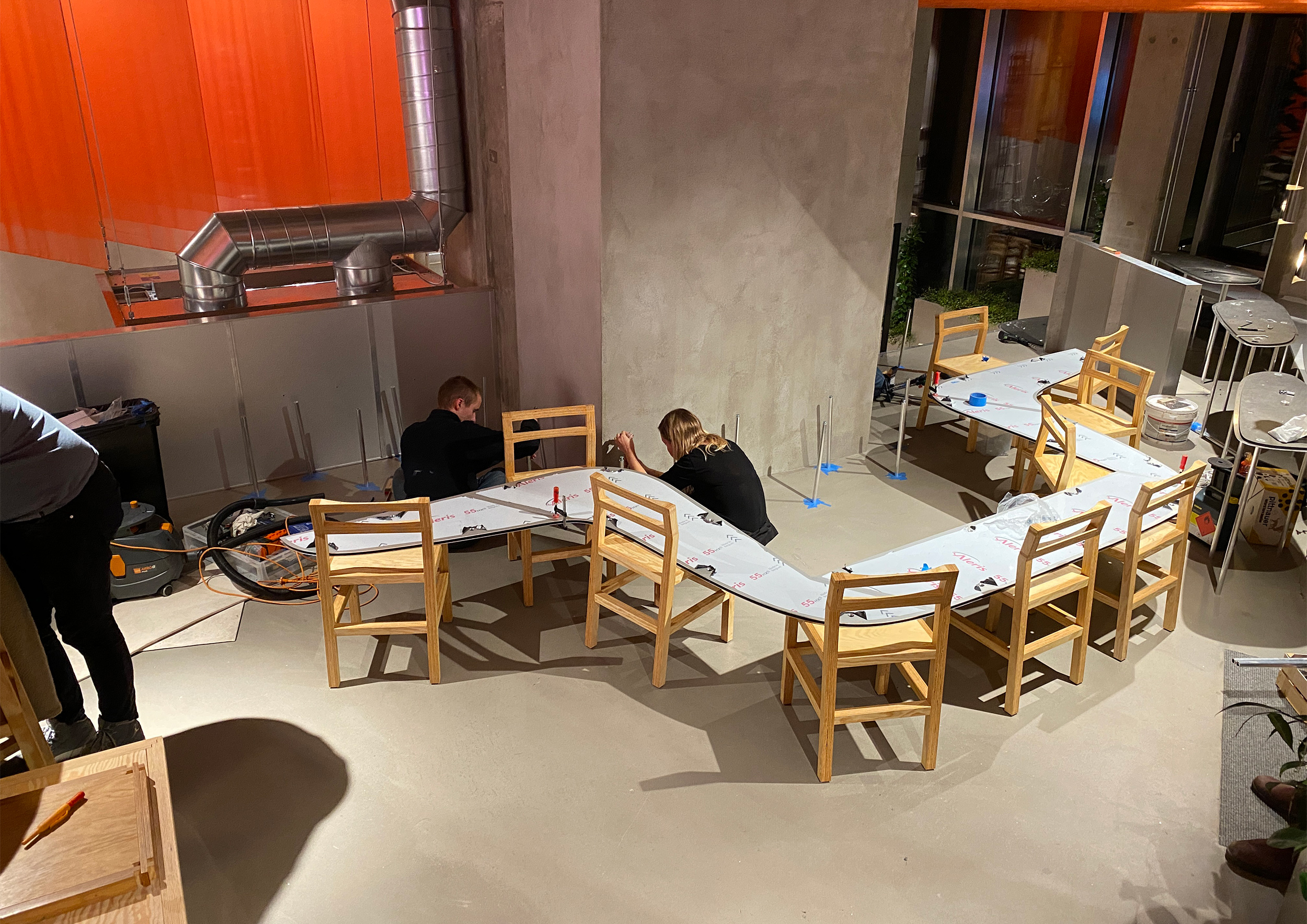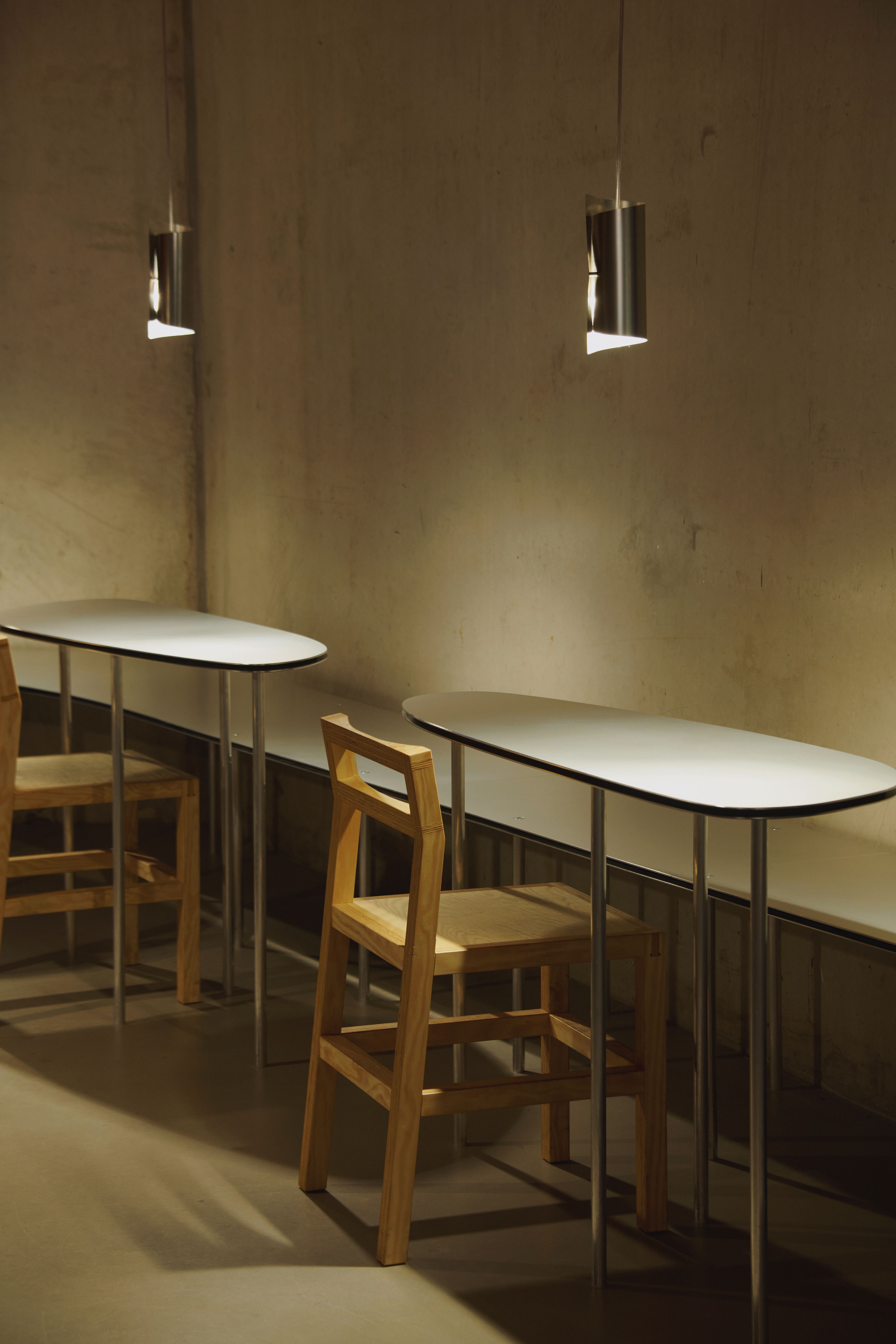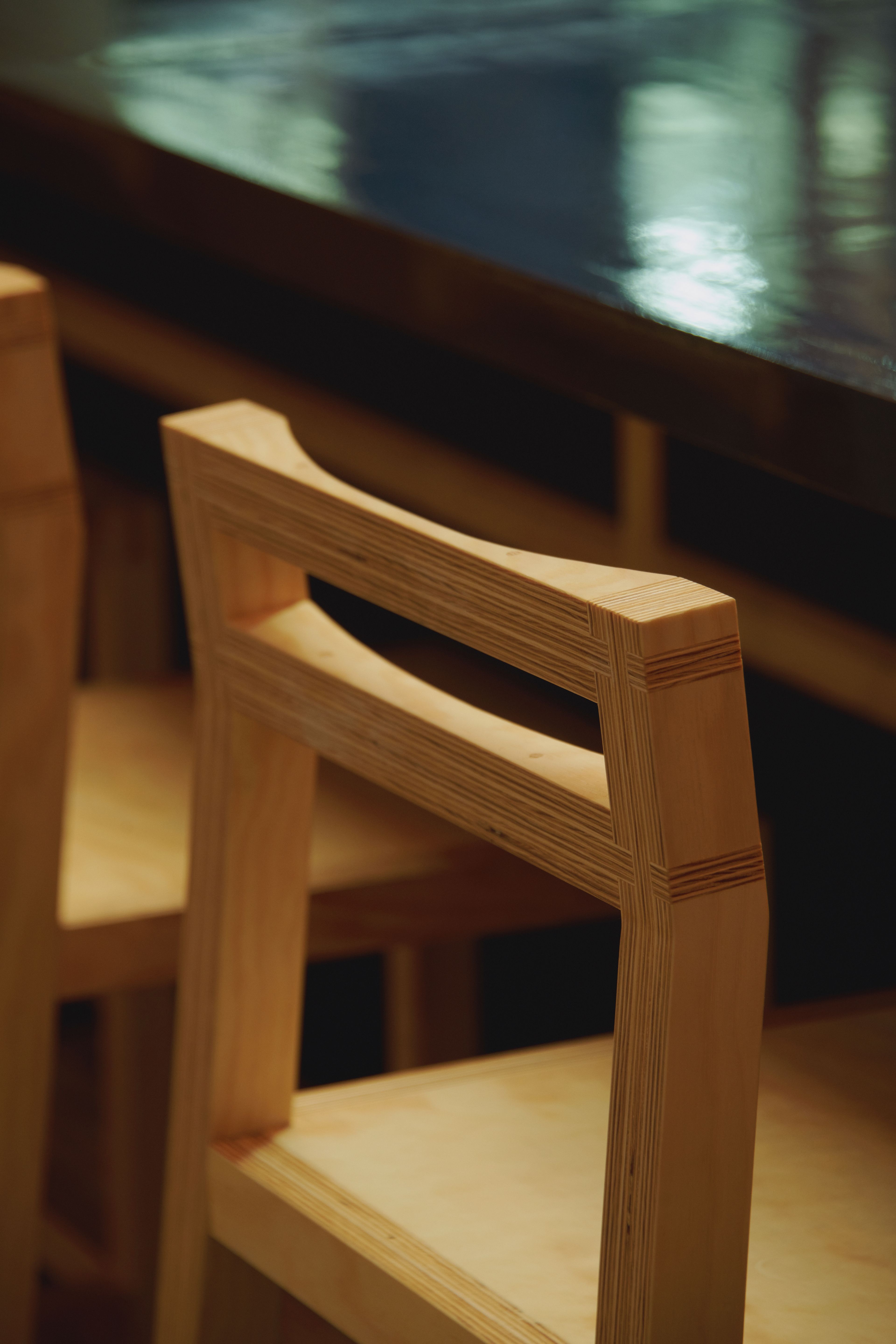 Kōnā’s interior unfolds in two distinct spaces. Guests first step into the intimate Izakaya, where a soft, low textile ceiling creates a relaxed atmosphere. As they descend the stairs, the space expands dramatically, revealing the Omakase Bar with its soaring height. Suspended textiles and carefully designed lighting soften the concrete’s rawness while giving the space a distinct identity. As guests move through, translucent orange textiles shift in appearance, dissolving into an atmospheric cloud of color. This interplay of light and material infuses warmth into the cool concrete, creating a space that feels both stimulating and inviting.