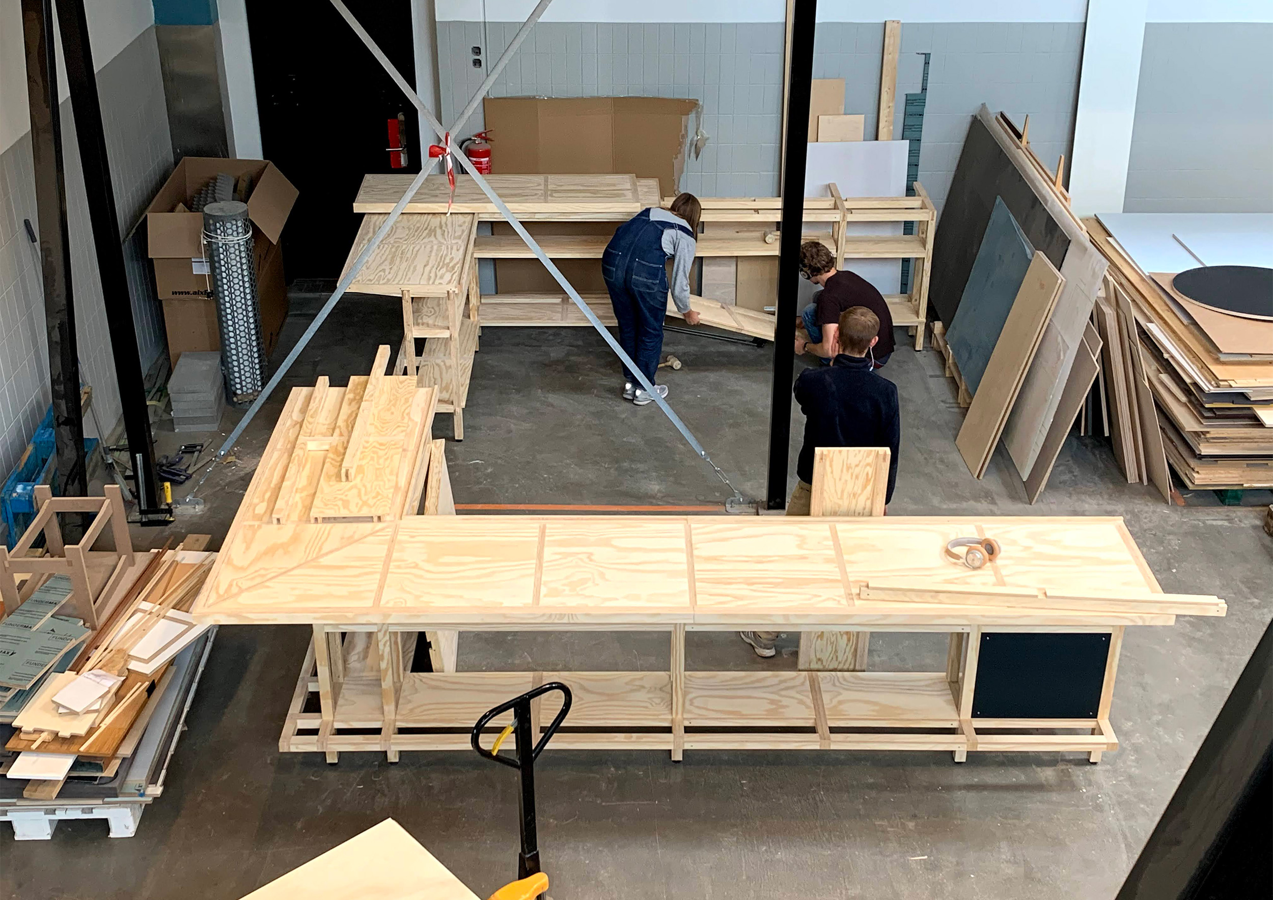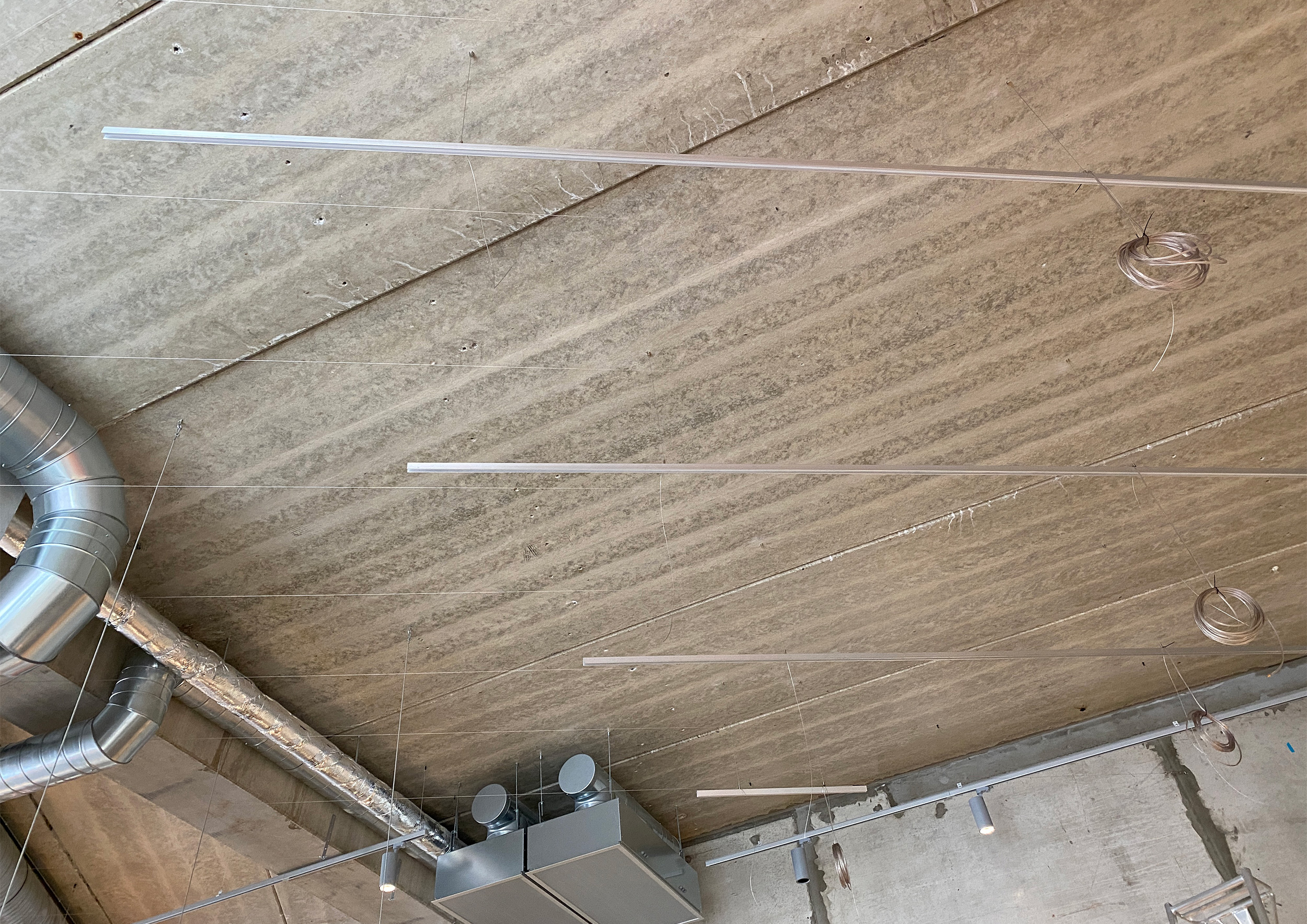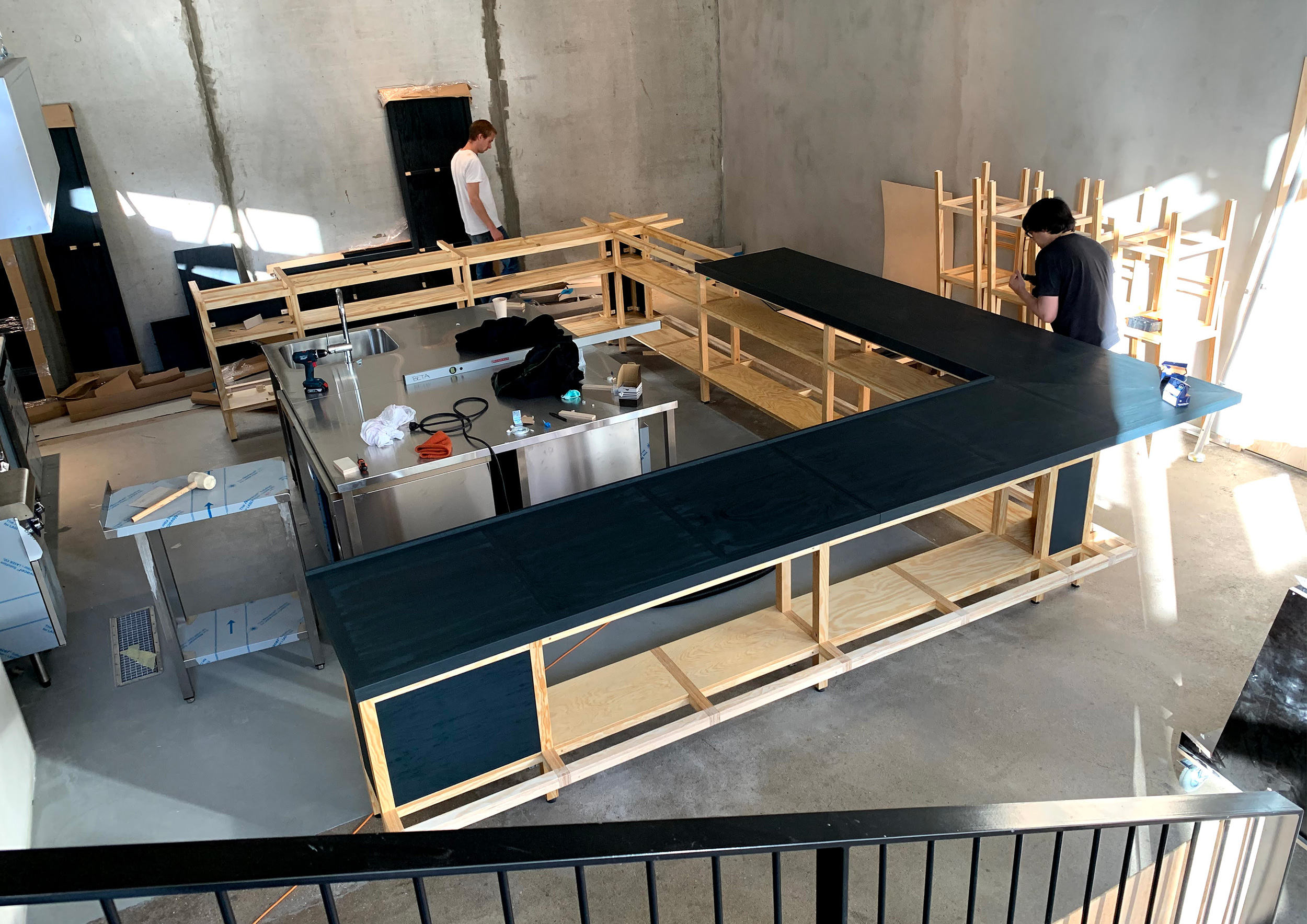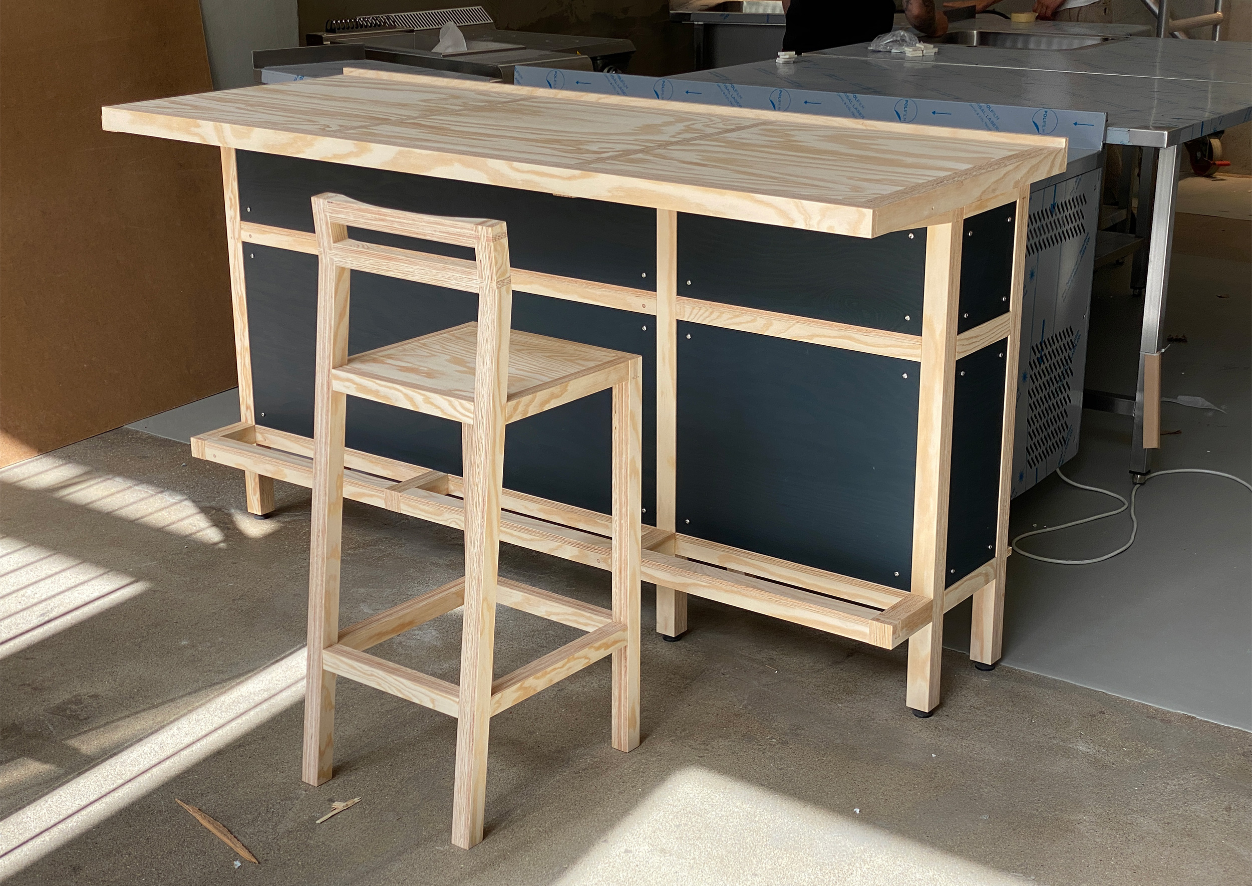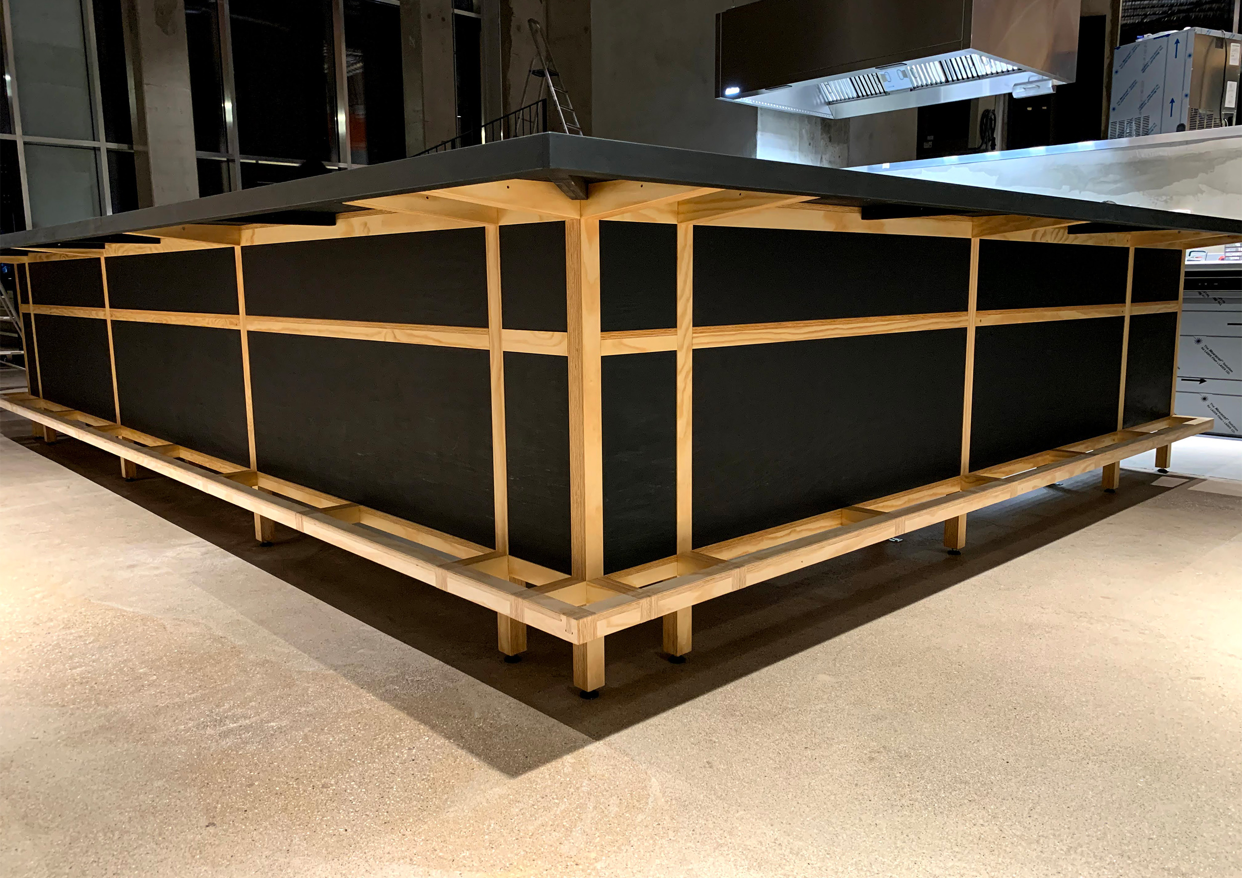 Kōnā’s interior unfolds in two distinct spaces. Guests first step into the intimate Izakaya, where a soft, low textile ceiling creates a relaxed atmosphere. As they descend the stairs, the space expands dramatically, revealing the Omakase Bar with its soaring height. Suspended textiles and carefully designed lighting soften the concrete’s rawness while giving the space a distinct identity. As guests move through, translucent orange textiles shift in appearance, dissolving into an atmospheric cloud of color. This interplay of light and material infuses warmth into the cool concrete, creating a space that feels both stimulating and inviting.