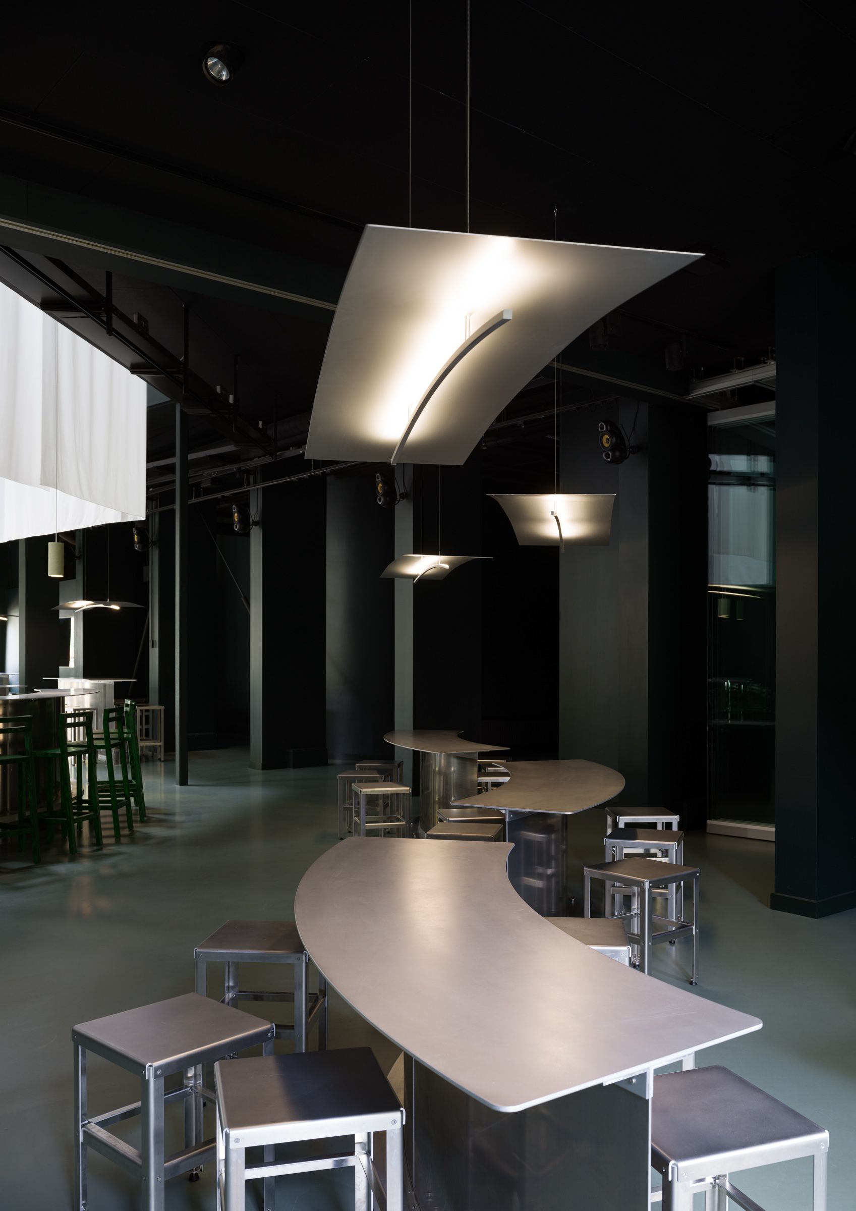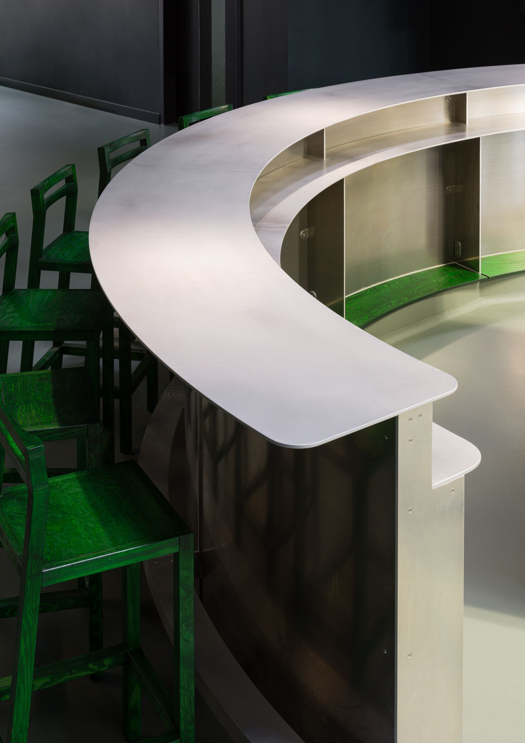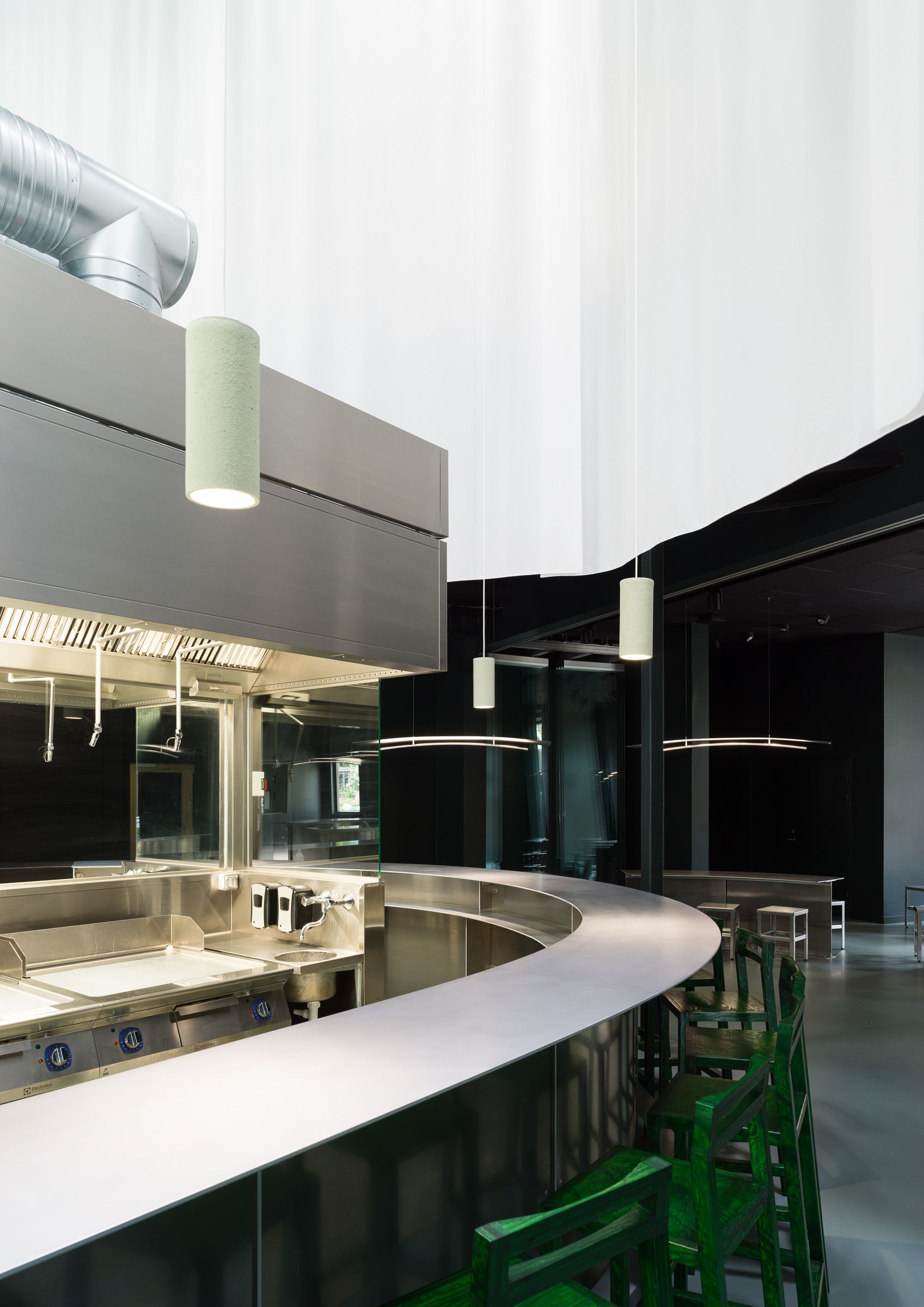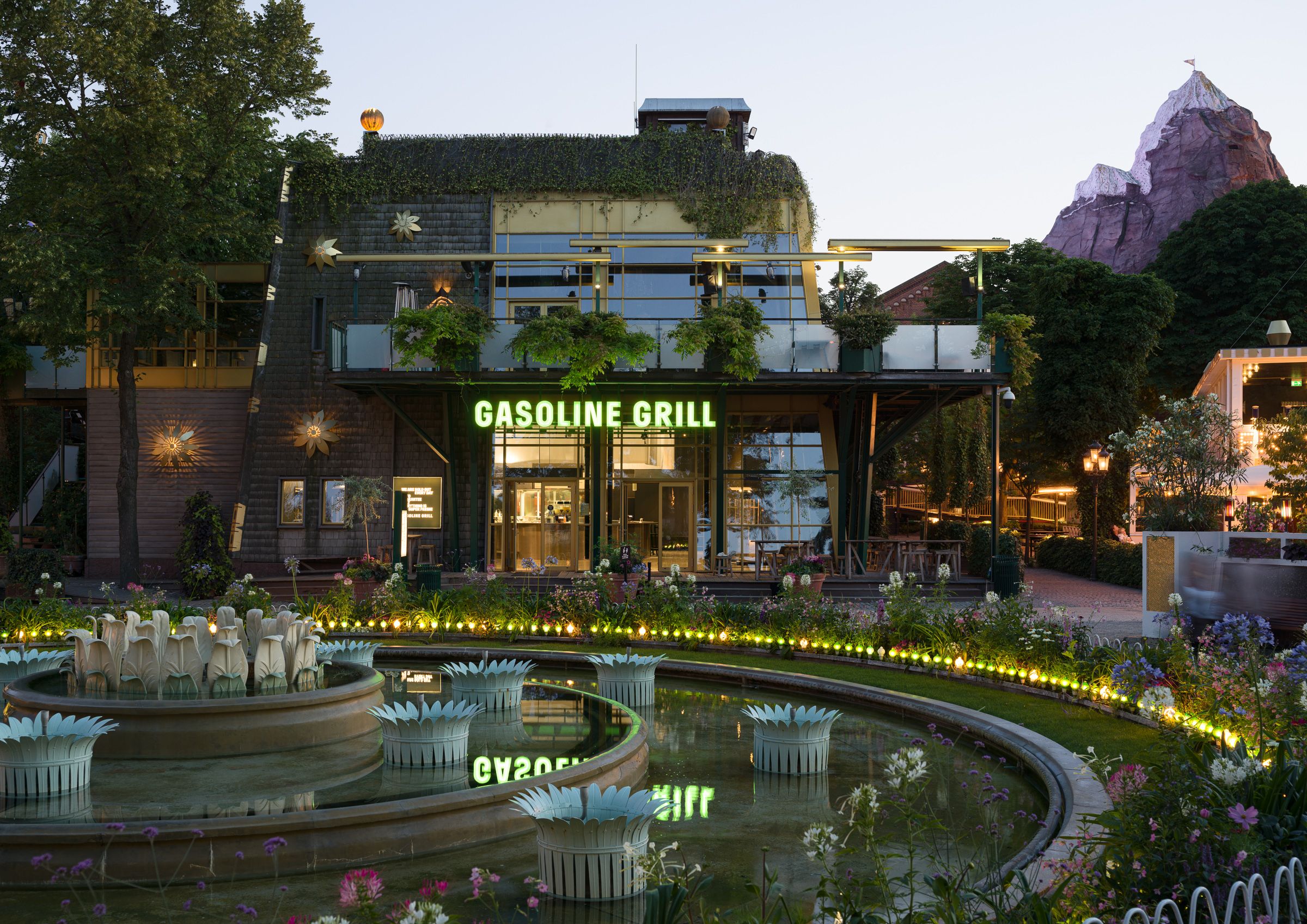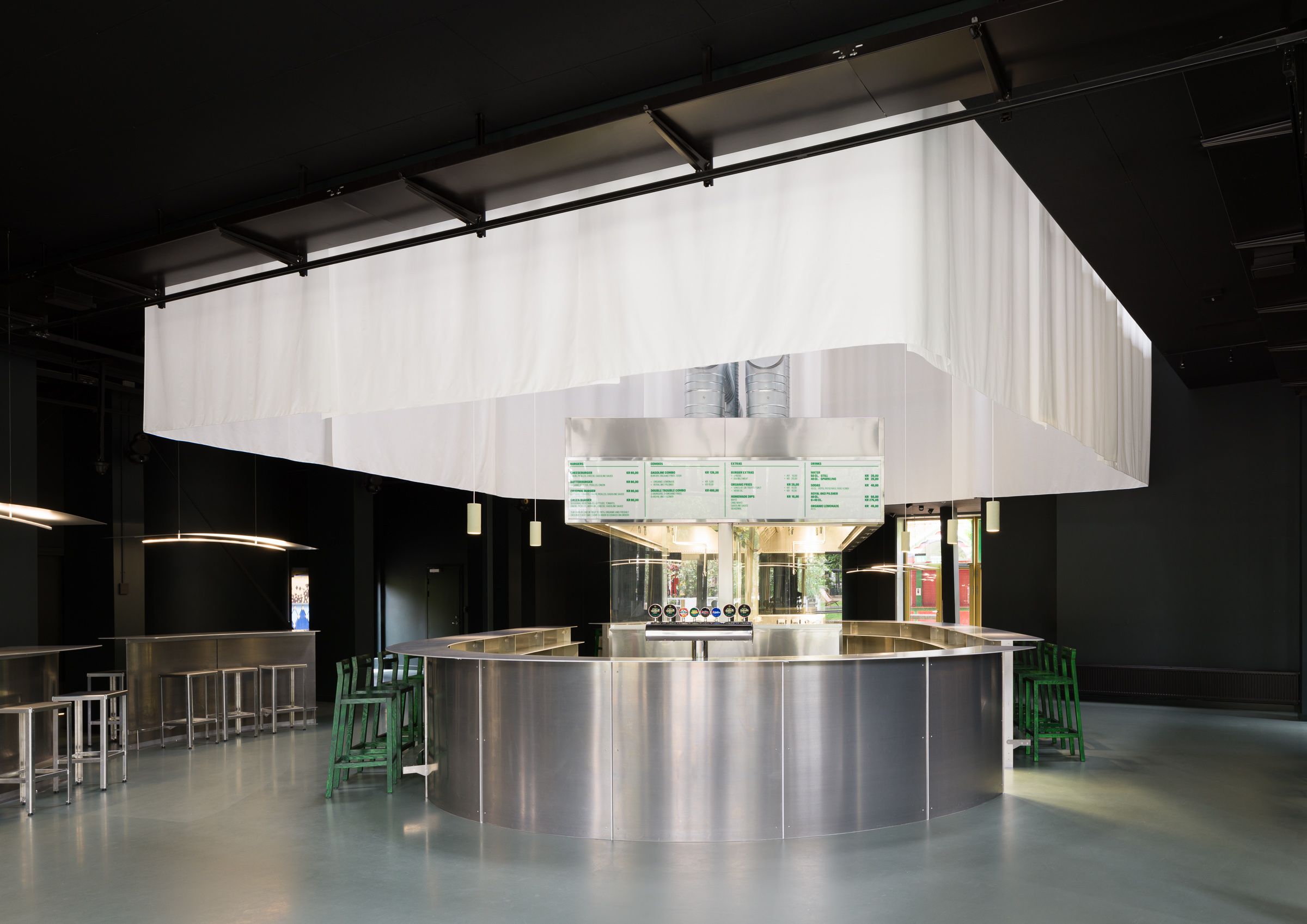 Located in the historic Tivoli Gardens, the space carried traces of its past - from café to Viking attraction. For this transformation, we sought to quiet the surroundings and center the experience around the grill. With deep green-black walls and ceiling, and a 10-meter-long white curtain as a soft focal point, the result is a calm, almost chapel-like atmosphere for this new attraction in Tivoli. When thinking about burger culture, the classic drive-in diners of the Western USA come to mind. These diners grew alongside the booming automotive industry and expanding infrastructure. In some Gasoline Grill locations, the use of metal, curves, and bold lighting reflects this era’s streamlined, industrial aesthetic, paying homage to its practicality and charm. At the same time, the California Light and Space movement emerged. These artists, deeply influenced by the rise of American industry—especially automobiles—focused on creating experiences rather than objects. By playing with light, space, and color, they sought to shift perception and invite people to see the world in new ways.