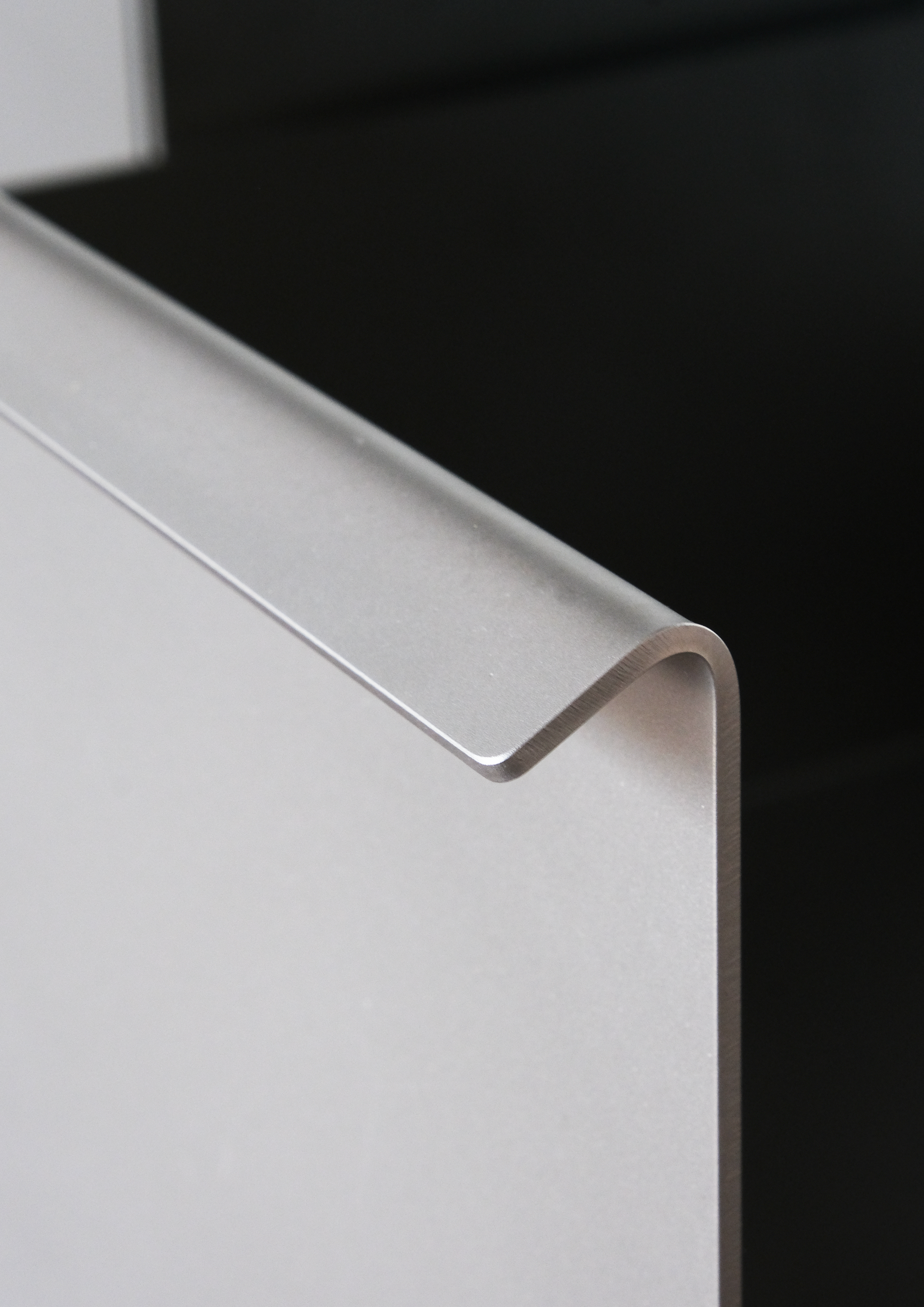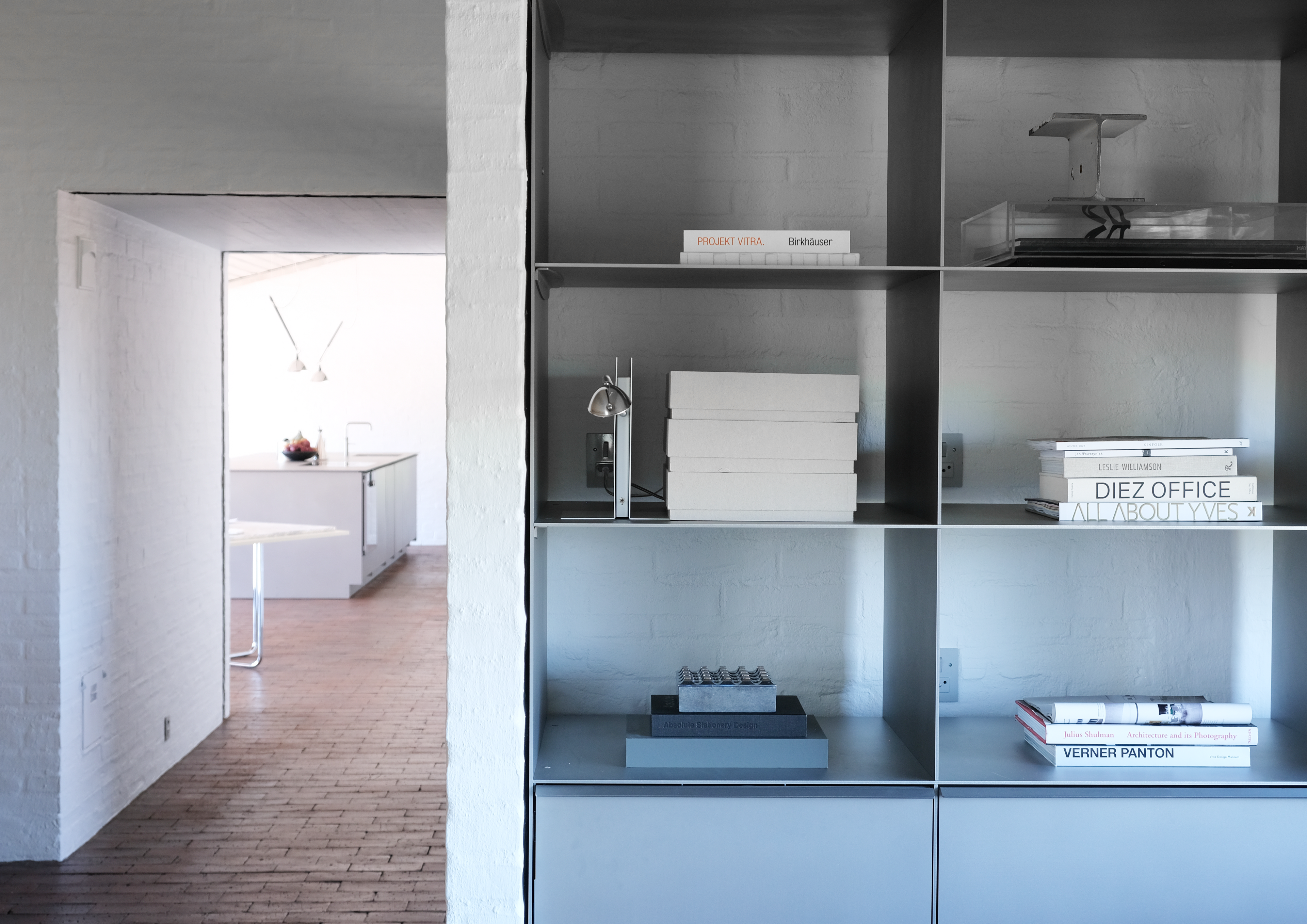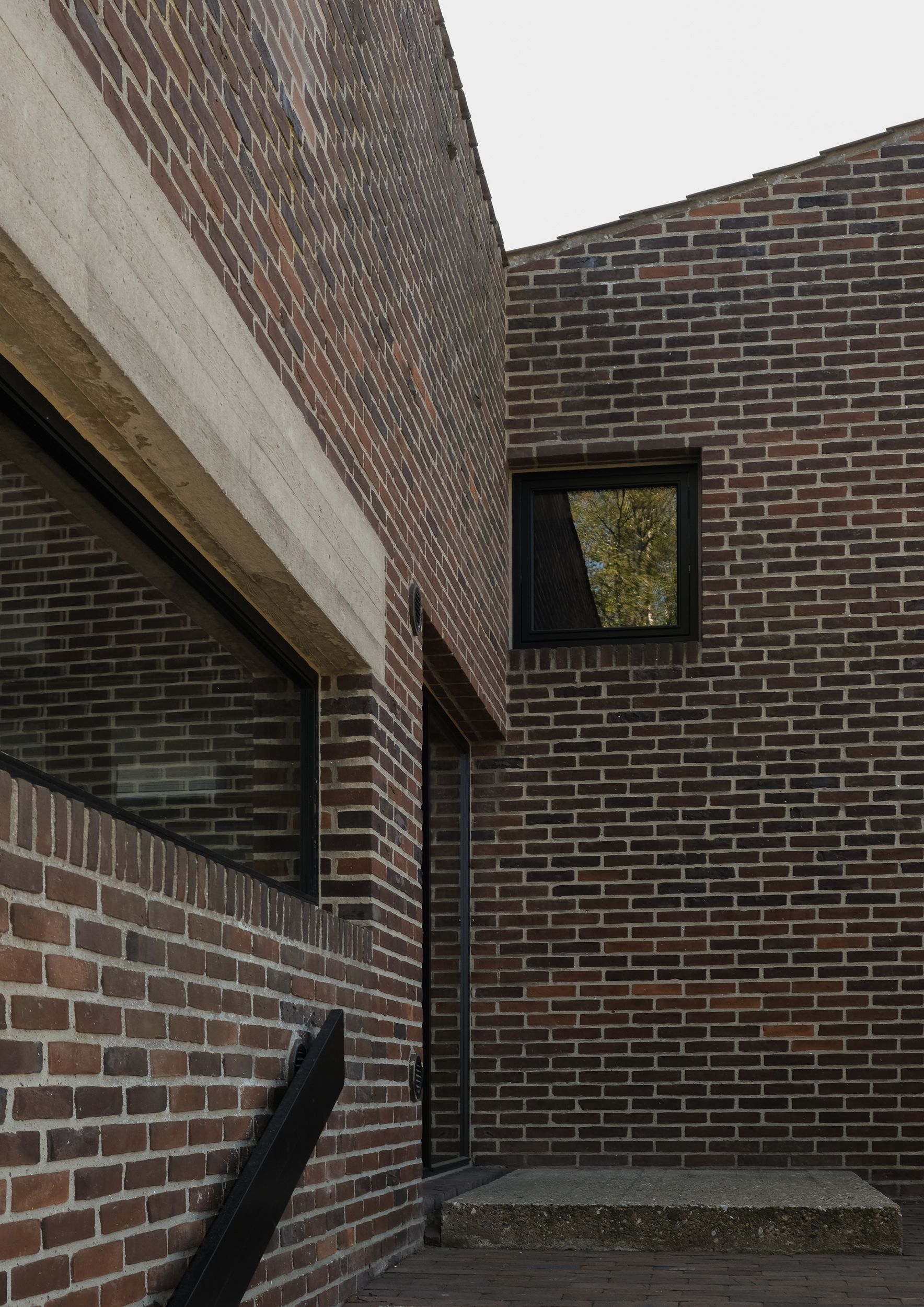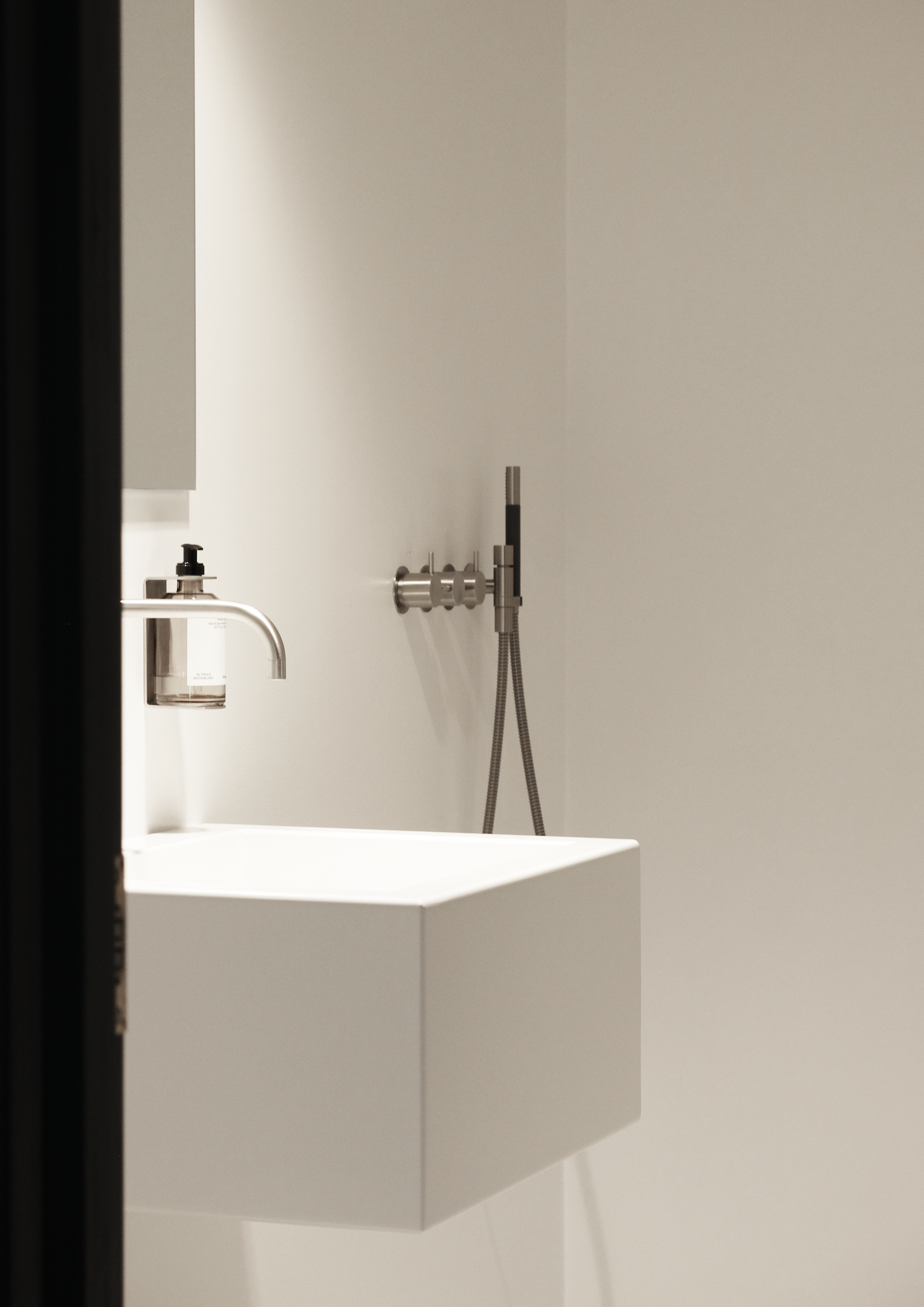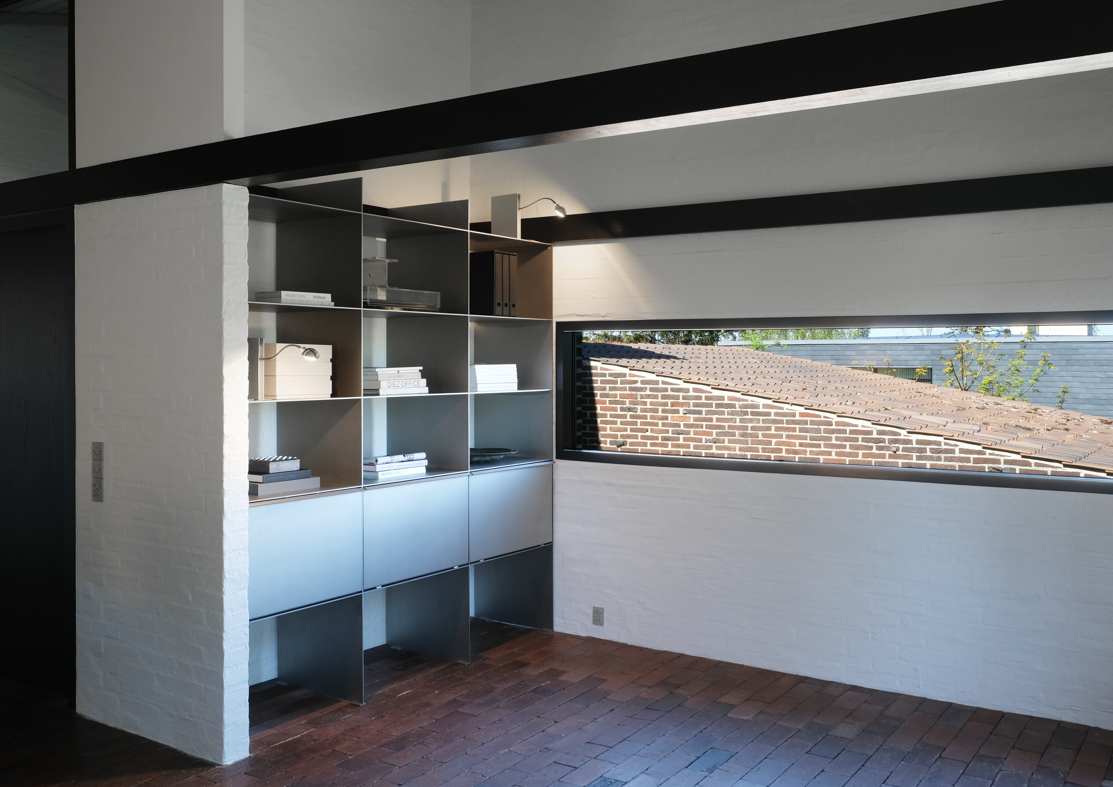 Archival Studies was commissioned to design a series of inventory for a newly refurbished 1970s Friis & Moltke family home in Aarhus, Denmark. The project included the design, production, and installation of a kitchen island, walk-in closet, study shelving, and bathroom elements. Materials were carefully selected to highlight the rich materiality of this Danish modernist architectural gem. The Shelf 02 echoes key architectural features of the original home. Its glass-blasted surface creates a subtle dialogue with the textured brick walls, establishing visual and material cohesion. The same finish was applied to the four-meter-long Kitchen Island 07, which functions as the home's sculptural centerpiece. Kitchen 07 is based on Archival Studies’ modular system of laser-cut, bent, and bolted stainless steel. With all functions integrated into its body, it supports an intuitive, social approach to cooking, while connecting visually and tactically to the surrounding architecture. Inspired by the home's original black-painted wood details, two Wardrobe 04 units were installed opposite each other to form a spacious walk-in closet. Built from Archival’s plywood furniture system, each unit includes sliding doors, integrated lighting, clothing rails, drawers, and shelving. Together, they act as both storage and spatial dividers — a contemporary interpretation of the home's intrinsic features. Lastly, a pair of custom steel washbasins was designed and installed in the bathrooms. Made from laser-cut and welded steel sheets with a soft white powder-coated finish, their minimalist form contrast the textured brickwalls - revealing what was and what was added.