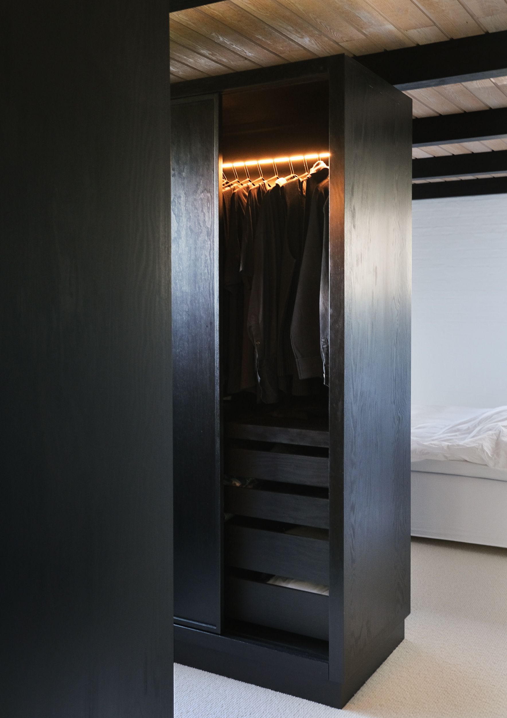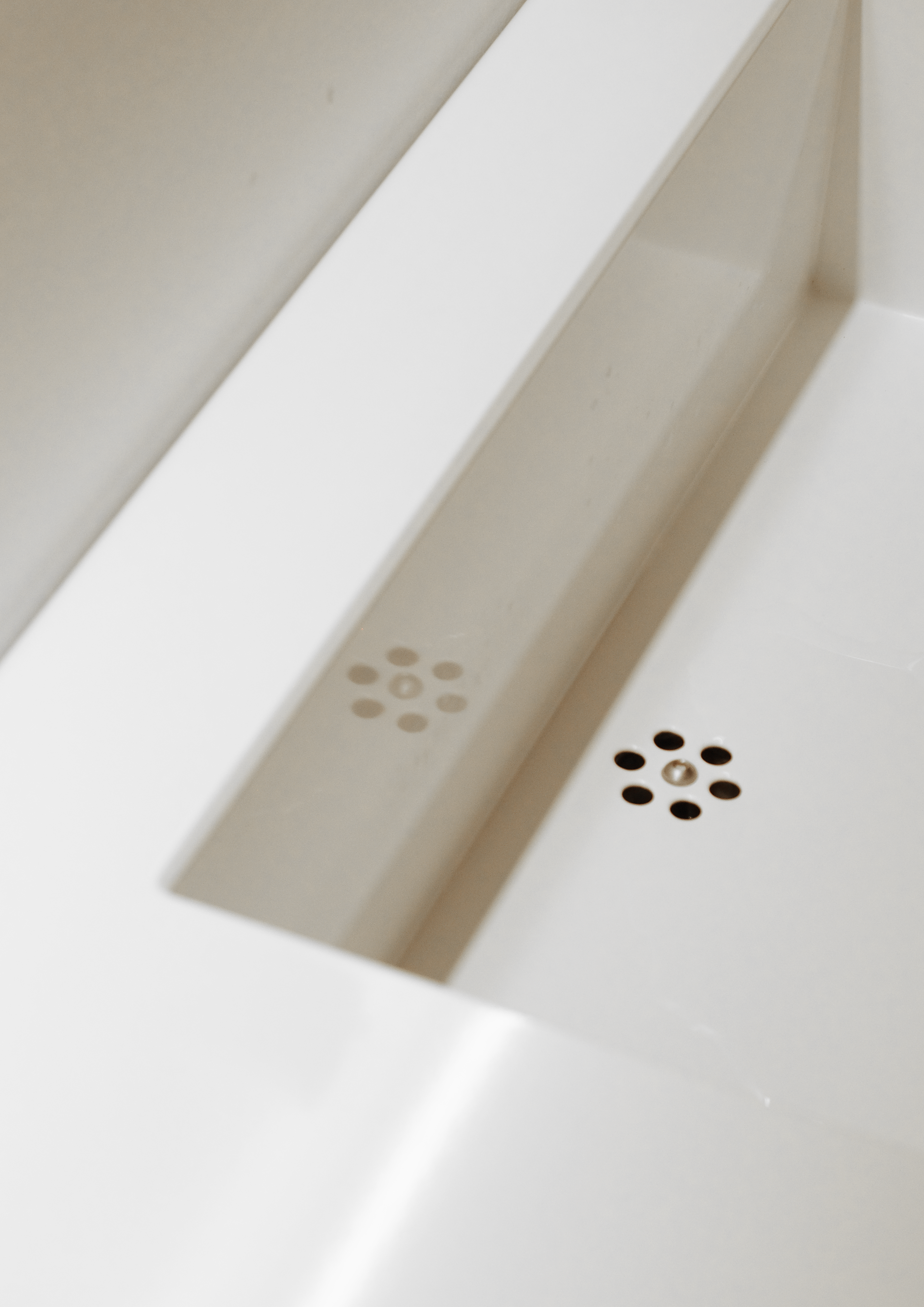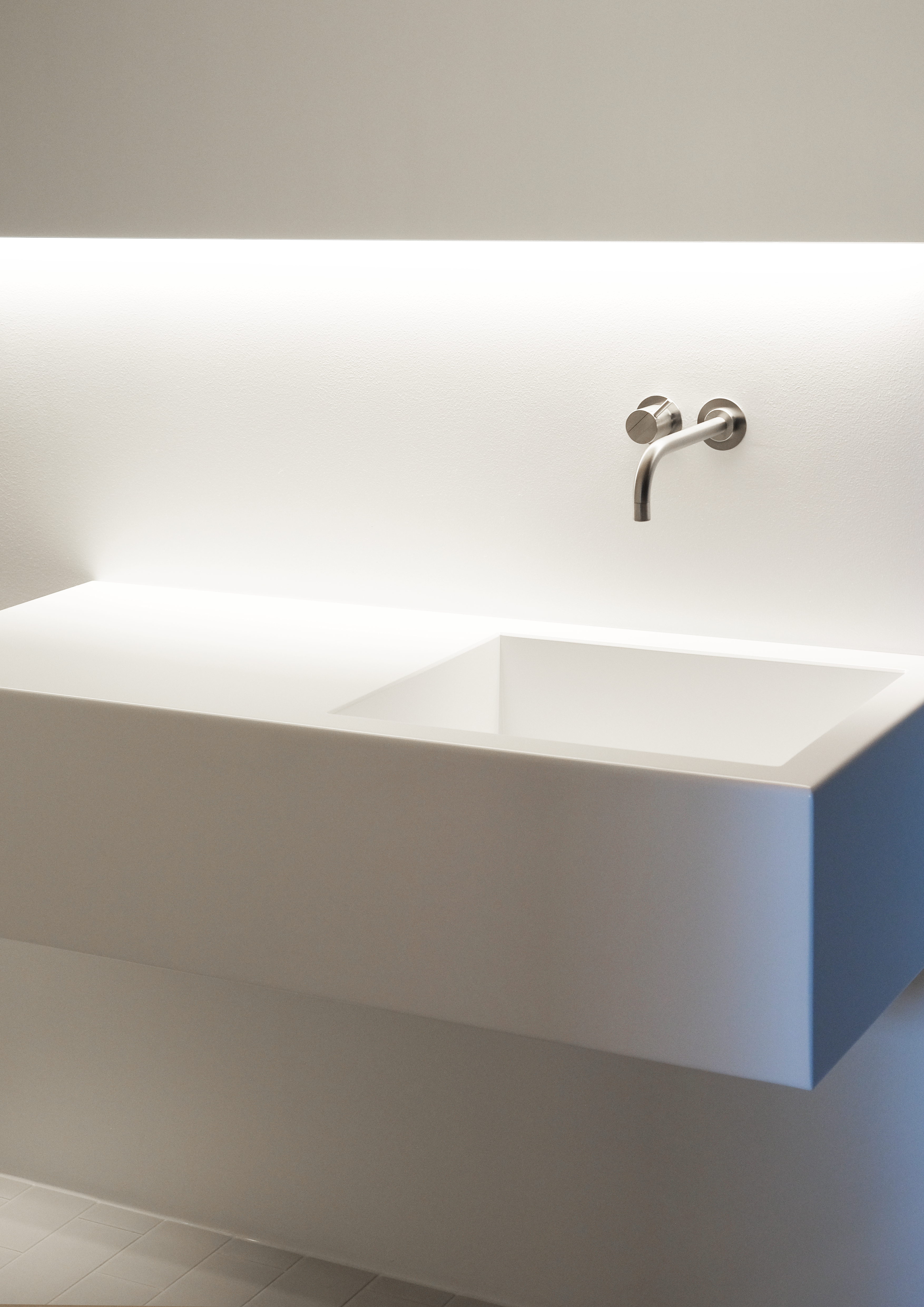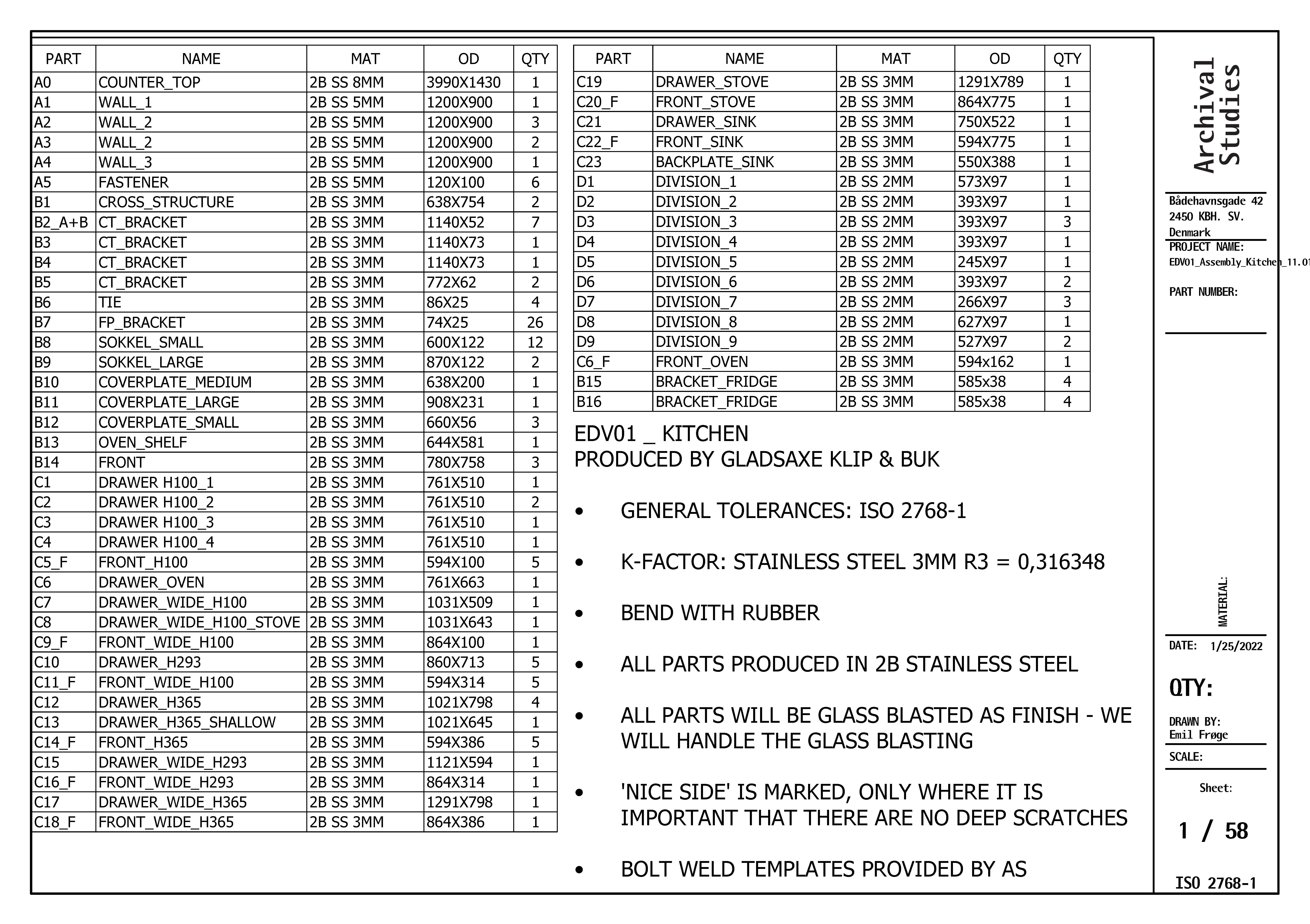 Archival Studies was commissioned to design a series of inventory for a newly refurbished 1970s Friis & Moltke family home in Aarhus, Denmark. The project included the design, production, and installation of a kitchen island, walk-in closet, study shelving, and bathroom elements. Materials were carefully selected to highlight the rich materiality of this Danish modernist architectural gem. The Shelf 02 echoes key architectural features of the original home. Its glass-blasted surface creates a subtle dialogue with the textured brick walls, establishing visual and material cohesion. The same finish was applied to the four-meter-long Kitchen Island 07, which functions as the home's sculptural centerpiece. Kitchen 07 is based on Archival Studies’ modular system of laser-cut, bent, and bolted stainless steel. With all functions integrated into its body, it supports an intuitive, social approach to cooking, while connecting visually and tactically to the surrounding architecture. Inspired by the home's original black-painted wood details, two Wardrobe 04 units were installed opposite each other to form a spacious walk-in closet. Built from Archival’s plywood furniture system, each unit includes sliding doors, integrated lighting, clothing rails, drawers, and shelving. Together, they act as both storage and spatial dividers — a contemporary interpretation of the home's intrinsic features. Lastly, a pair of custom steel washbasins was designed and installed in the bathrooms. Made from laser-cut and welded steel sheets with a soft white powder-coated finish, their minimalist form contrast the textured brickwalls - revealing what was and what was added.