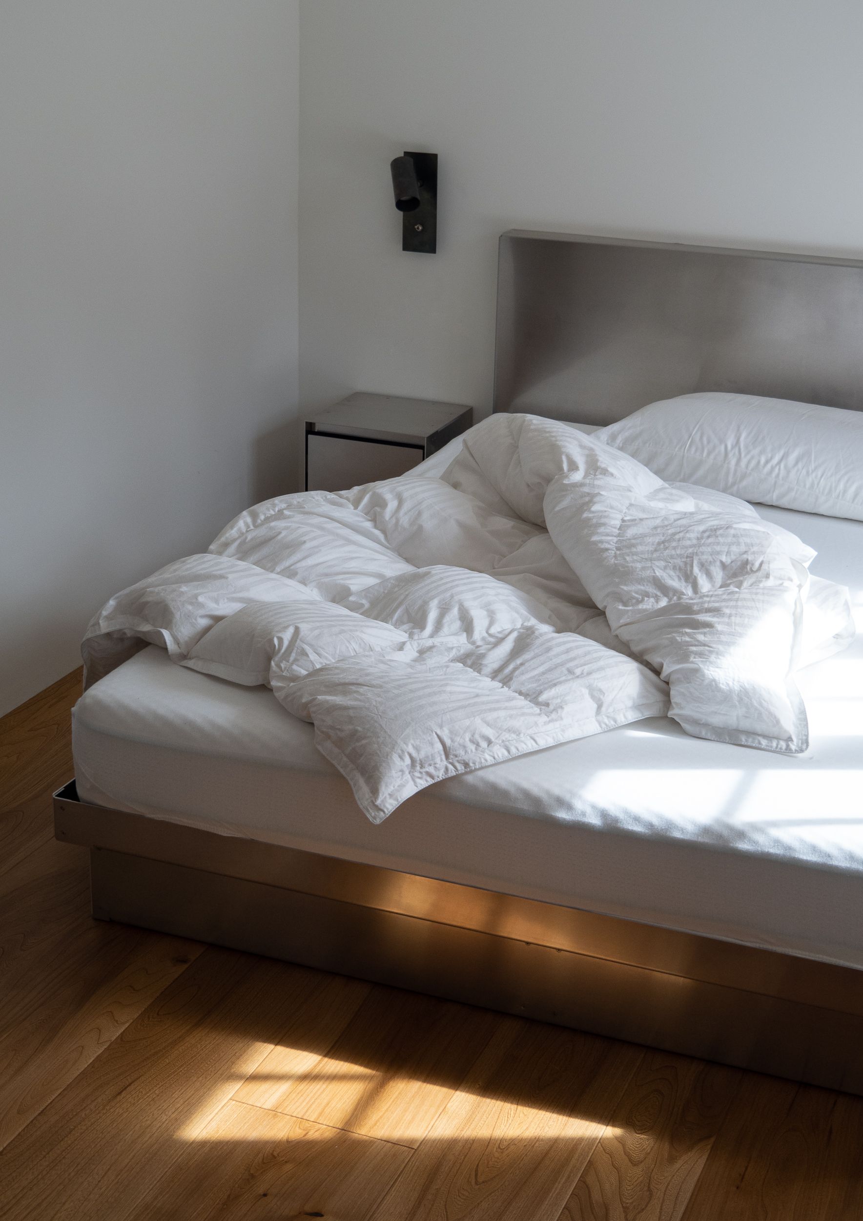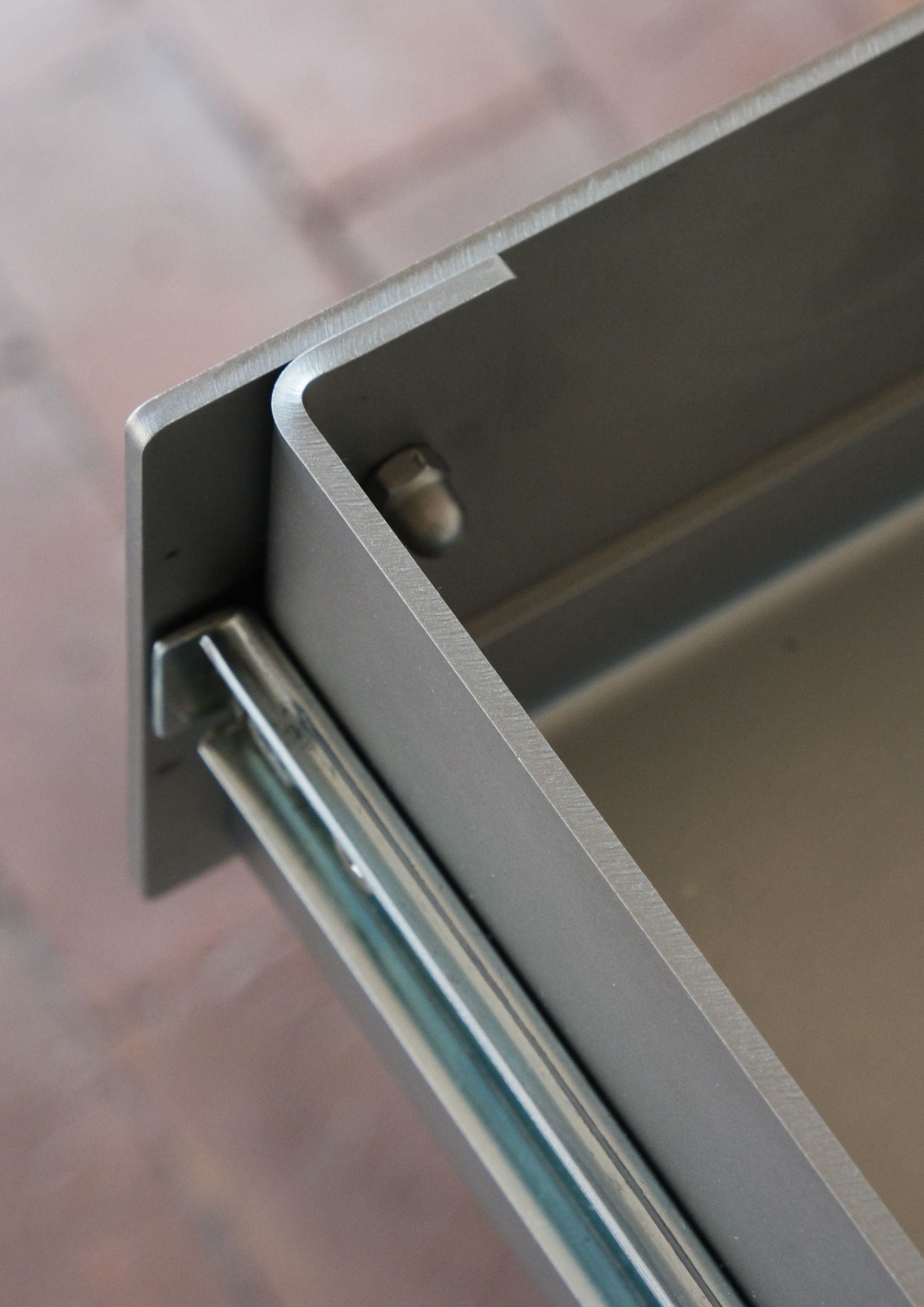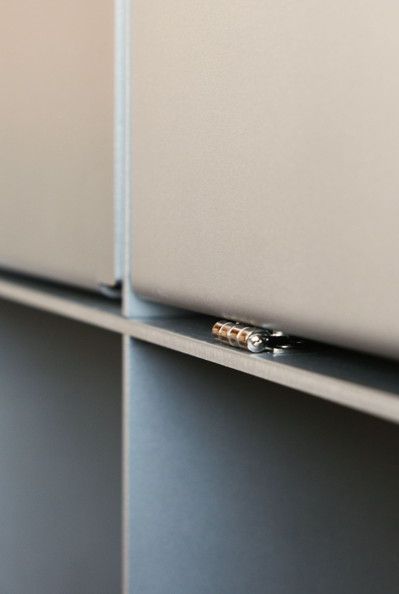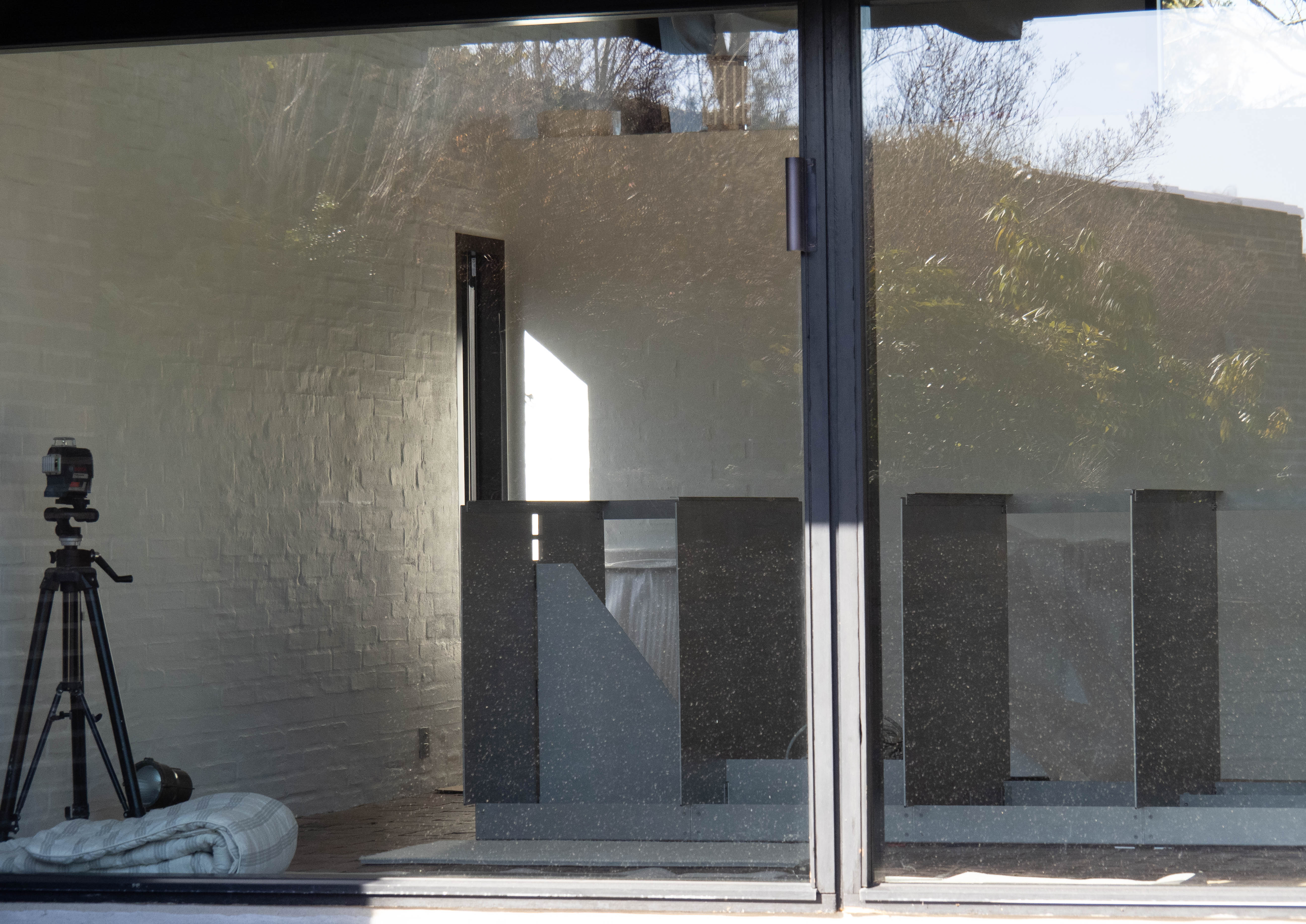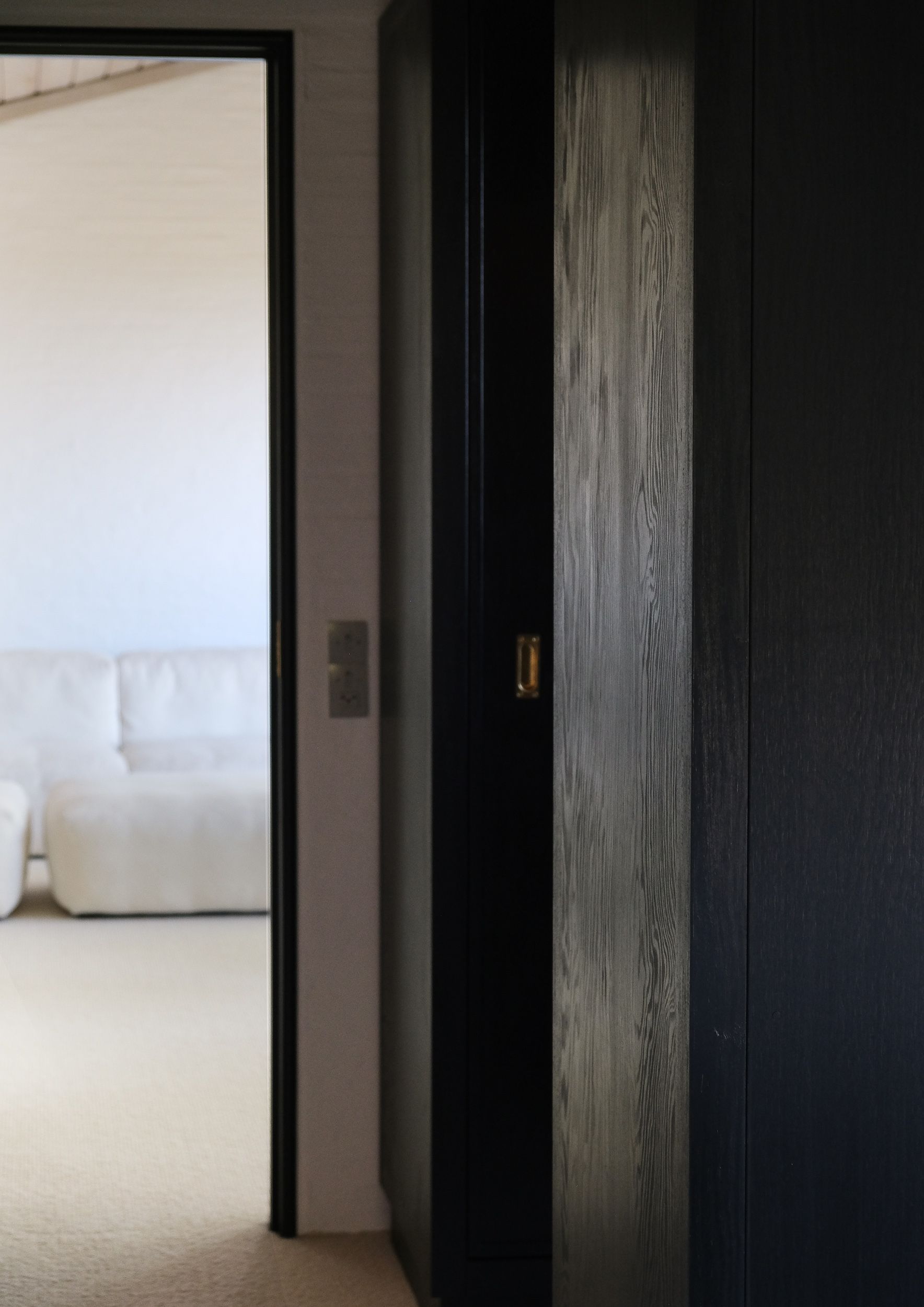 Archival Studies was commissioned to design a series of inventory for a newly refurbished 1970s Friis & Moltke family home in Aarhus, Denmark. The project included the design, production, and installation of a kitchen island, walk-in closet, study shelving, and bathroom elements. Materials were carefully selected to highlight the rich materiality of this Danish modernist architectural gem. The Shelf 02 echoes key architectural features of the original home. Its glass-blasted surface creates a subtle dialogue with the textured brick walls, establishing visual and material cohesion. The same finish was applied to the four-meter-long Kitchen Island 07, which functions as the home's sculptural centerpiece. Kitchen 07 is based on Archival Studies’ modular system of laser-cut, bent, and bolted stainless steel. With all functions integrated into its body, it supports an intuitive, social approach to cooking, while connecting visually and tactically to the surrounding architecture. Inspired by the home's original black-painted wood details, two Wardrobe 04 units were installed opposite each other to form a spacious walk-in closet. Built from Archival’s plywood furniture system, each unit includes sliding doors, integrated lighting, clothing rails, drawers, and shelving. Together, they act as both storage and spatial dividers — a contemporary interpretation of the home's intrinsic features. Lastly, a pair of custom steel washbasins was designed and installed in the bathrooms. Made from laser-cut and welded steel sheets with a soft white powder-coated finish, their minimalist form contrast the textured brickwalls - revealing what was and what was added.