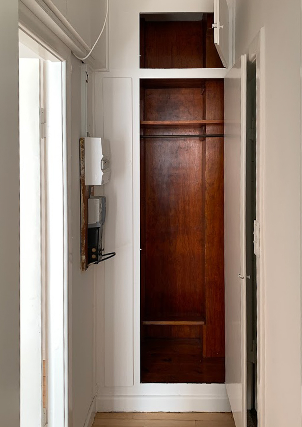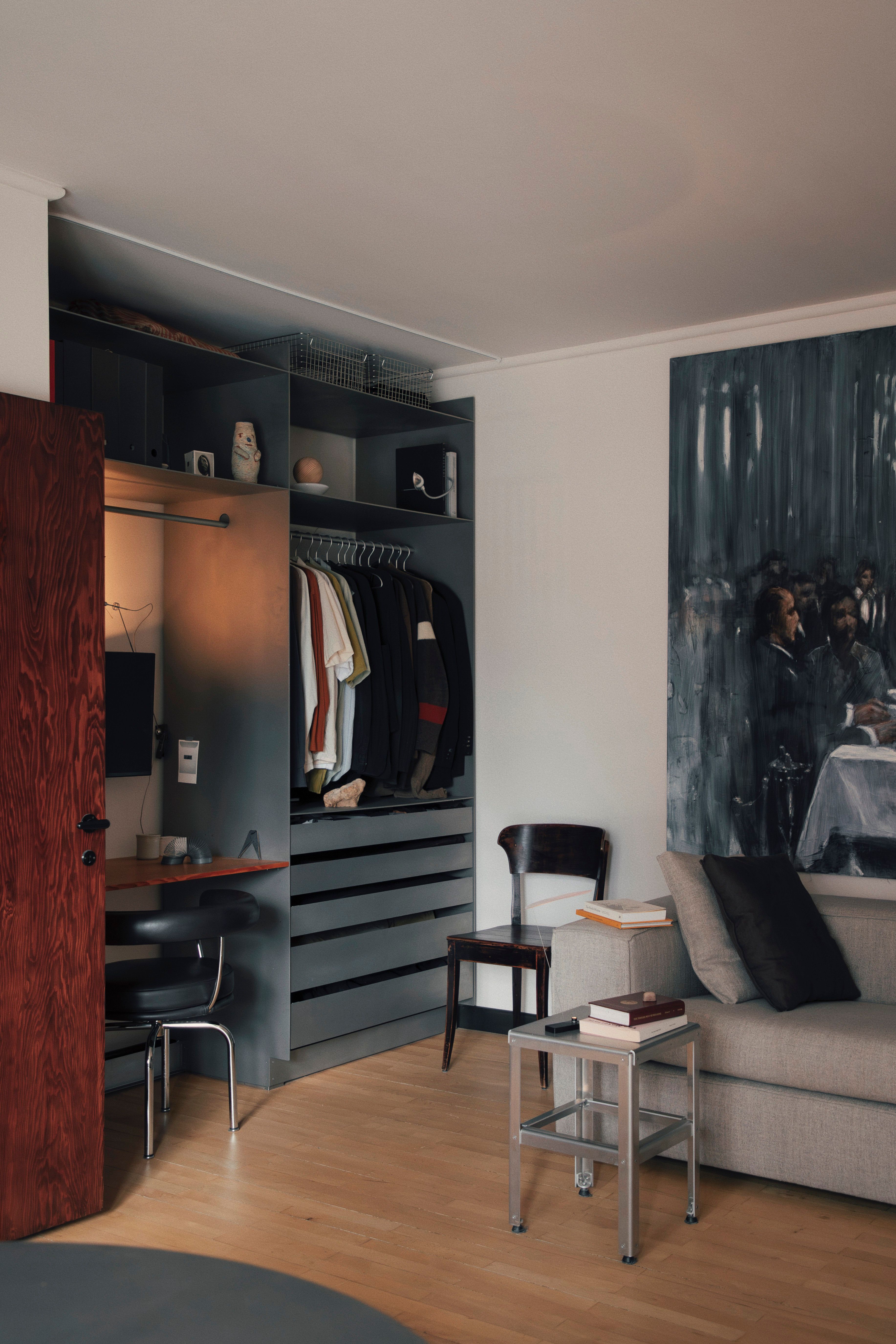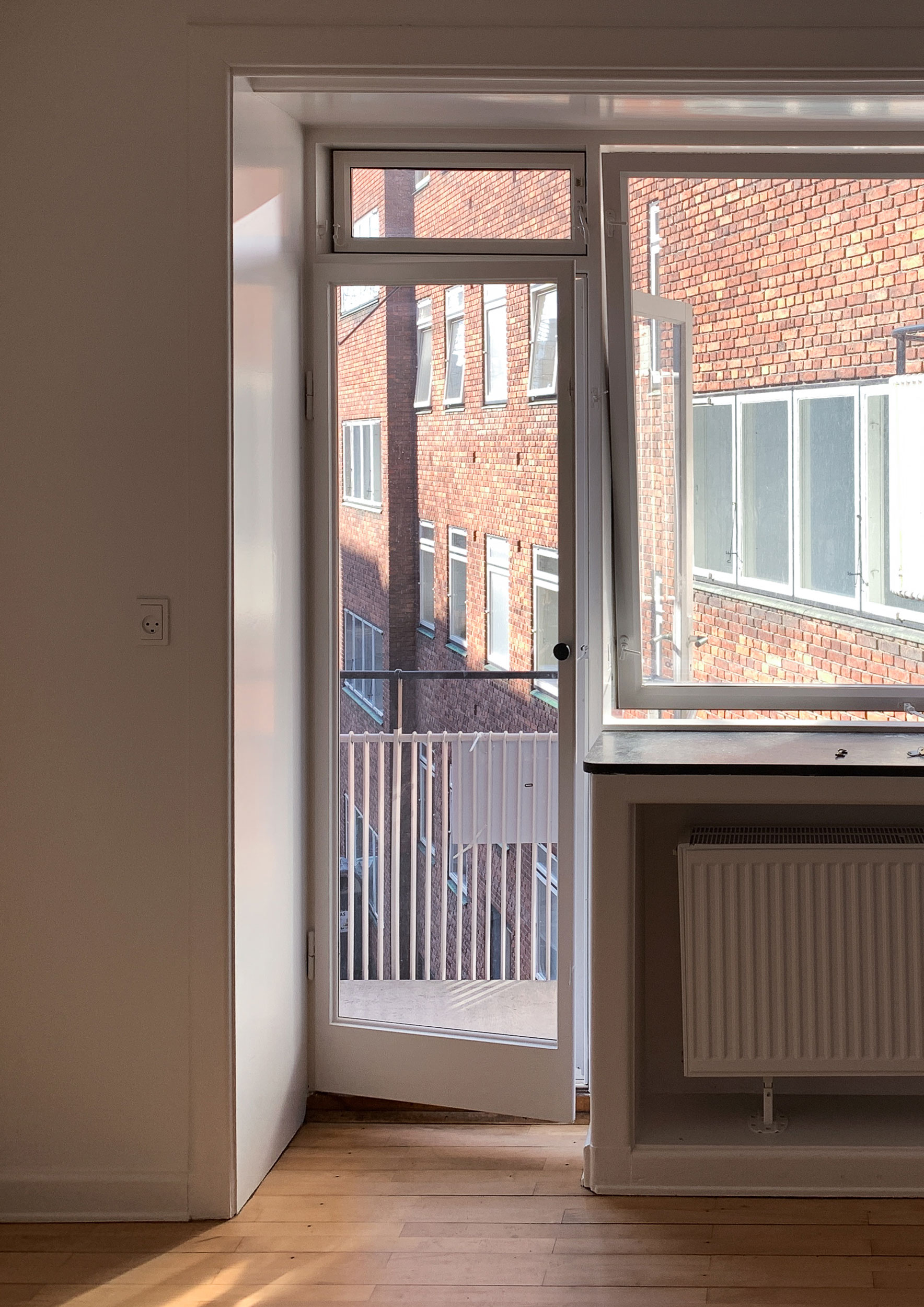 Archival Design in Practice Restoration and additions rooted in original detail and historical integrity. Located in the historically listed Vestersøhus, a building from the 1930s designed by renowned Danish architect Kay Fisker, this 36 m² private apartment in Copenhagen has undergone a detailed restoration and carefull series of additions. Our approach was rooted in a deep respect for the original design and detailing. All work was carried out with approval from SLKS (Agency for Culture and Palaces). Restoration Process The project began with a comprehensive study of the original interiors by Kay Fisker. We undertook a full restoration and reproduction of all wooden elements, including doors, trim, built-in storage units, and the kitchen. Key elements of the restoration included: Uncovering and preserving original materials. The back of the apartment’s rear door revealed a beautiful lacquered veneer, which we carefully restored in collaboration with a preservation painter. Extending original detailing throughout the space. A brown-black foot trim discovered on the entrance cabinet was carried through the apartment to re-establish the original visual language. Recovering the original color palette. A deep cobalt blue was found in earlier layers of wall paint. This color was reintroduced in the bathroom above the tiling and also reflected in the textiles. Reconstructing the kitchen. Due to water damage, the original kitchen was no longer intact. We reproduced it closely, integrating modern appliances while preserving the original design logic. Additions and Material Continuity All new additions were designed in line with the building’s functionalist character, using materials that echoed the originals. Inspired by existing metal details such as the front door handle and steel countertop, we incorporated similar materials in new elements. To make the most of the compact floor area, every addition was conceived with dual functions and built-in character, following the integrated approach seen throughout the original interiors. Archival Research and Documentation All blueprints were located in the comprehensive Building Preservation Manual by Wamings Tegnestue, a beautifully detailed resource. We have added our own documentation and links to this archive. We welcome opportunities to share our knowledge of surface restoration, hardware reproduction, and the design of integrated architectural elements. Design collaboration with architect Georgina Prittie