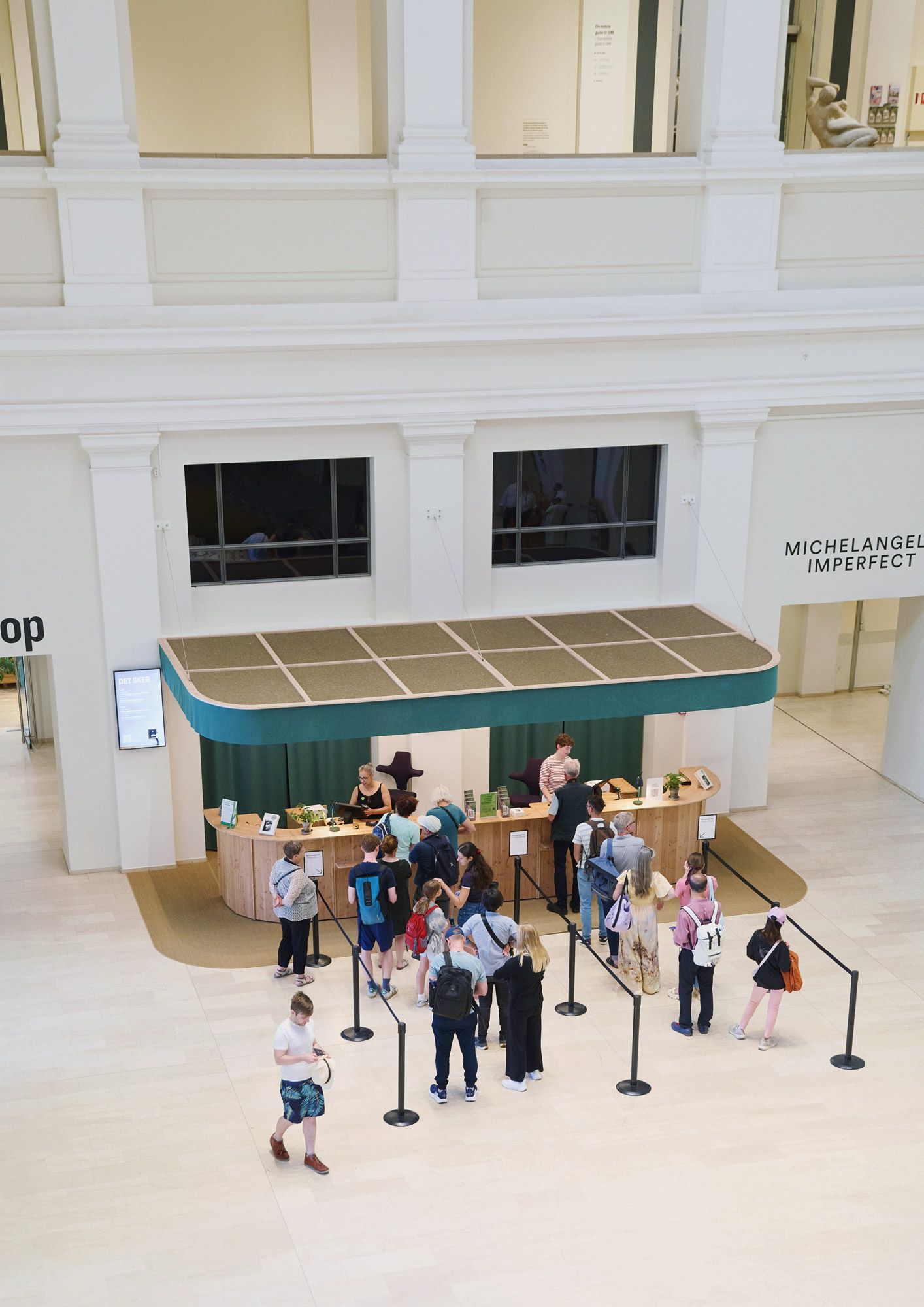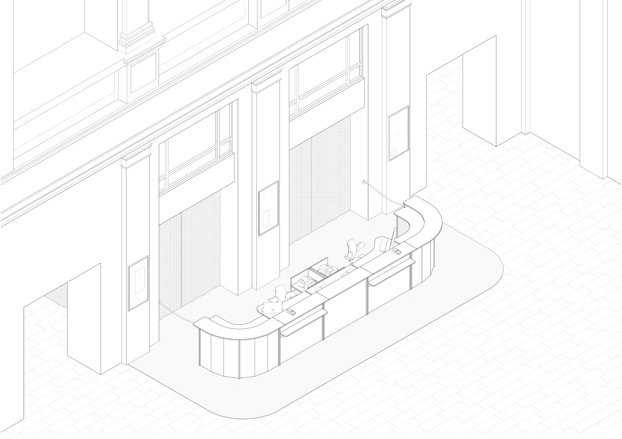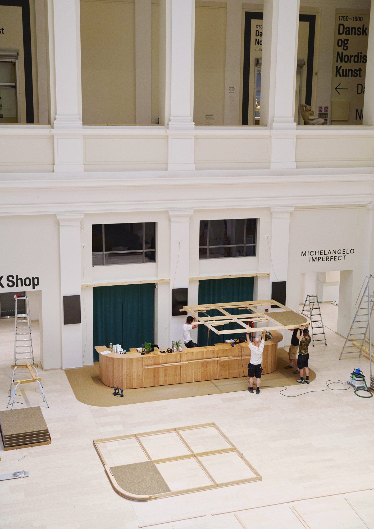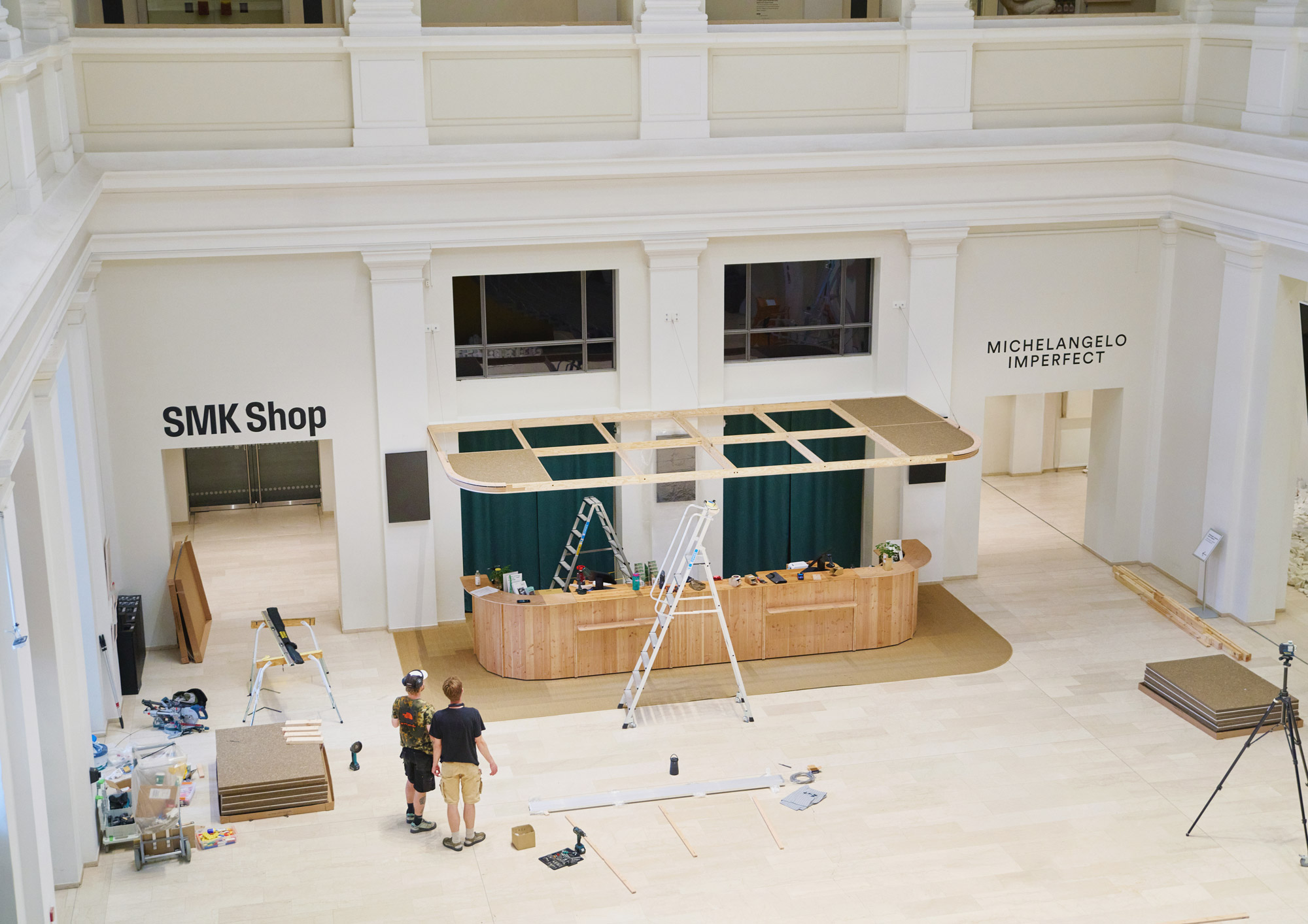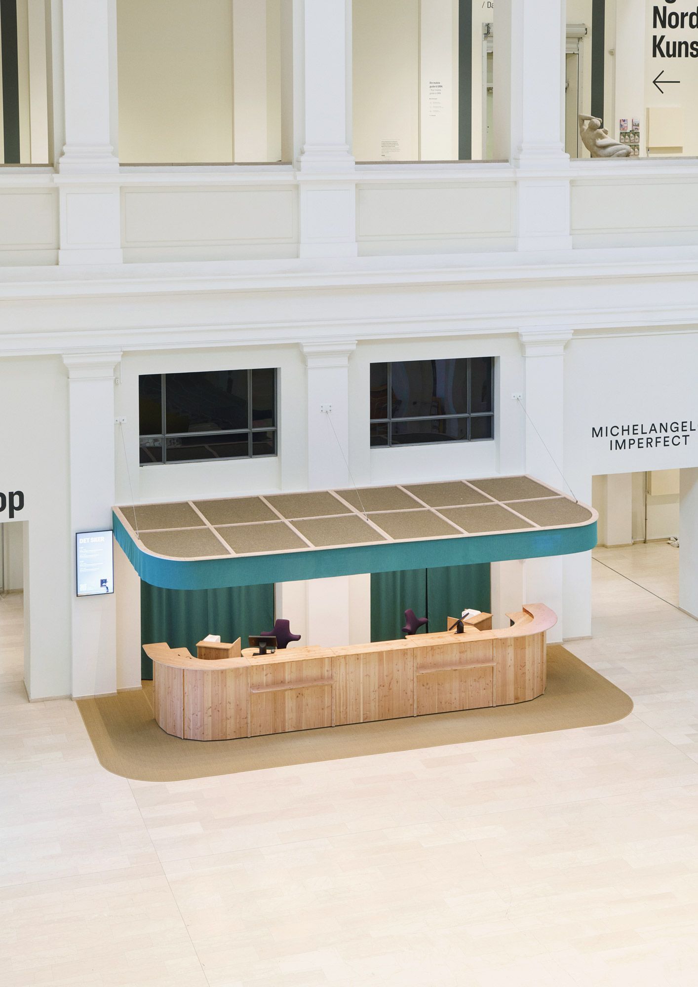A New Welcome Desk for SMK Archival has been commissioned to design and produce the new welcome desk and ticket counter at Denmark’s Statens Museum for Kunst. This project extends beyond a single element - we were invited to consider the entire entrance hall while developing the design. With parts of the Danish National Gallery (SMK) set to undergo renovations, our intervention marks a starting point for many exciting changes to the historical institution. A Long-Term, Evolving Approach Our method focuses on long-term collaborations, with the ambition to work closely to create sensory-rich, adaptable design solutions that evolve over time. Our ongoing collaboration with SMK reflects this approach. We are currently working on their Welcome Desk, where we have created a welcoming, human-scale point of access within the museum’s vast entrance hall. For the first phase, we designed and built the counter for a quicker turnaround and to experience it physically before beginning the design of the acoustic canopy. In the second phase, we designed and built the canopy, which adds acoustic dampening, additional wayfinding, and custom lighting to support both staff and visitors. A Thoughtful, Human-Centered Design Positioned at the heart of SMK’s grand entrance, the welcome desk serves both as a ticket counter and a visual guide for visitors. The warm, understated counter, combined with a carpeted floor and a calming textile backdrop, introduces texture and tactility. This design creates a welcoming, human-scale point of access within the museum’s vast entrance hall. Flexible and Sustainable Construction The central counter consists of five flexible modules. Castors on each module allow easy repositioning, enabling the layout to evolve with SMK’s needs. Panels are not glued but attached with screws, making repairs, customization, and reuse possible. For the production and material choices, we wanted to bring something natural, warmly textured, and structurally clear to the otherwise clean, pale, and hard-surfaced entry hall. In dialogue with Holst Engineering, we CNC-cut plywood and built our own I-beam profiles, which were fitted with the Danish eelgrass product Søuld. Beyond its beautiful dark texture, the material carries a strong Danish narrative and sensory qualities while meeting the high fire-safety regulations of the space. Continuing Our Collaboration with SMK This project builds on our previous work at SMK. In earlier Archival projects, we designed planters and seating patterns throughout Sculpture Street. Our goal was to create a smooth transition between the museum’s classical and modern sections, offering an inviting public space where visitors can engage with the museum in their own way. Collaboration between emerging creative practices and large institutions has great potential, particularly in Denmark’s rich cultural landscape. We are honored to continue our partnership with SMK and look forward to help shaping the future of the museum’s Entrance Hall.