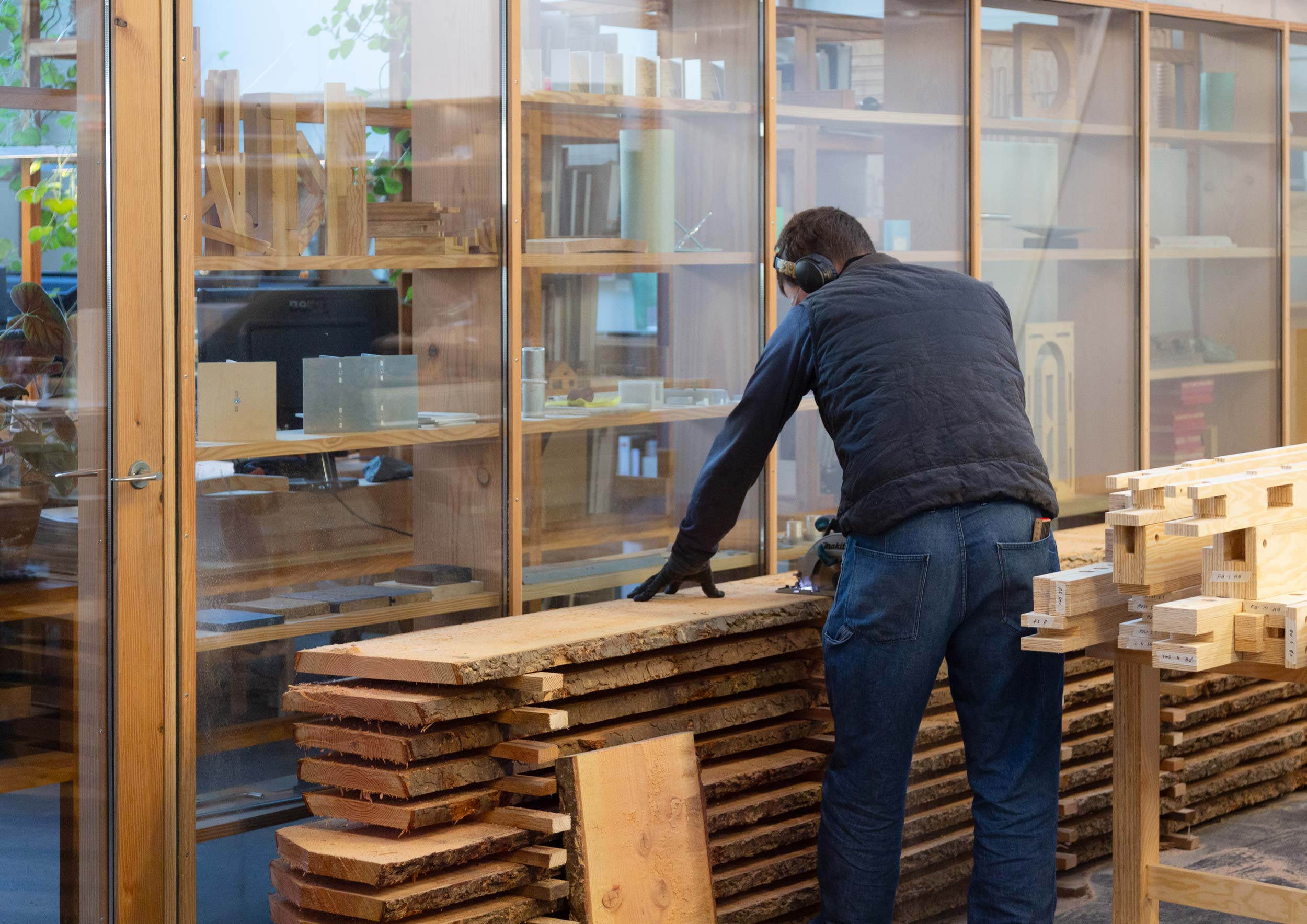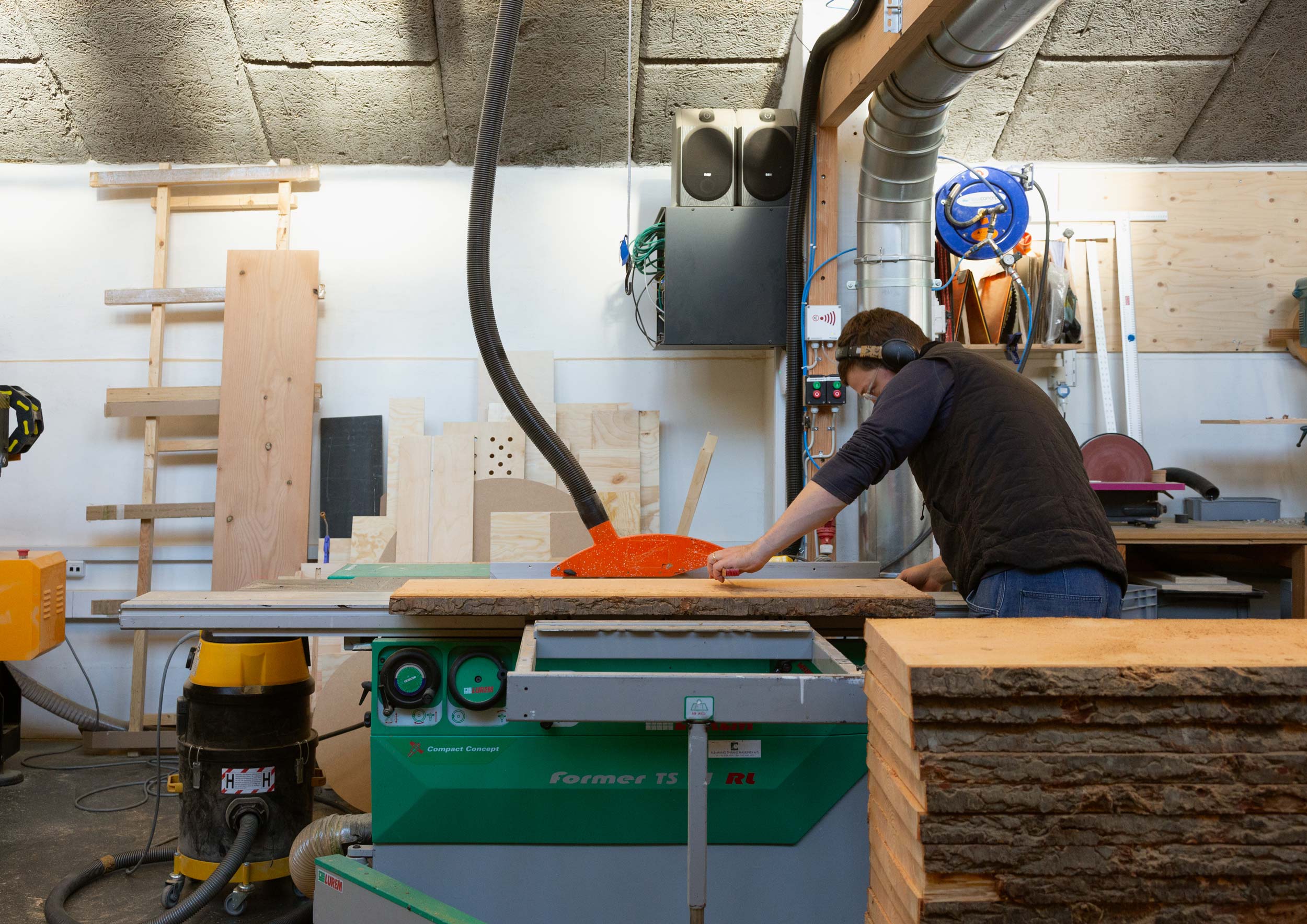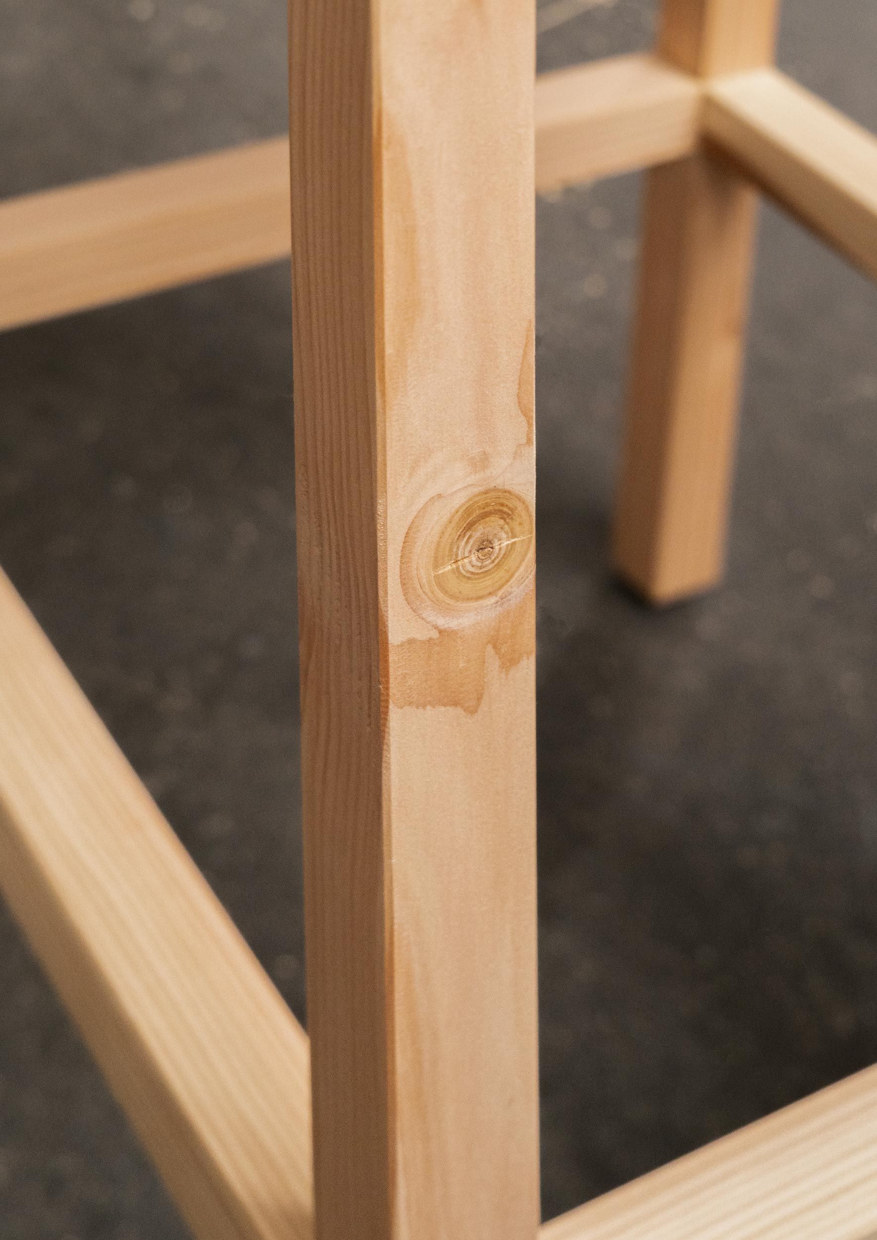 For the radical transformation of Thoravej 29 by Pihlmann Architects, Archival was commissioned by furniture and material consultant Sara Martinsen to design a high chair that would be placed throughout the building. The architecture’s uncompromising, value-driven consistency creates industrial yet transparent spaces. In response, we chose Douglas fir, treated with natural linseed oil, to bring a lively and warm expression through the bold red grain of the locally sourced wood. The lumber was sourced from Bikubenfonden’s Svanninge Bjerge natural reserve, selecting only trees that needed thinning to support the forest’s health. This approach enabled close collaboration throughout the entire process – from tree selection to the final installation at Thoravej 29. The Douglas fir used for the chair was naturally dried over several months, avoiding energy-intensive drying in ovens. While formally inspired by the Archival Ply High Chair, the Douglas High Chair – produced in-house by MSSR Works – features a thinner profile and embraces natural imperfections. Knots, wind cracks, sapwood, and planer marks are intentionally included, demonstrating how both natural and human-made irregularities can serve as examples of sustainable practice and inviting details in an increasingly perfected world. In this way, the chair enters into a dialogue with the building itself.