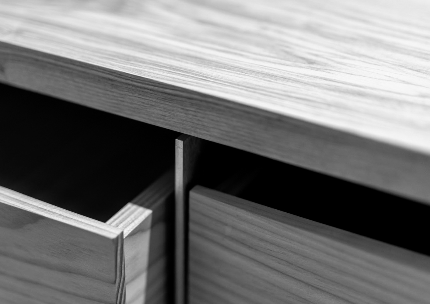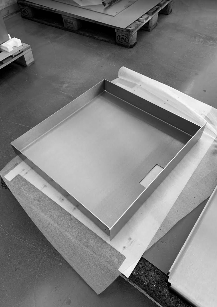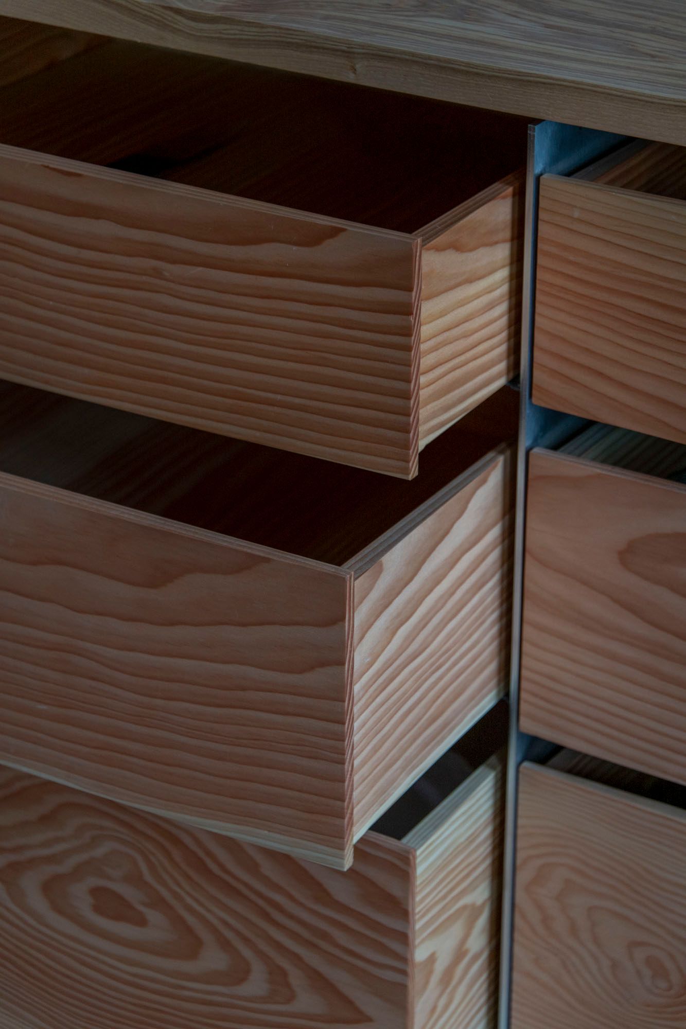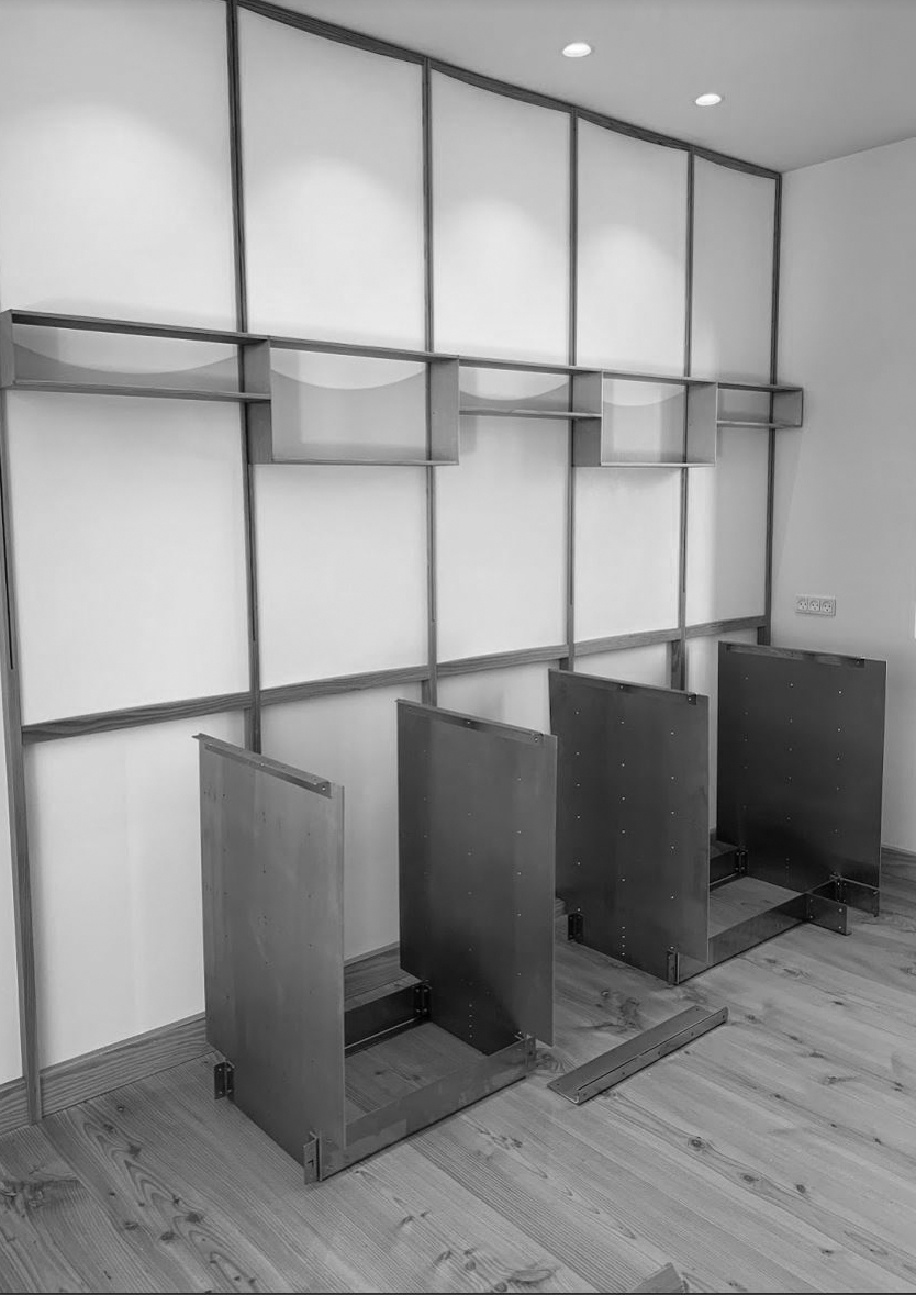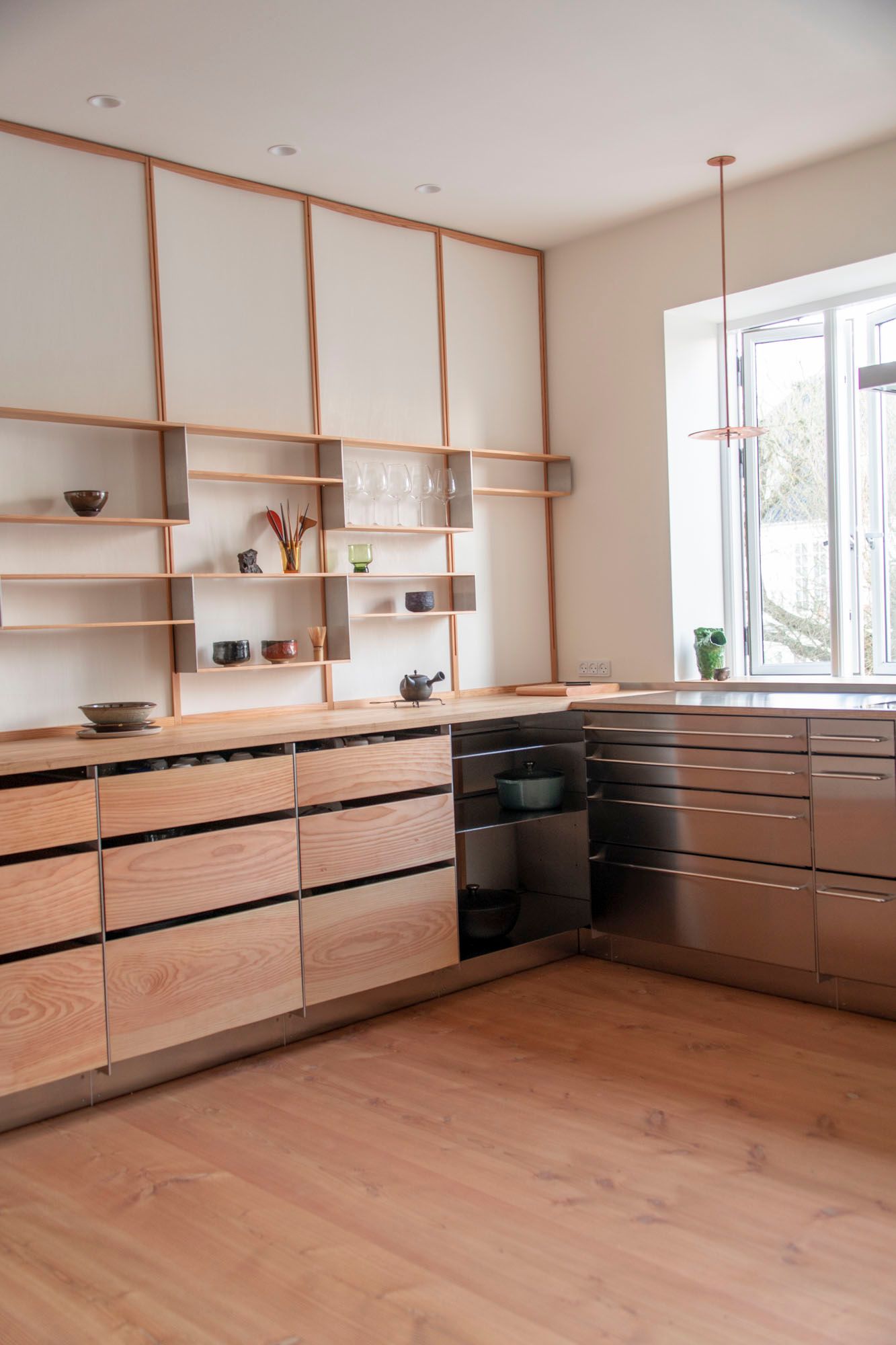 As part of Interior02, we developed, fabricated, and installed a custom kitchen for our client. The ambition was to develop a custom prefabricated system that can be utilized for different spatial situations. We started by reducing as much as possible. Traditional kitchens are made up of boxes placed next to each other. We removed the back, top, and bottom of the box, which left us with only sides and a bottom panel that both act as foundation and base panel. Furthermore, we reduced material thickness by working with steel verticals that the drawer runners mount onto from either side. The kitchen’s exposed countersunk bolts show off the structural principles and communicate the ambition that the entire kitchen is designed for disassembly and future life. Floorboards continue to run under the kitchen. We installed wooden skirting behind the kitchen as well, in order to future-proof the overall renovation. The design is resolved down to the smallest detail in Rhino3D and 90 % digitally fabricated: laser-cut and bent stainless steel and CNC routed drawers, tabletops, and wall panels. To avoid welding (manual labor) of the steel drawers, these were realized in 3mm steel that becomes structural once bent. The client wished for a functional industrial kitchen balanced by a domestic touch. The main “service” part of the kitchen, which holds the appliances, was realized in stainless steel. The other length of the kitchen, which reaches towards the living room, is realized in Douglas Fir and Ashwood, bringing it into relation with the rest of the apartment’s warm interior. Subtle curves are seen throughout the woodwork, which gives softness to the steel and elegance to the overall mass.