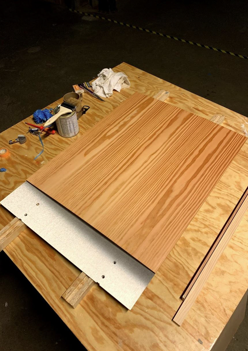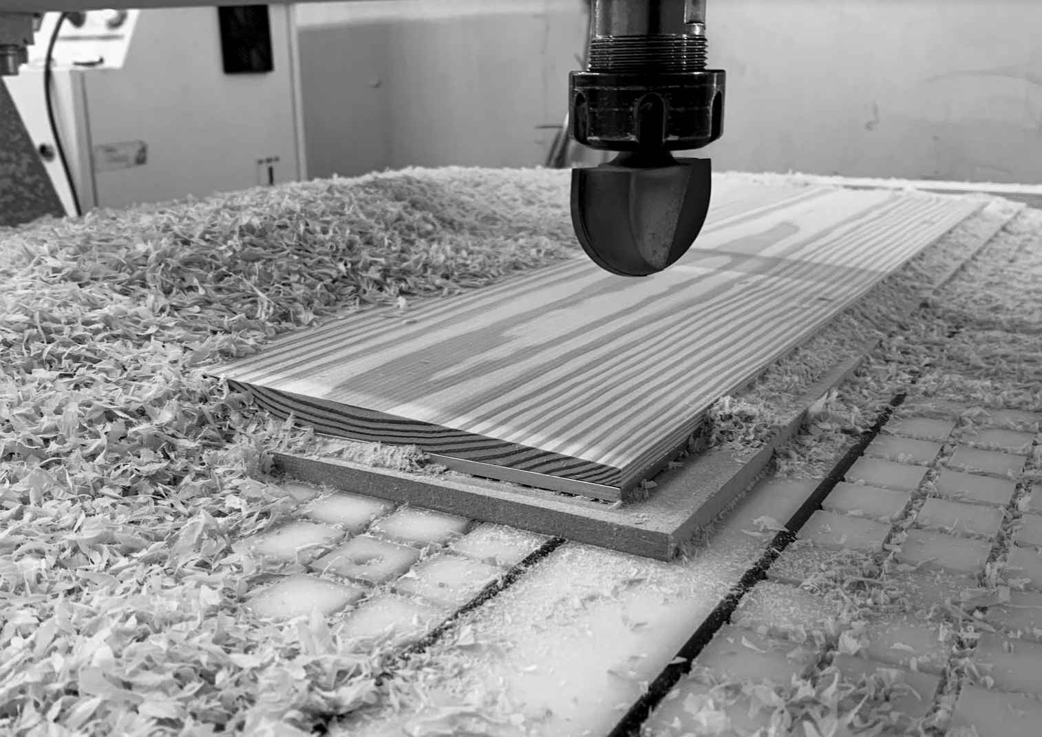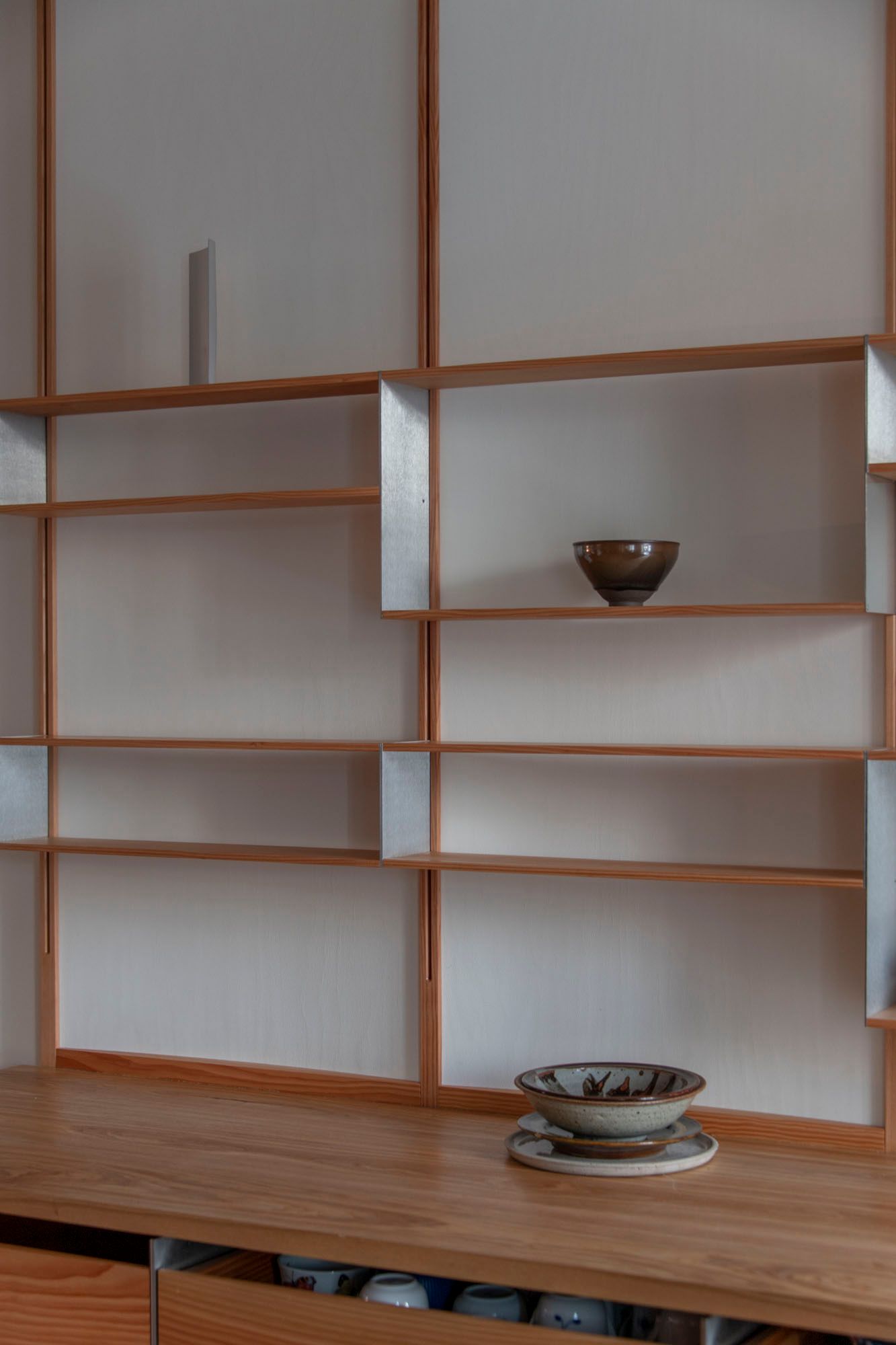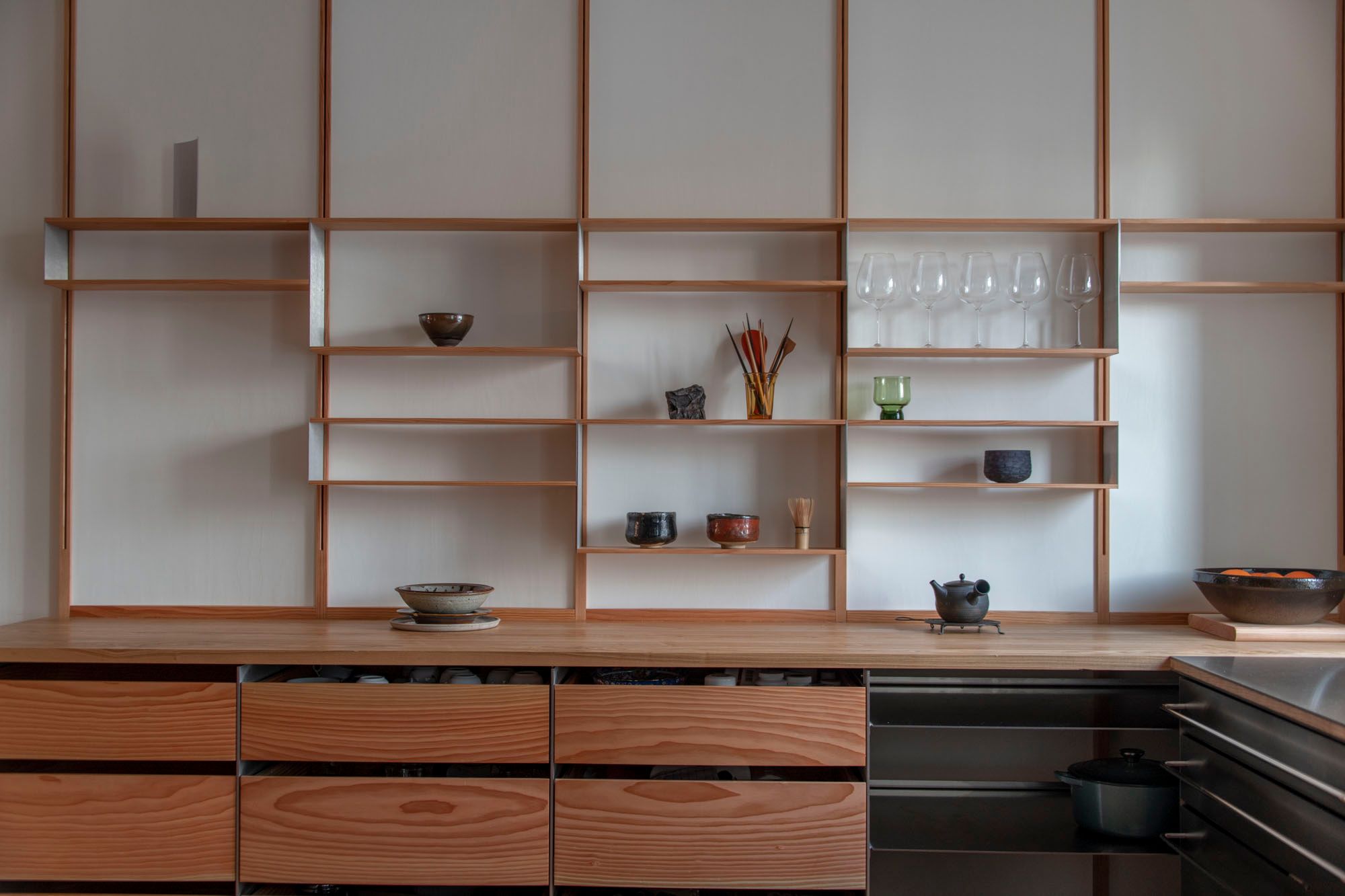 As part of Interior02, we developed, fabricated, and installed a custom kitchen for our client. The ambition was to develop a custom prefabricated system that can be utilized for different spatial situations. We started by reducing as much as possible. Traditional kitchens are made up of boxes placed next to each other. We removed the back, top, and bottom of the box, which left us with only sides and a bottom panel that both act as foundation and base panel. Furthermore, we reduced material thickness by working with steel verticals that the drawer runners mount onto from either side. The kitchen’s exposed countersunk bolts show off the structural principles and communicate the ambition that the entire kitchen is designed for disassembly and future life. Floorboards continue to run under the kitchen. We installed wooden skirting behind the kitchen as well, in order to future-proof the overall renovation. The design is resolved down to the smallest detail in Rhino3D and 90 % digitally fabricated: laser-cut and bent stainless steel and CNC routed drawers, tabletops, and wall panels. To avoid welding (manual labor) of the steel drawers, these were realized in 3mm steel that becomes structural once bent. The client wished for a functional industrial kitchen balanced by a domestic touch. The main “service” part of the kitchen, which holds the appliances, was realized in stainless steel. The other length of the kitchen, which reaches towards the living room, is realized in Douglas Fir and Ashwood, bringing it into relation with the rest of the apartment’s warm interior. Subtle curves are seen throughout the woodwork, which gives softness to the steel and elegance to the overall mass.