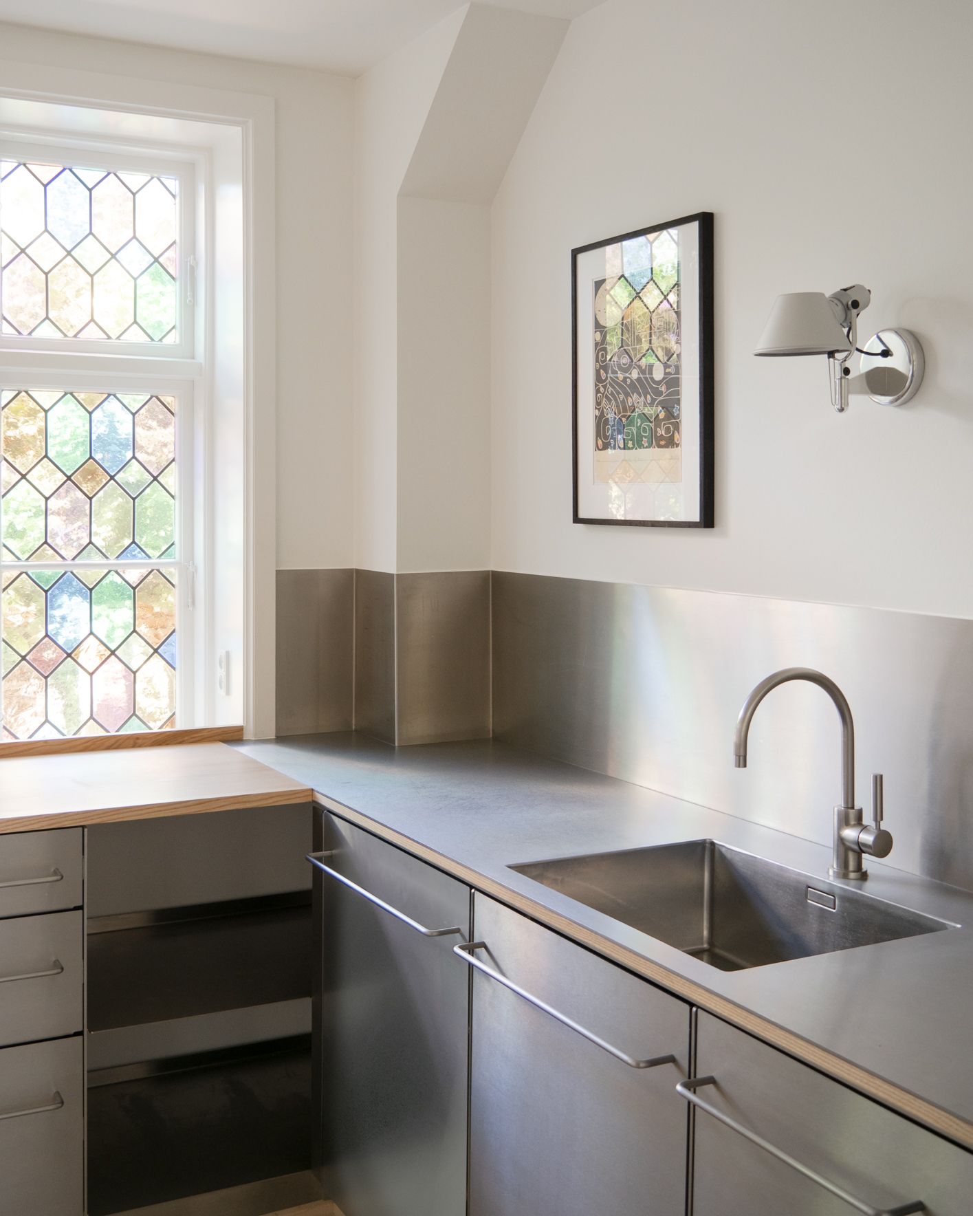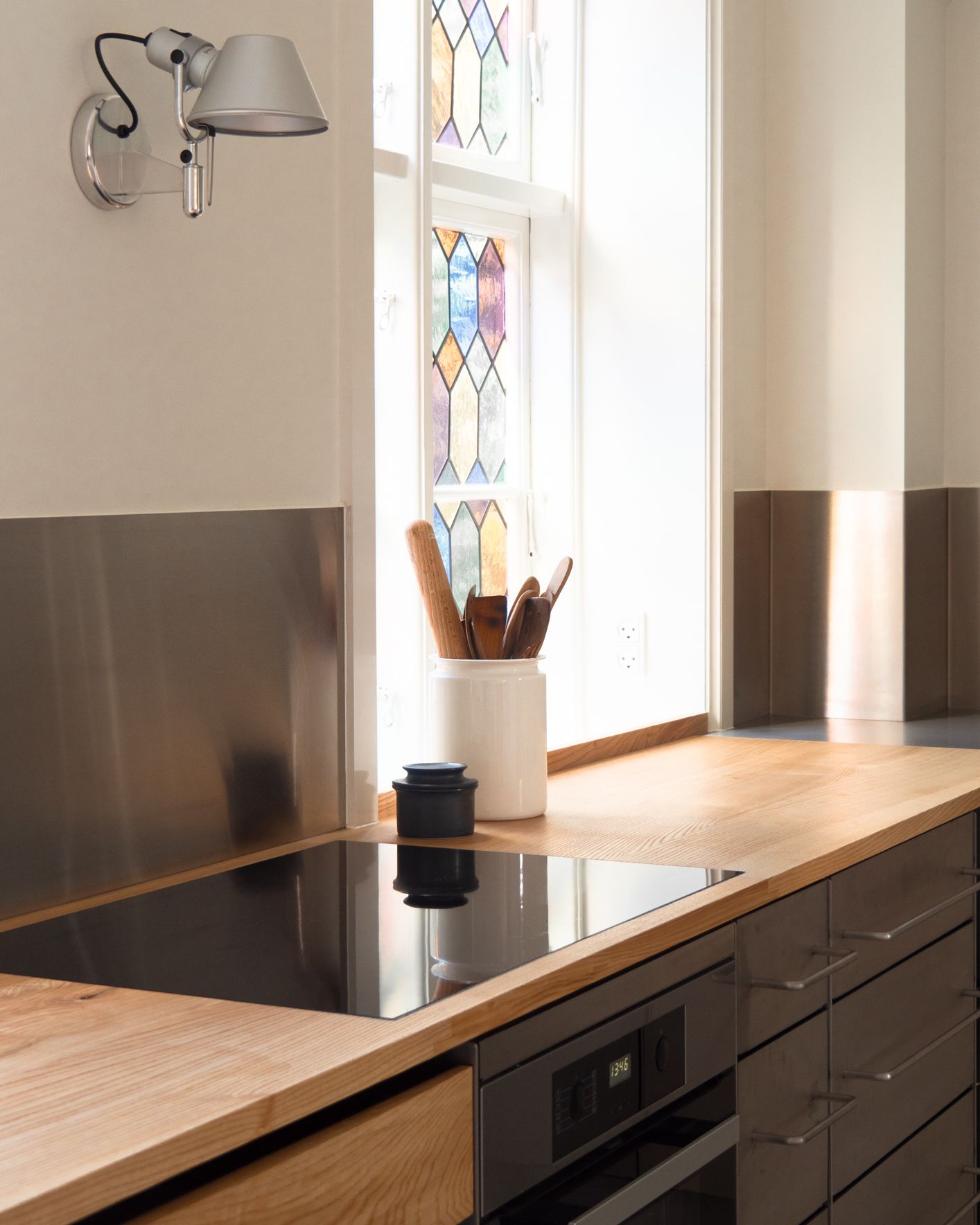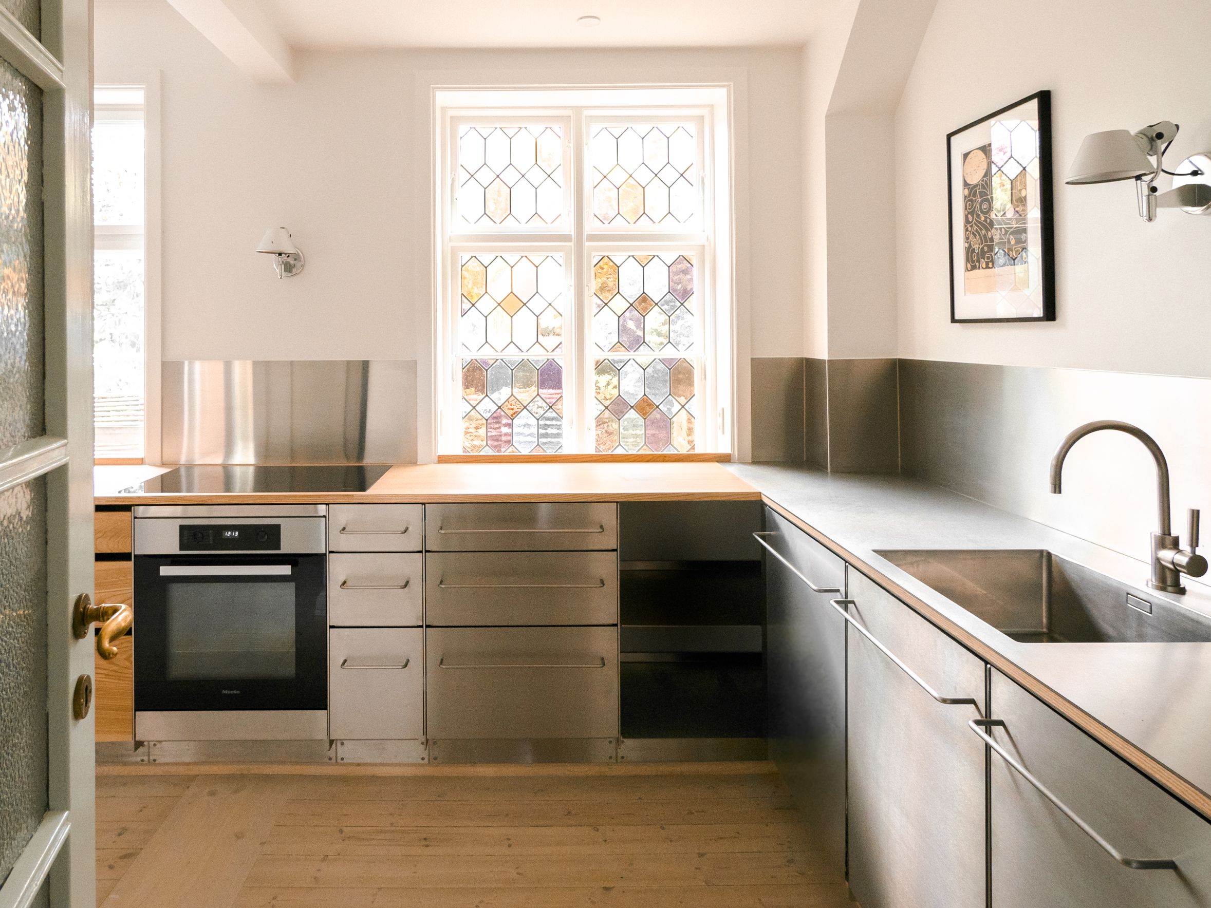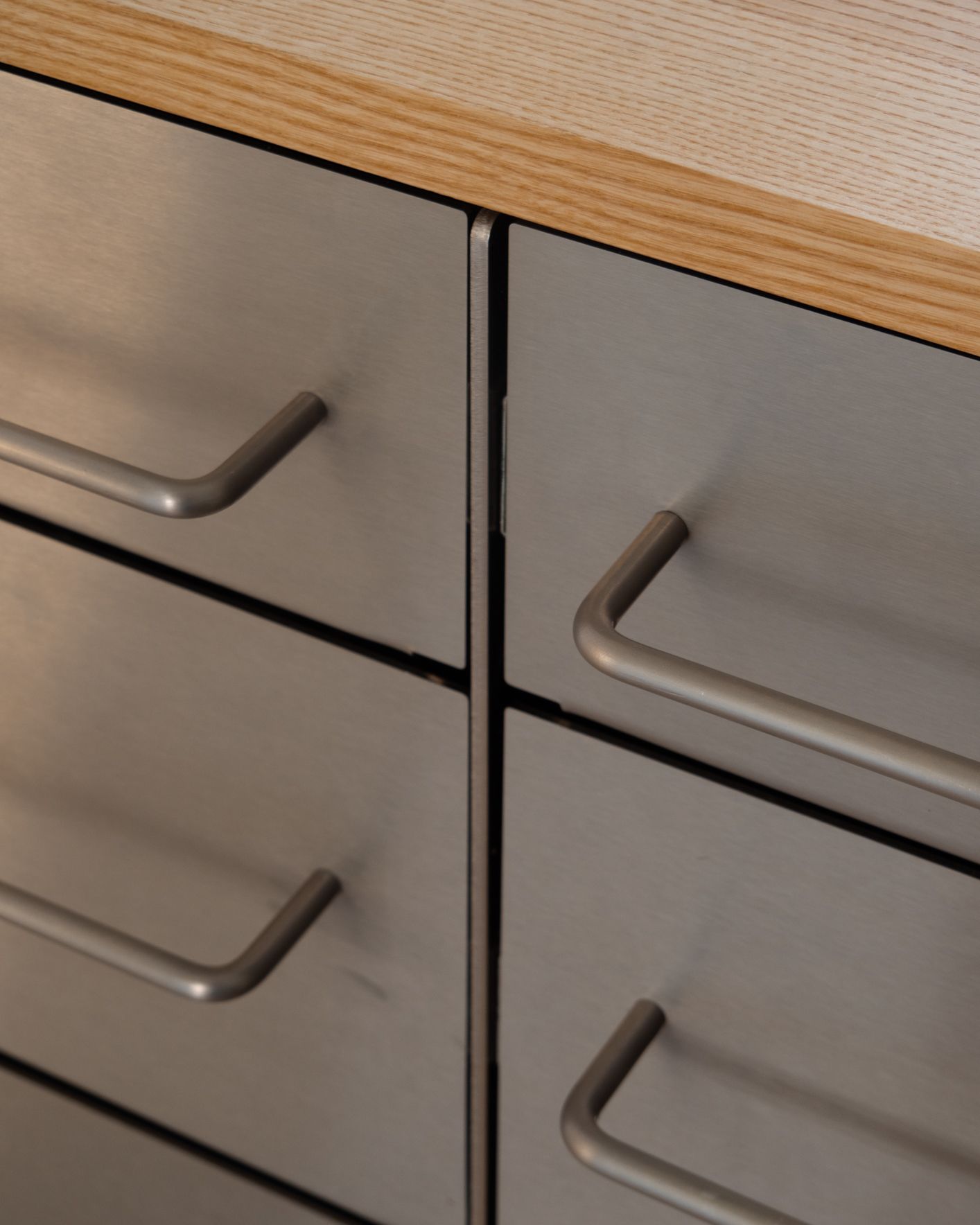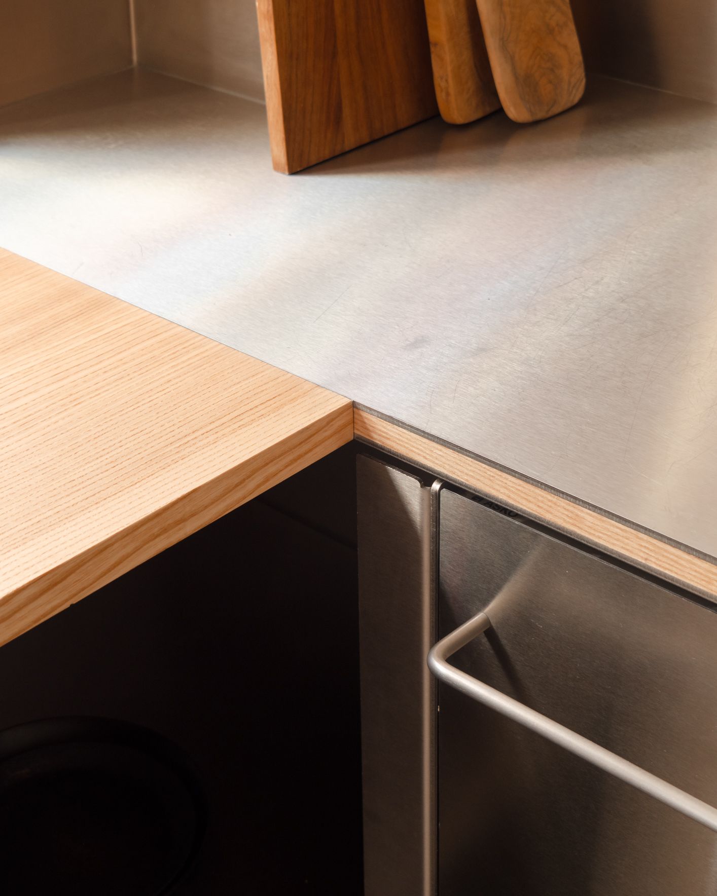 The brief for our latest residential project was to create a functional industrial kitchen balanced by a domestic touch. The part of the kitchen holding the “wet appliances”, such as the sink, fridge and dishwasher is realized in brushed stainless steel. The other length of the kitchen extending towards the dining room, is realized in vibrant Ashwood, bringing it into relation with the rest of the house’s warm interior. A fine strip of Ashwood under the stainless steel countertop references the kitchens wooden elements, subtly connecting the two sections of the of the structure. Subtle curves throughout the wooden fronts give softness to the metal kitchen and elegance to the overall mass. The brushed surface of the stainless steel elements softly reflect the color of the Ashwood surfaces, resulting in an overall bright and warm atmosphere. As part of this residential kitchen project we also developed a range of linseed oil-painted plywood furniture.