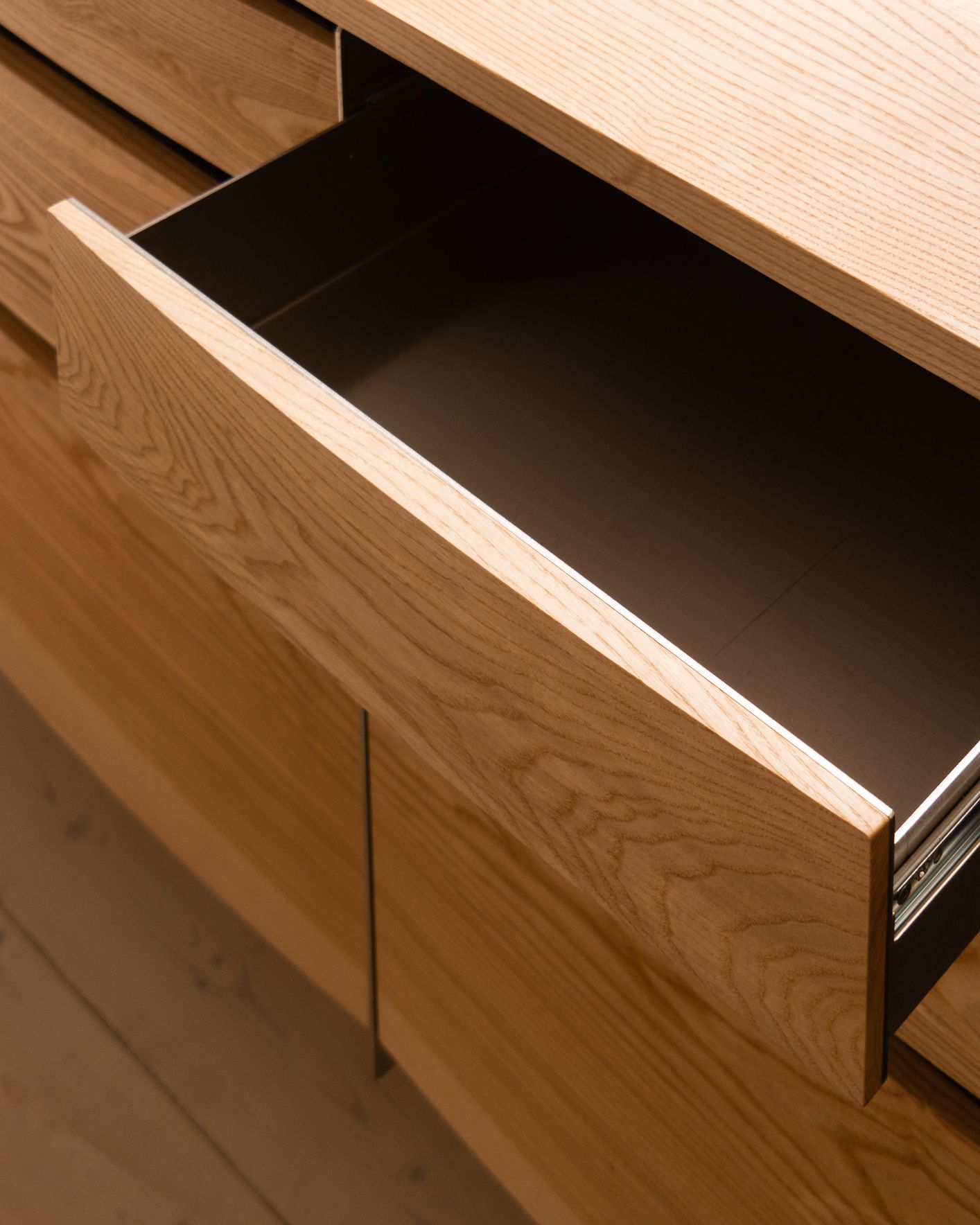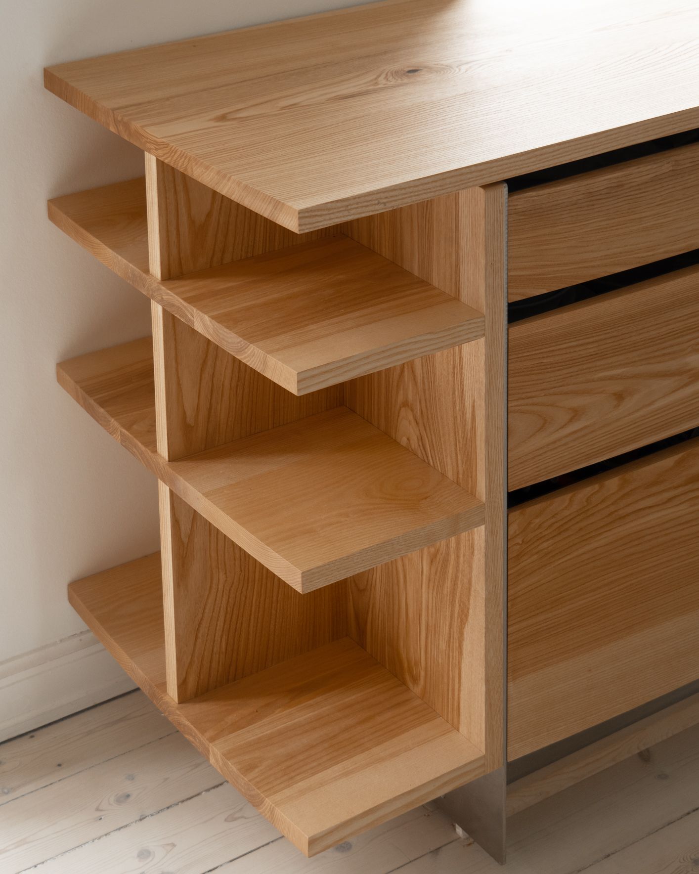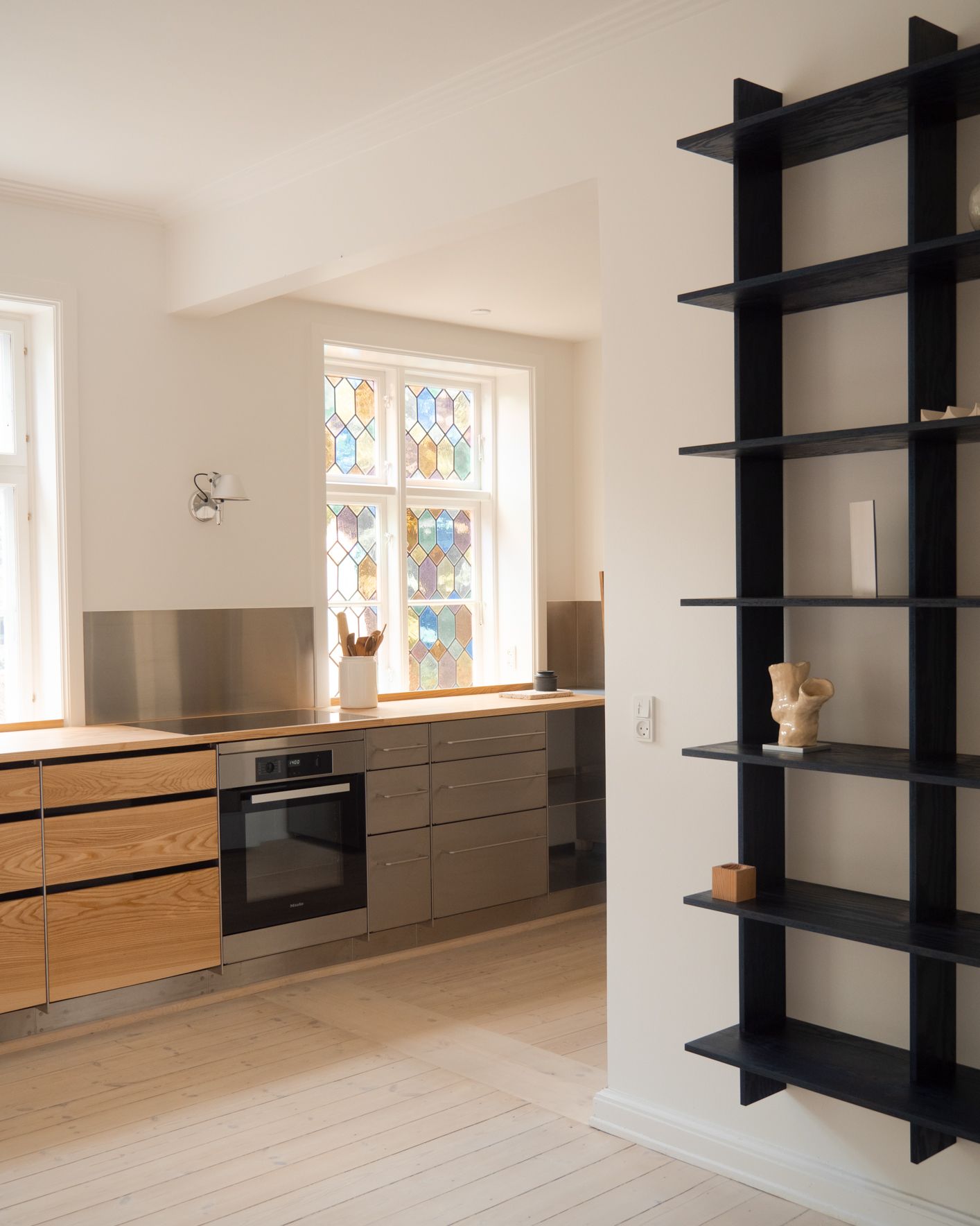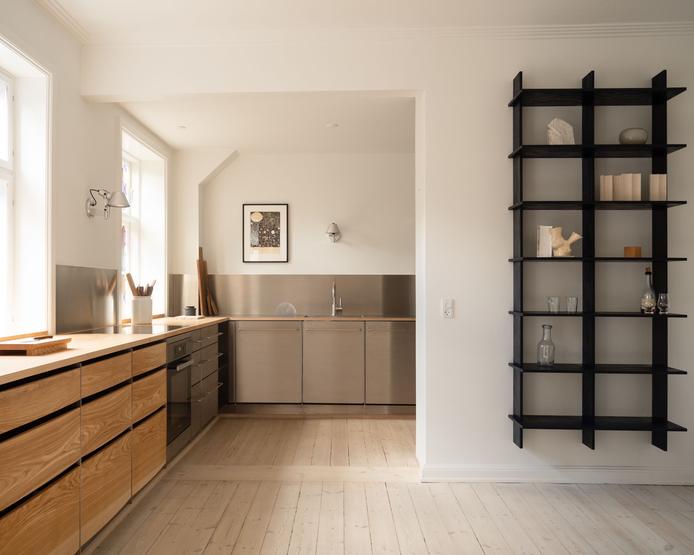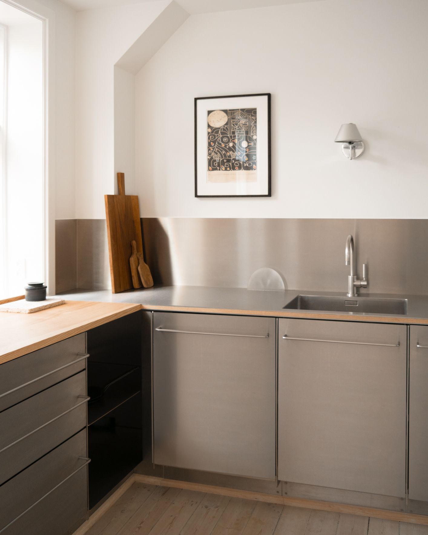 The brief for our latest residential project was to create a functional industrial kitchen balanced by a domestic touch. The part of the kitchen holding the “wet appliances”, such as the sink, fridge and dishwasher is realized in brushed stainless steel. The other length of the kitchen extending towards the dining room, is realized in vibrant Ashwood, bringing it into relation with the rest of the house’s warm interior. A fine strip of Ashwood under the stainless steel countertop references the kitchens wooden elements, subtly connecting the two sections of the of the structure. Subtle curves throughout the wooden fronts give softness to the metal kitchen and elegance to the overall mass. The brushed surface of the stainless steel elements softly reflect the color of the Ashwood surfaces, resulting in an overall bright and warm atmosphere. As part of this residential kitchen project we also developed a range of linseed oil-painted plywood furniture.