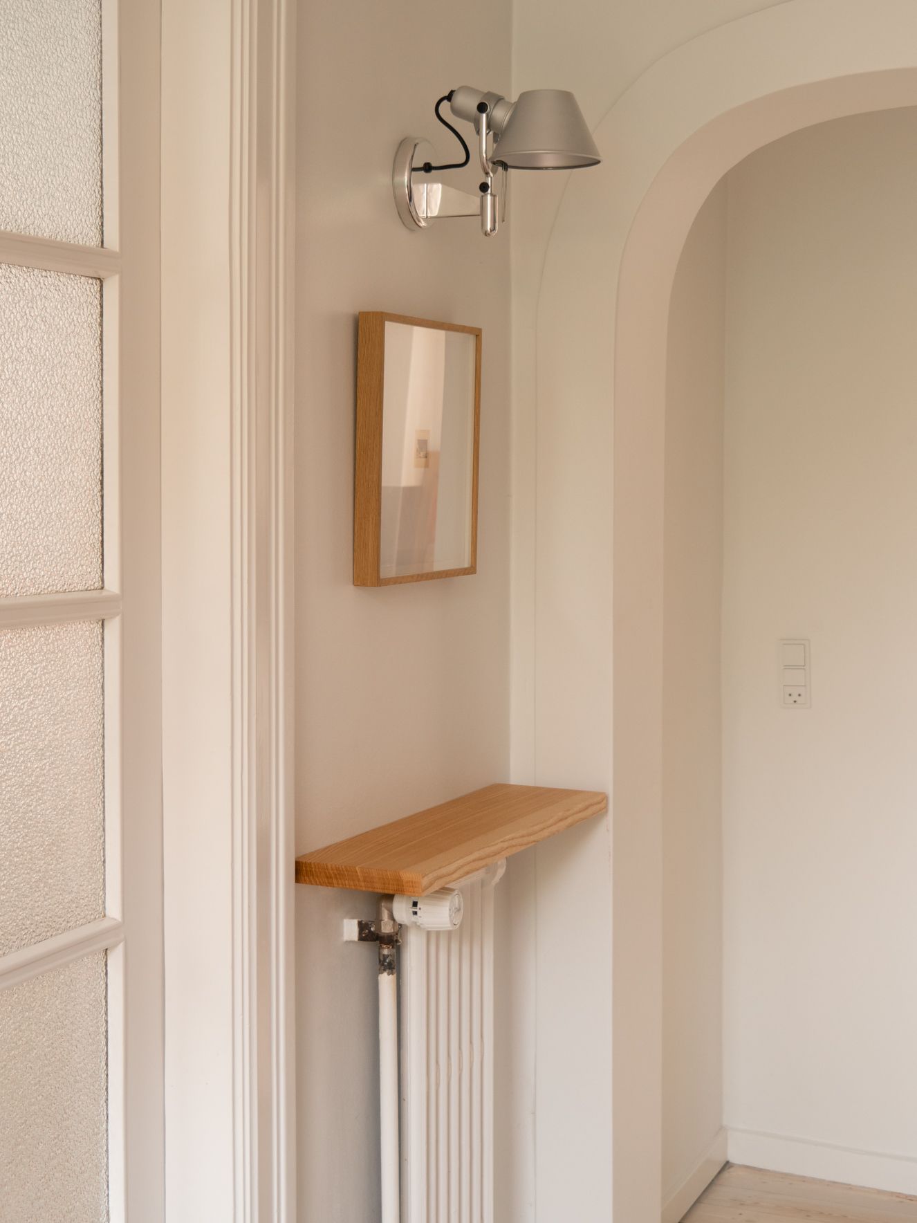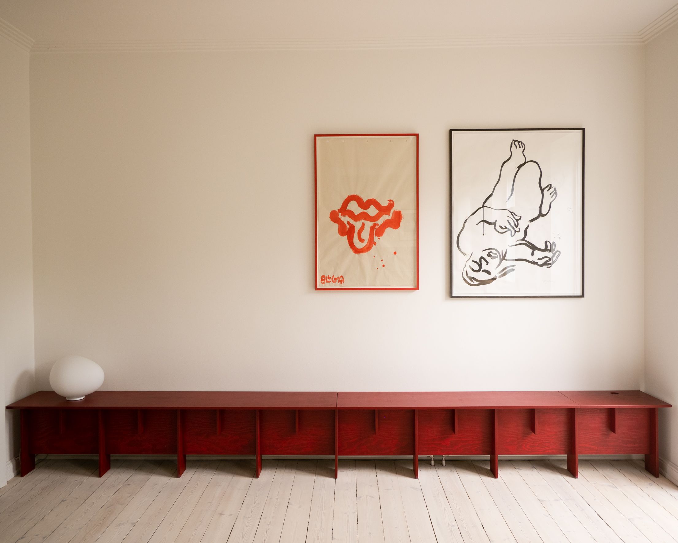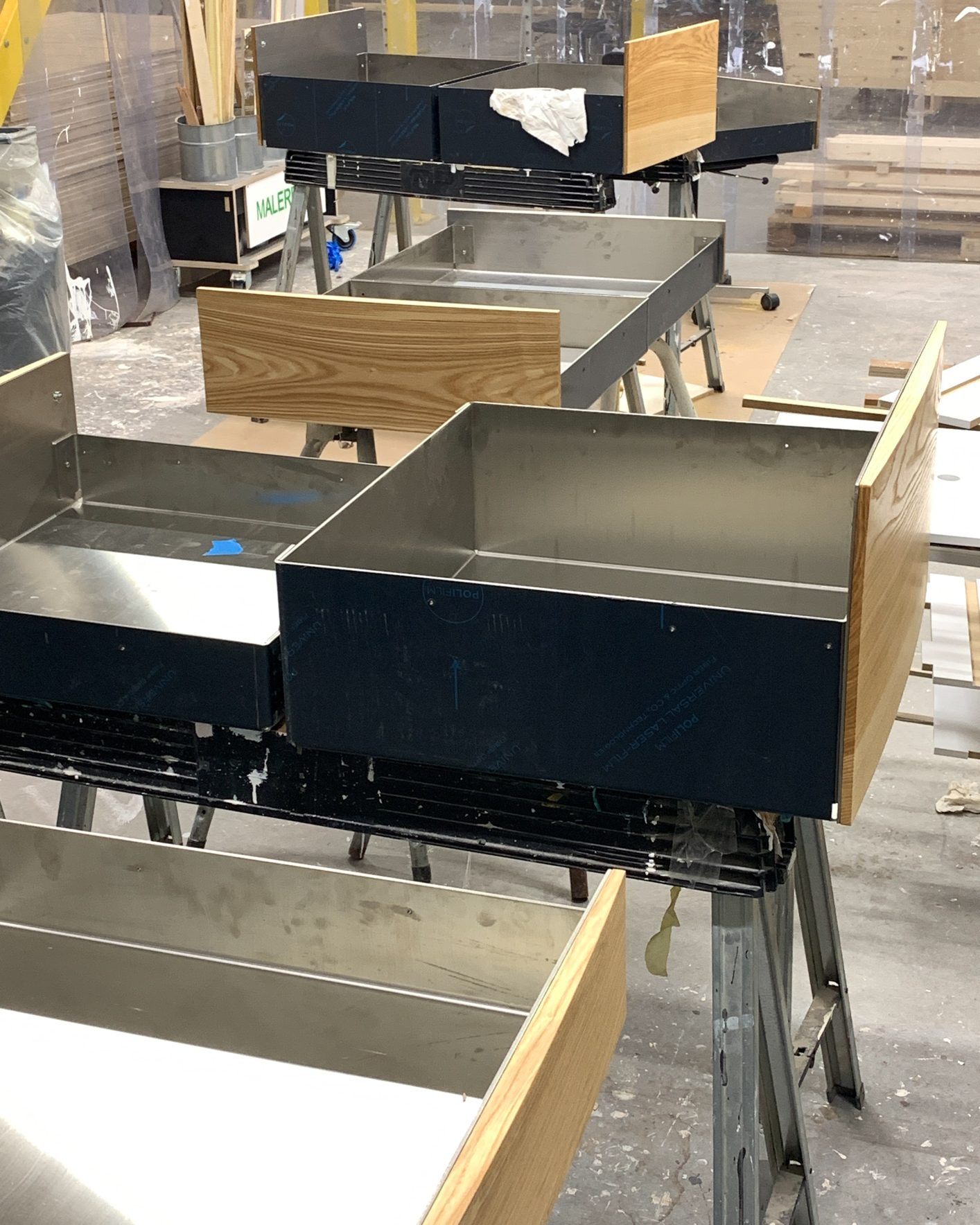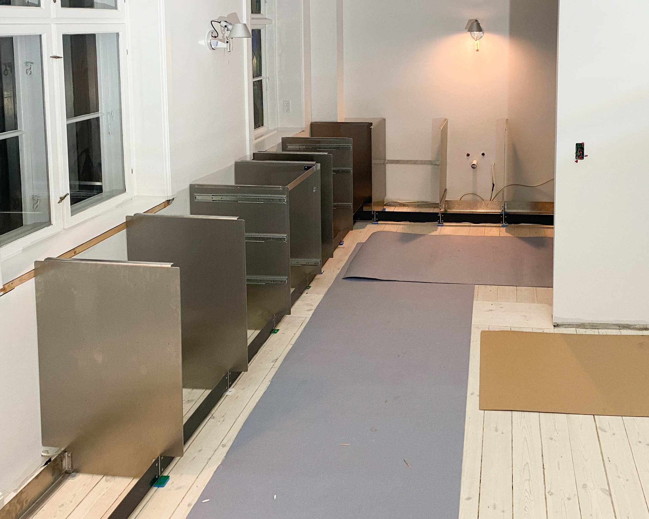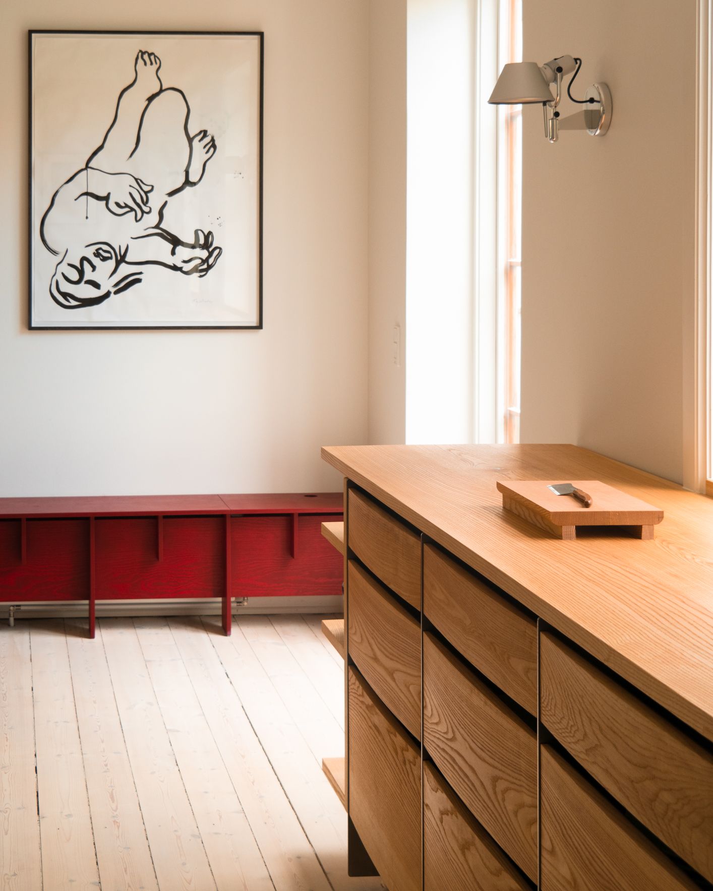 The brief for our latest residential project was to create a functional industrial kitchen balanced by a domestic touch. The part of the kitchen holding the “wet appliances”, such as the sink, fridge and dishwasher is realized in brushed stainless steel. The other length of the kitchen extending towards the dining room, is realized in vibrant Ashwood, bringing it into relation with the rest of the house’s warm interior. A fine strip of Ashwood under the stainless steel countertop references the kitchens wooden elements, subtly connecting the two sections of the of the structure. Subtle curves throughout the wooden fronts give softness to the metal kitchen and elegance to the overall mass. The brushed surface of the stainless steel elements softly reflect the color of the Ashwood surfaces, resulting in an overall bright and warm atmosphere. As part of this residential kitchen project we also developed a range of linseed oil-painted plywood furniture.