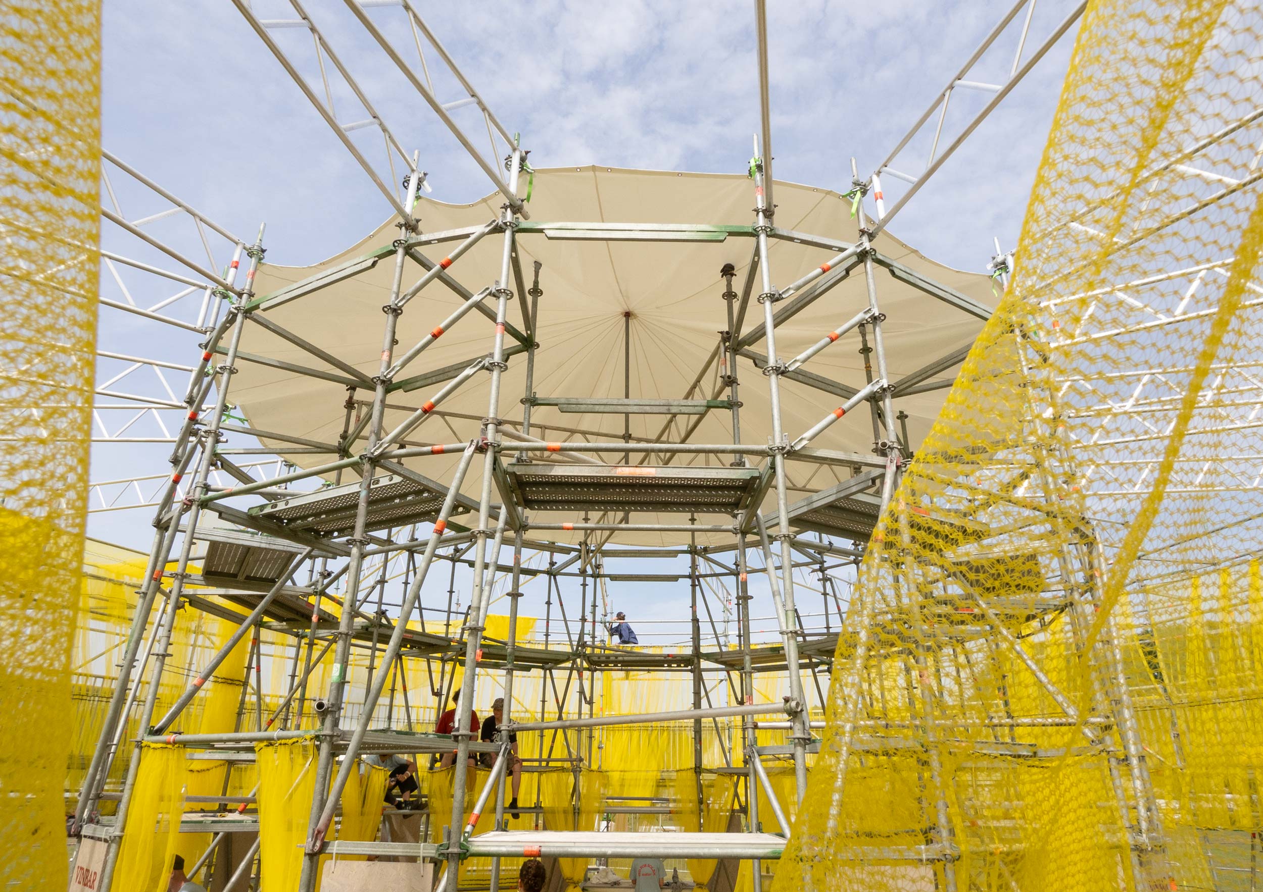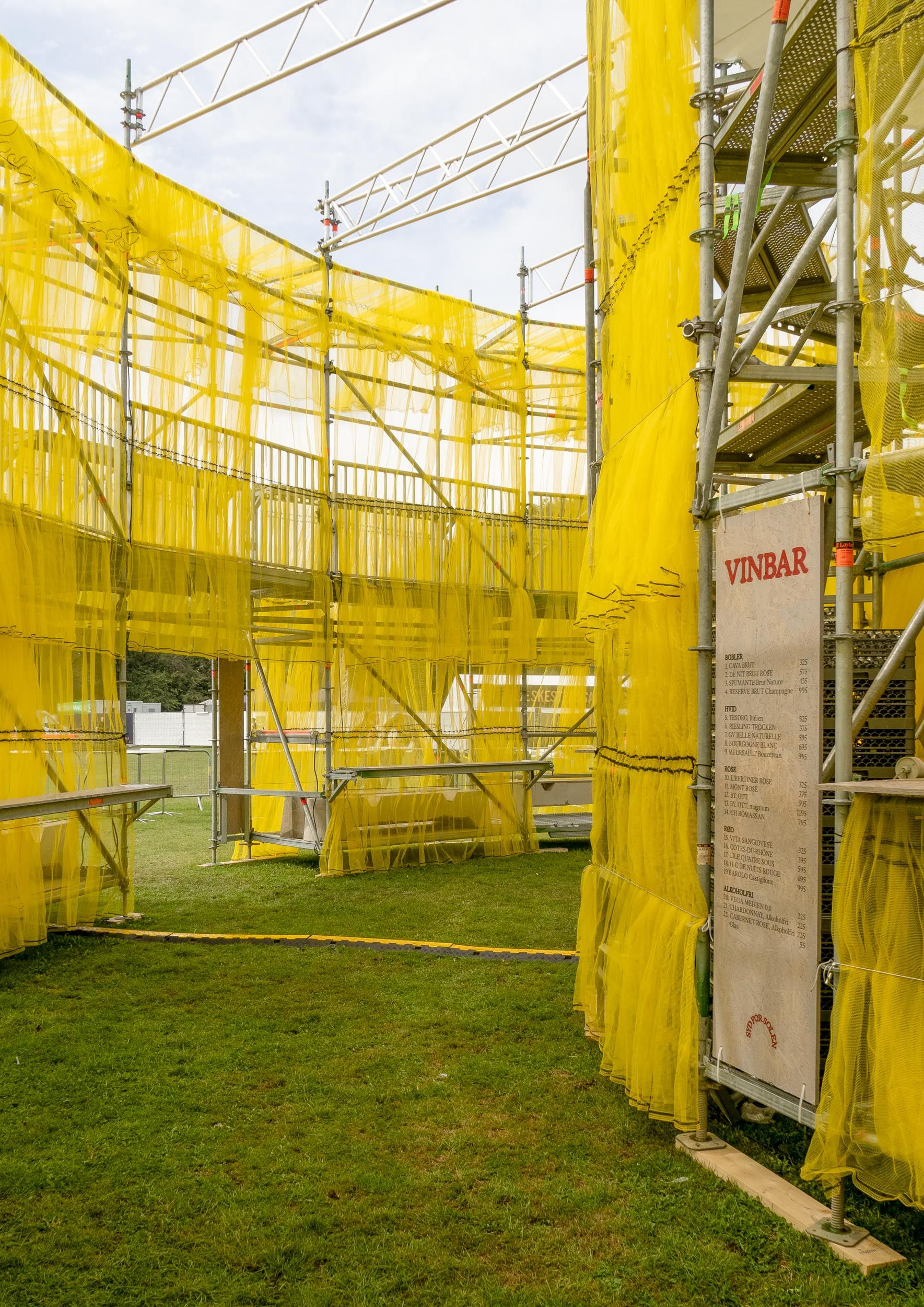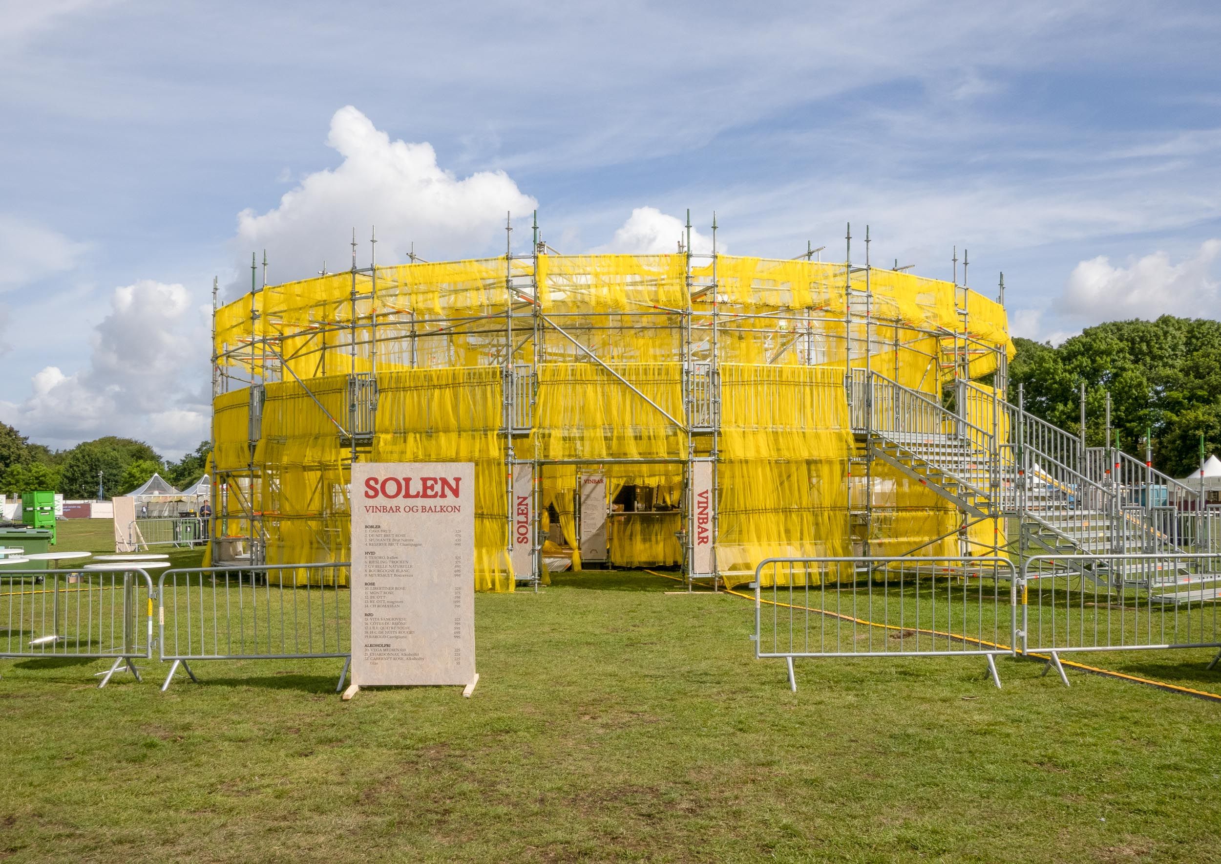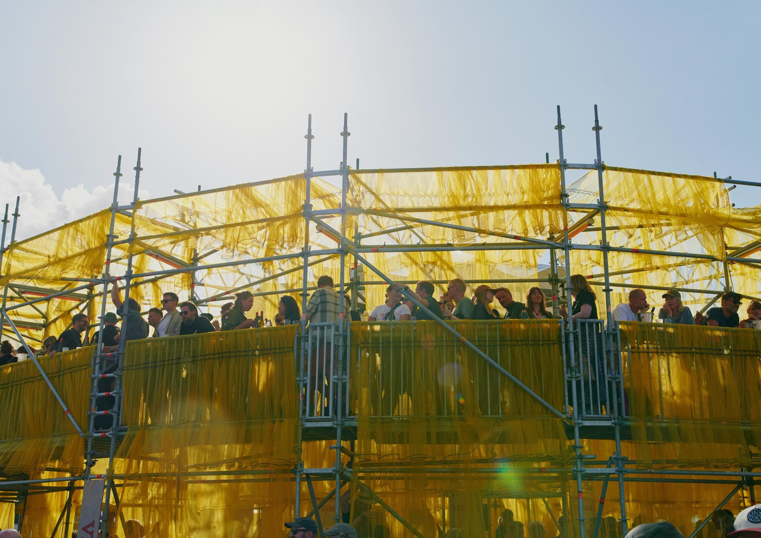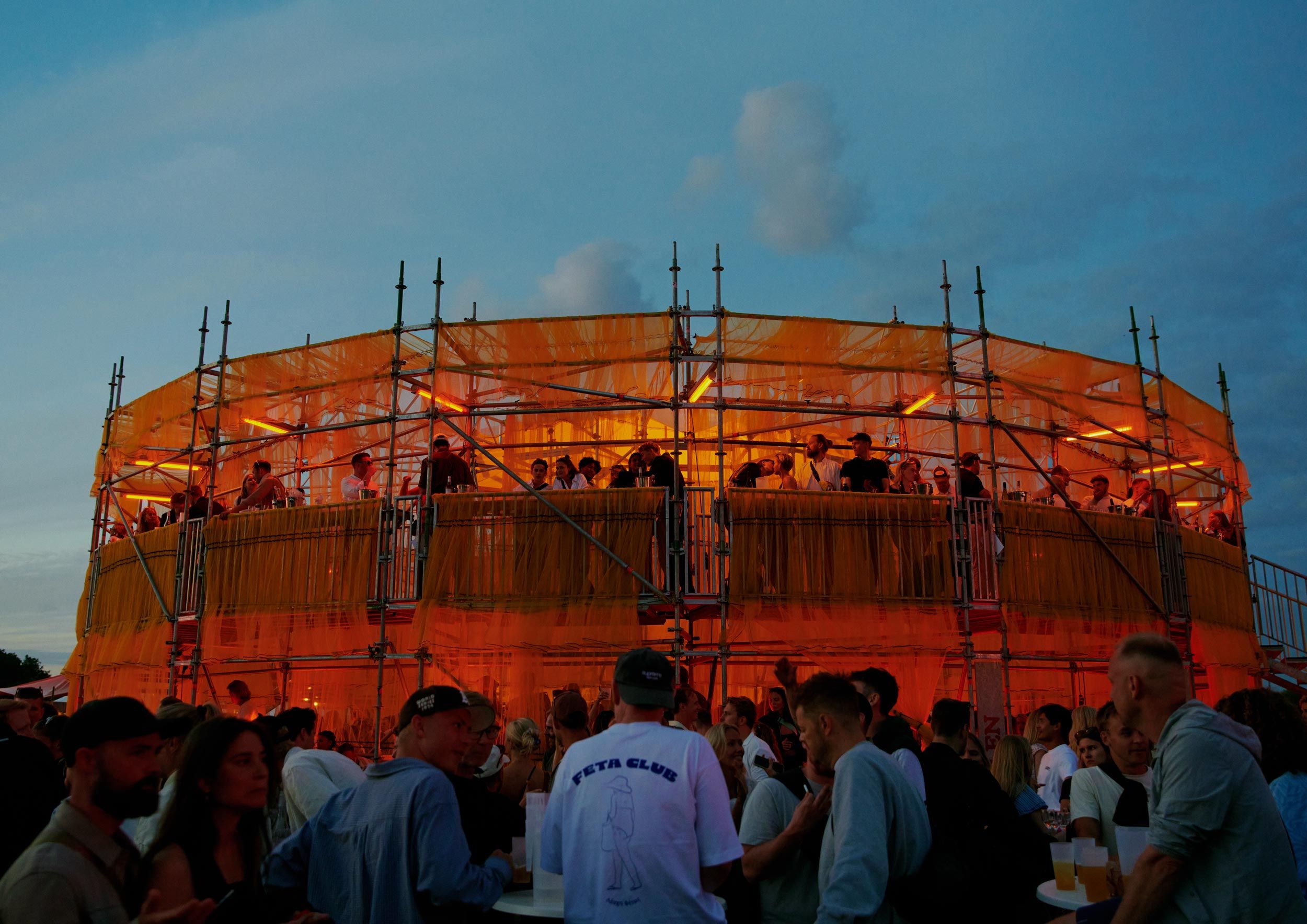 Solen is a pavilion designed as the landmark for this year’s Syd for Solen festival — a physical object for navigation, gathering, and sensation. Drawing direct inspiration from the sun, the design features a strong graphical aesthetic in shape and color softened through the strategic use of textiles and natural light. The pavilion is composed of scaffolding, which, by nature, is a circular and temporary system that allows for disassembly and repurpose. This makes the design reusable for the year’s to come, reinforcing our commitment to minimizing waste. The scaffolding system is known for its graphical lines and slender yet voluminous metal structure. The pavilion’s industrial framework is contrasted with the draping of mesh-like scaffolding textile, which plays with the concept of translucency. This layering of textiles introduces multiple shades of color, creating a lively visual experience. The circle, a simple yet potent symbol, anchors the pavilion’s design, welcoming visitors from all angles.