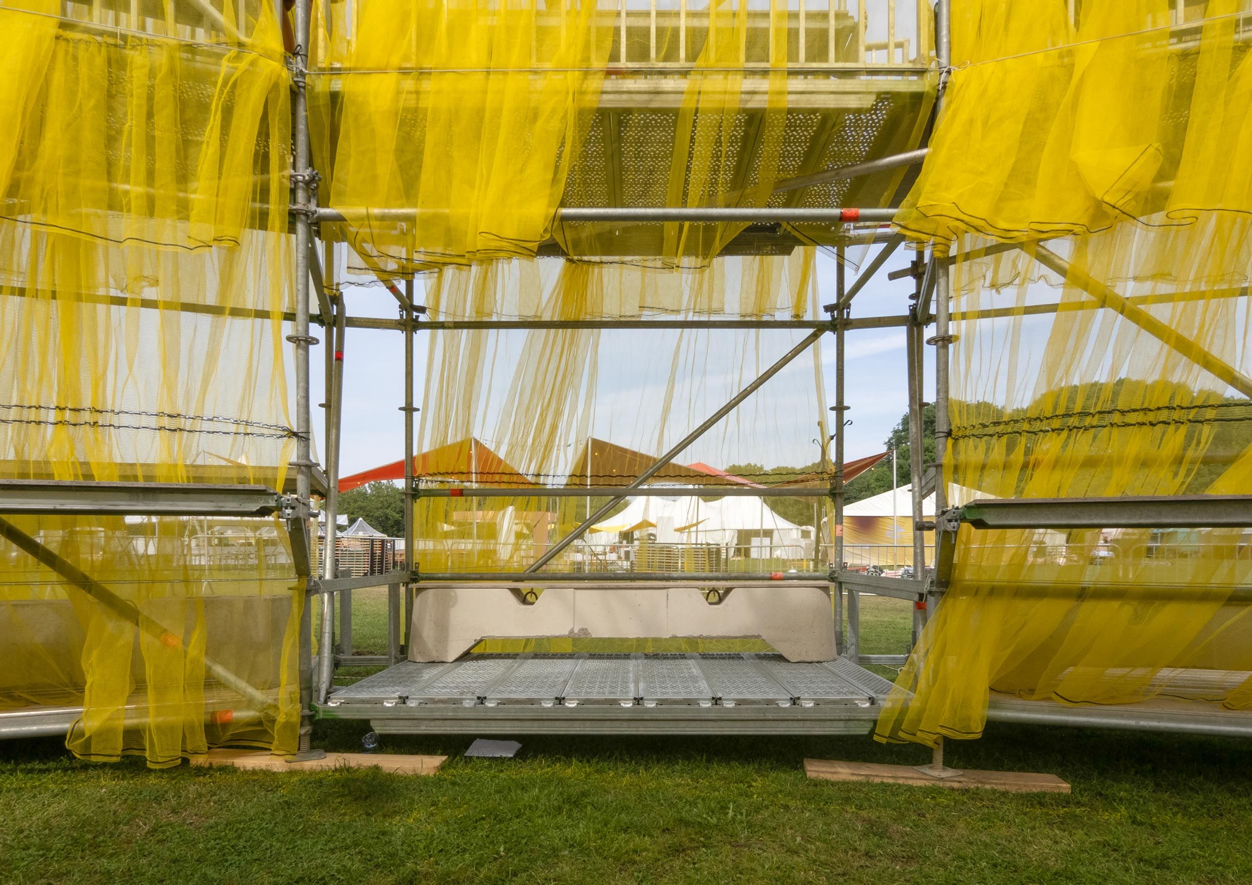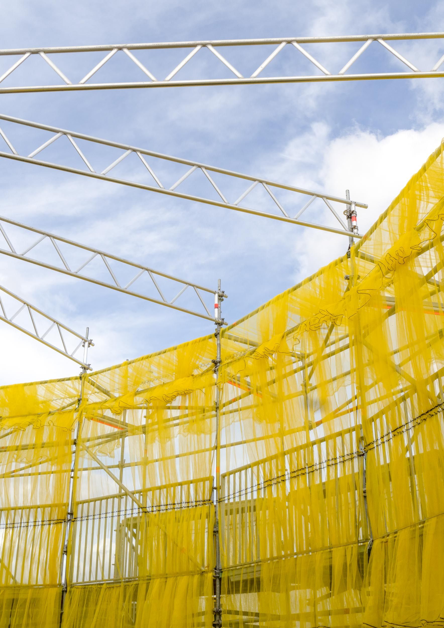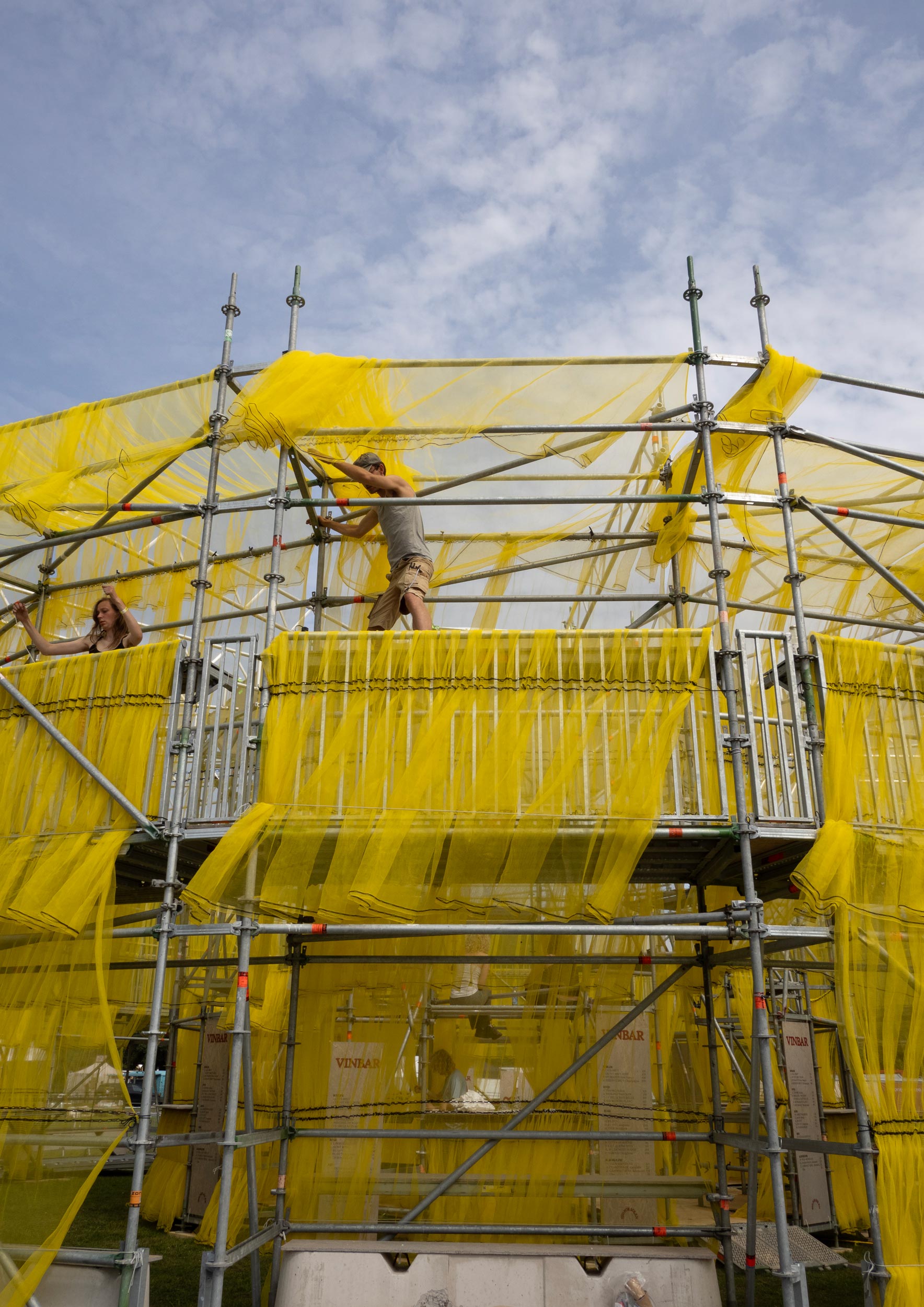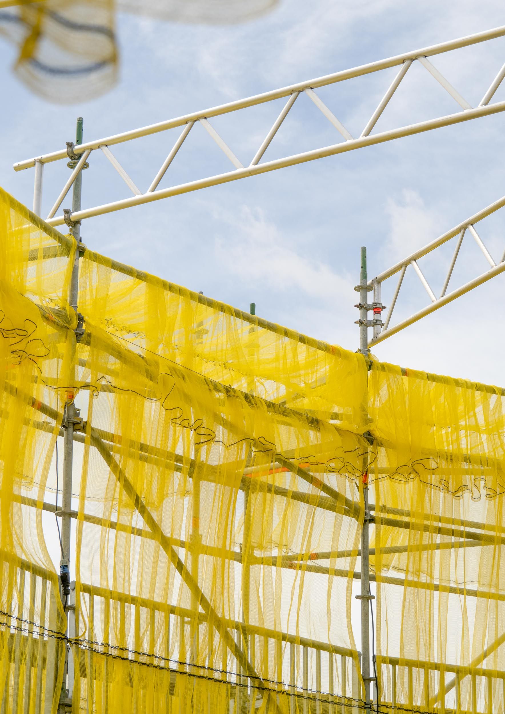 Solen is a pavilion designed as the landmark for this year’s Syd for Solen festival — a physical object for navigation, gathering, and sensation. Drawing direct inspiration from the sun, the design features a strong graphical aesthetic in shape and color softened through the strategic use of textiles and natural light. The pavilion is composed of scaffolding, which, by nature, is a circular and temporary system that allows for disassembly and repurpose. This makes the design reusable for the year’s to come, reinforcing our commitment to minimizing waste. The scaffolding system is known for its graphical lines and slender yet voluminous metal structure. The pavilion’s industrial framework is contrasted with the draping of mesh-like scaffolding textile, which plays with the concept of translucency. This layering of textiles introduces multiple shades of color, creating a lively visual experience. The circle, a simple yet potent symbol, anchors the pavilion’s design, welcoming visitors from all angles.