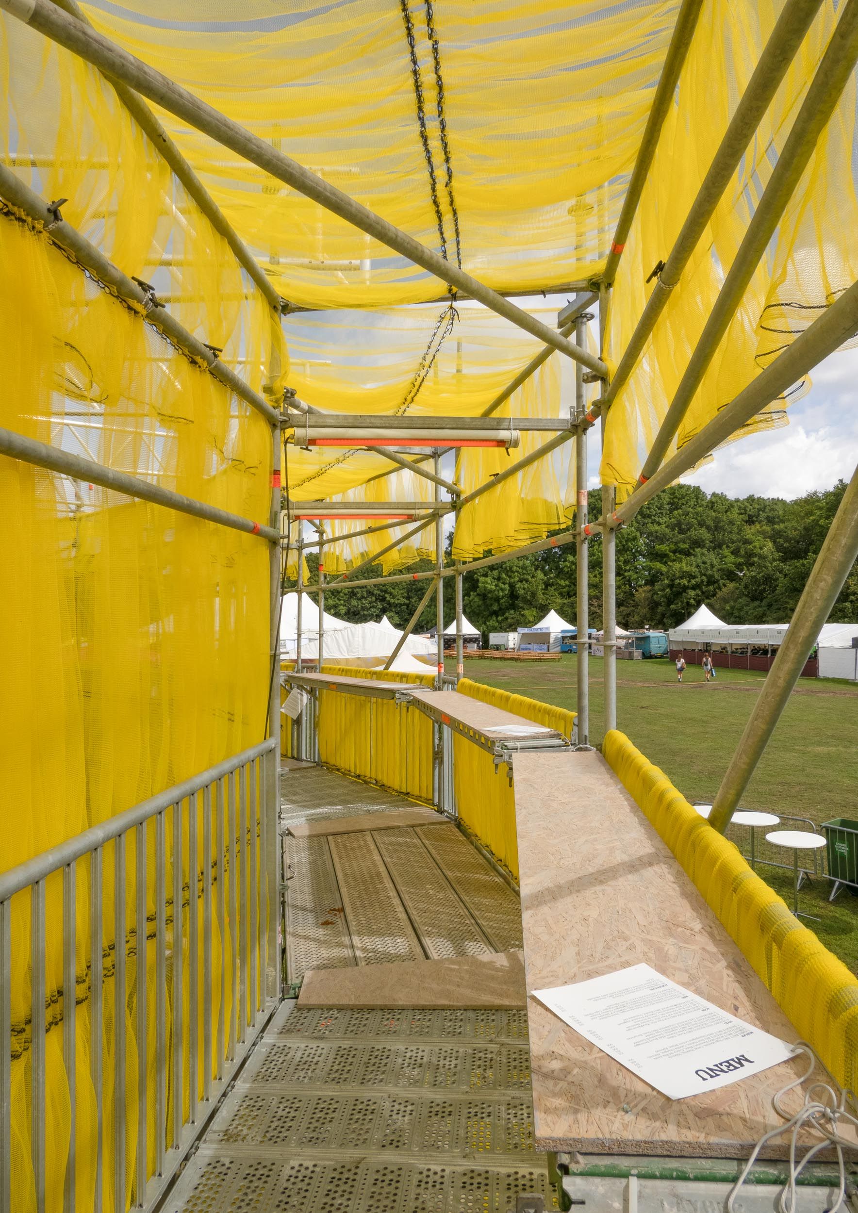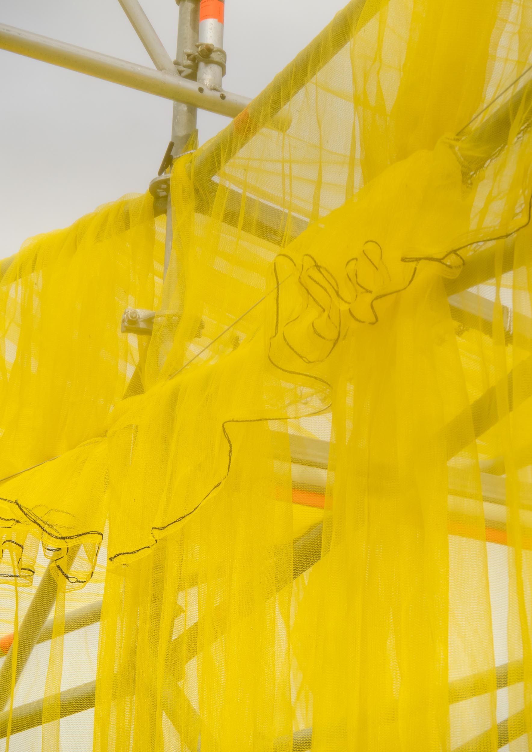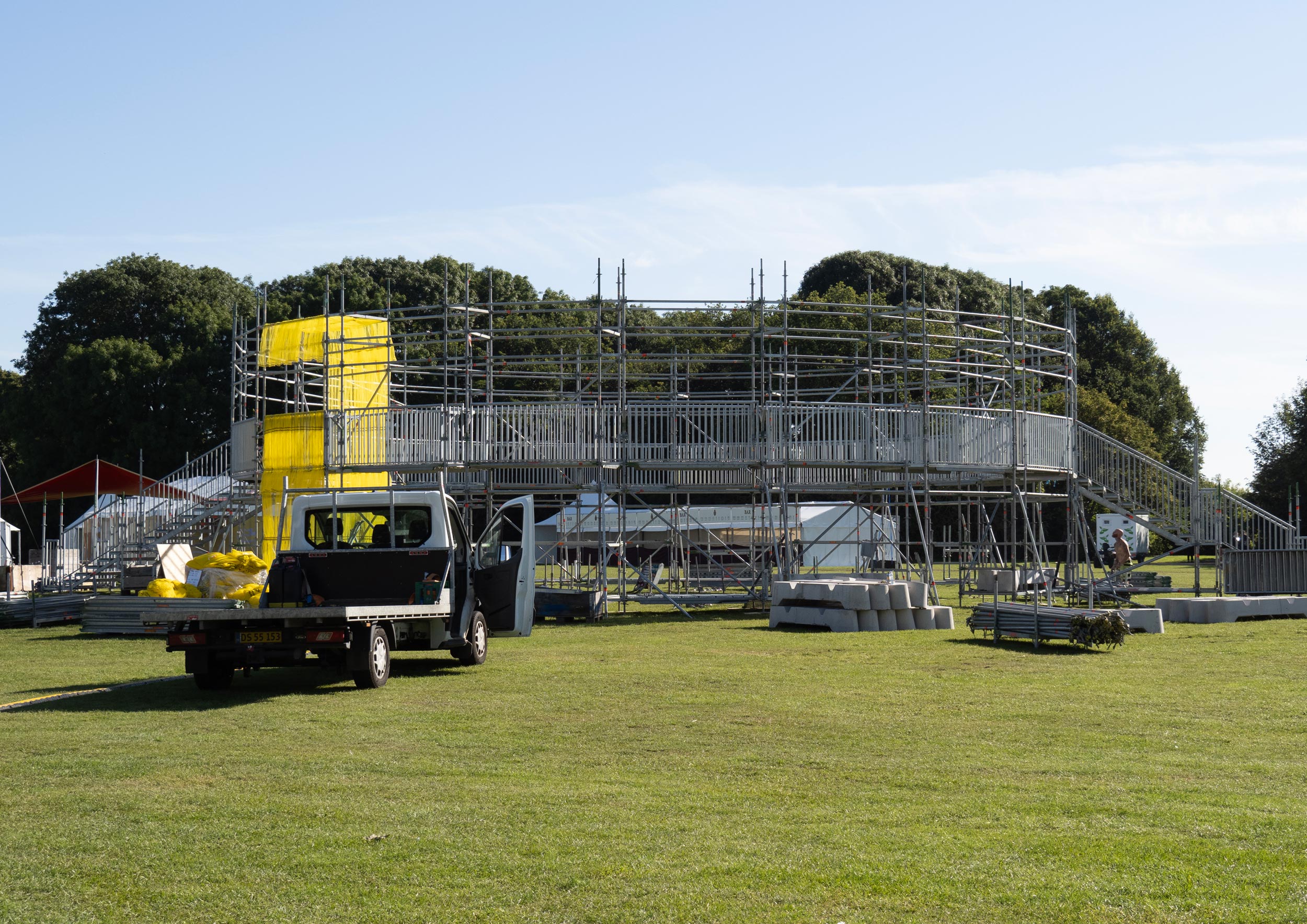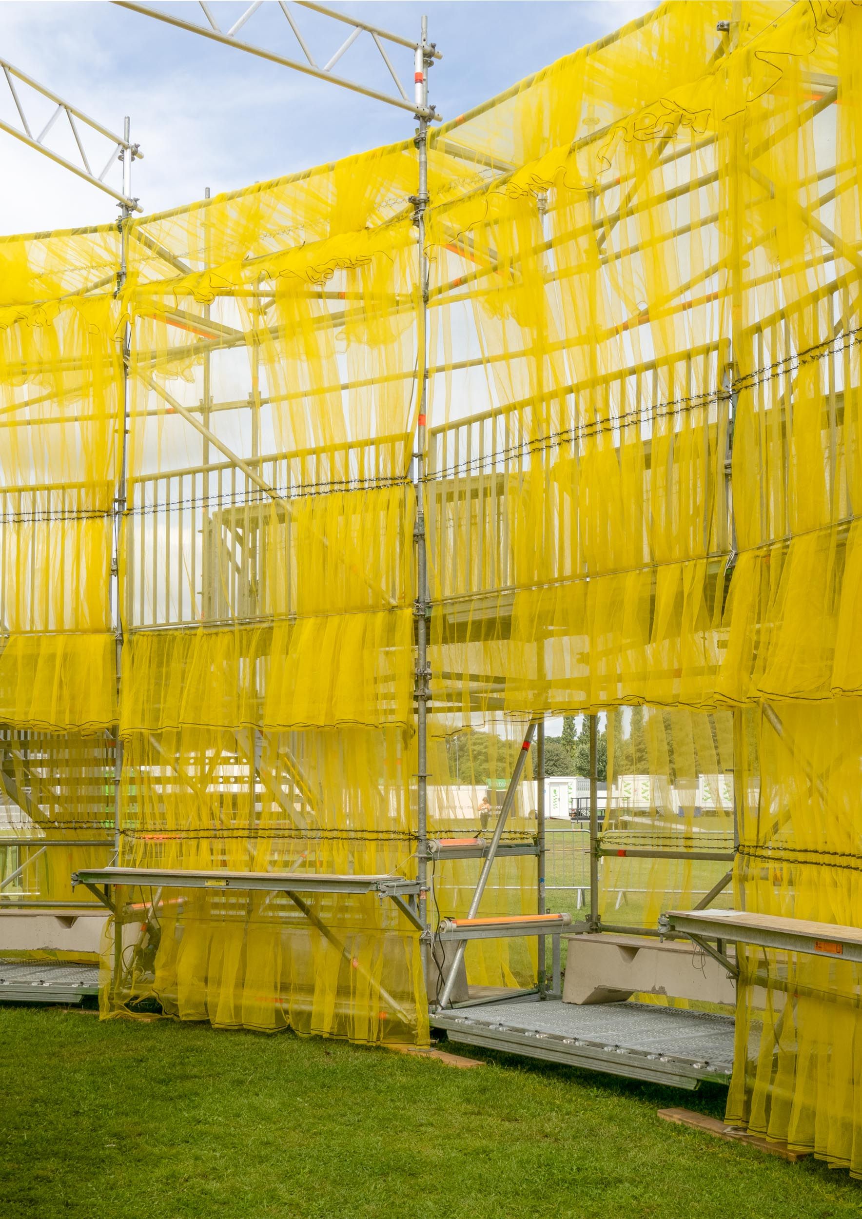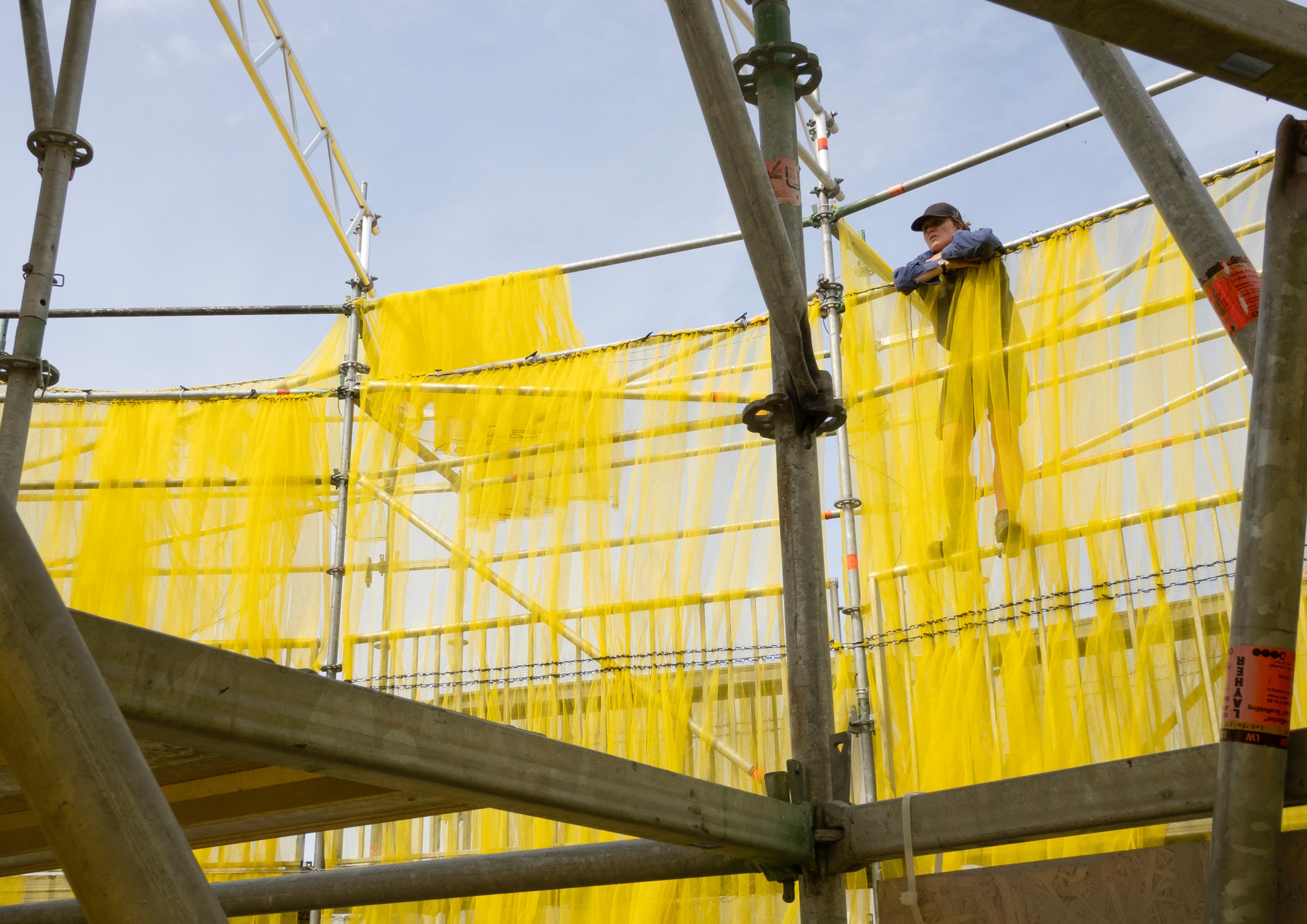 Solen is a pavilion designed as the landmark for this year’s Syd for Solen festival — a physical object for navigation, gathering, and sensation. Drawing direct inspiration from the sun, the design features a strong graphical aesthetic in shape and color softened through the strategic use of textiles and natural light. The pavilion is composed of scaffolding, which, by nature, is a circular and temporary system that allows for disassembly and repurpose. This makes the design reusable for the year’s to come, reinforcing our commitment to minimizing waste. The scaffolding system is known for its graphical lines and slender yet voluminous metal structure. The pavilion’s industrial framework is contrasted with the draping of mesh-like scaffolding textile, which plays with the concept of translucency. This layering of textiles introduces multiple shades of color, creating a lively visual experience. The circle, a simple yet potent symbol, anchors the pavilion’s design, welcoming visitors from all angles.