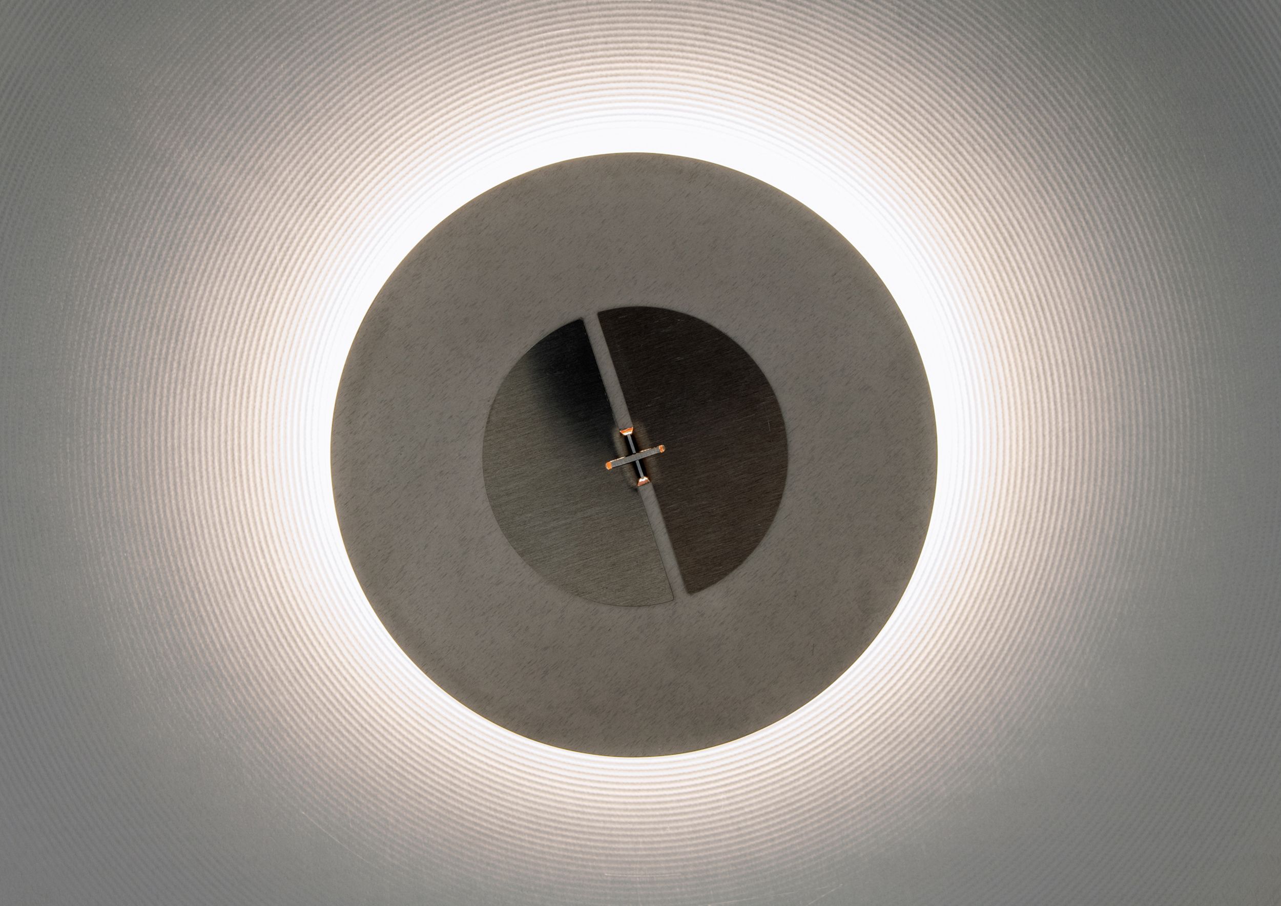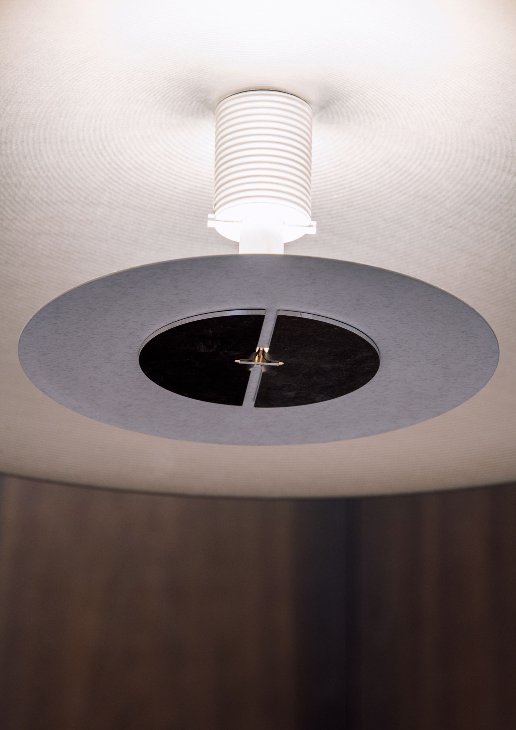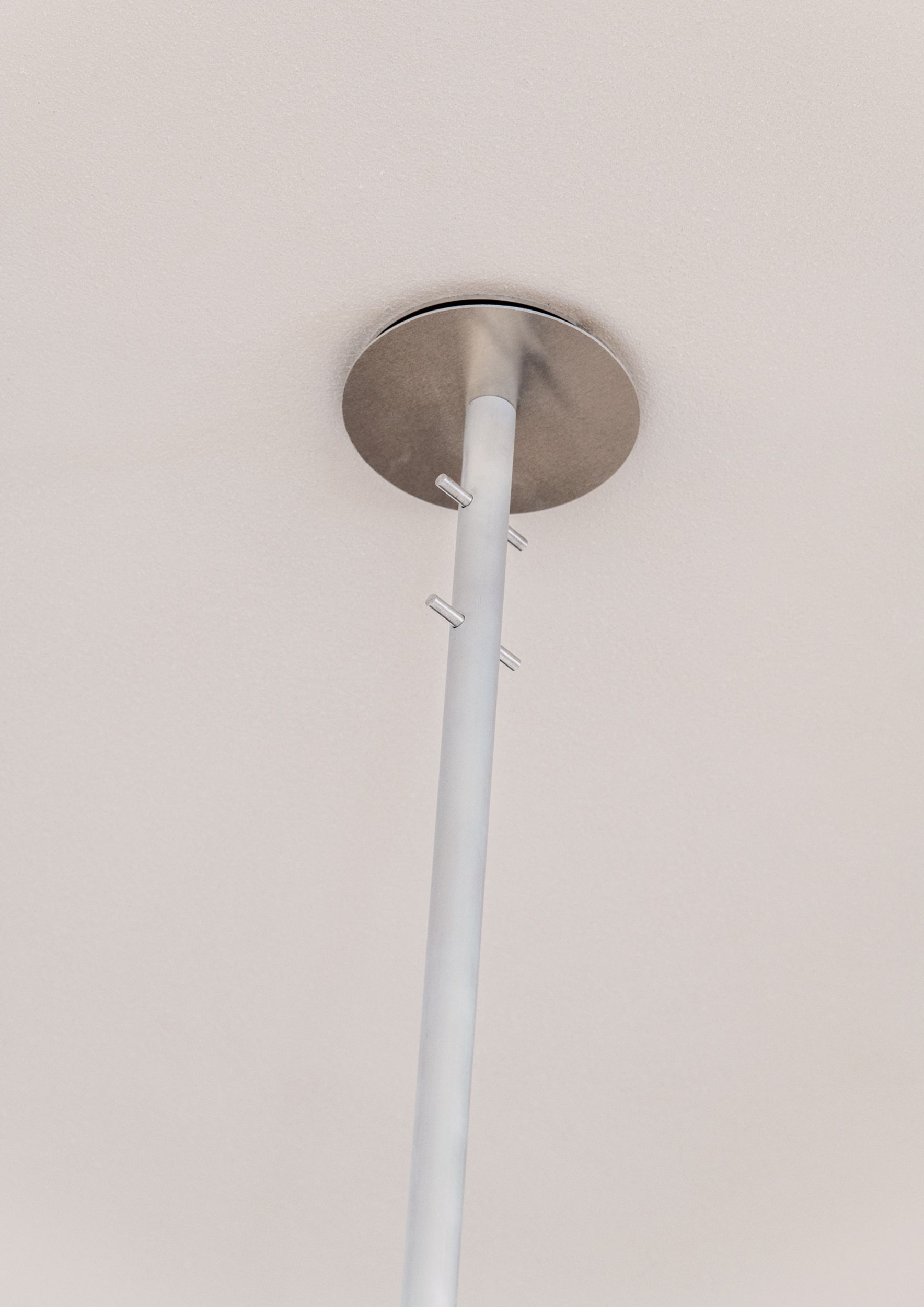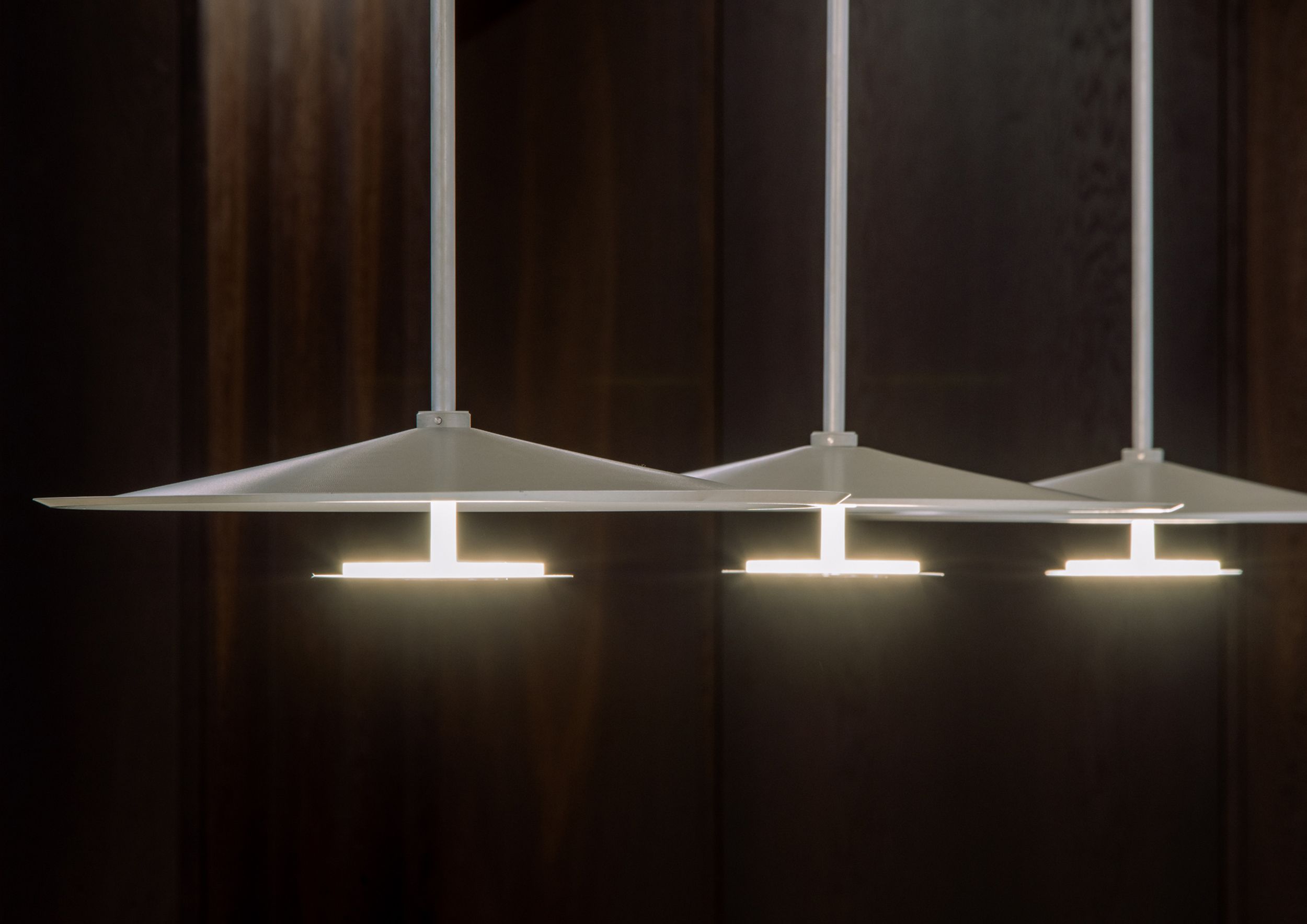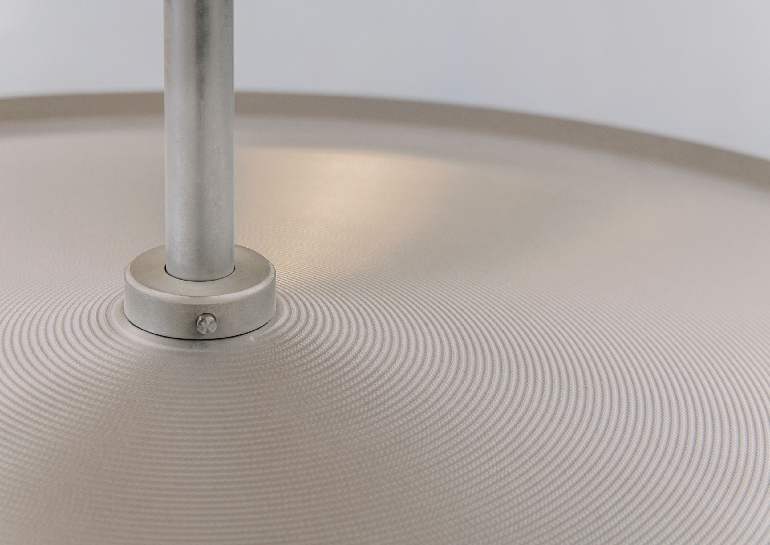 The Reflector distributes light with its intricate CNC-formed anodized aluminum surface. Its construction is simply held in tension by 4 horizontal dowels, dismissing the need for bolts or adhesive. The ø600mm reflector shell emerged from ongoing research into Single Point Incremental Forming (SPIF), which combines the intelligence from traditional metal forming with the precision of CNC machining. The light source consists of an LED print plate that is softened and dispersed by a custom-milled diffuser. The light is then directed onto a solid lathe-turned ø40mm cylinder which reflects and holds the light while serving the function of a weight that stabilizes the lightweight lamp. Reflector lamps are tailored to the context and, as a result, are priced on request.
