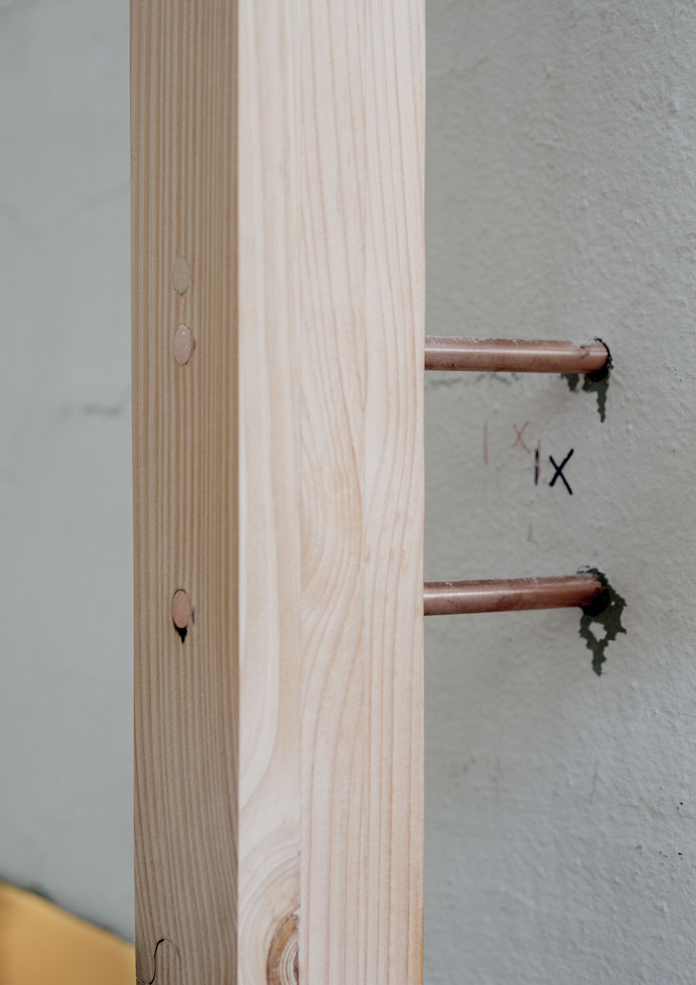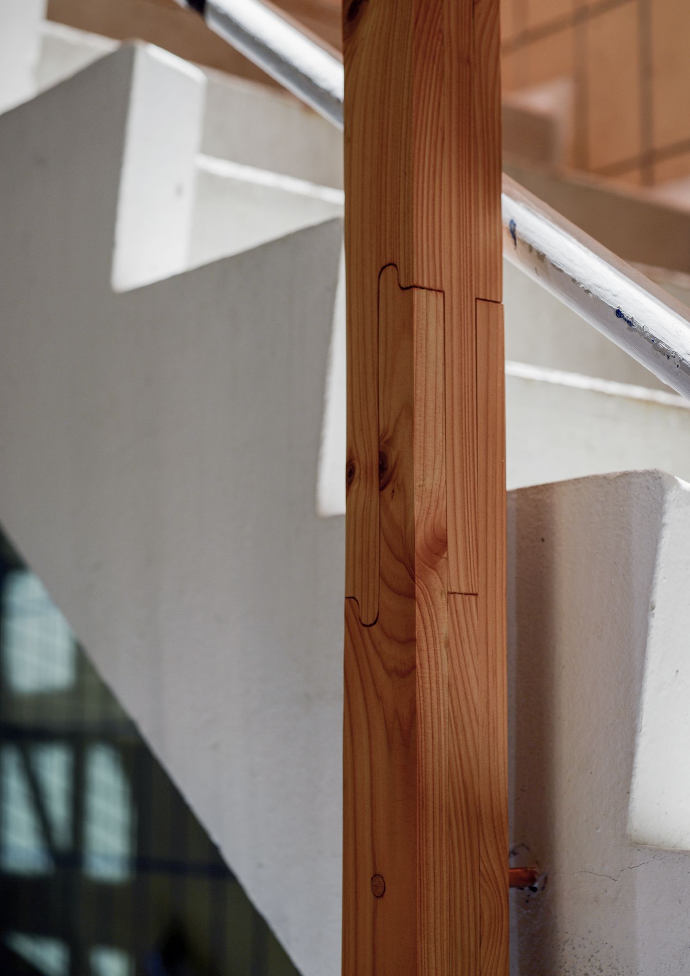 During our four-month residency at SPACE10 in Copenhagen in the fall of 2016, we researched the potential relationship between traditional craftsmanship and digital fabrication through a set of 1:1 prototypes. We used digital fabrication, specifically CNC milling, to make contemporary translations of three different traditional craft techniques. The aim was to preserve these techniques by adapting them to contemporary production methods, while also imbuing digital fabrication with time-proven qualities. Here, we began developing a digitally-fabricated architecture with an atmospheric, human, and timeless quality. Our residency culminated in a permanent architectural installation as well as an evening of lectures. For the final installation, we chose the stairway at SPACE10 as the context for our final set of 3 digitally-fabricated spatial prototypes. One prototype, a Douglas Fir column extending through the center of the stairway through all 3 levels of the building, translates a traditional Japanese Tsugi joint into simple curves for CNC milling. It also makes those who walk up the stairs appreciate the scale of the space. The next prototype translates traditional chasing and hammering techniques for soft metals into single-point-incremental-forming, to create a copper reflector to create a warm lighting atmosphere in the evenings. Here, the CNC mill is used to push and form over a mold, rather than to cut. The third prototype makes use of the subtle precision of the CNC machine to translate classical plaster ornamentation into a light-catching wall with an optical effect that unexpectedly creates subtly curved shadows when hit with direct light. This wall brings attention to and emphasizes the changing quality of the light over the course of the day.