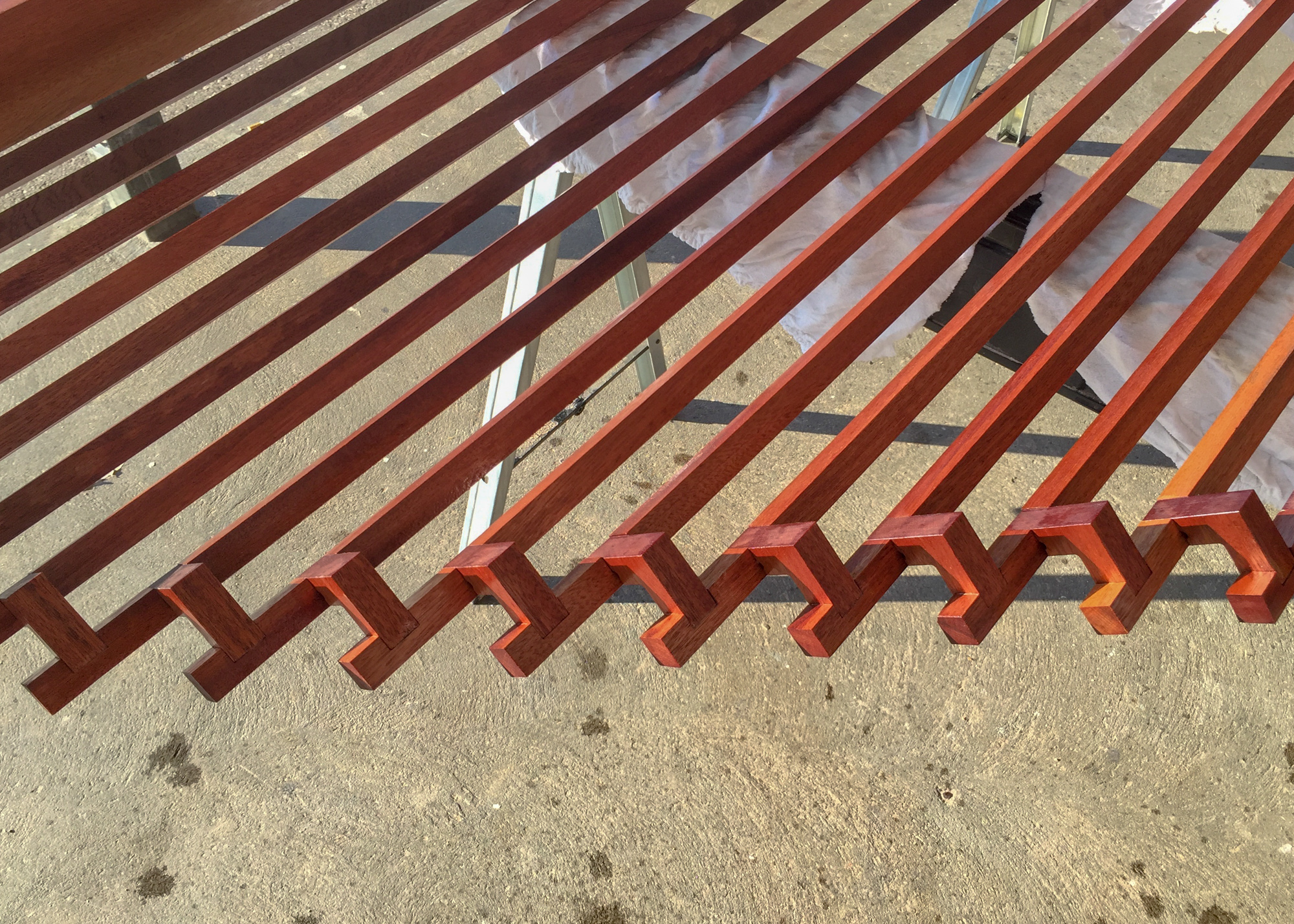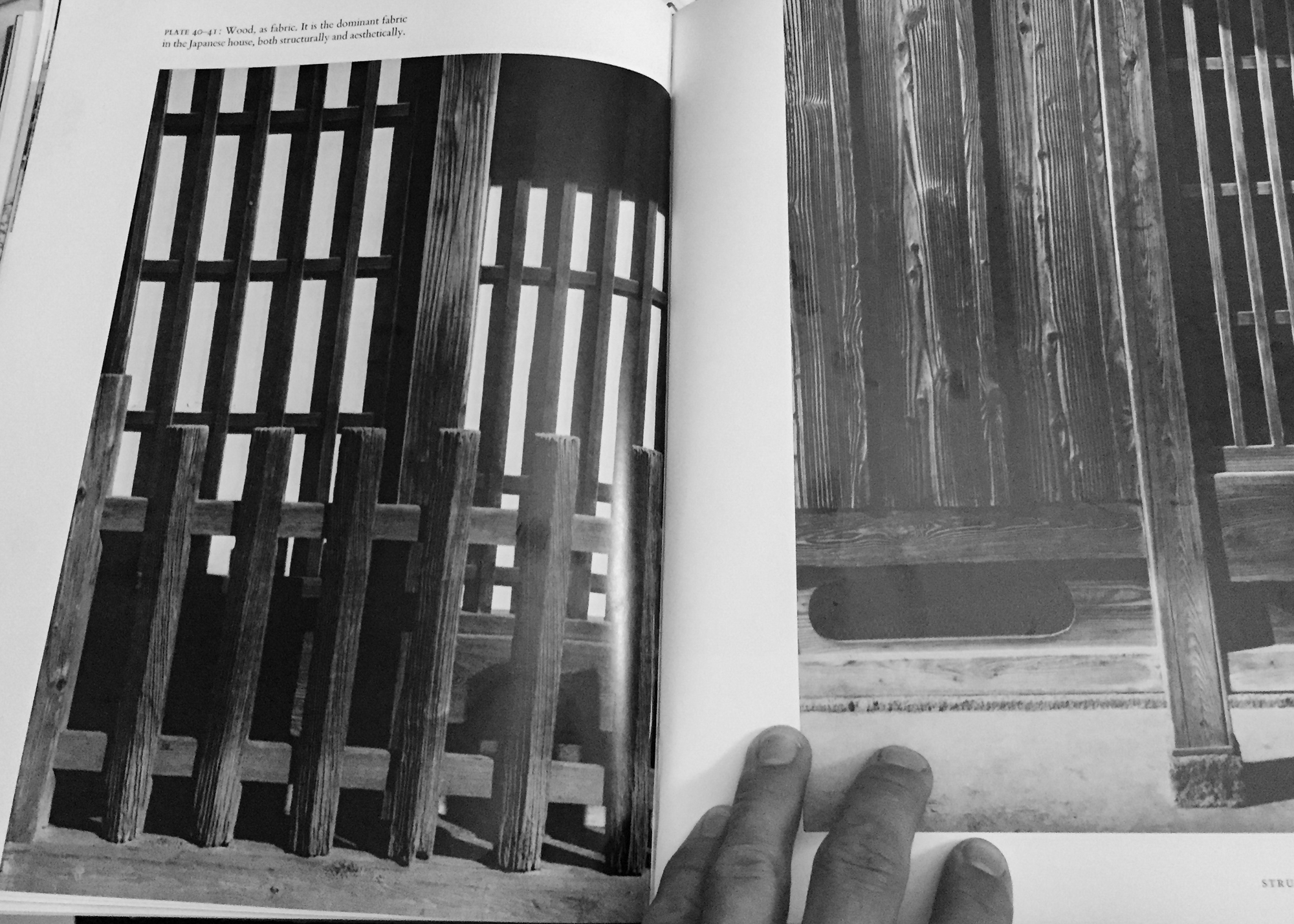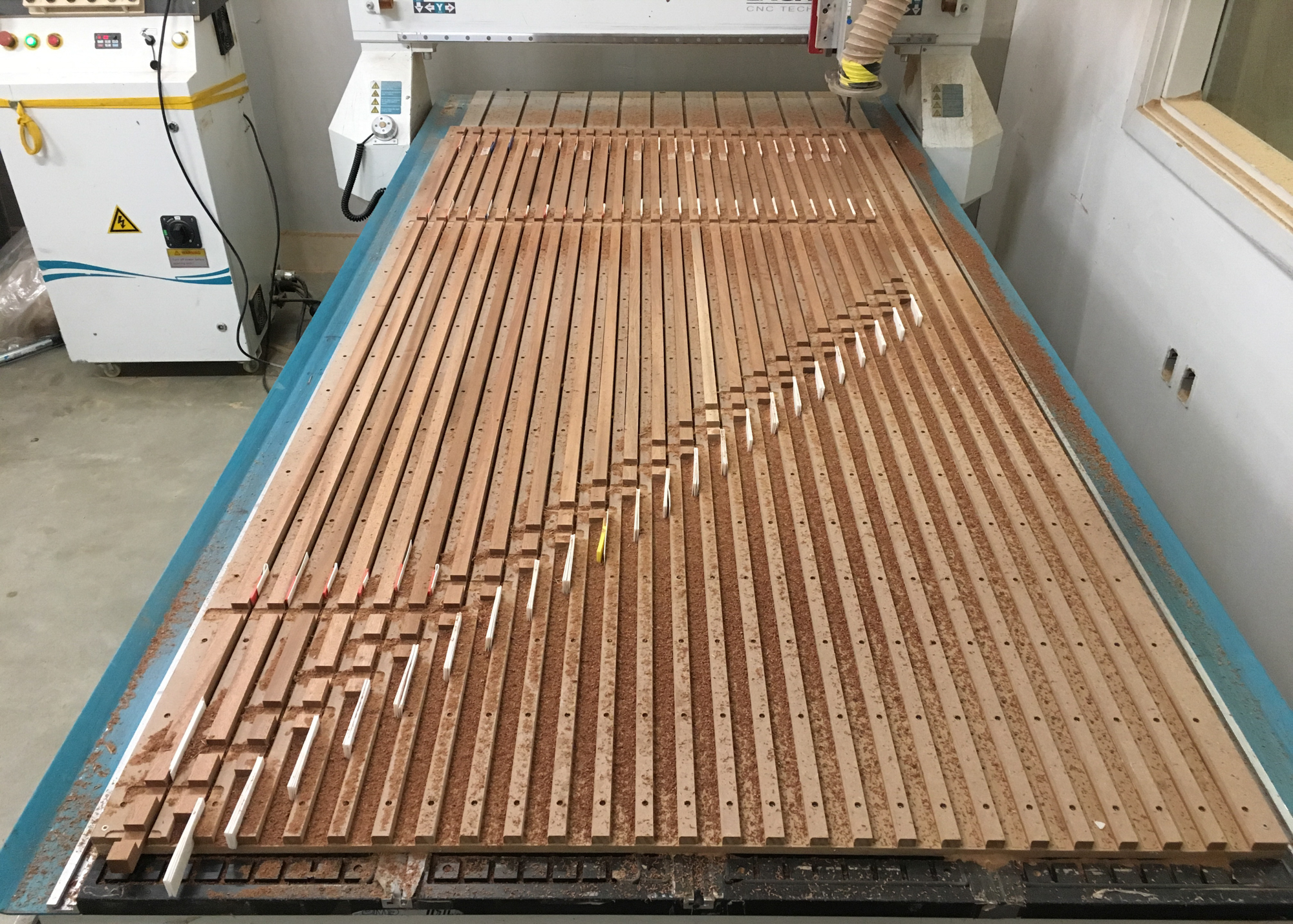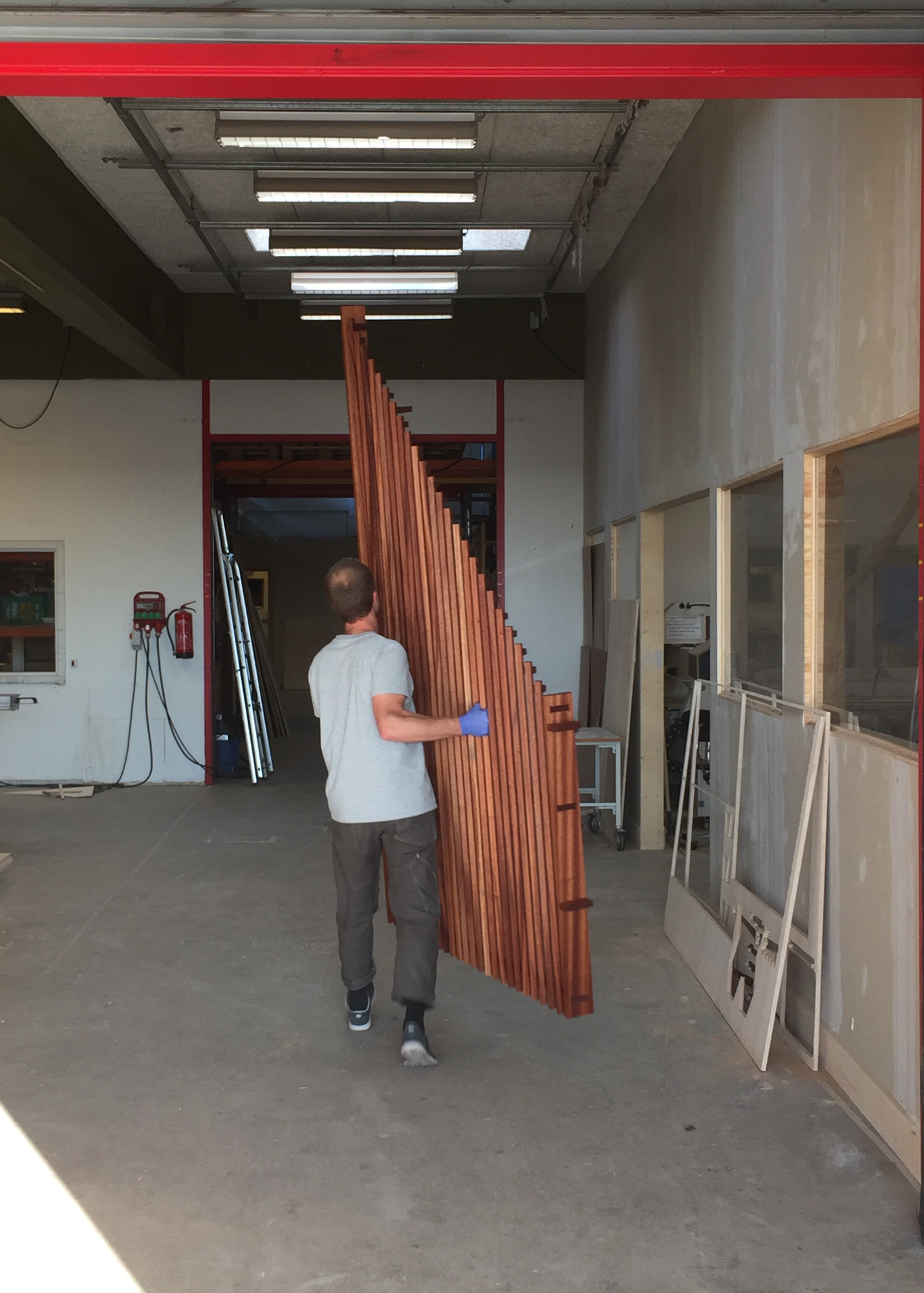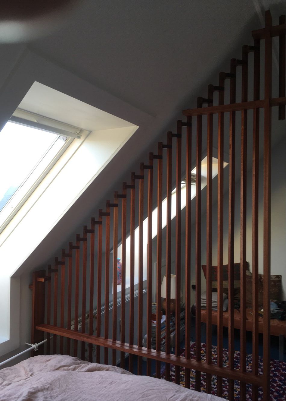 A space-dividing screen whose vertical members have been rotated by 45 degrees to better catch the daylight entering through the windows. The screen is more transparent when viewed from the front and more opaque when viewed from the side.