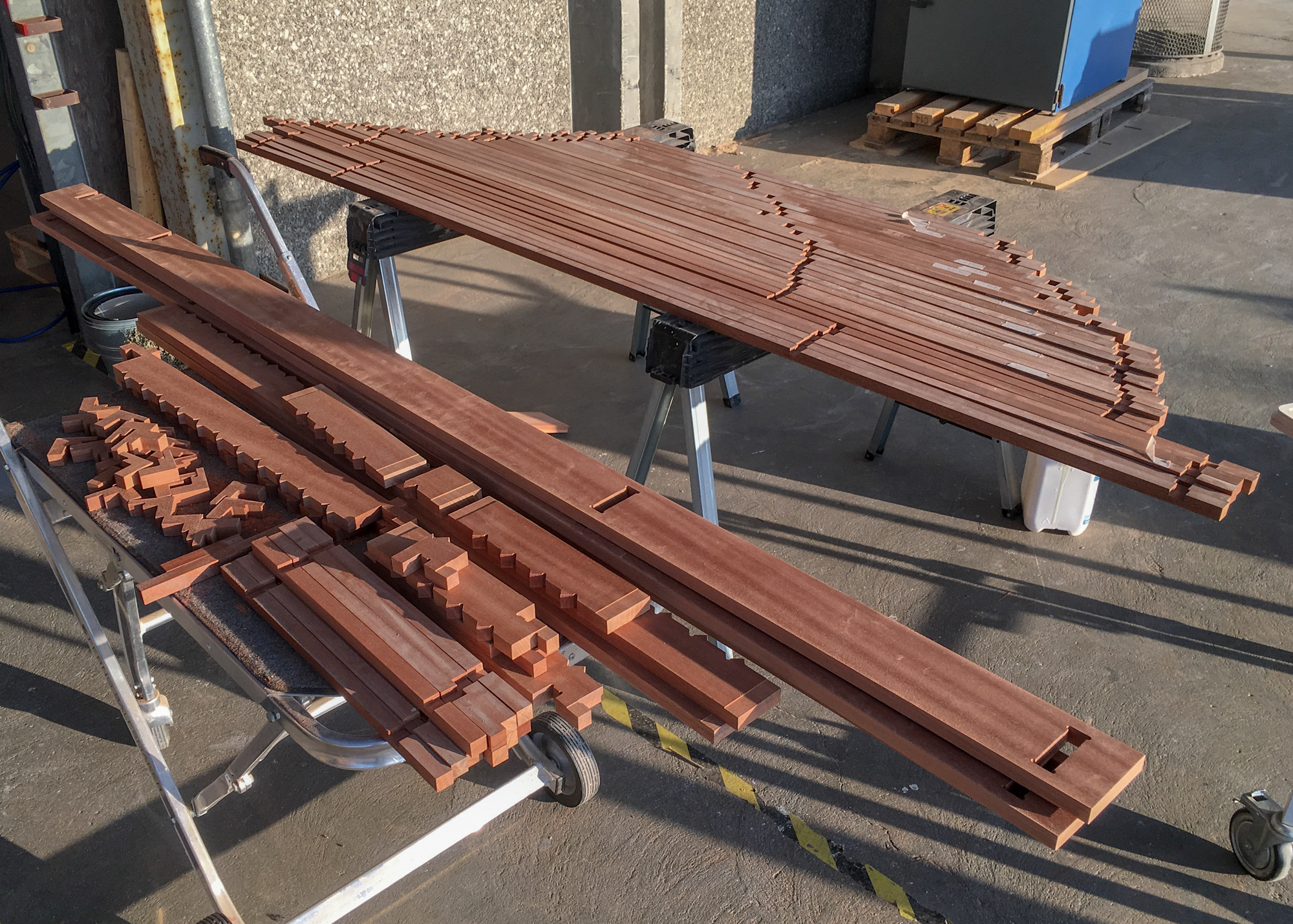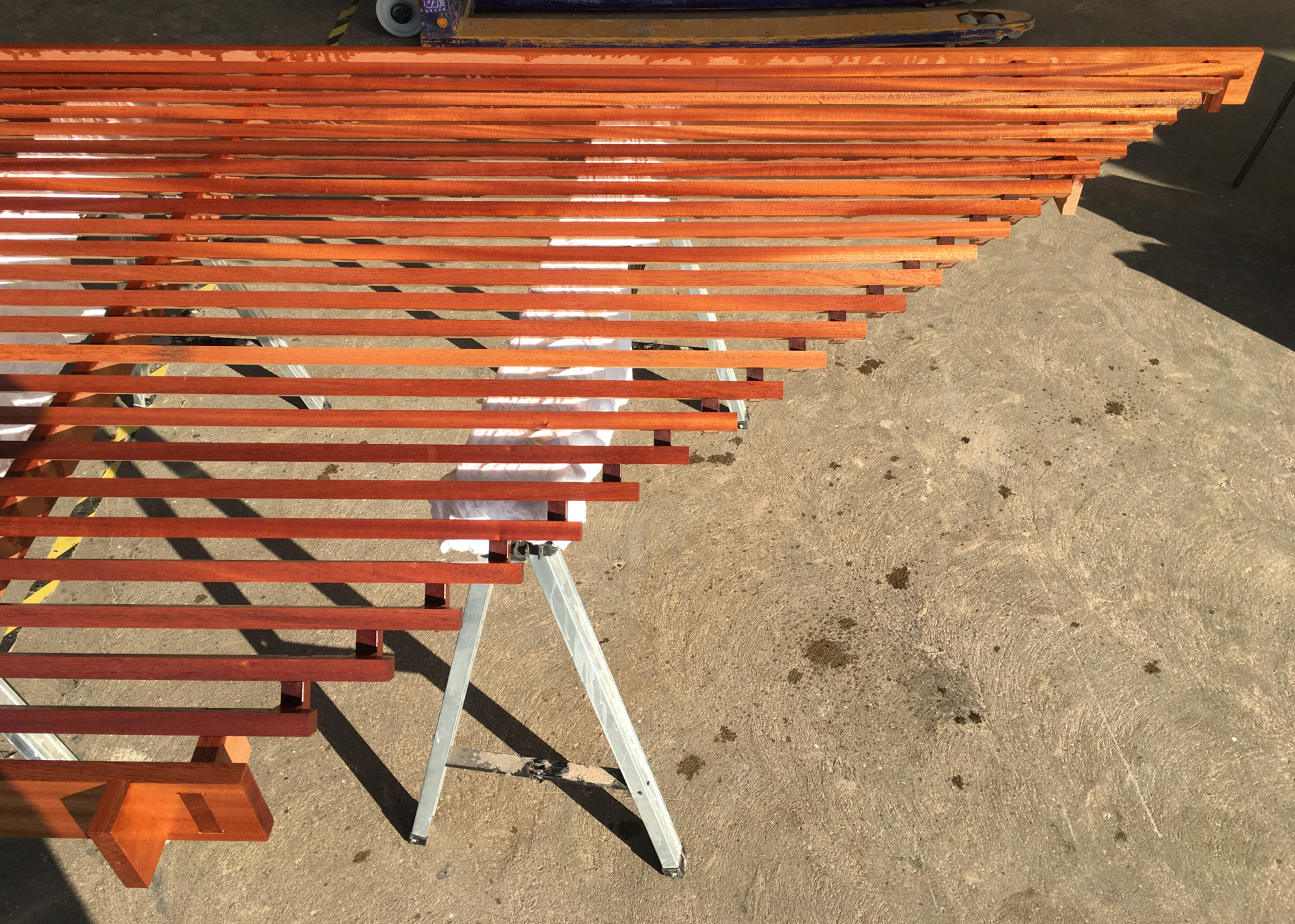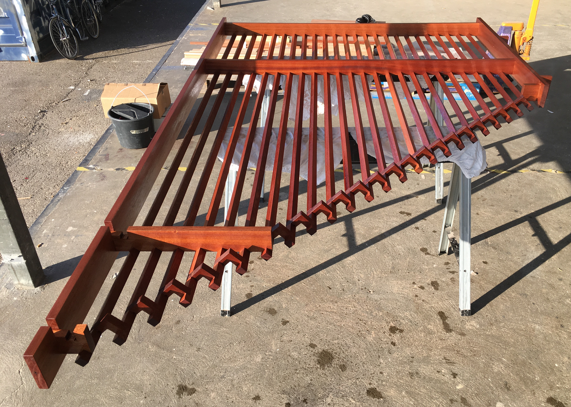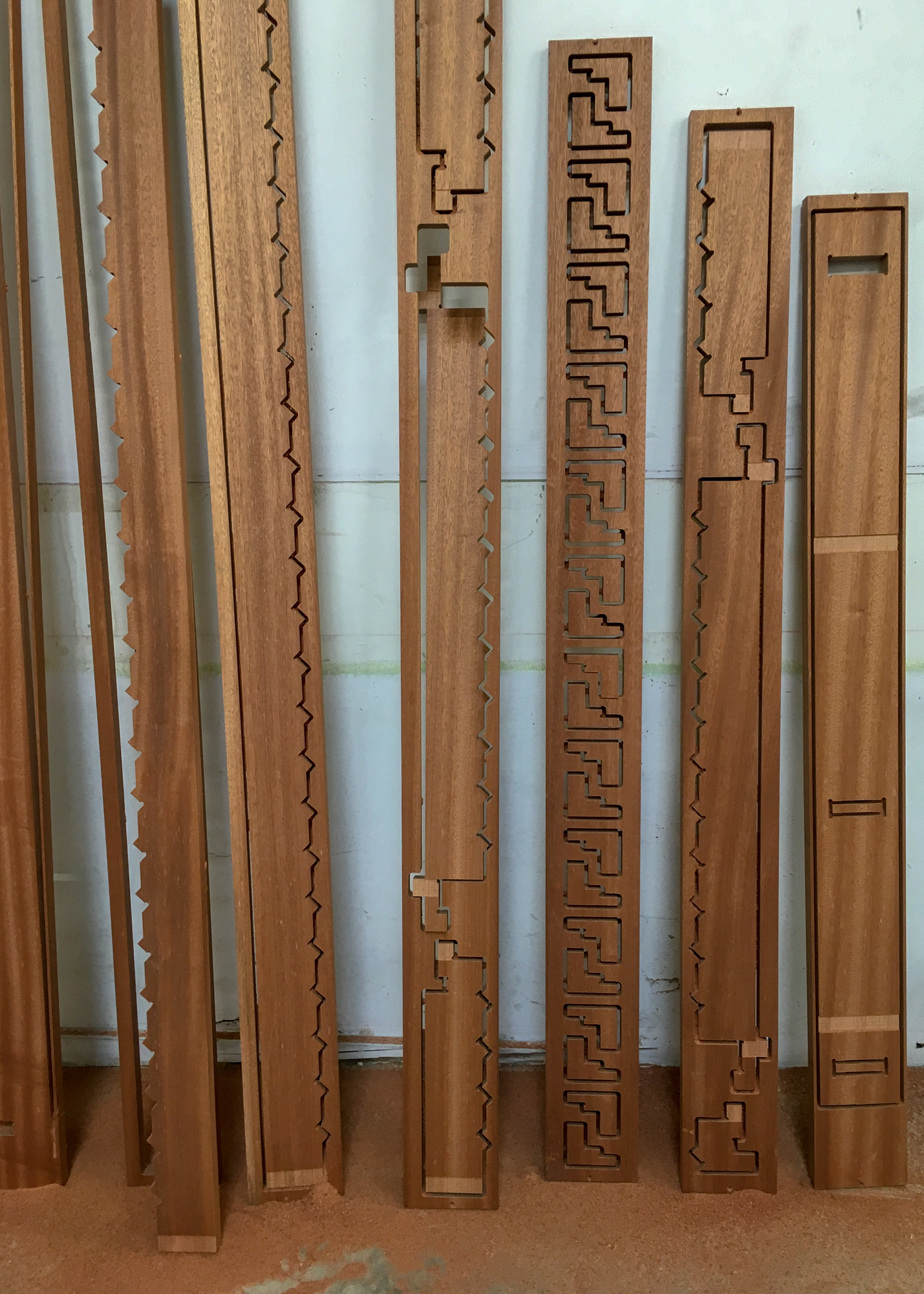 A space-dividing screen whose vertical members have been rotated by 45 degrees to better catch the daylight entering through the windows. The screen is more transparent when viewed from the front and more opaque when viewed from the side.