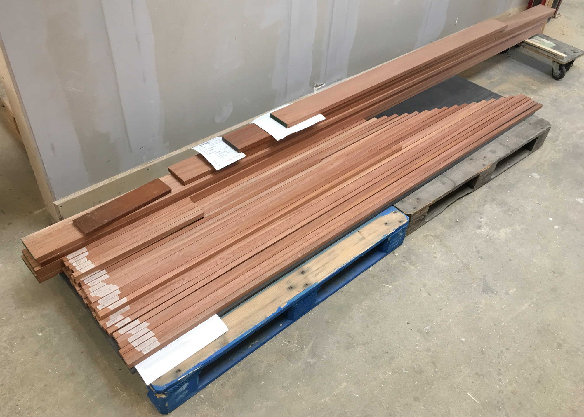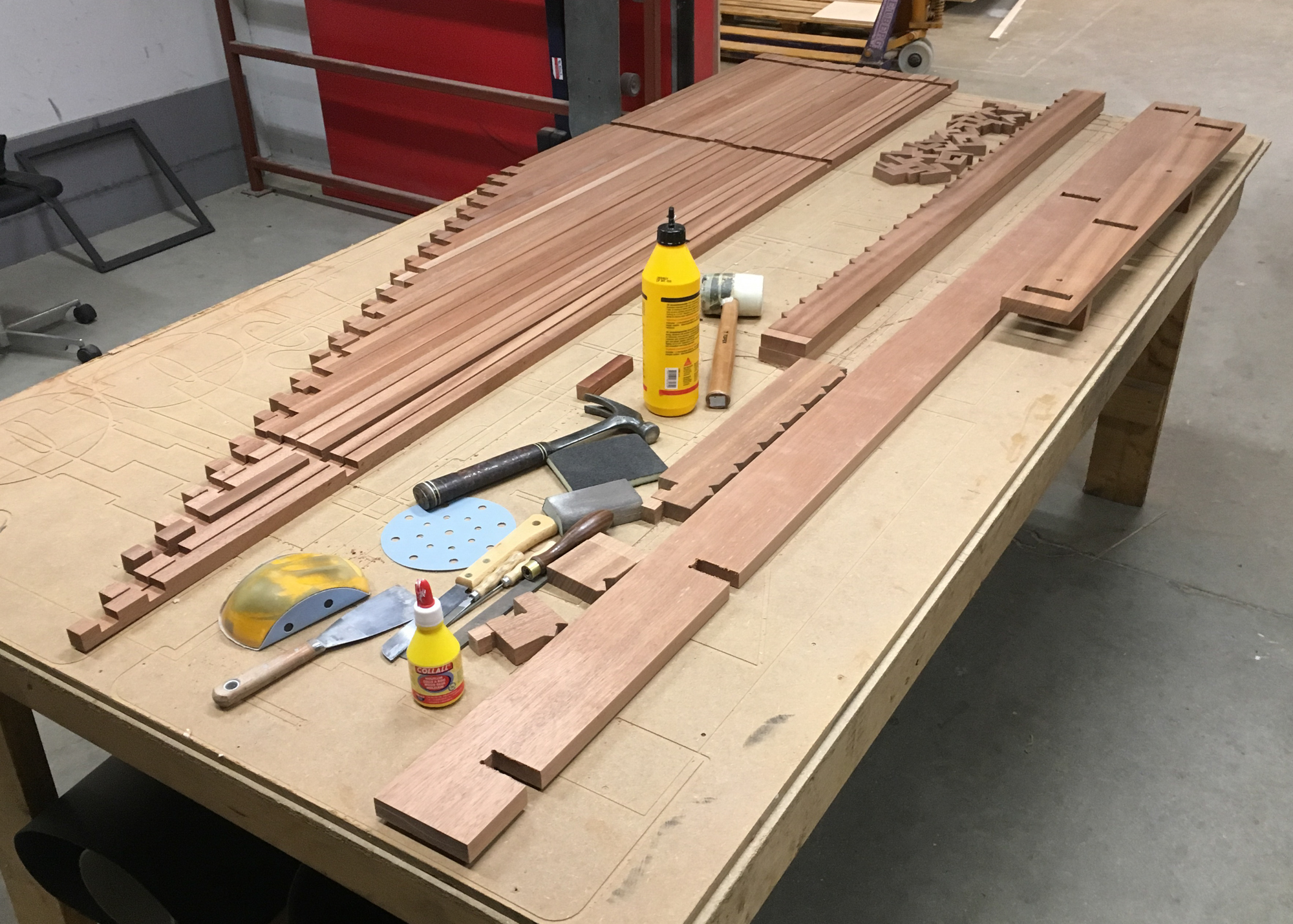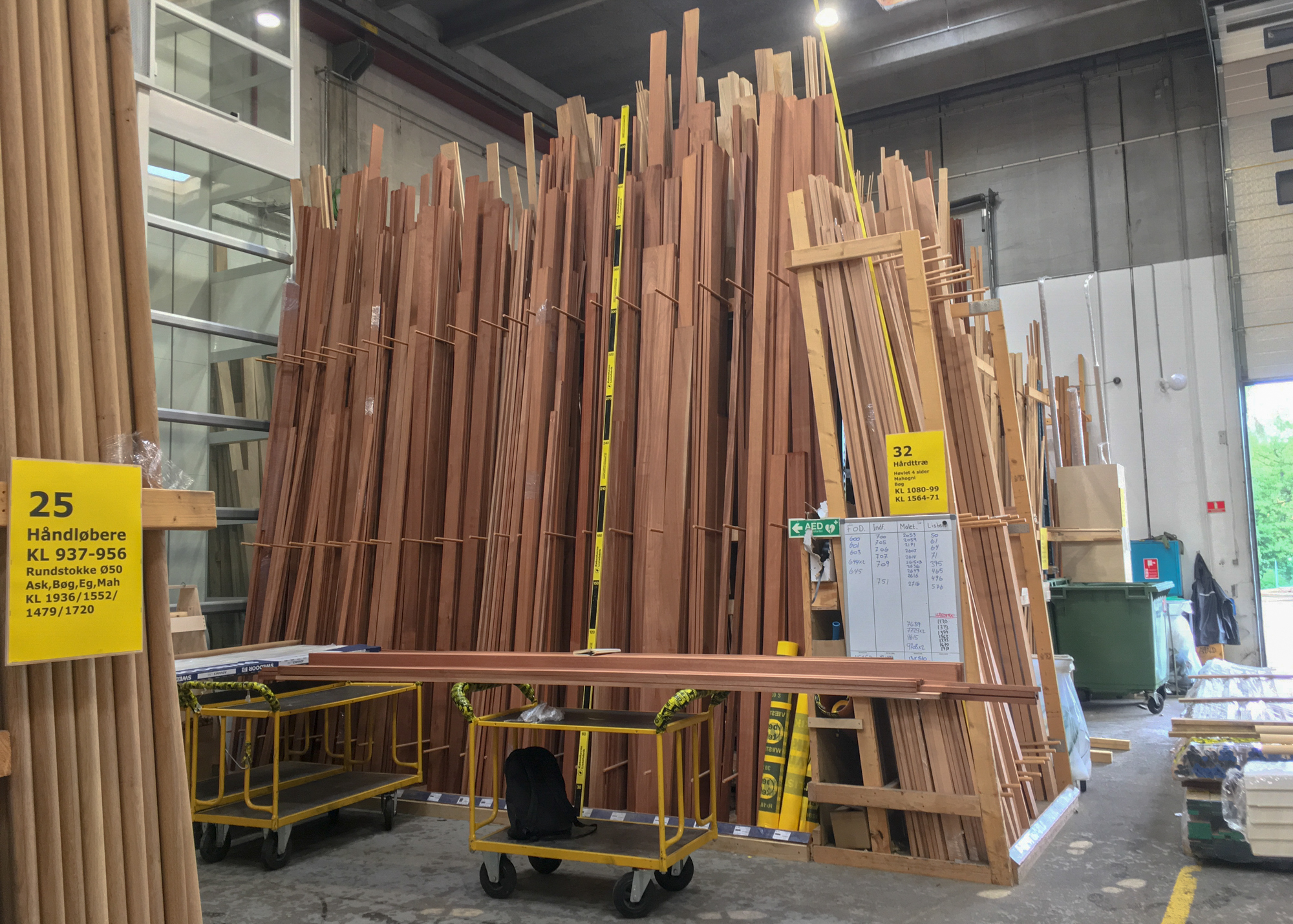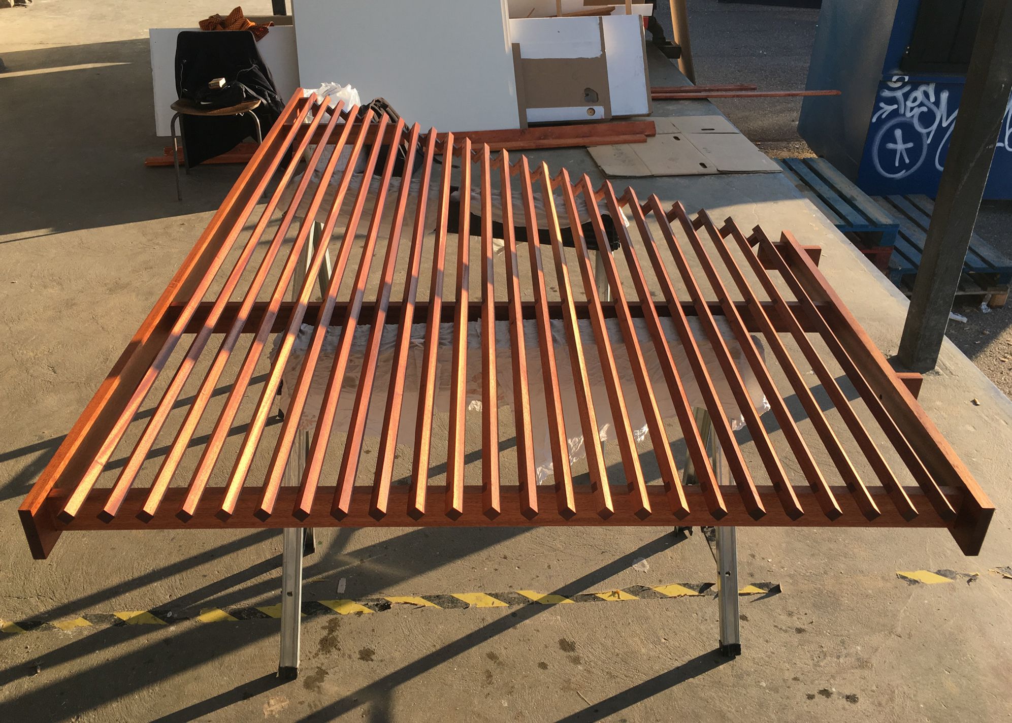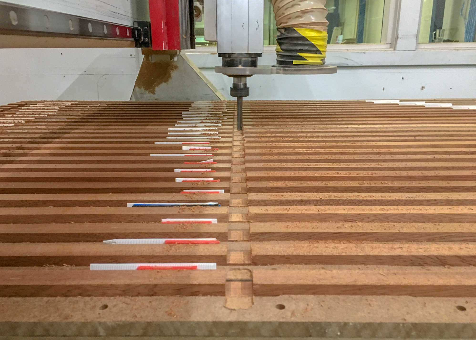 A space-dividing screen whose vertical members have been rotated by 45 degrees to better catch the daylight entering through the windows. The screen is more transparent when viewed from the front and more opaque when viewed from the side.