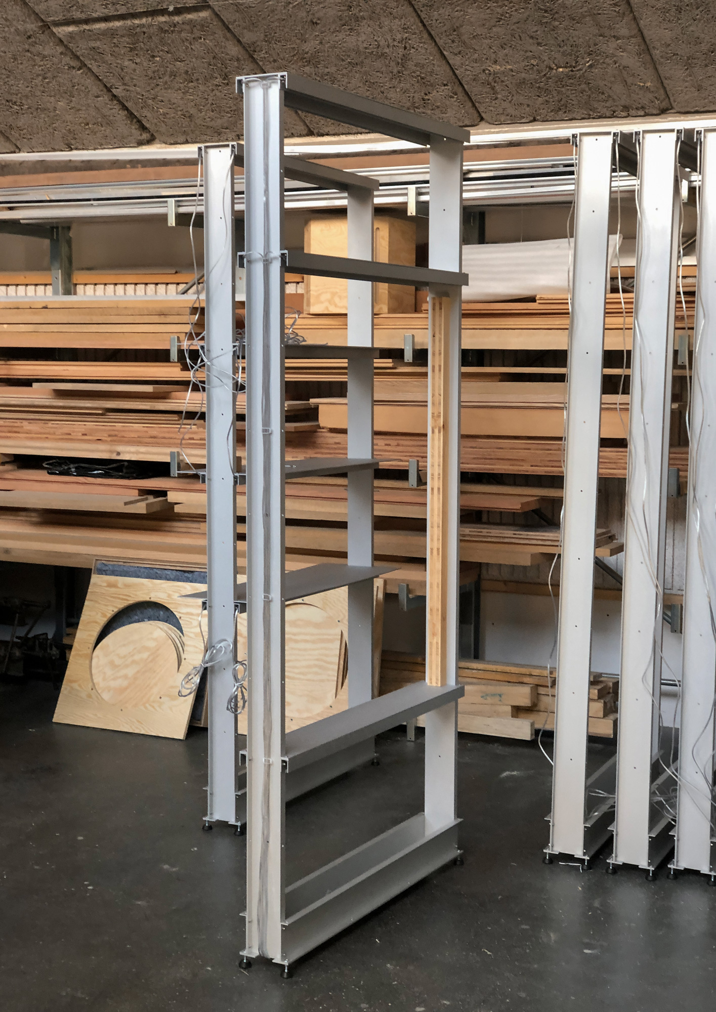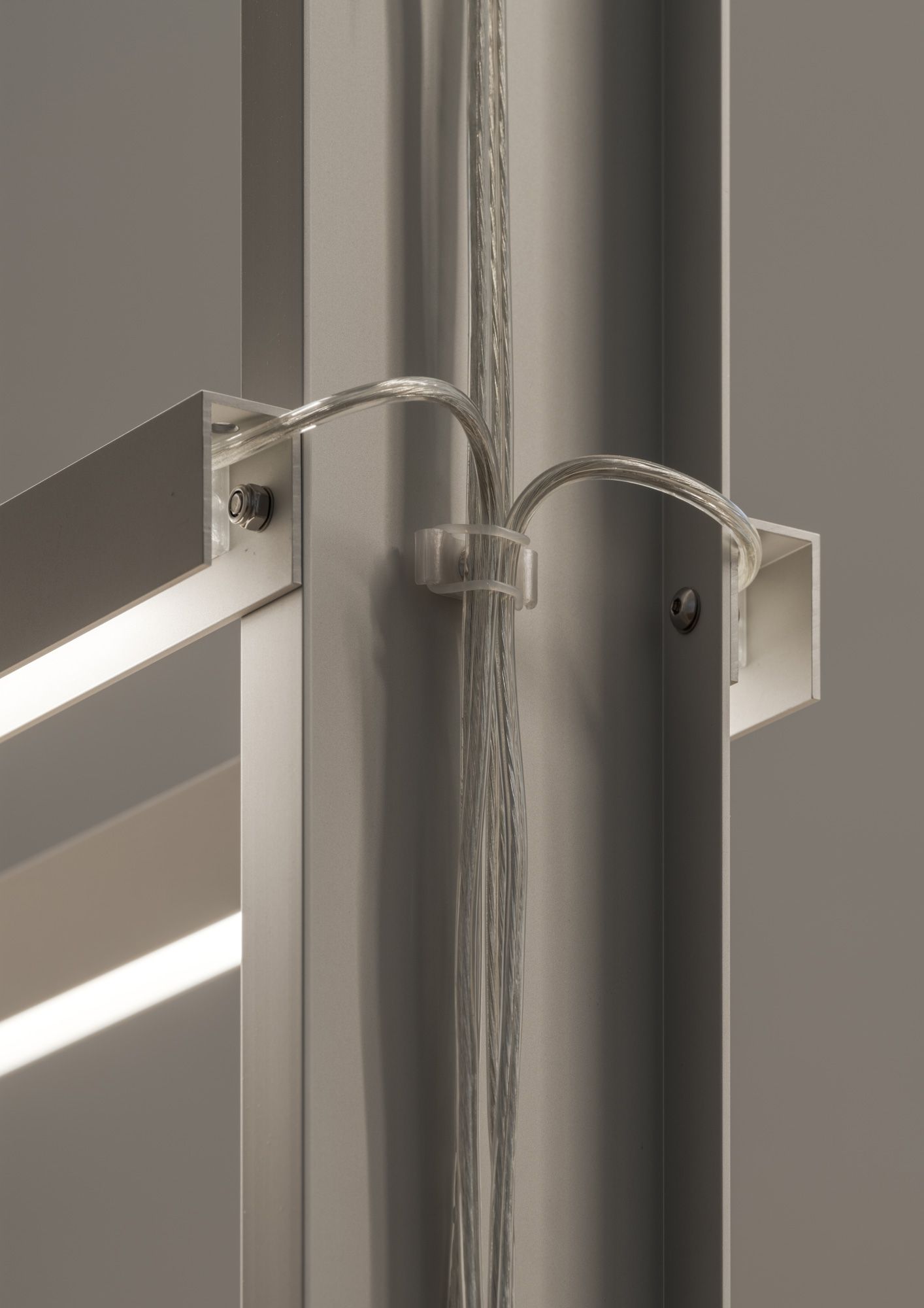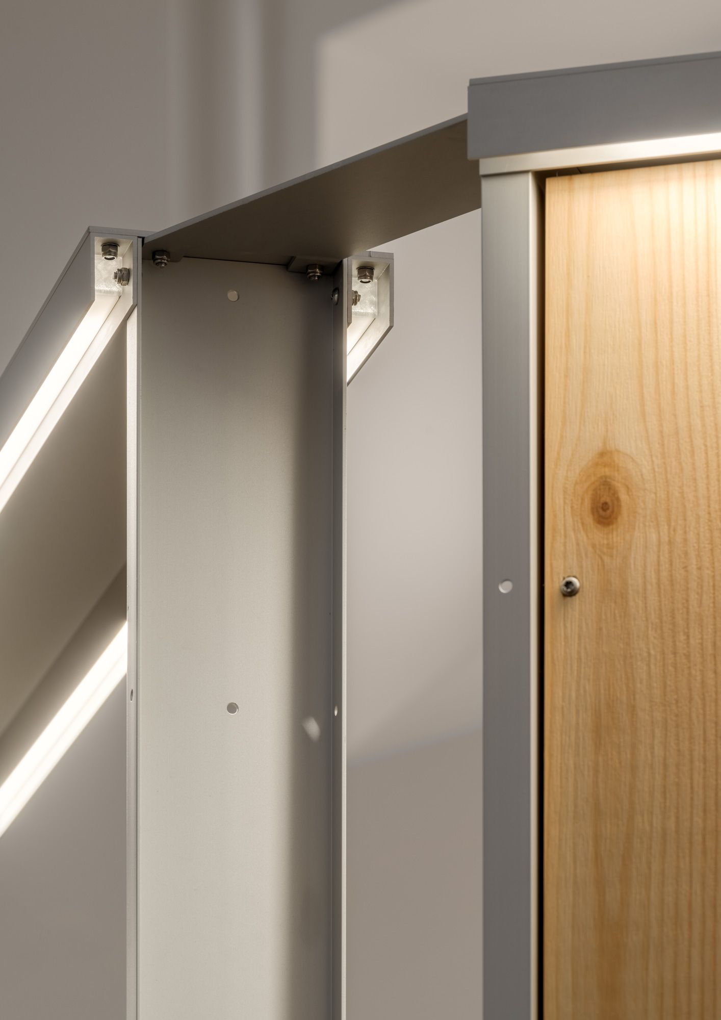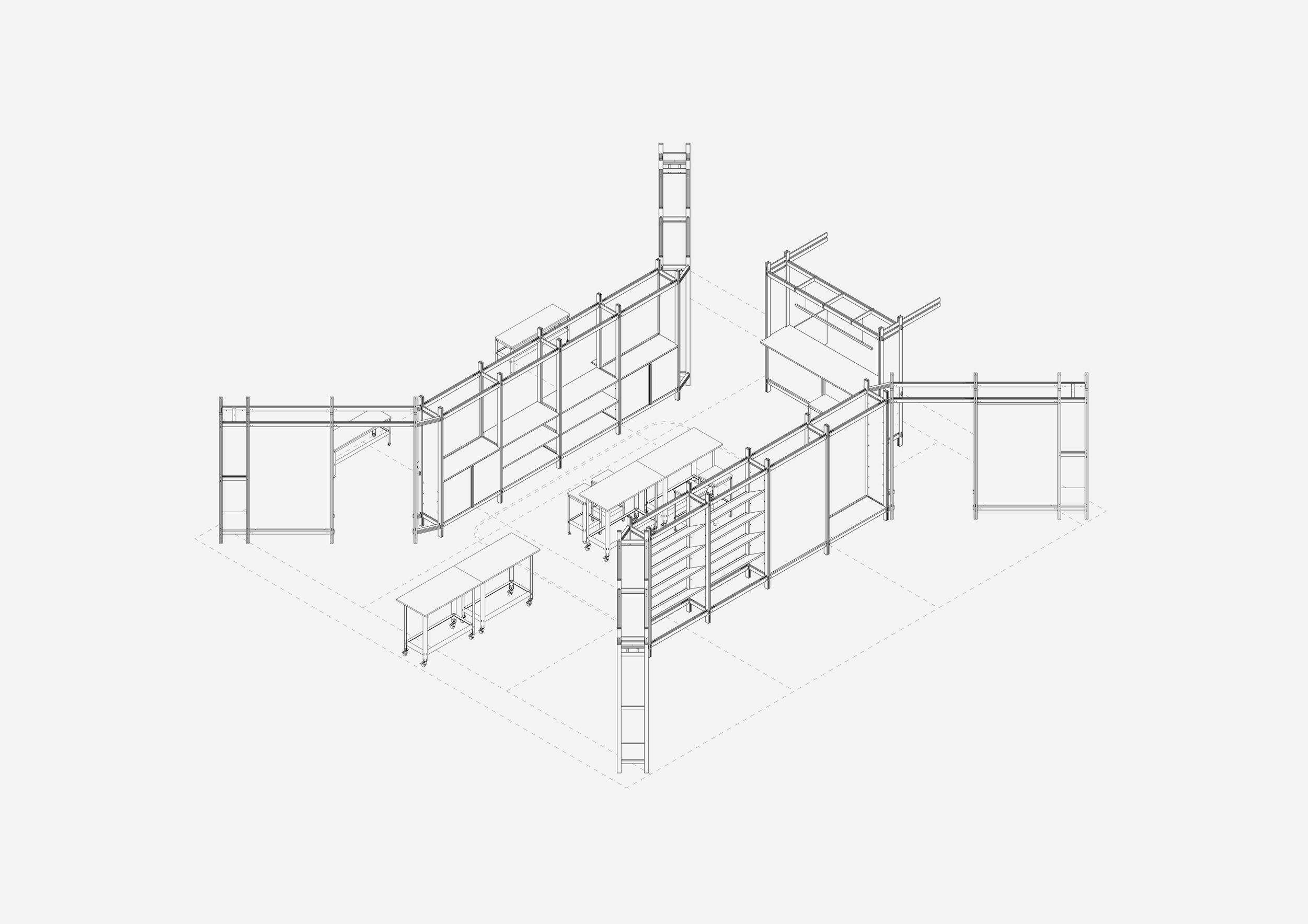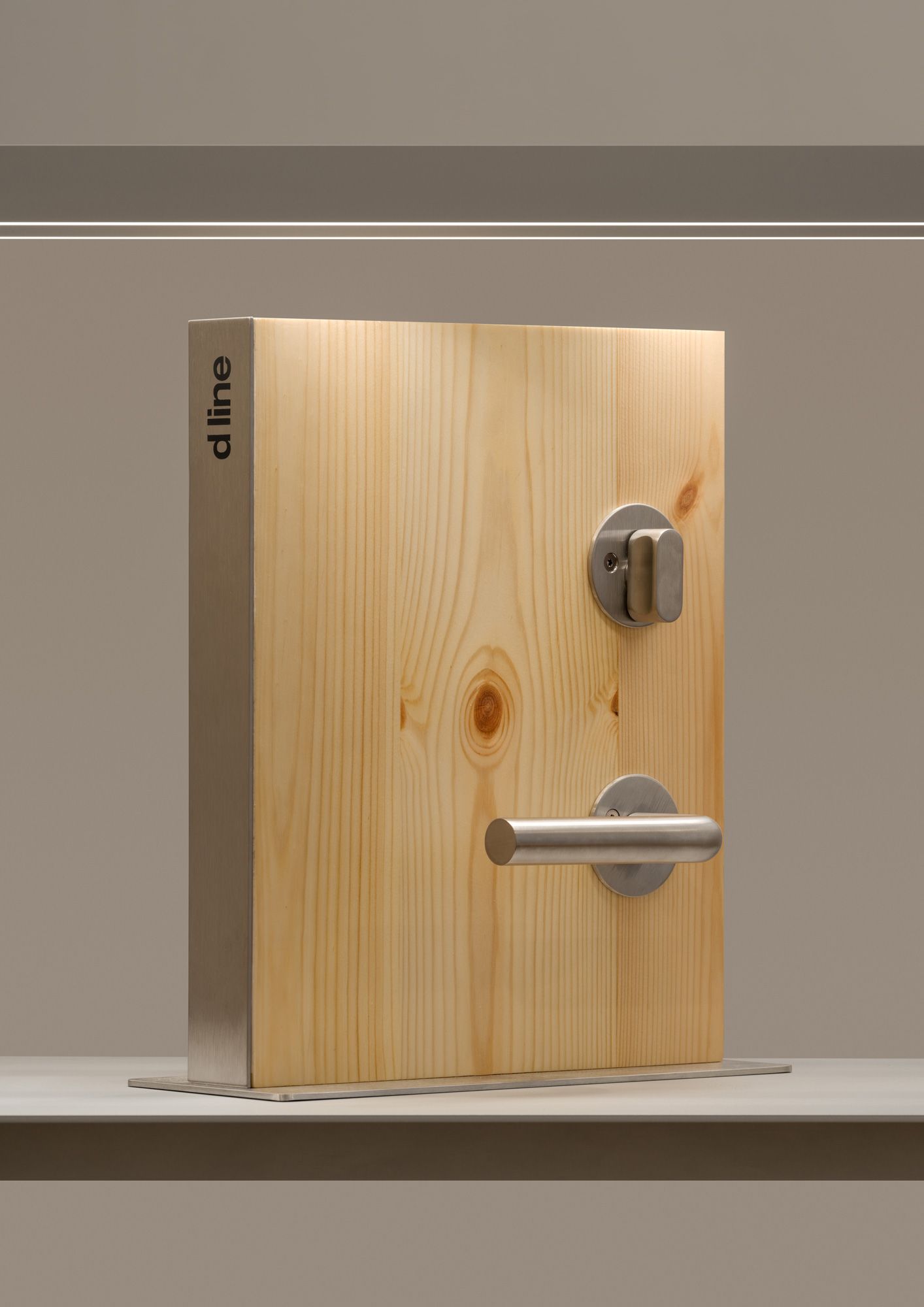 Aligning with d line’s principles of timeless and long-lasting design, Archival Studies have developed a new display system for the brand’s range of architectural hardware products. The display system comprises modules, that are composed of four different elements: the slim aluminium frames, seemingly floating aluminium shelves, interchangeable wooden panels and the elegant strips of light, connecting and illuminating the system. Positioned at slight angles to one another, the thin modules support each other, becoming one spatial entity that can be experienced from all angles. By leaving one module open, adding a door to display d line’s iconic handles and integrating a wooden sink, the system invites visitors to playfully engage with both the exhibition environment and with the products on display. Developed to be taken apart and re-assembled for diverse exhibition environments, the modular system responds to the brands commitment to the reuse and refurbishment of materials. The display system is designed to guide visitors through a curated journey. From discovering brand values to exploring products within their context of use, every module serves a purpose. The result is a spatial experience that prioritises intuitiveness and accessibility, allowing visitors to experience d line’s commitment to design and craft first-hand.
