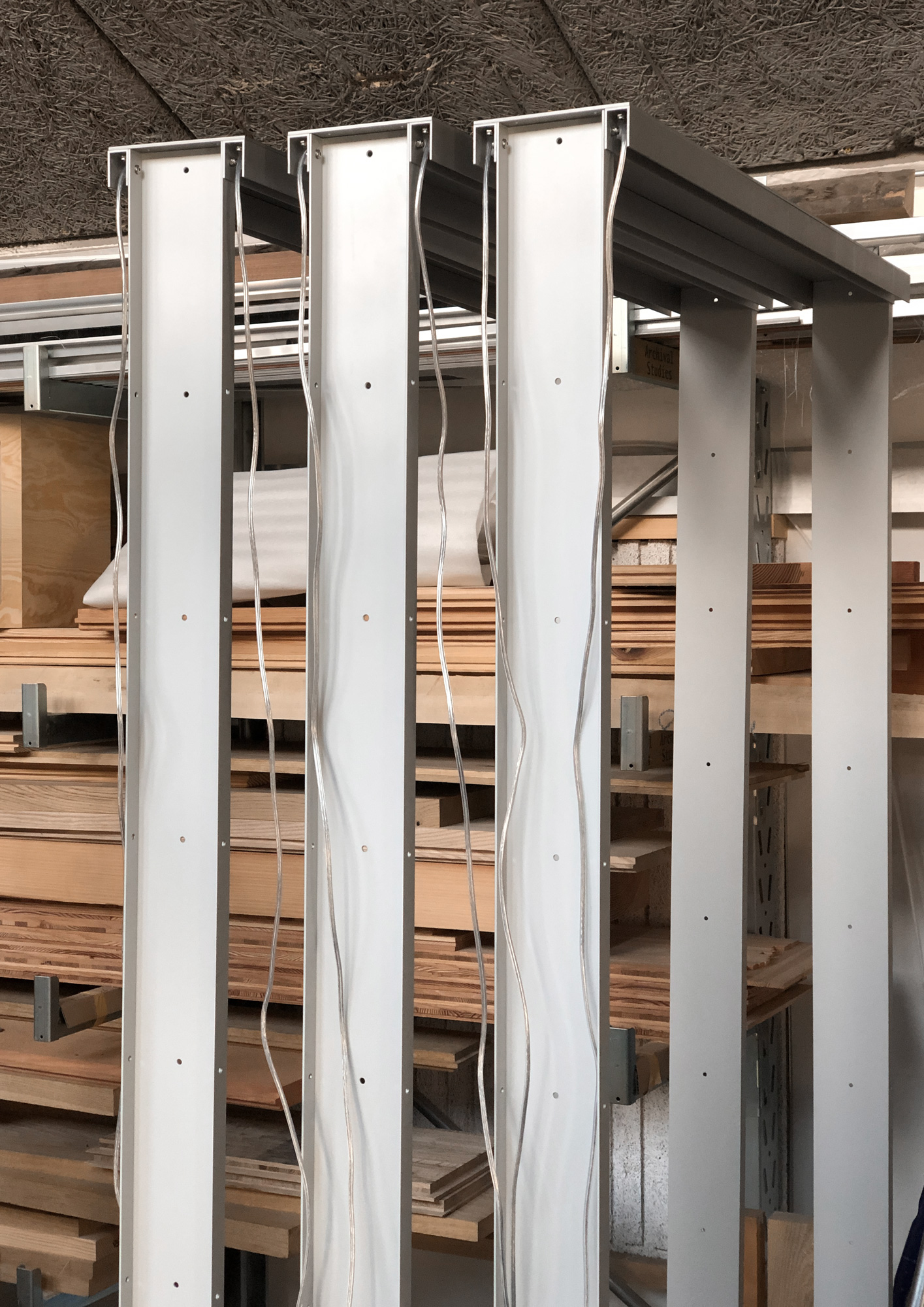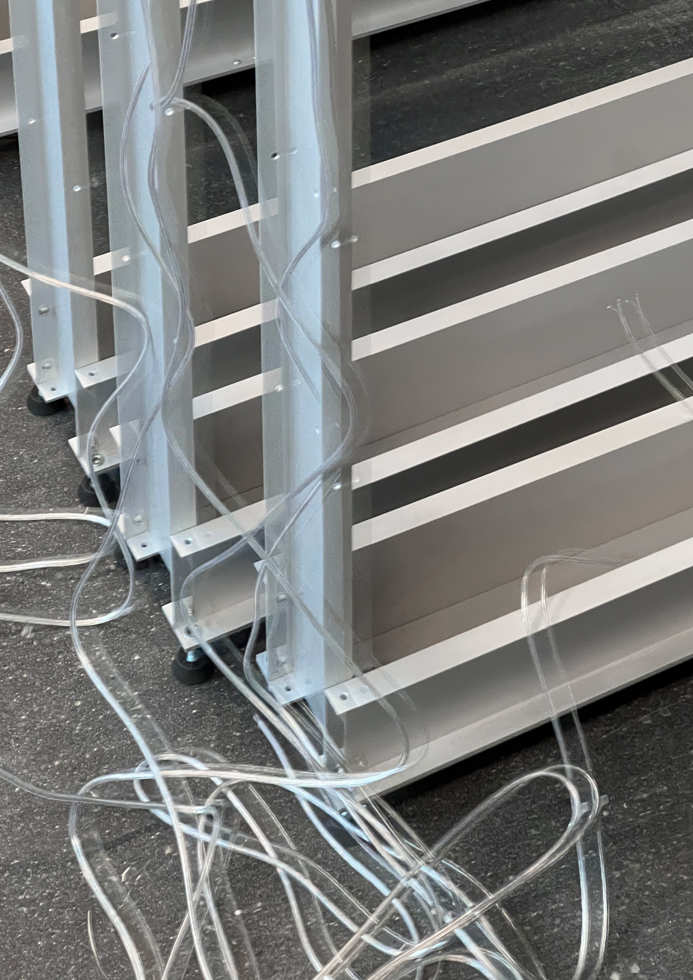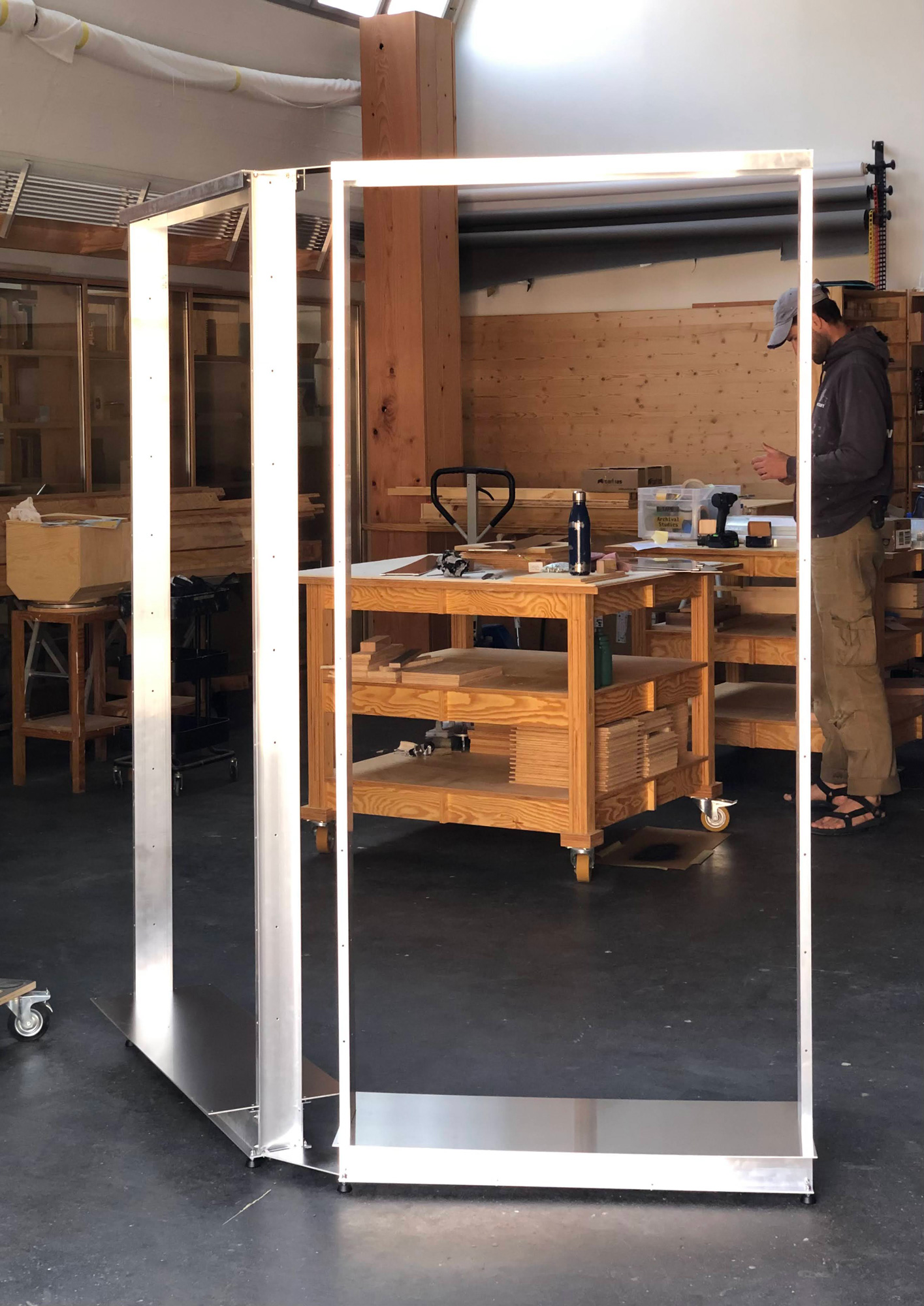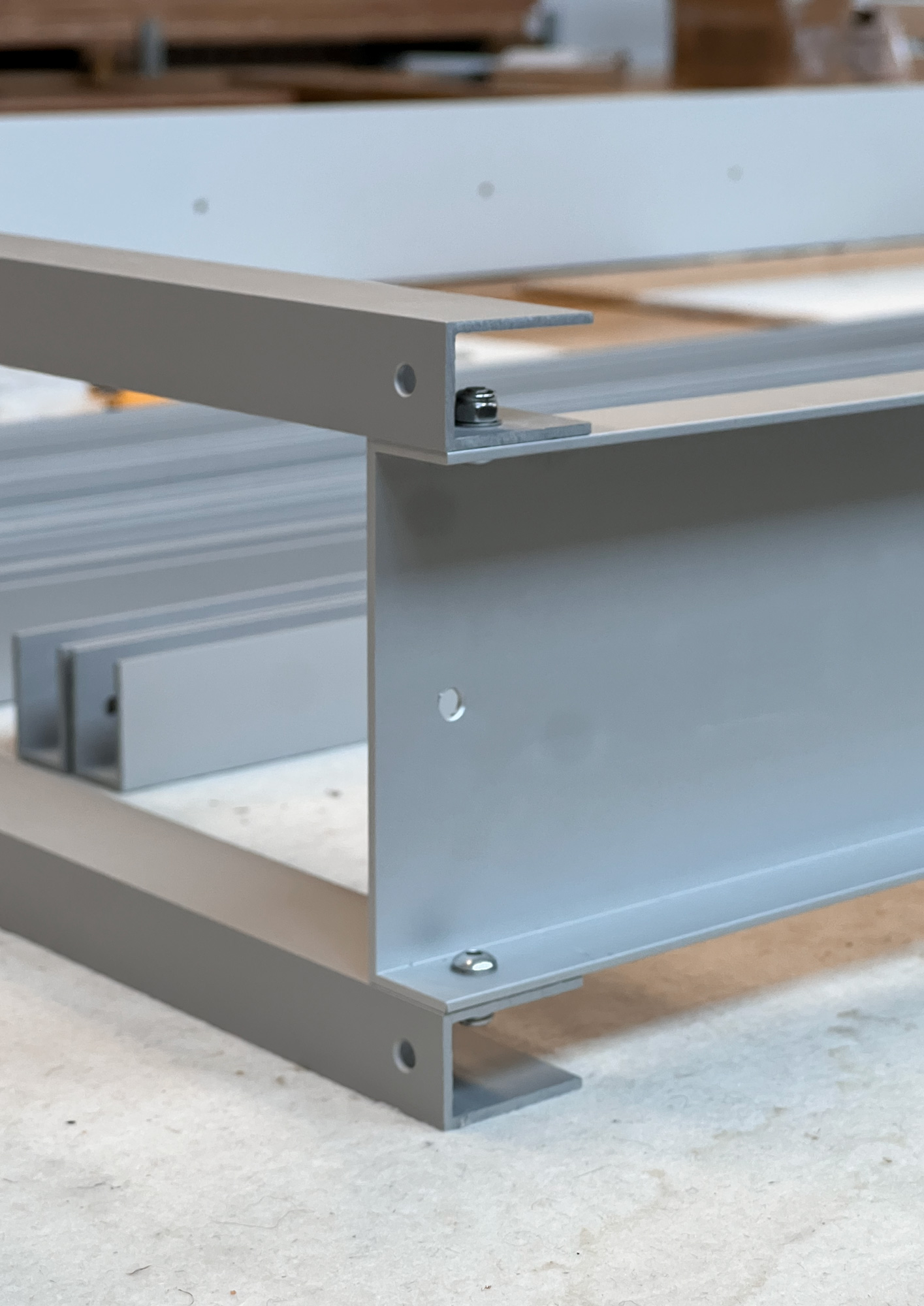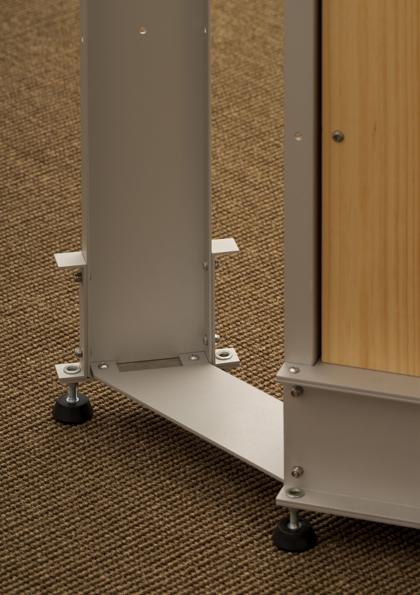 Aligning with d line’s principles of timeless and long-lasting design, Archival Studies have developed a new display system for the brand’s range of architectural hardware products. The display system comprises modules, that are composed of four different elements: the slim aluminium frames, seemingly floating aluminium shelves, interchangeable wooden panels and the elegant strips of light, connecting and illuminating the system. Positioned at slight angles to one another, the thin modules support each other, becoming one spatial entity that can be experienced from all angles. By leaving one module open, adding a door to display d line’s iconic handles and integrating a wooden sink, the system invites visitors to playfully engage with both the exhibition environment and with the products on display. Developed to be taken apart and re-assembled for diverse exhibition environments, the modular system responds to the brands commitment to the reuse and refurbishment of materials. The display system is designed to guide visitors through a curated journey. From discovering brand values to exploring products within their context of use, every module serves a purpose. The result is a spatial experience that prioritises intuitiveness and accessibility, allowing visitors to experience d line’s commitment to design and craft first-hand.